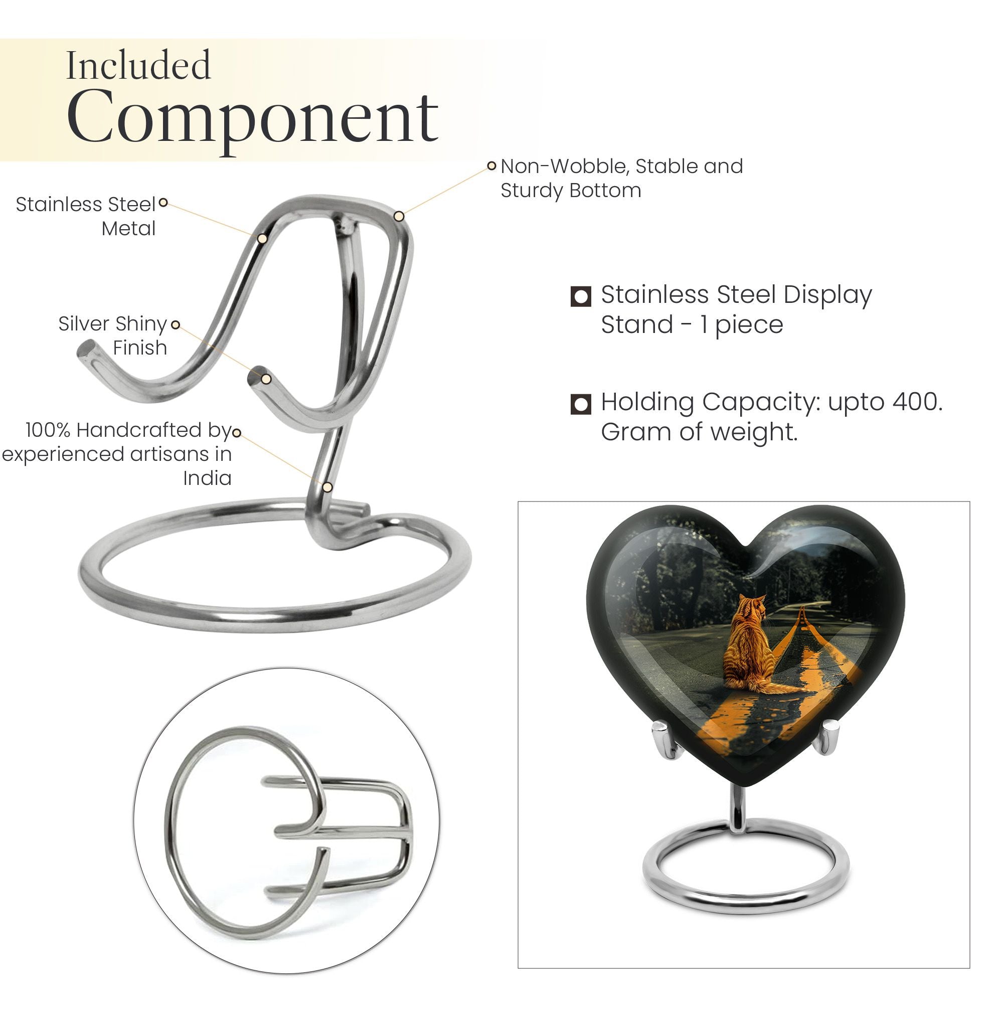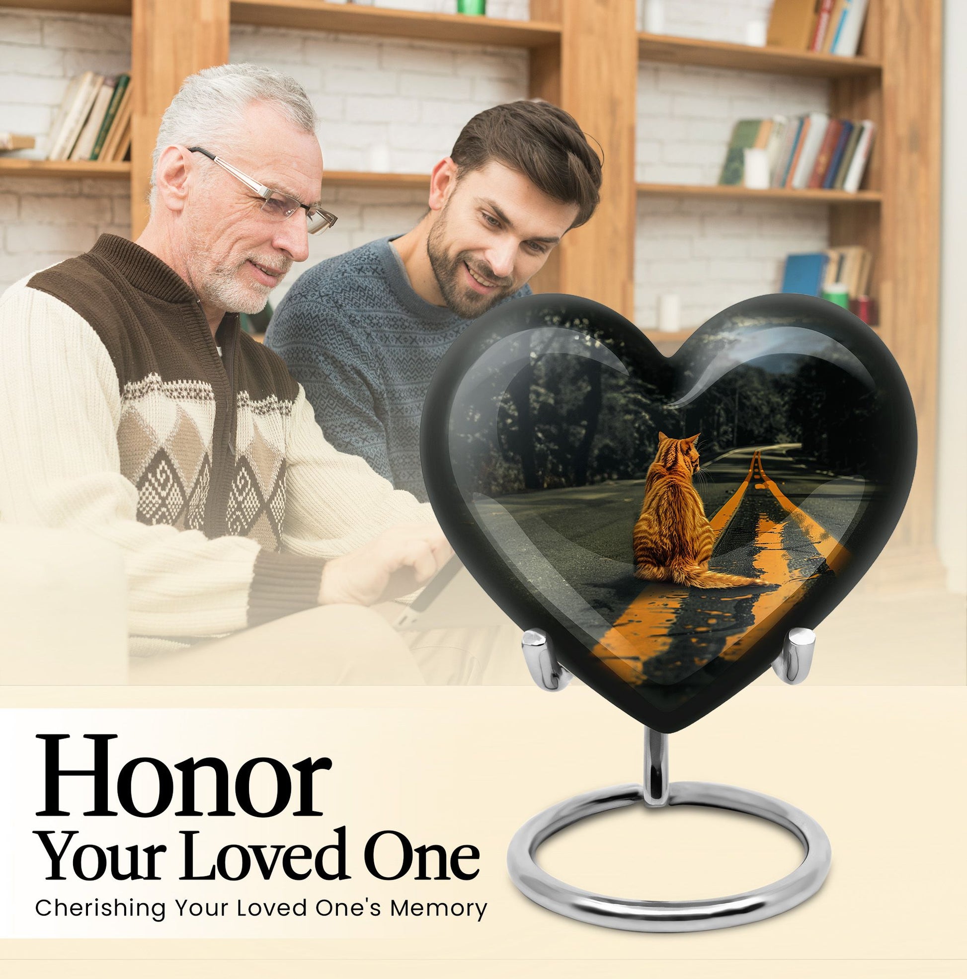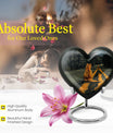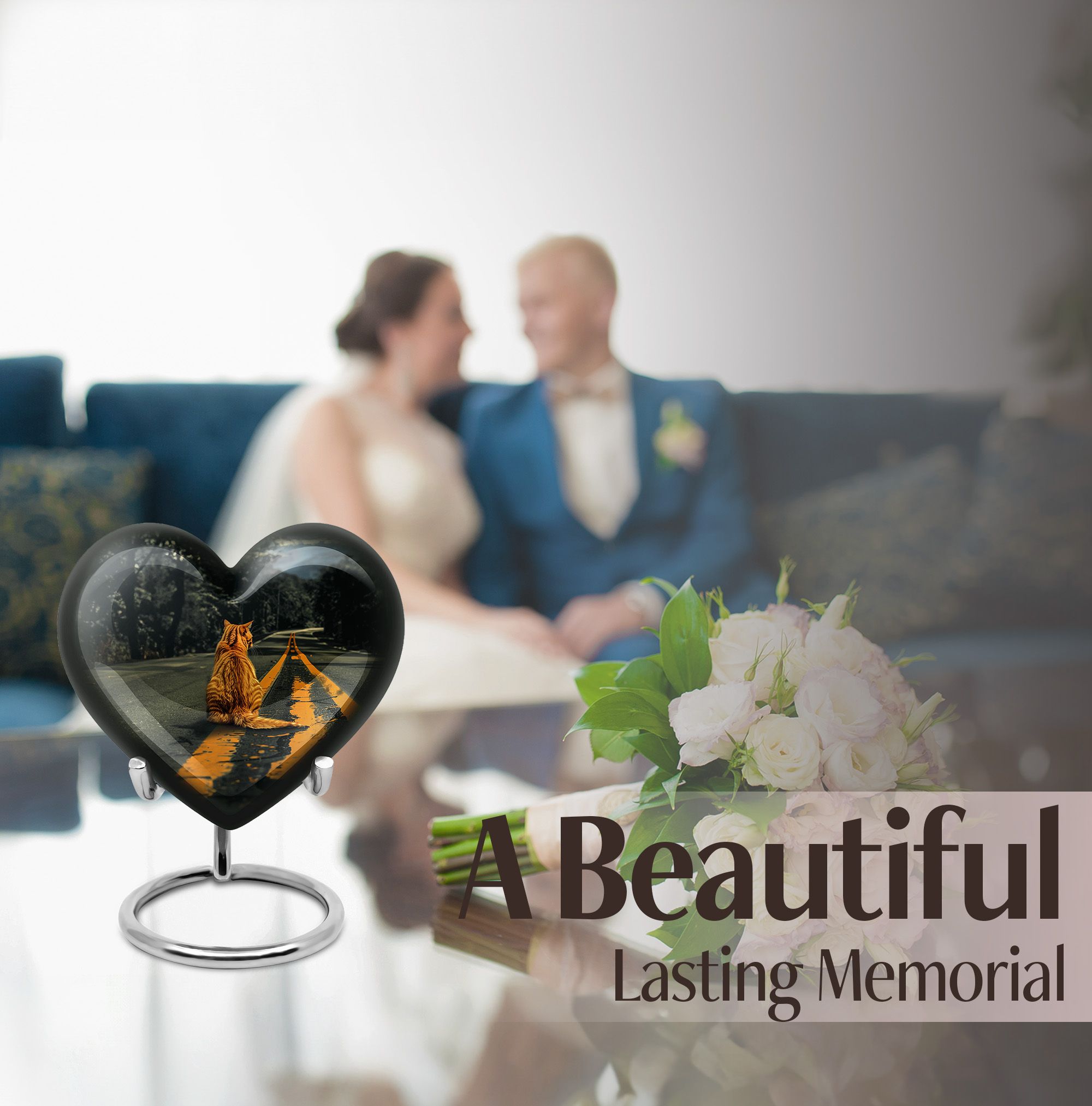 Honor your loved one with our unique, aesthetically pleasing 'orange cat Urn'. As a large 10-Inch burial urn, it showcases an abstract heart-themed motif, offering both uniqueness in design and a personal touch to your memorial ceremony. Weighing a solid 3.3 pounds, this urn has a remarkable dimensional stability with a height of 10 inches. Crafted from resilient aluminium, our urn provides lasting durability, perfect to place in your home or for ground burial. The urn has the capacity to hold up to 200 cubic inches of ashes. To make a more personalized tribute, we offer a customization option to engrave names onto it. Every purchase includes a graceful velvet pouch that ensures safe containment for ashes. Our 'memorial urns' selection caters to both genders with options for dual urns for adult males and females. Take comfort in this functional and symbolic keepsake as it serves as a bittersweet memory of your beloved.