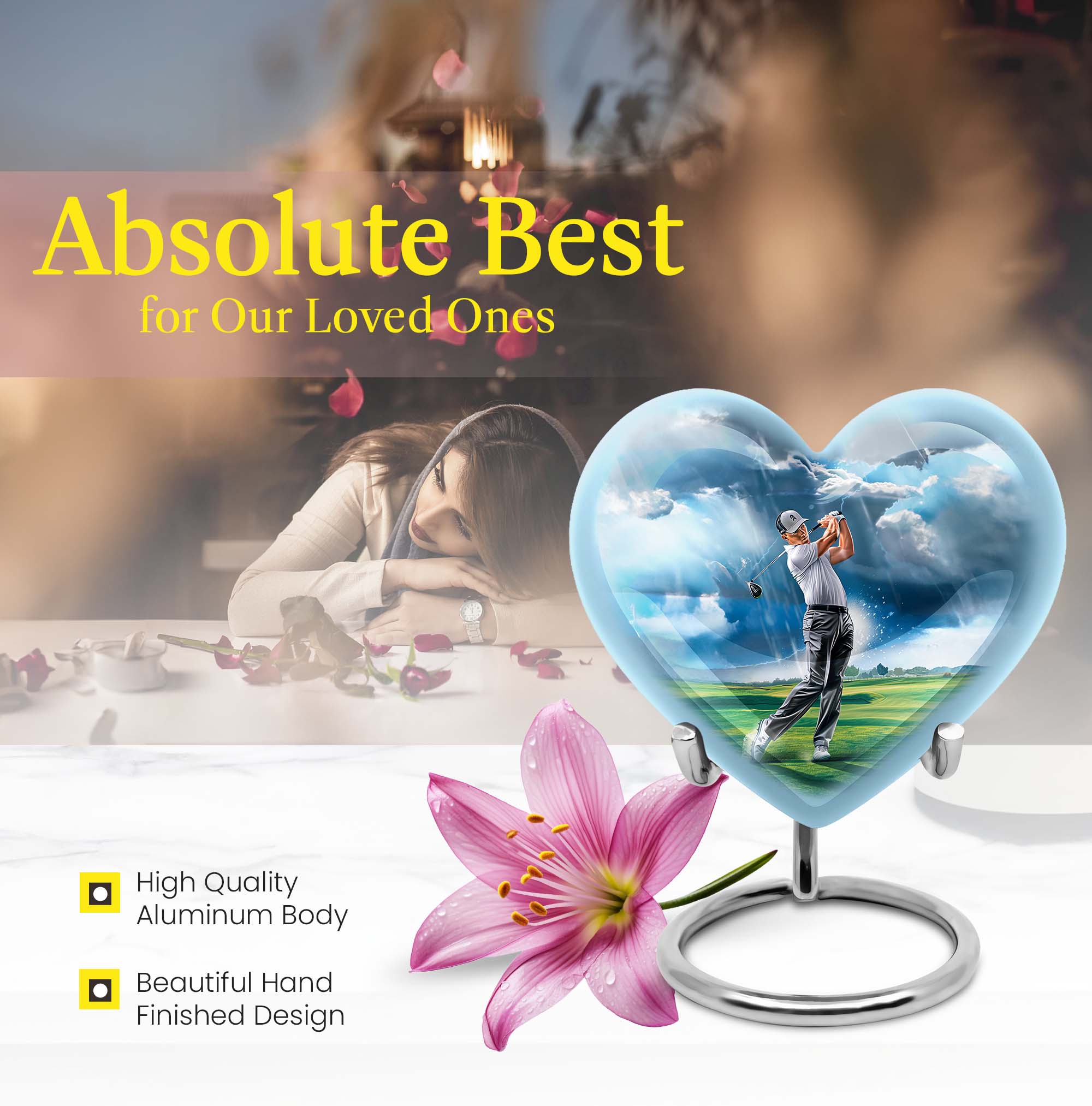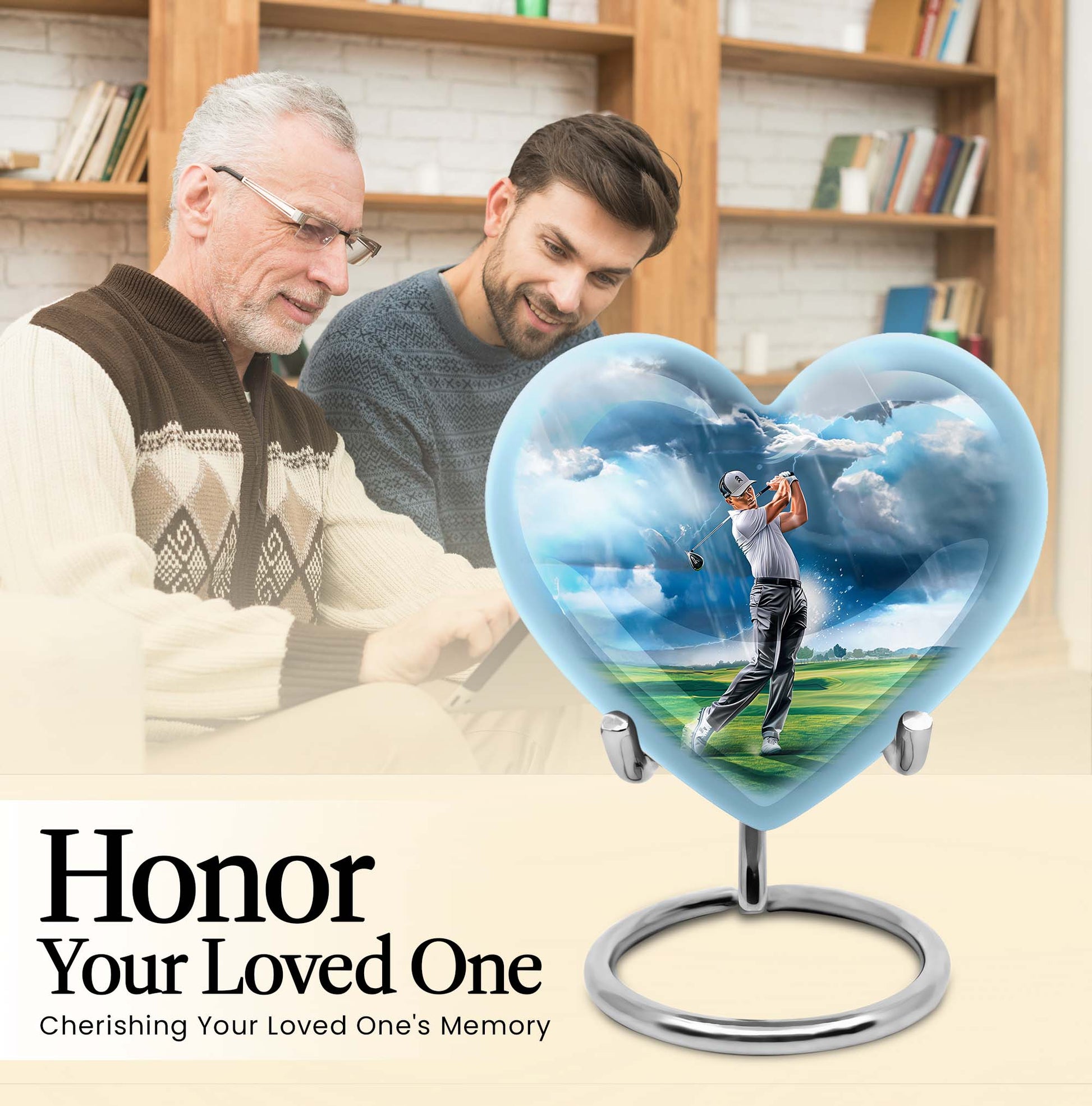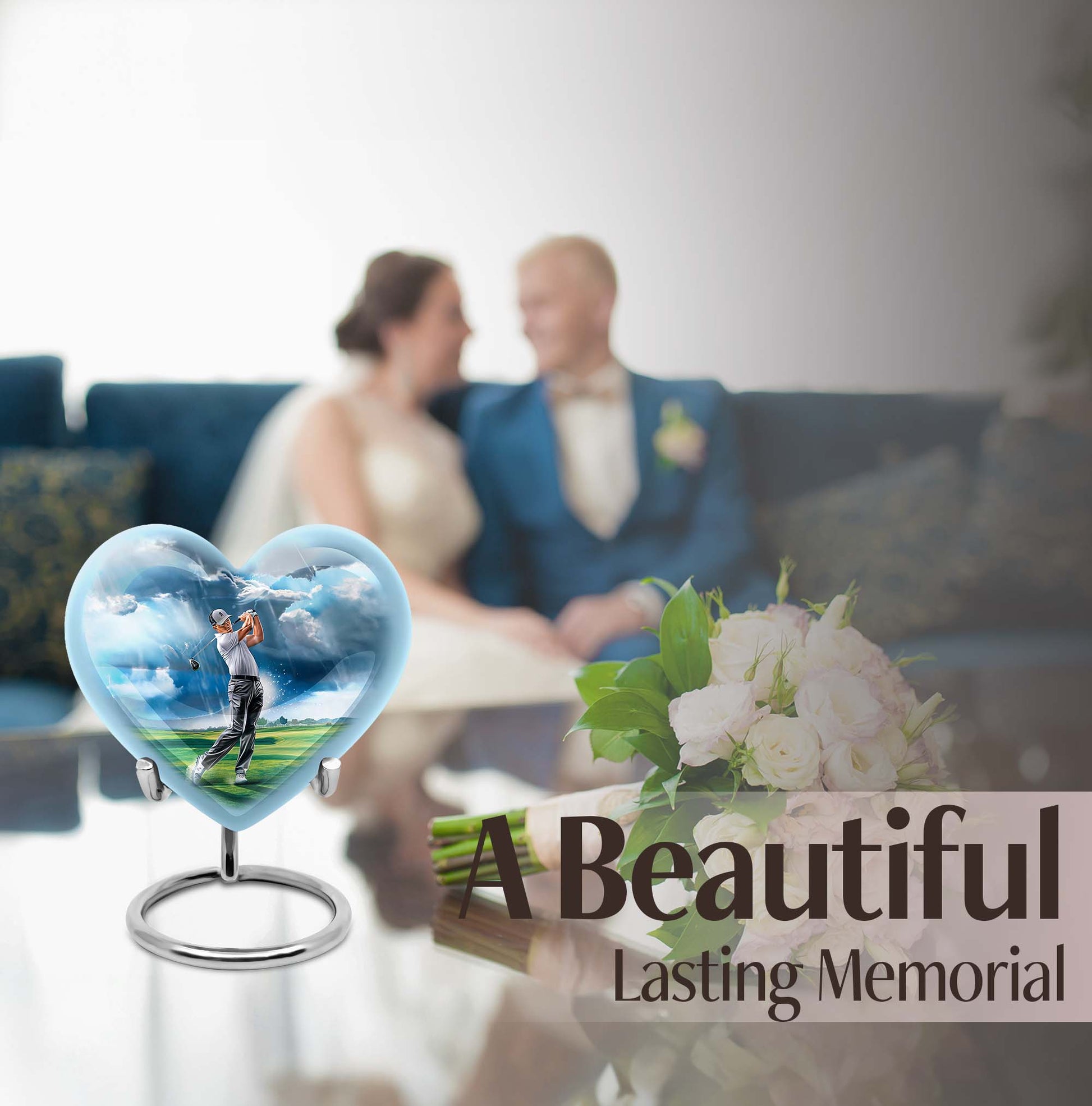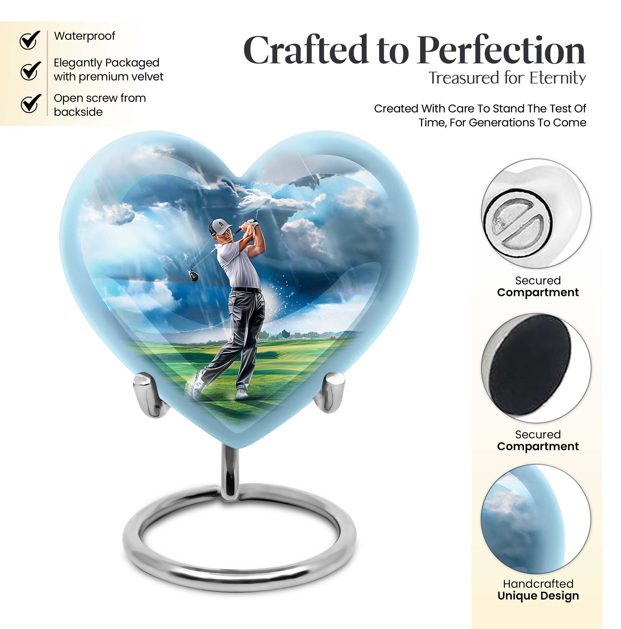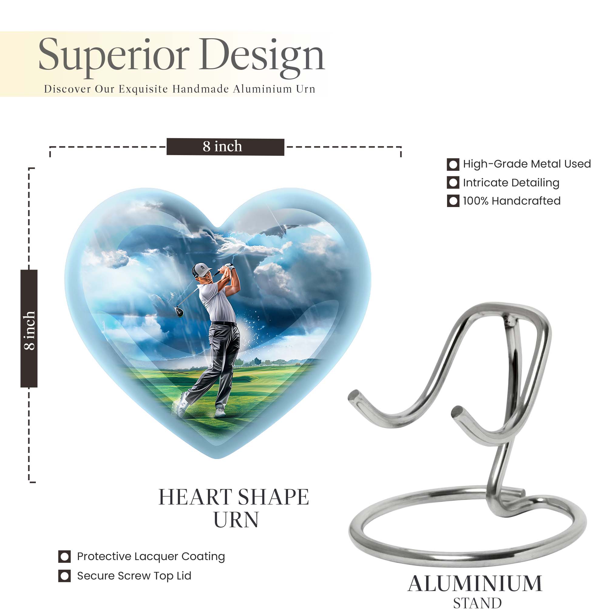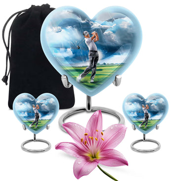 Honor the memory of your loved ones with our 10-inch golf urn. This aluminium urn adds a heartfelt sentiment to the commemorative ritual, assisting you in cherishing their life and legacy. Handcrafted from robust aluminium, it stands ten inches tall and weighs in at 3.3 pounds. This large urn has a capacity of 200 cubic inches, making it ideal for preserving adult ashes. It comes with a plush velvet pouch, a dignified and protective enclosure for the ashes. This abstract-themed memorial urn is unique and can be personalized with engraved names, making it a distinctive tribute to those loved and lost. As one of our featured burial funeral urns for adult ashes, it's a tasteful choice. This cremation box is often sought after as a thoughtful option amongst various memorial urns and adult size cremation urns. Note: Design not specified in this description.