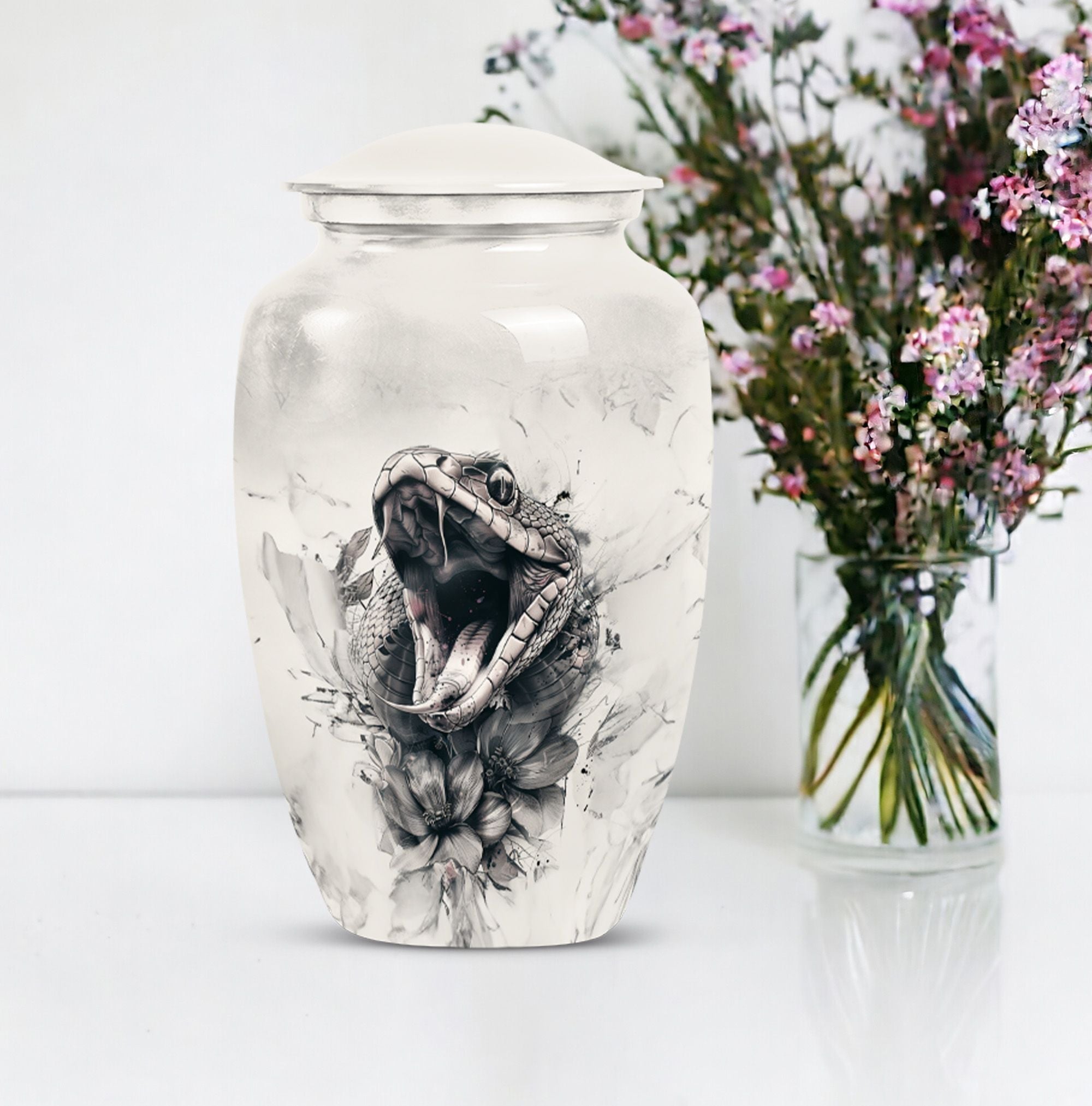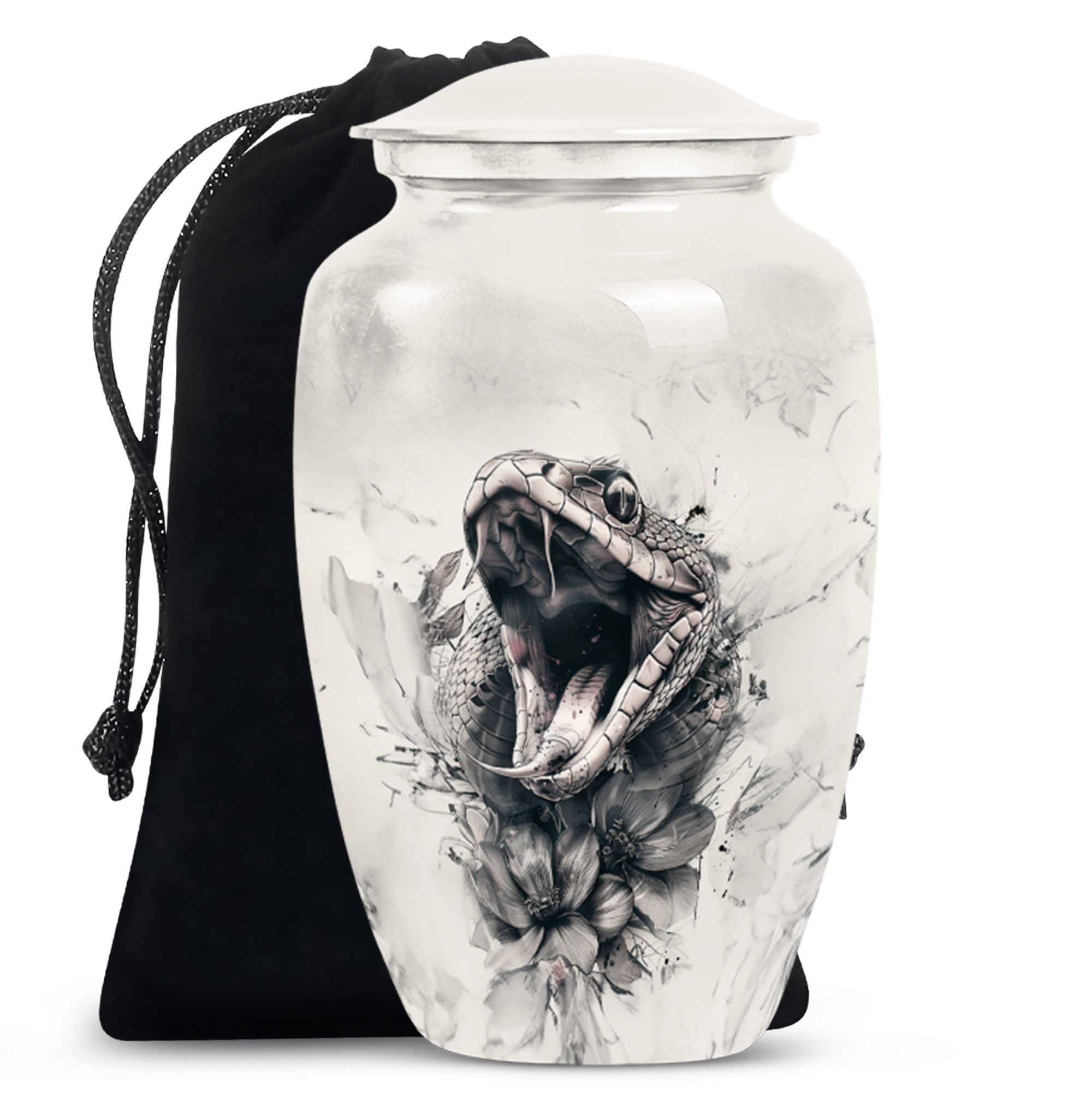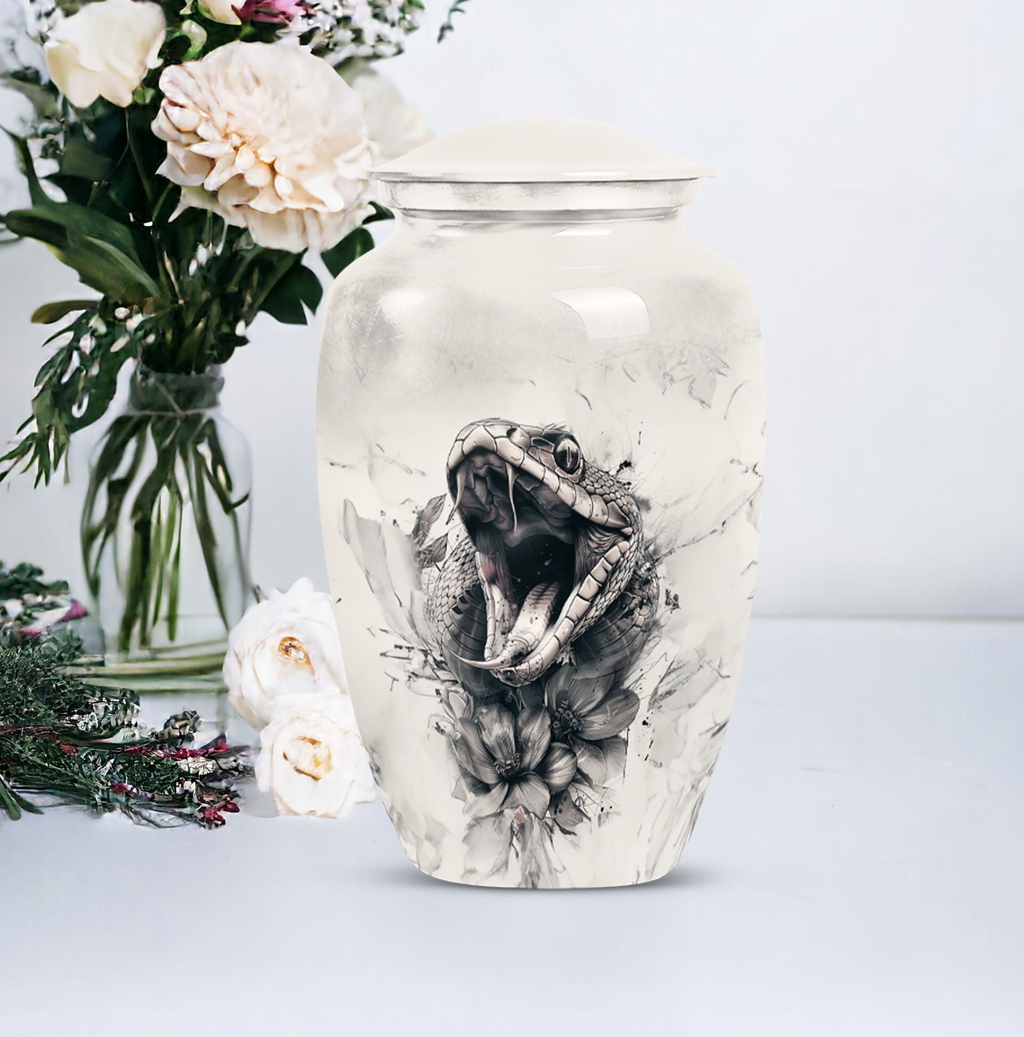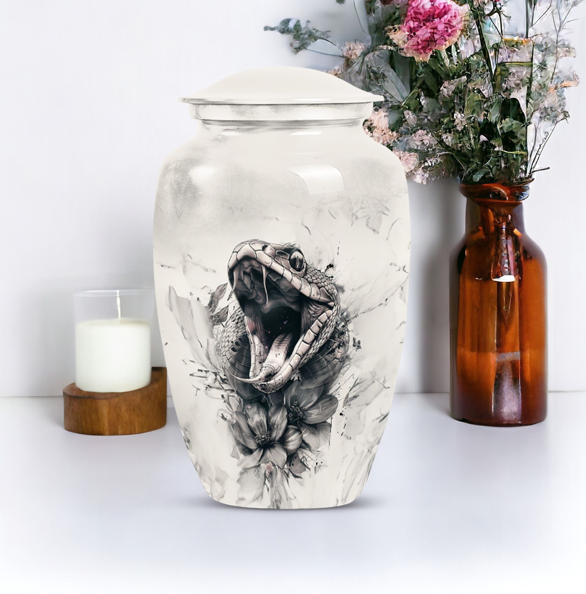 Unveiling a timeless classic, a 'Snake Urn' for your fallen loved one. Designed with respect and dignity, this 10-inch burial urn is specifically crafted for adult females, but can also be used as a tasteful memorial for adult males. Handcrafted from robust Aluminium, this abstract themed urn weighs a sturdy 3.3 pounds. It boasts an immense capacity of 200 cubic inches, offering significant room for your loved one's ashes. Each urn arrives meticulously packed in a velvet pouch for a respectful containment of your cherished ashes. This cremation urn can be cherished in your home, or used for burial purposes. The urn can be personalized with engraved names, allowing you to create a truly unique memorial. This isn't just a Burial funeral urn; it is also a tangible memorial gift that holds a priceless value. Keywords importantly associated with this product include 'cremation urn funeral urn adult ash' and 'metal urn for ashes adult male'. Every detail reflects our commitment to help you honour your loved one, in the language of heartfelt craftsmanship.