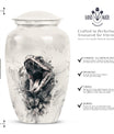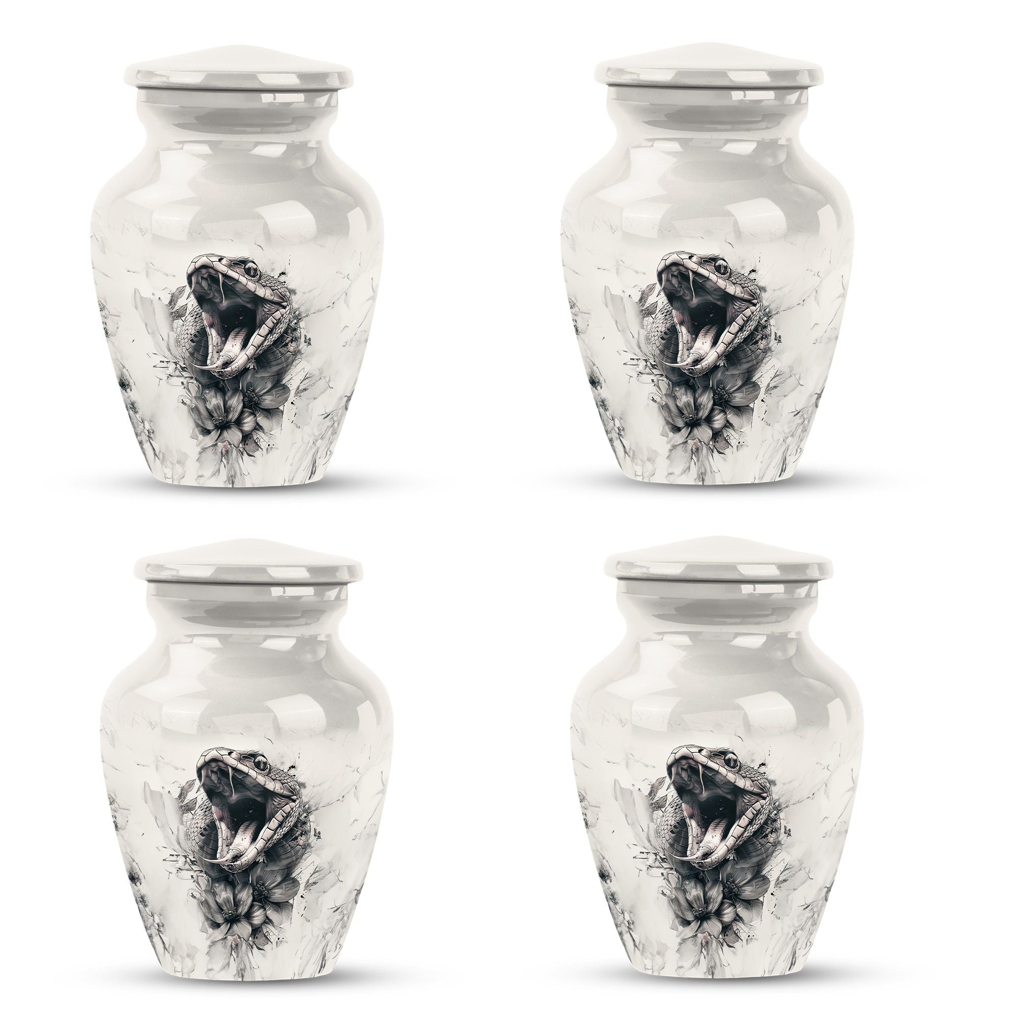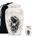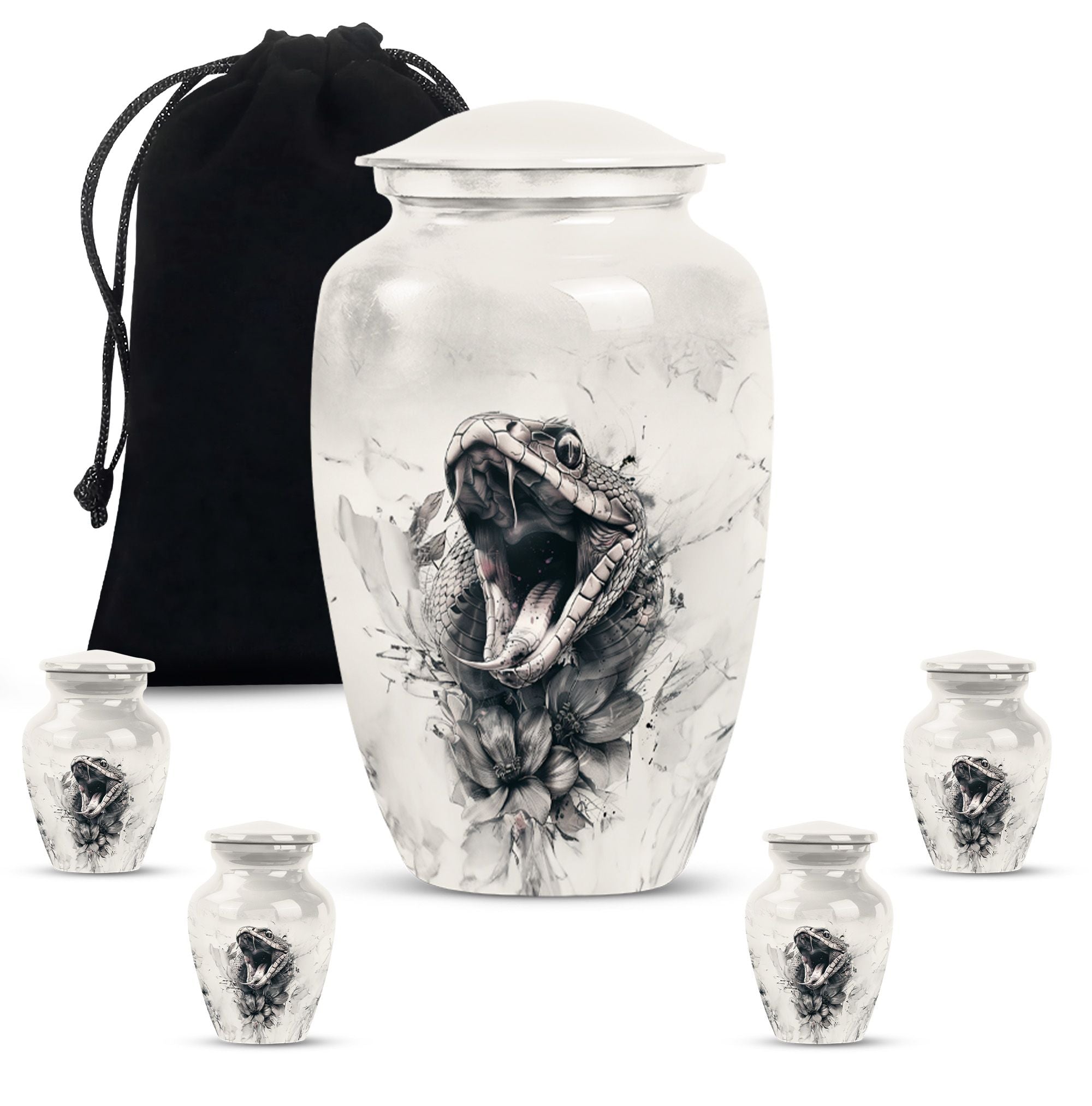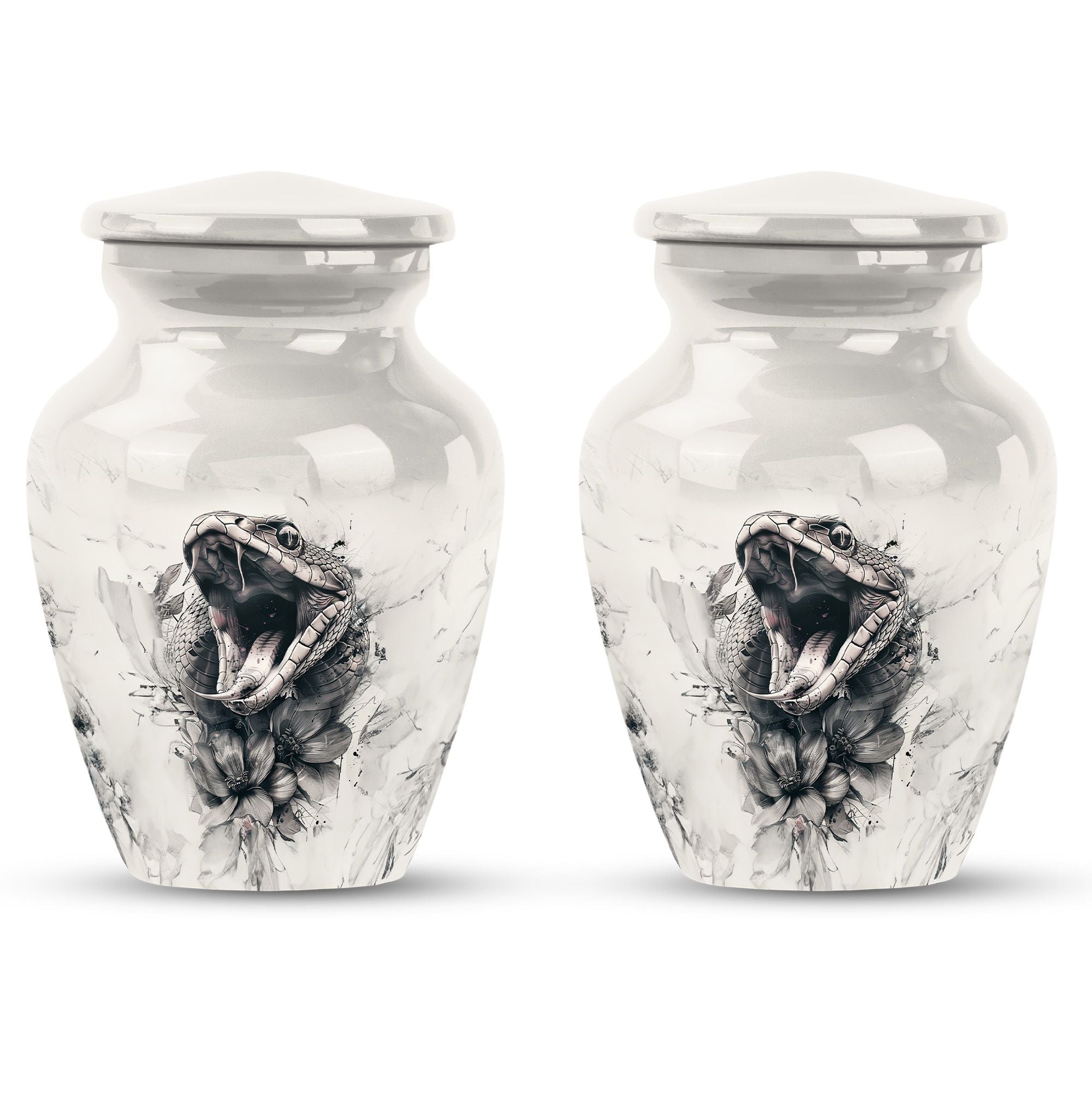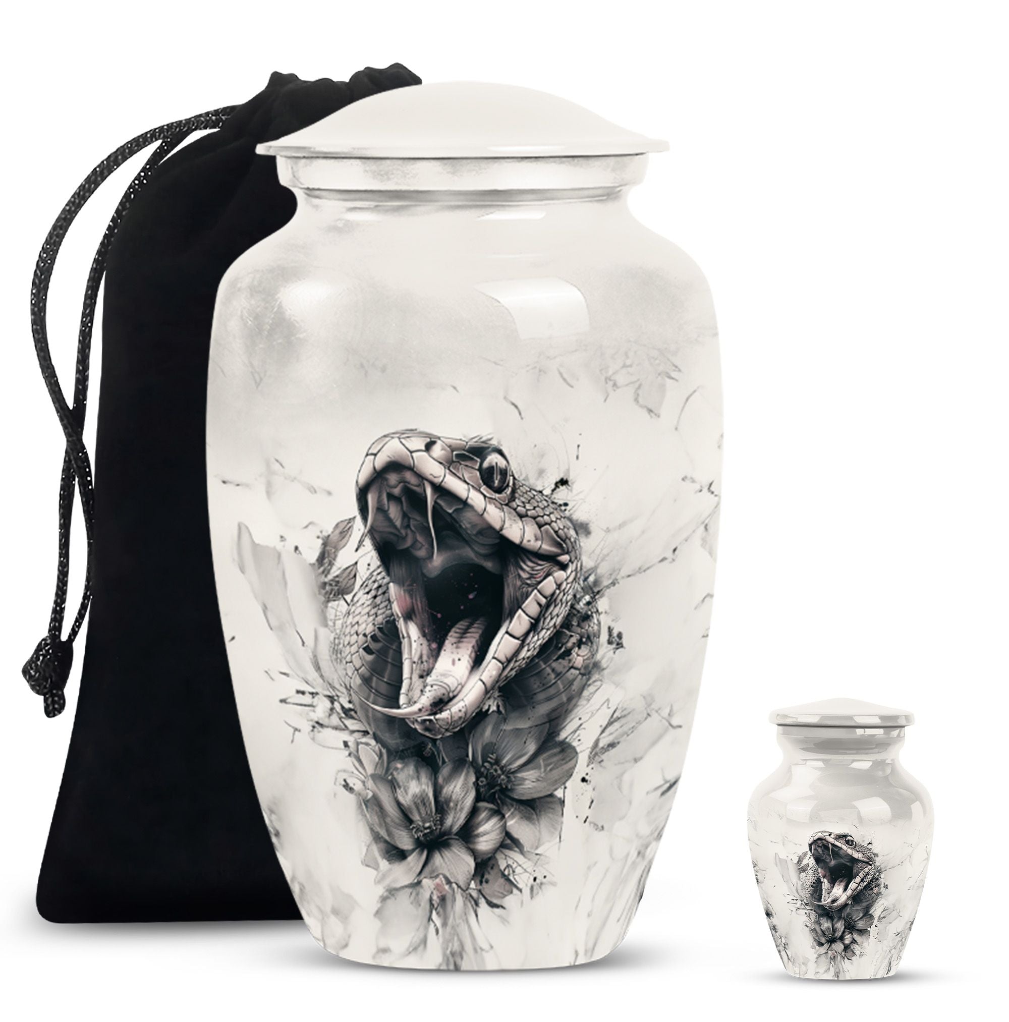 Unveiling a timeless classic, a 'Snake Urn' for your fallen loved one. Designed with respect and dignity, this 10-inch burial urn is specifically crafted for adult females, but can also be used as a tasteful memorial for adult males. Handcrafted from robust Aluminium, this abstract themed urn weighs a sturdy 3.3 pounds. It boasts an immense capacity of 200 cubic inches, offering significant room for your loved one's ashes. Each urn arrives meticulously packed in a velvet pouch for a respectful containment of your cherished ashes. This cremation urn can be cherished in your home, or used for burial purposes. The urn can be personalized with engraved names, allowing you to create a truly unique memorial. This isn't just a Burial funeral urn; it is also a tangible memorial gift that holds a priceless value. Keywords importantly associated with this product include 'cremation urn funeral urn adult ash' and 'metal urn for ashes adult male'. Every detail reflects our commitment to help you honour your loved one, in the language of heartfelt craftsmanship.