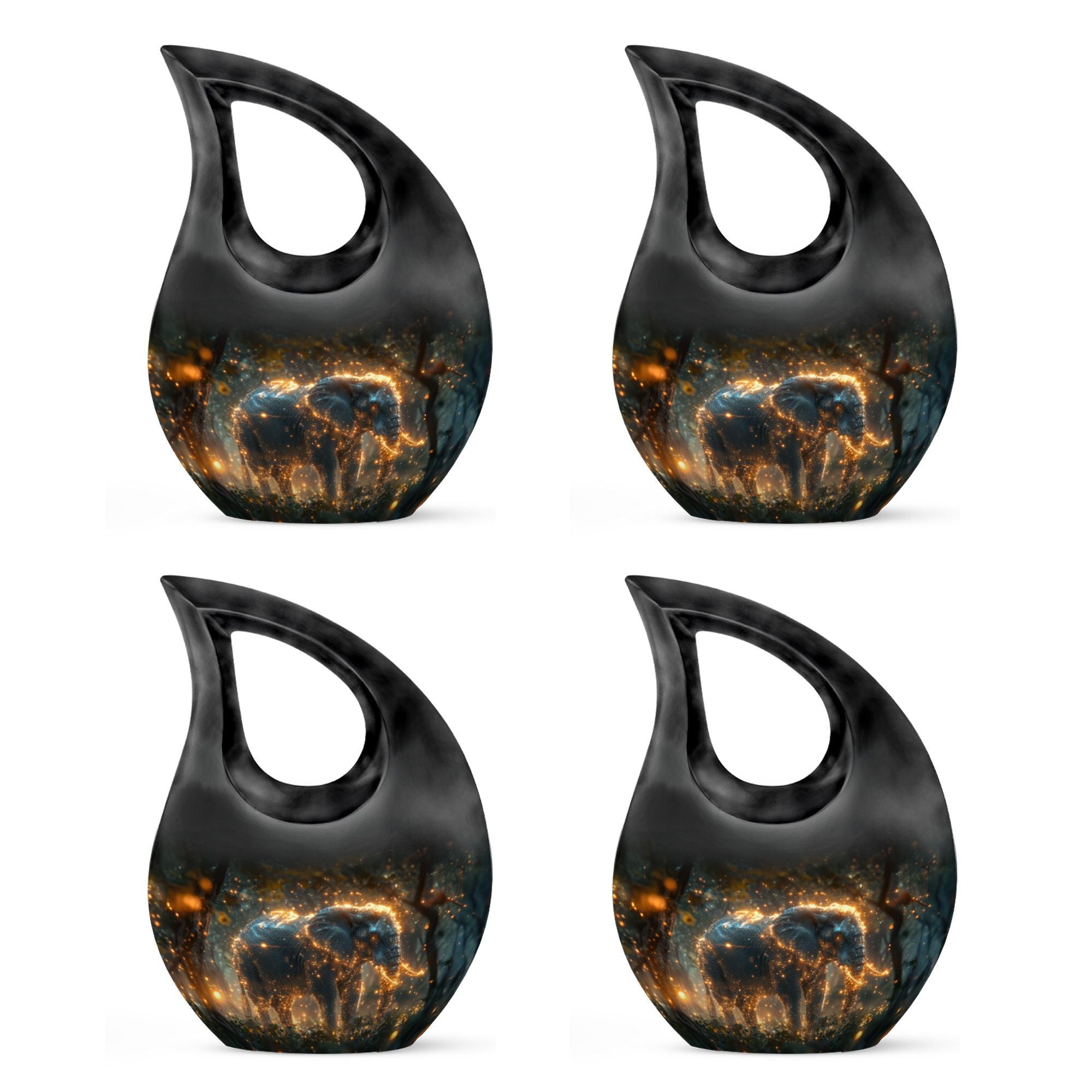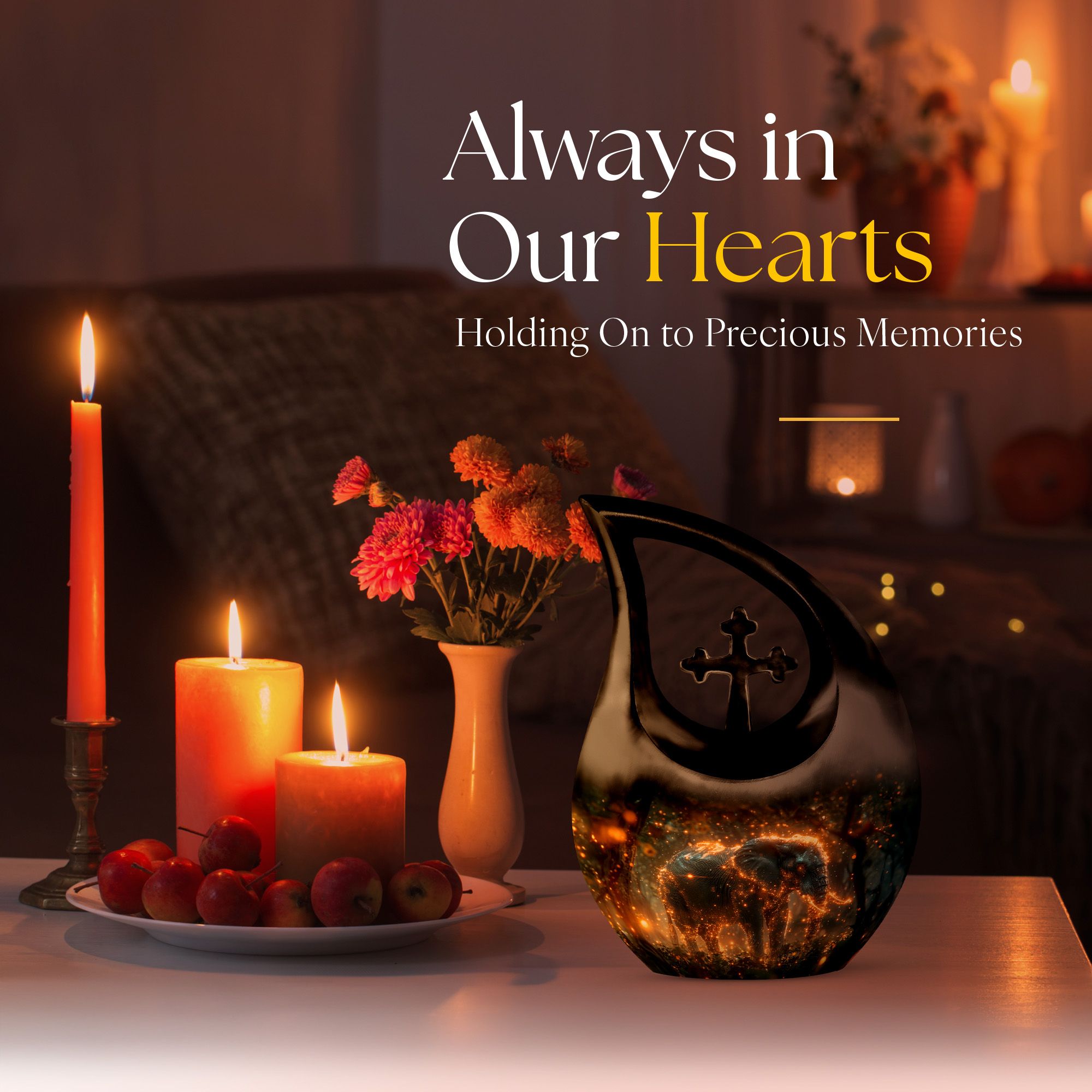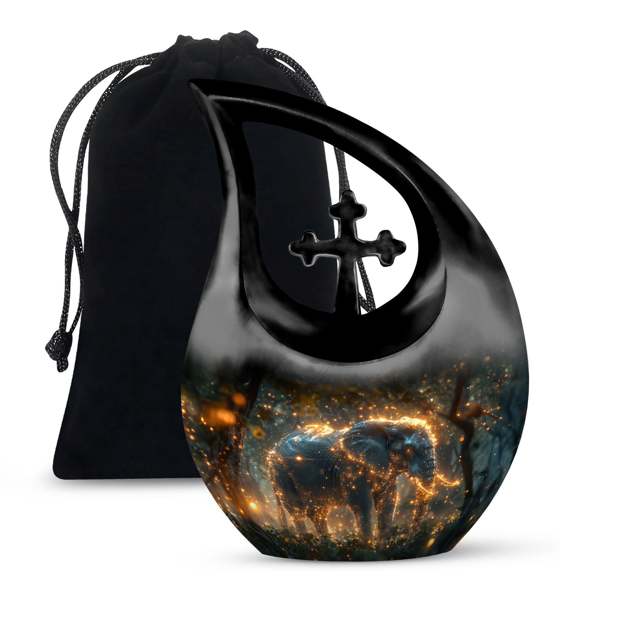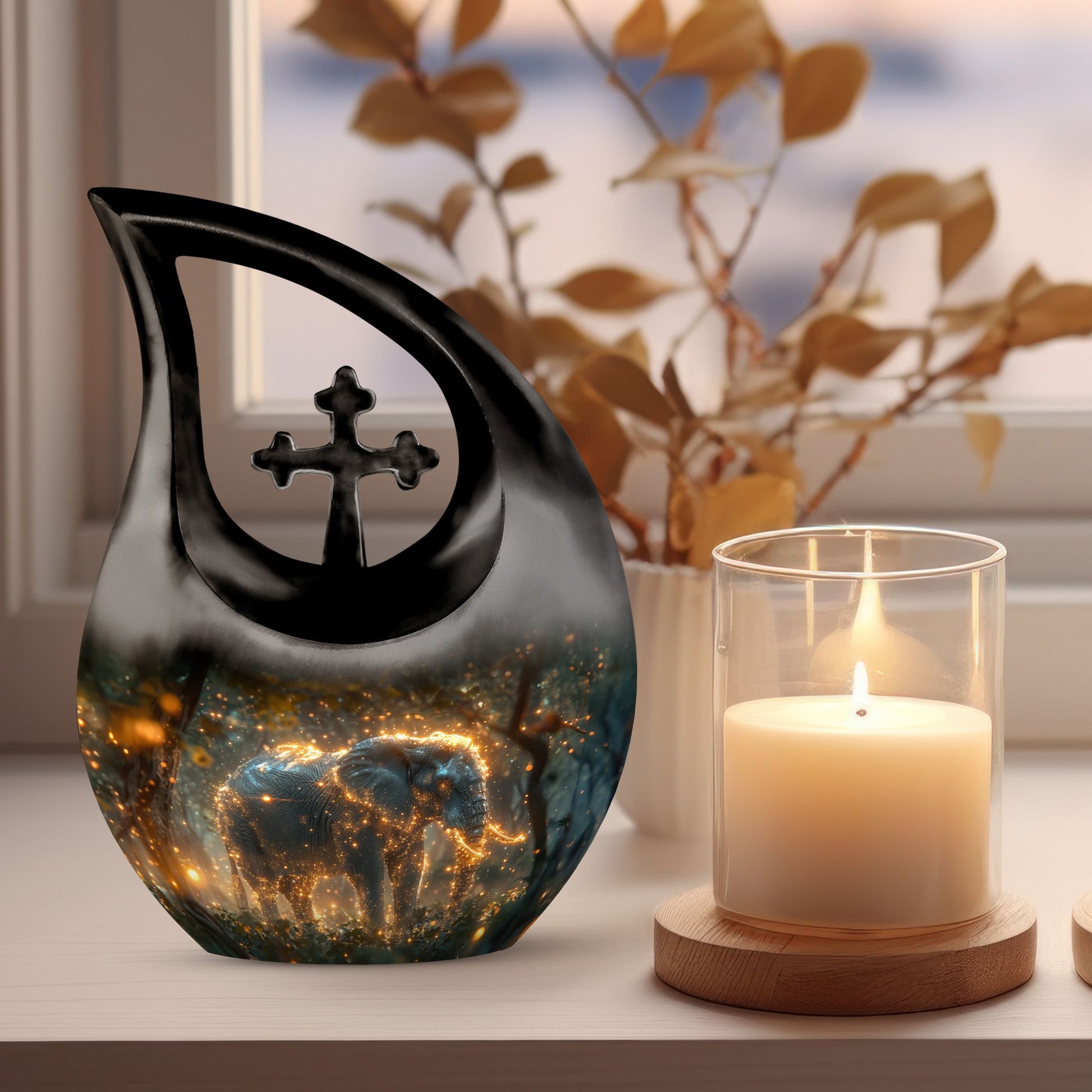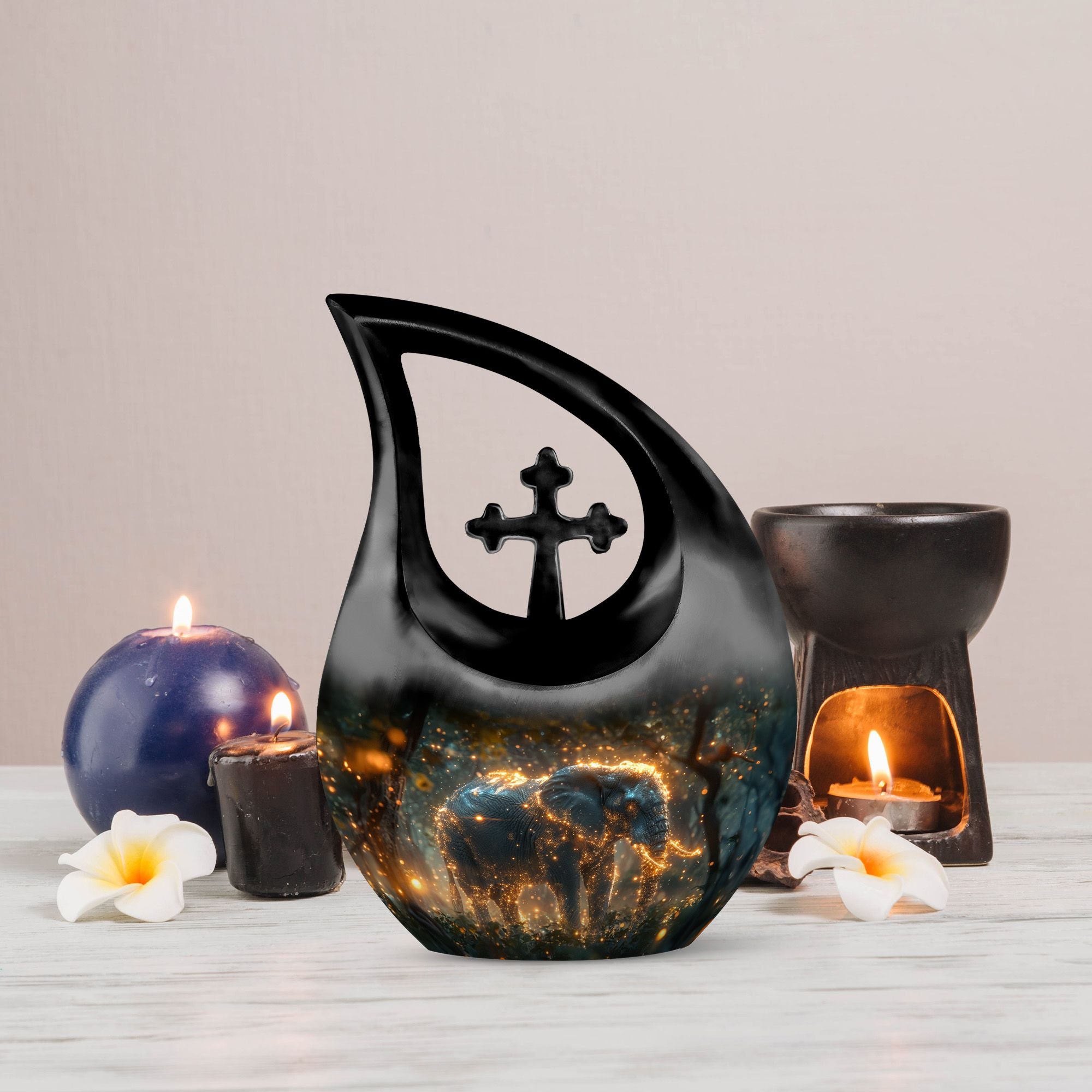 Discover a peaceful tribute to your loved one with our Enchanted Forest Behemoth Urn. This unique memorial urn elegantly transcends the traditional, making it a cool urn for ashes that adds a comforting presence to any room. Crafted from high-quality aluminium, this large urn measures a generous 10 inches in height and is capable of holding up to 200 cubic inches ashes. Its tasteful Cross Drop motif, coupled with its 'Enchanted Forest Behemoth' theme, provides an apt representation of lasting peace. Weighing 3.3 pounds, it has the substantial-feeling weight that is desirable in such a memorial piece. Additionally, the urn includes a lush velvet pouch, tastefully containing your cherished one's ashes. Personalize it by engraving names, making the urn a unique space for memories. Ideal for anyone searching for affordable cremation, cheap urns, or a purple urn, this box for human ashes explores modern design principles while respecting traditional sentiment. Be it for adults or seniors, this urn flawlessly resonates with the feeling of solace and fond remembrance.