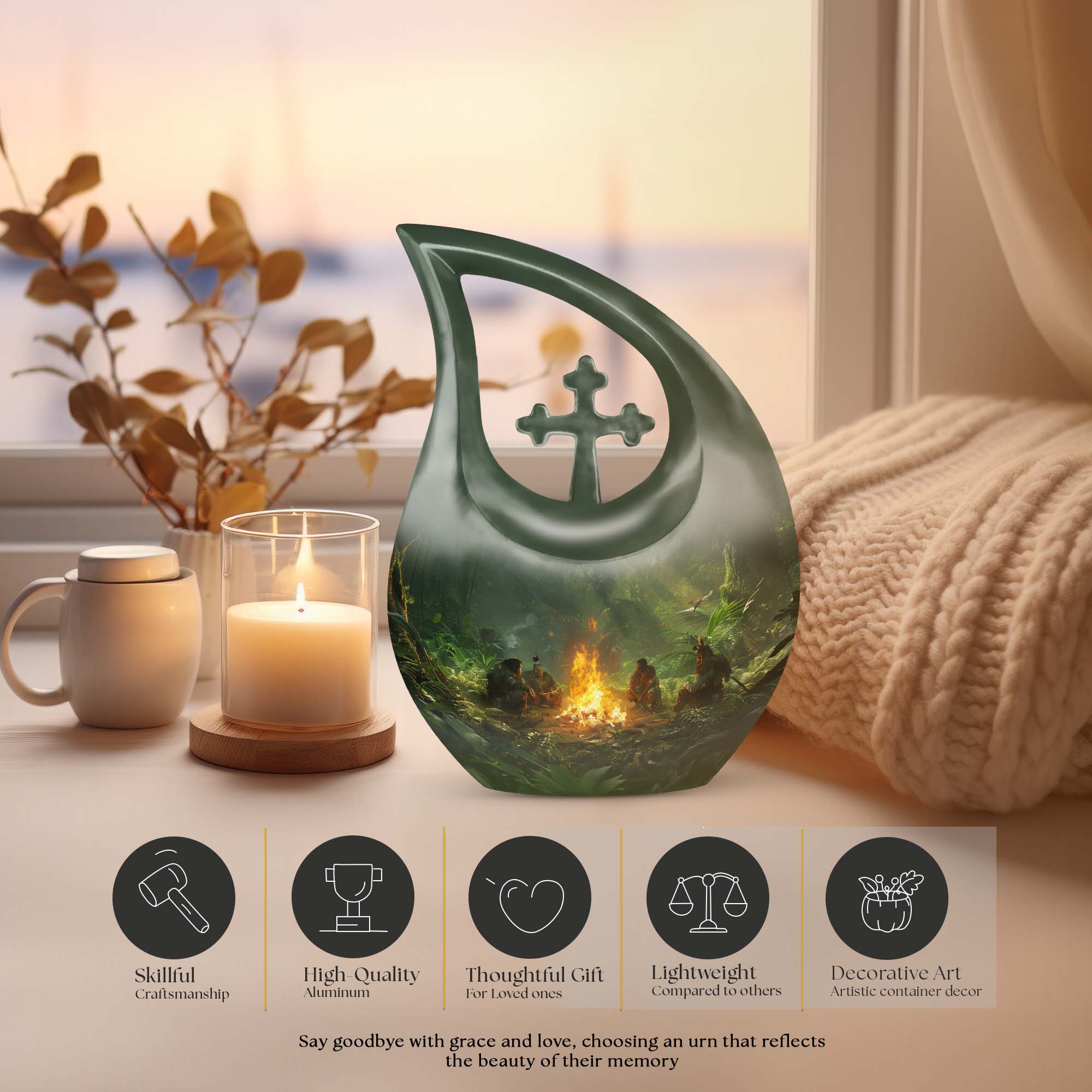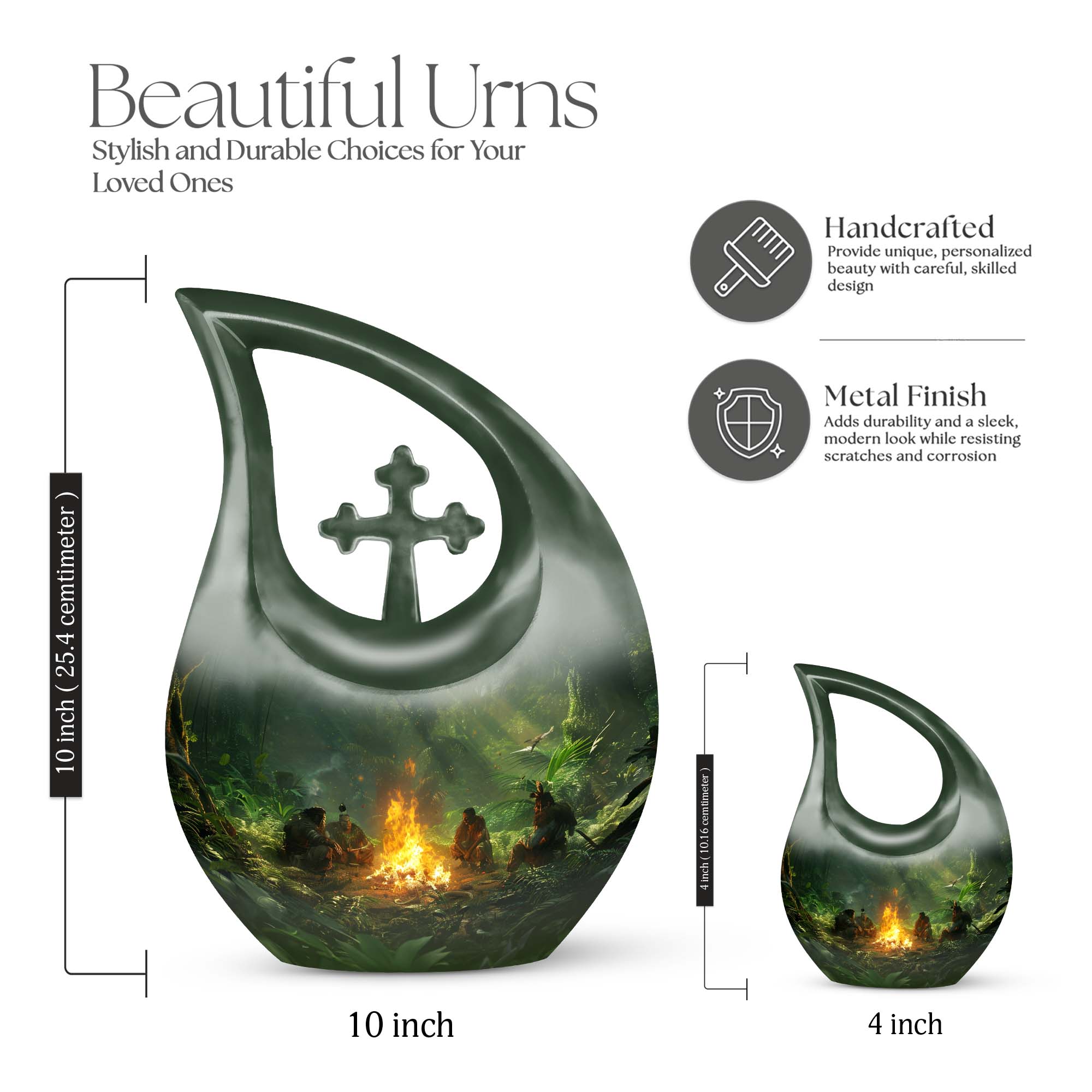 Crafted from durable aluminium, this 10 inch urn features a tranquil forest motif with deep green tones symbolizing renewal, stability, and eternal harmony. Its polished finish and secure screw-top lid provide lasting protection, making it ideal for families seeking an urn for ashes adult female, urn for human ashes adult male, or a dignified memorial suited for burial. The calming woodland artwork and refined craftsmanship make this piece a beautiful choice for home display, memorial niches, or graveside ceremonies.