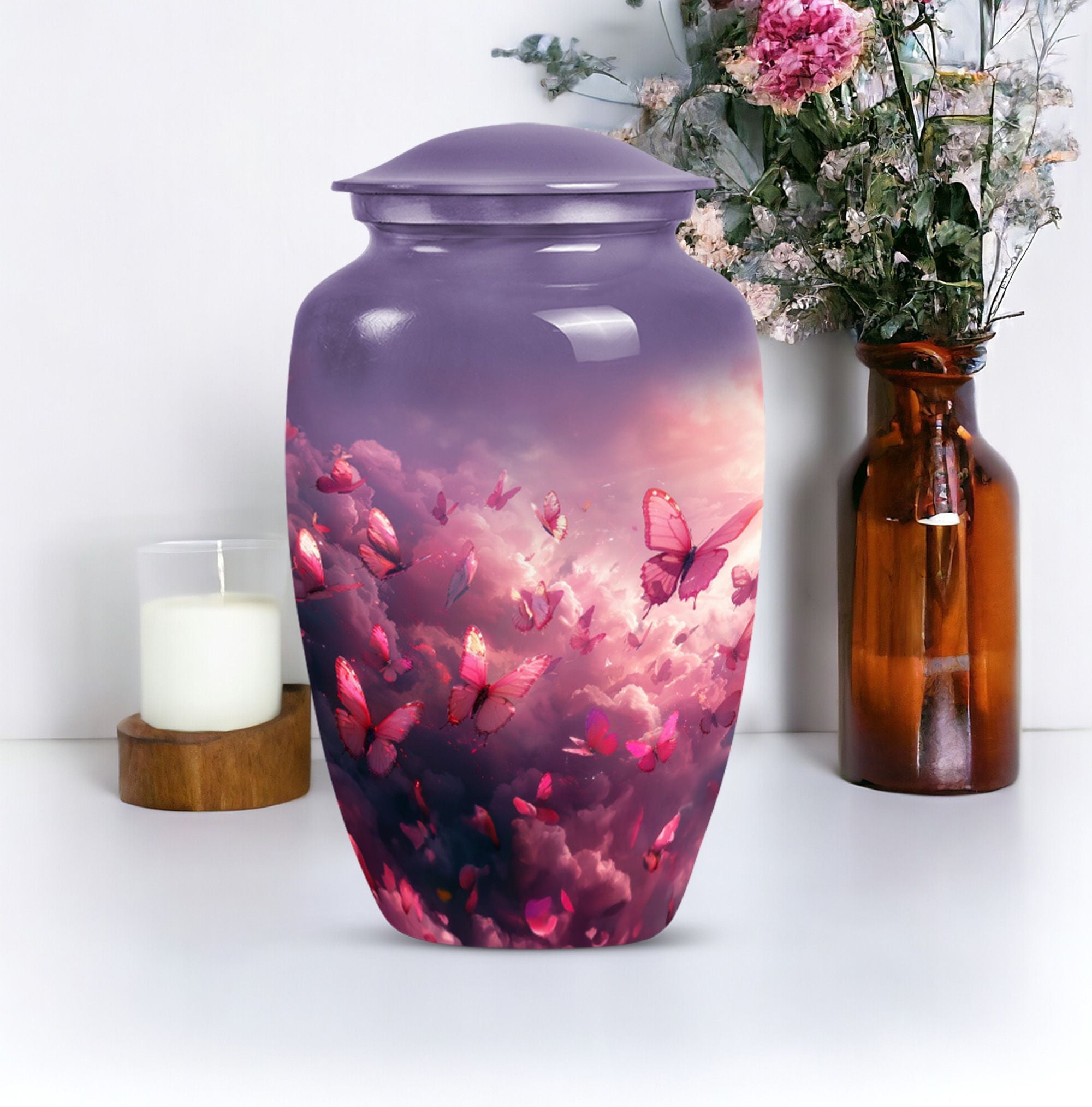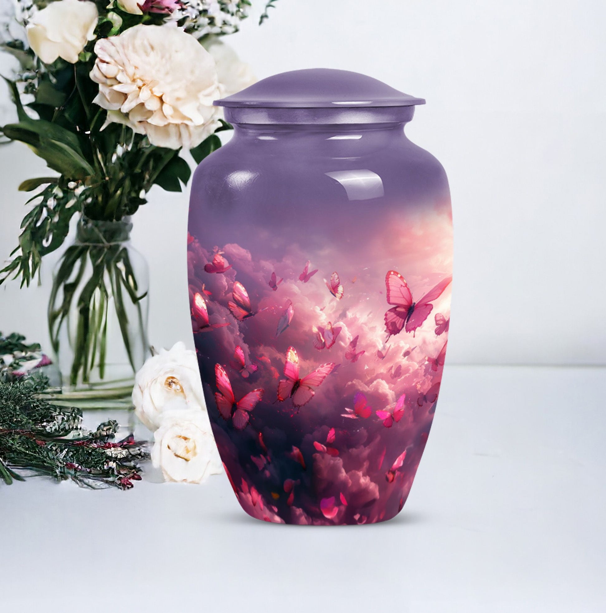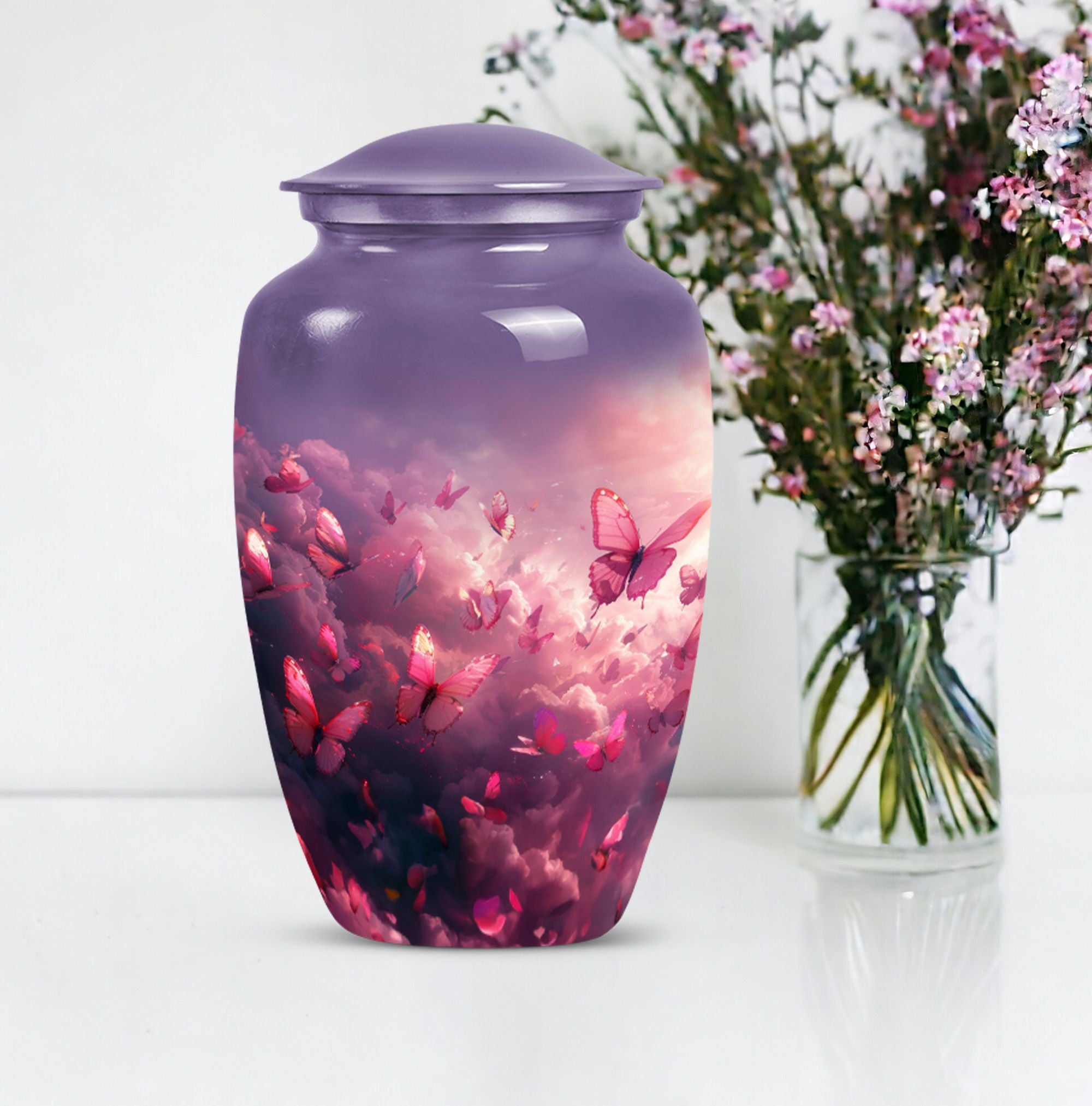 Honor your loved one’s memory with the Pink Butterfly & Clouds Urn Tribute, a beautifully designed cremation urn that symbolizes peace, transformation, and eternal love. This urn combines soft cloud artwork with delicate butterfly details, creating a serene and uplifting memorial. Families often choose this as a pink butterfly urn for ashes, a pink clouds urn, or as a meaningful butterfly memorial urn for adult ashes.