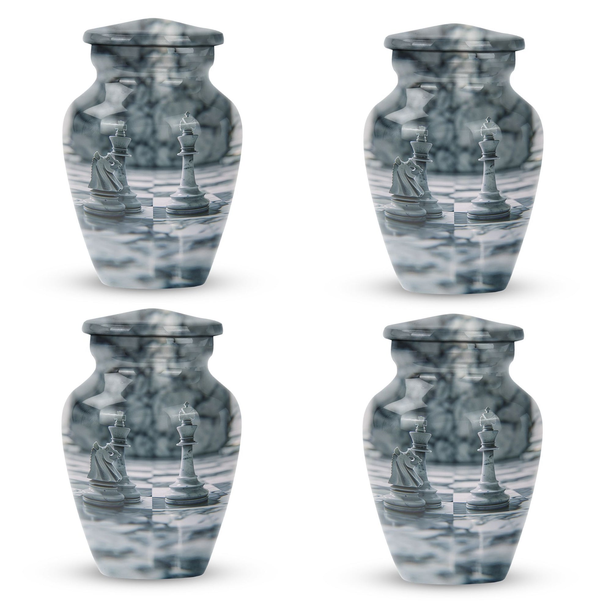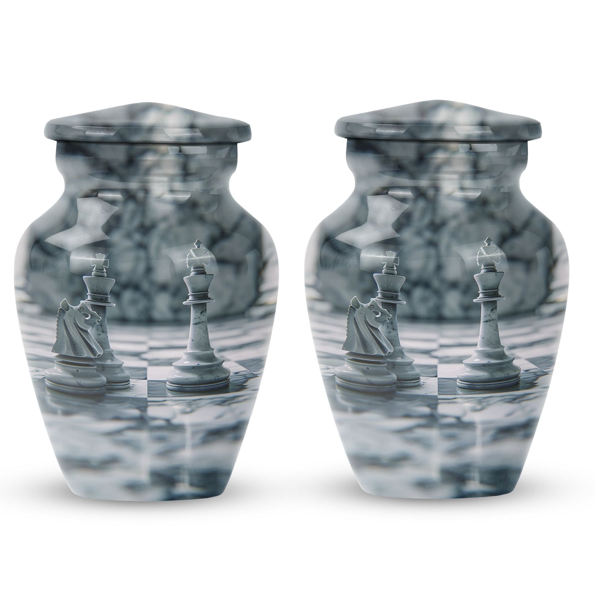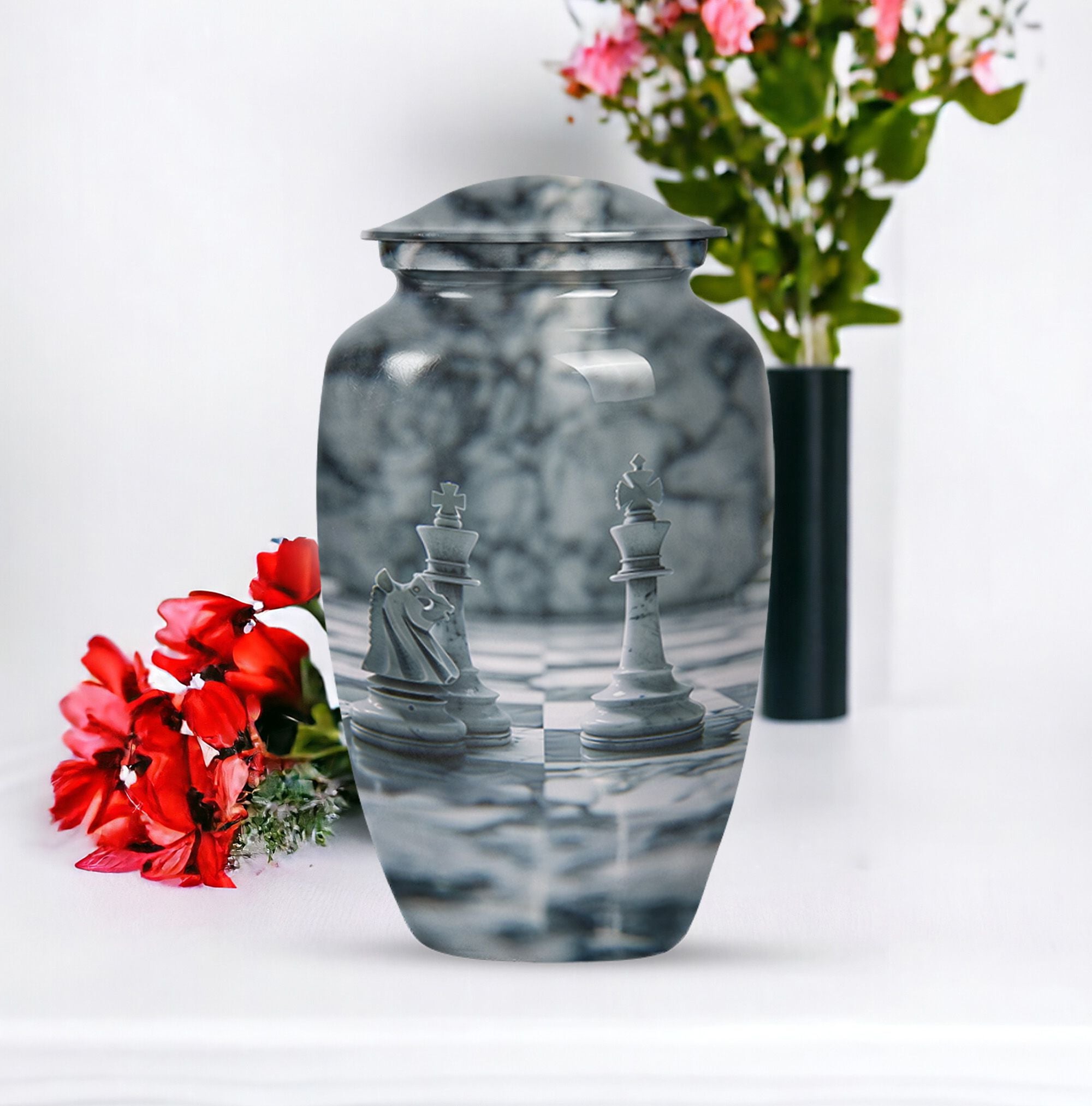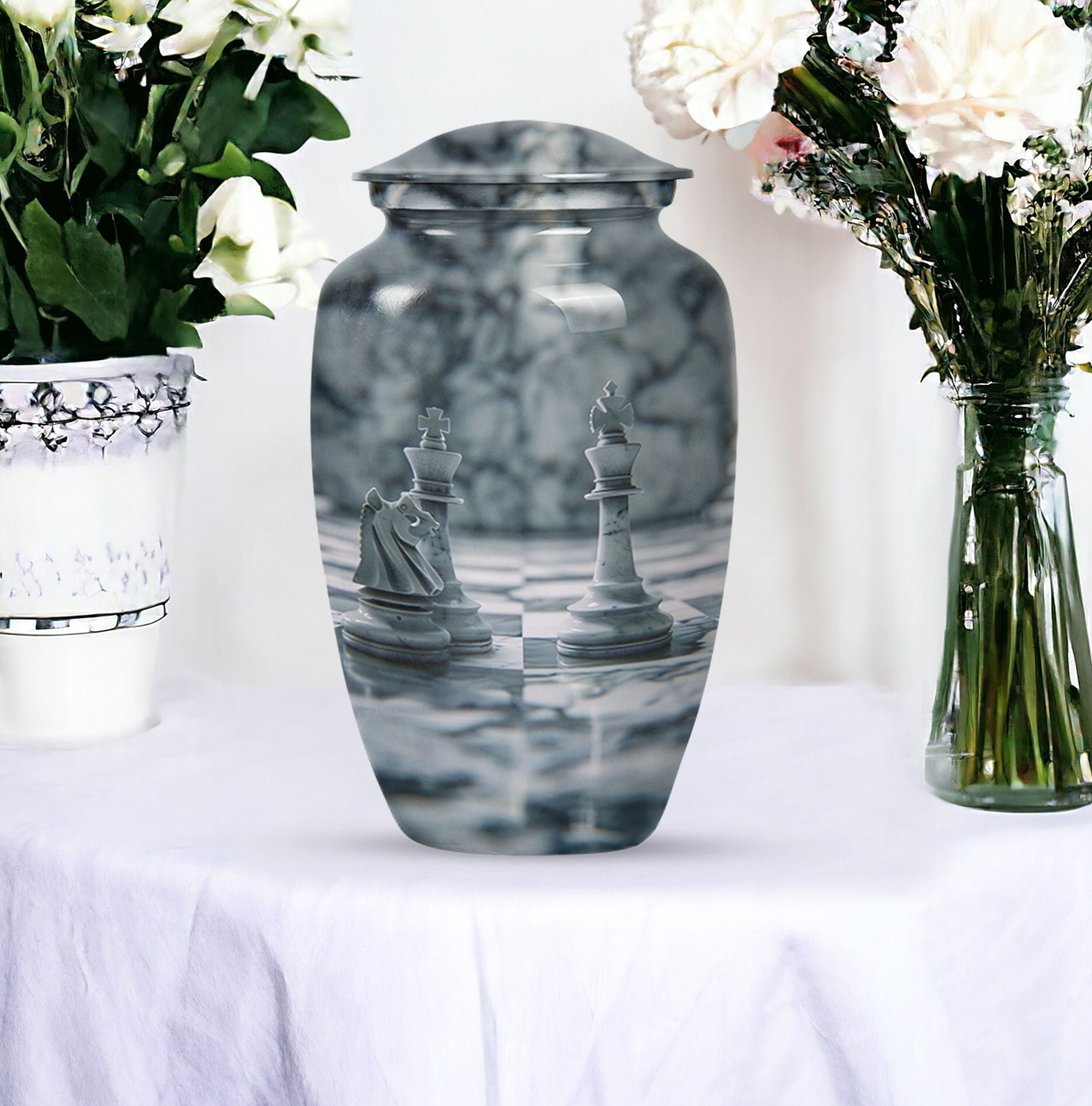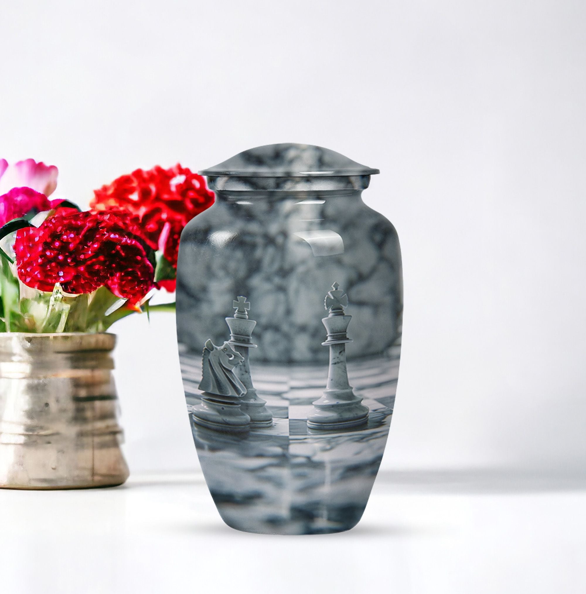 Discover a powerful symbol of eternal tranquility with our Abstract Urn, a meticulously crafted cremation urn ideal for memorializing an adult male. This urn, standing 10-Inch tall, with a spacious volume of 200 cubic inches, features an unassuming yet striking abstract theme that soothes the heart with its timeless appeal. Created from sturdy aluminium, this large urn weighs a solid 3.3 pounds, blending strength with elegance. We understand that every memory is unique, that's why we offer customization options, allowing you to personalize this cremation urn with engraved names. This package includes a velvet pouch, providing a dignified space for containment of ashes. Whether you're looking for urns for males, portable urns for travel, or urn for ashes of a female, this versatile urn fits the bill perfectly. Invoke a sense of serenity in your metal mandir at home with this elegantly abstract urn, making every memory immortal.