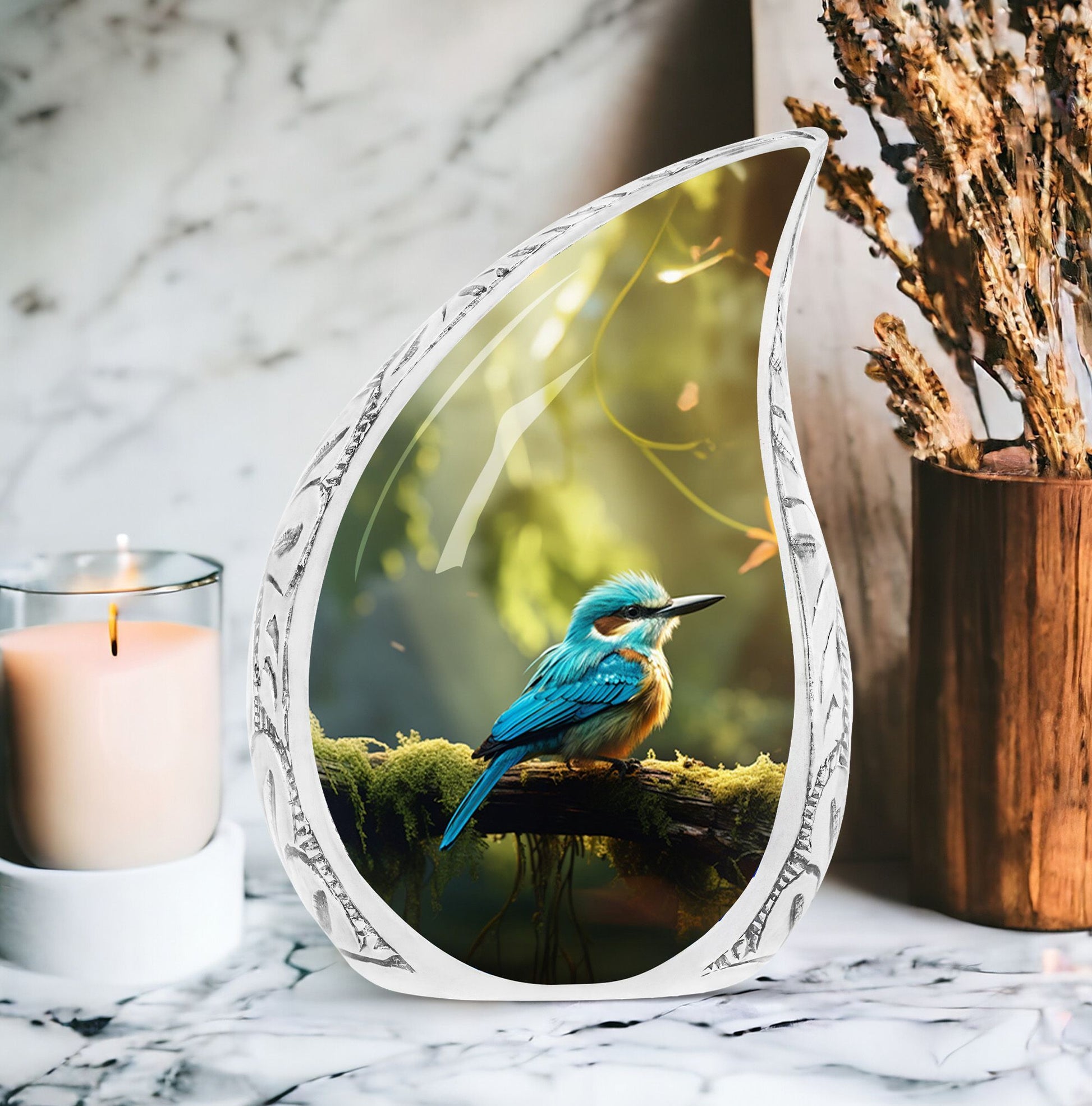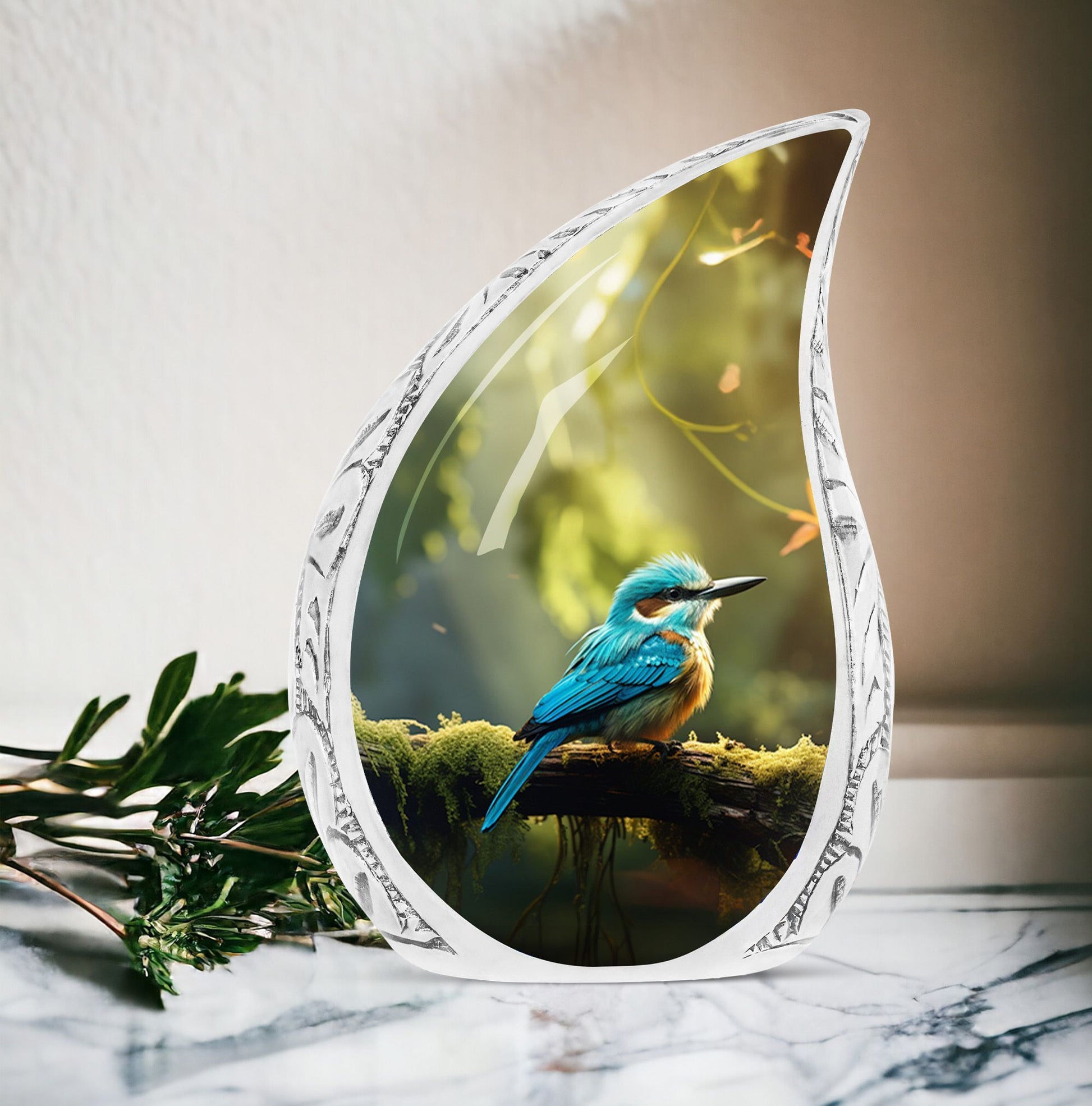 Celebrate a lifetime of memories with our 'Blue Sparrow Urn', a timeless, large urn that is an embodiment of remembrance and respect. Crafted with precision from sturdy aluminium, this urn weighs 3.3 pounds and stands 10 inches tall. Its large size bolsters a capacity of 200 cubic inches, ample space to safeguard the ashes of your beloved. Our cremation urns come packaged with a velvet pouch, providing a dignified containment for the remains. This 3-inch memorial urn serves not just as an ashes holder but a tribute to the life spent. For a truly unique urn for ashes, we offer the service to personalize this piece with engraved names, adding that special touch. With the Blue Sparrow Urn, you carry close the precious vestiges and memories of your loved ones. Please note, the design is a Classic Urn, making it a perfect addition to your memorial ceremony supplies. Remember and cherish, with our personally customizable, large urns for ashes.