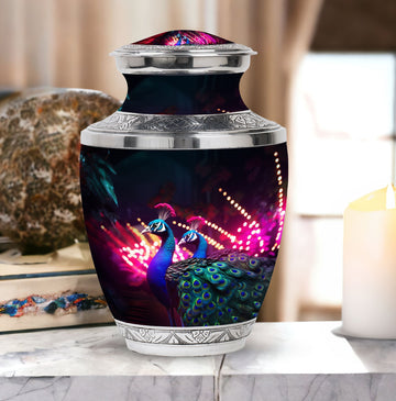 Engulfed in the essence of reverence and graceful elegance, this 3-inch Peacock Cremation Urn serves as a touching emblem of love and respect to your departed ones. Crafted from sturdy Aluminum, it balances durability with class, weighing 3.3 pounds with allocation for up to 200 cubic inches of ashes. Its 10-inch height ensures it remains an unmissable piece during memorial ceremonies. It is accompanied by a velvet pouch, providing a respectful containment for the ashes. This memorial urn resonates with unique significance for memories of Dad or Mom, making it an apt addition to memorial urn societies. Personalize this urn by engraving beloved names, adding an intimate touch. To add on, its 'Classic Urn' construction delivers a symbolization of distinct honor and memory. It stands out as an authentic choice amidst Large Urns or Metal Urns for Human Ashes. If you are expressing condolences and saying 'Sorry for your loss', this Decorative Urn for Human Ashes could indeed be a significant selection.