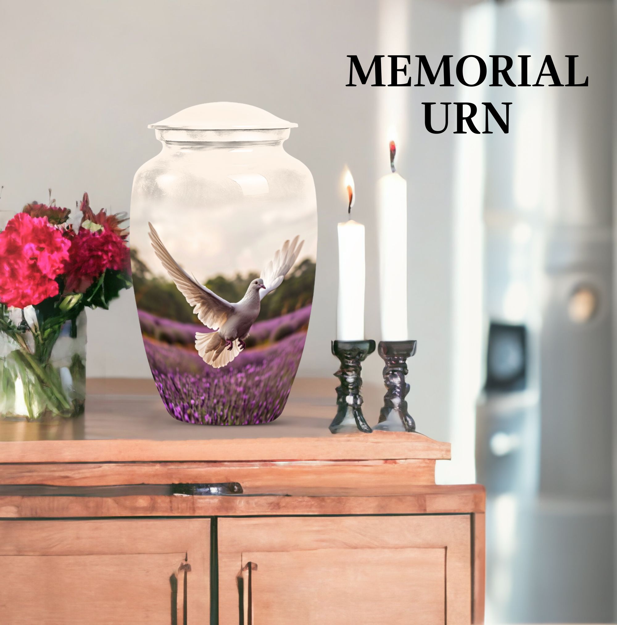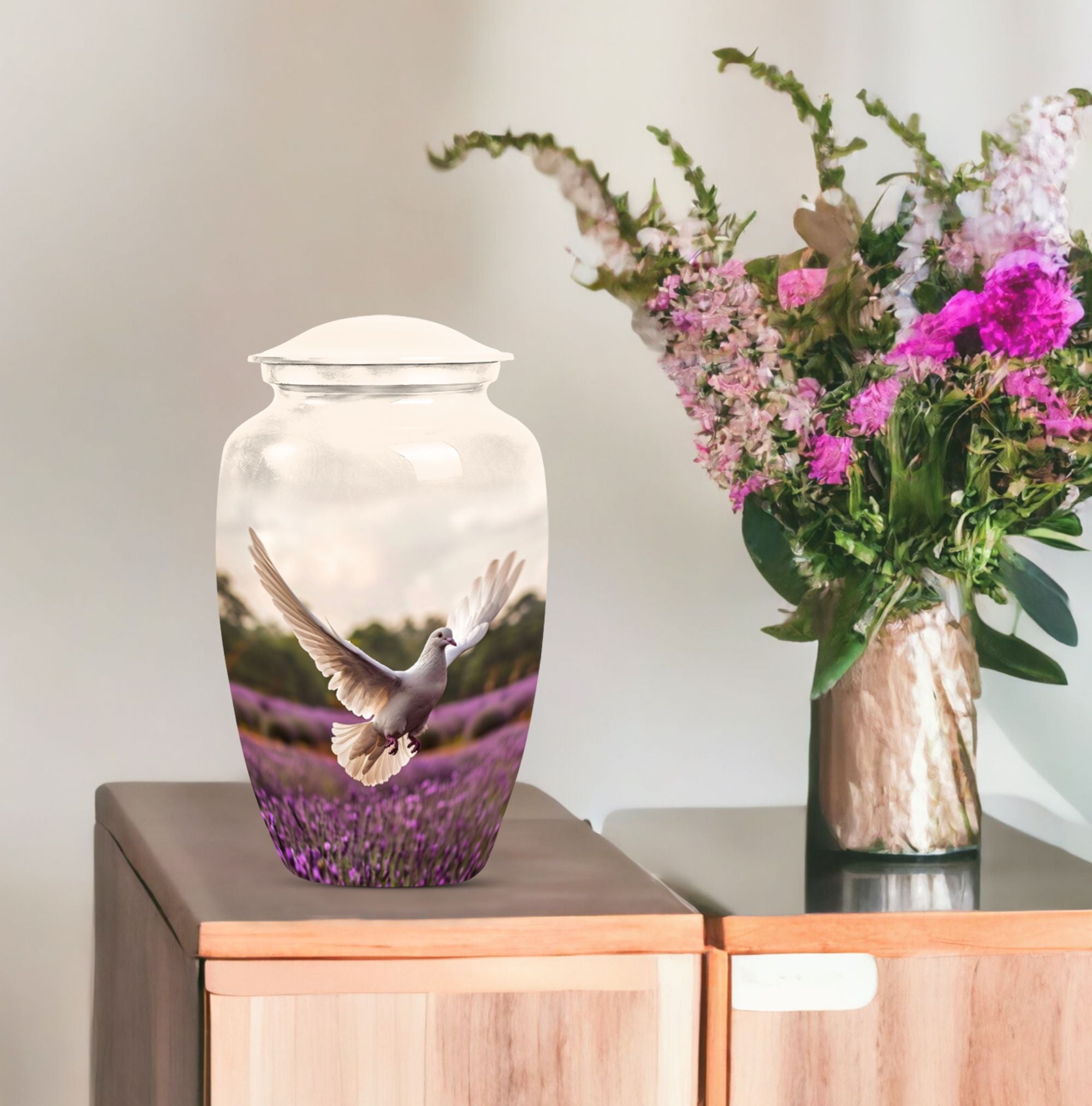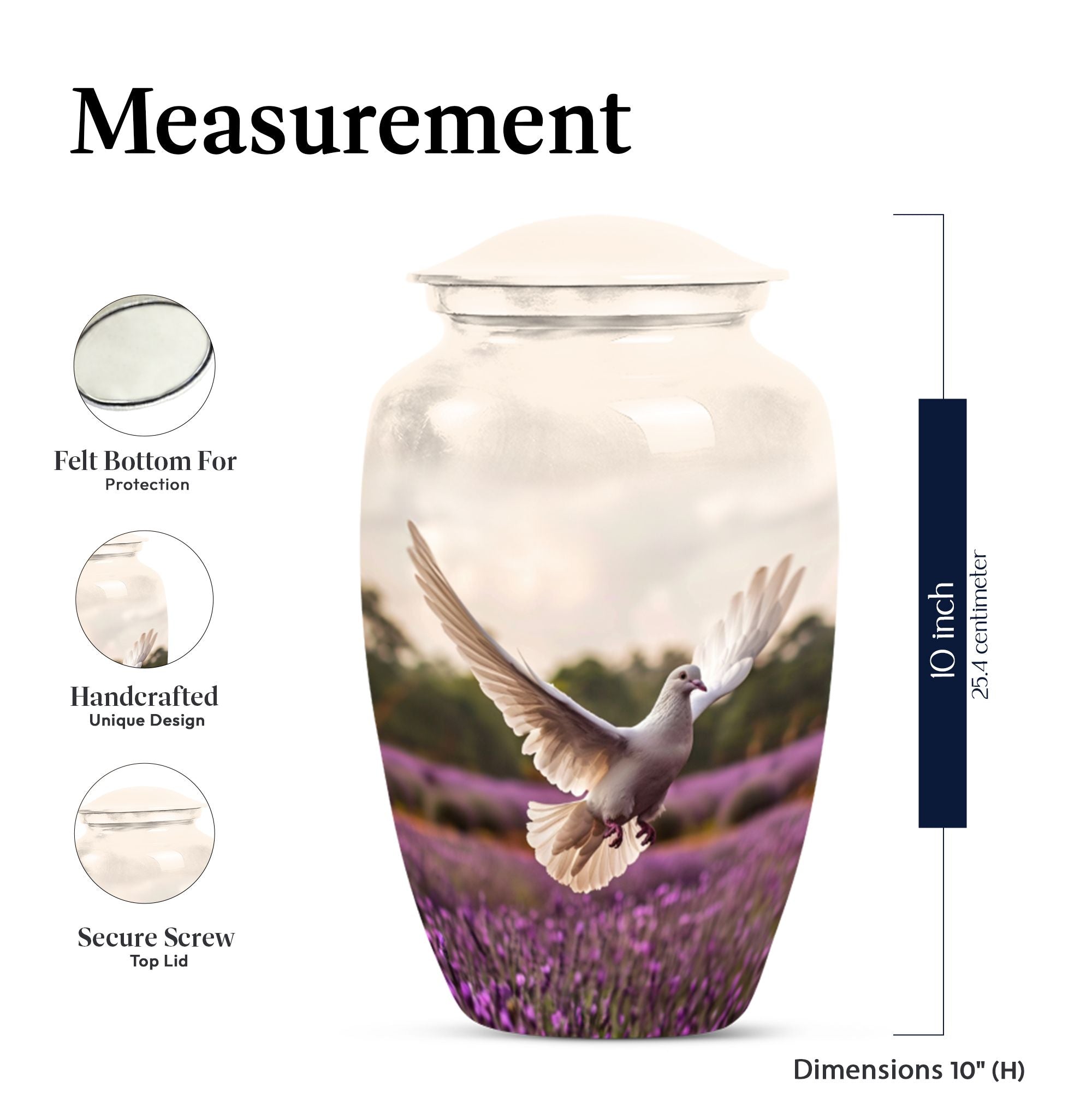 Honor your cherished loved one with this classic large urn meticulously crafted with an impactful butterfly theme that denotes not only the beauty of life but also the ineffable mysteries of death. Adorning a serene motif of a white dove resting on a purple construct, it stands tall at 10 inches, exuding an ethereal elegance. This cremation urn, suitable for an adult male dad or mom, is built from high-quality aluminium, guaranteeing longevity and durability. Accommodating 200 cubic inches of ashes, it weighs a substantial 3.3 pounds, poised in grace and solemnity. The urn comes with a special velvet pouch for containment of ashes, ensuring safe and respectful storage. Personalize the urn with engraved names to maintain a sense of connection and make it truly unique. Primary keywords associated with this product include 'white dove on purple urn, funeral urns, adult male urn, memorial urns for mom', and 'cremation urn for mom'. Among other things, it signifies a handmade tribute to the eternal bond of love and memories that transcends time, a profound choice for memorial ceremonies. Please note: The urn design reflects a classic style and does not offer variation in the design segment.