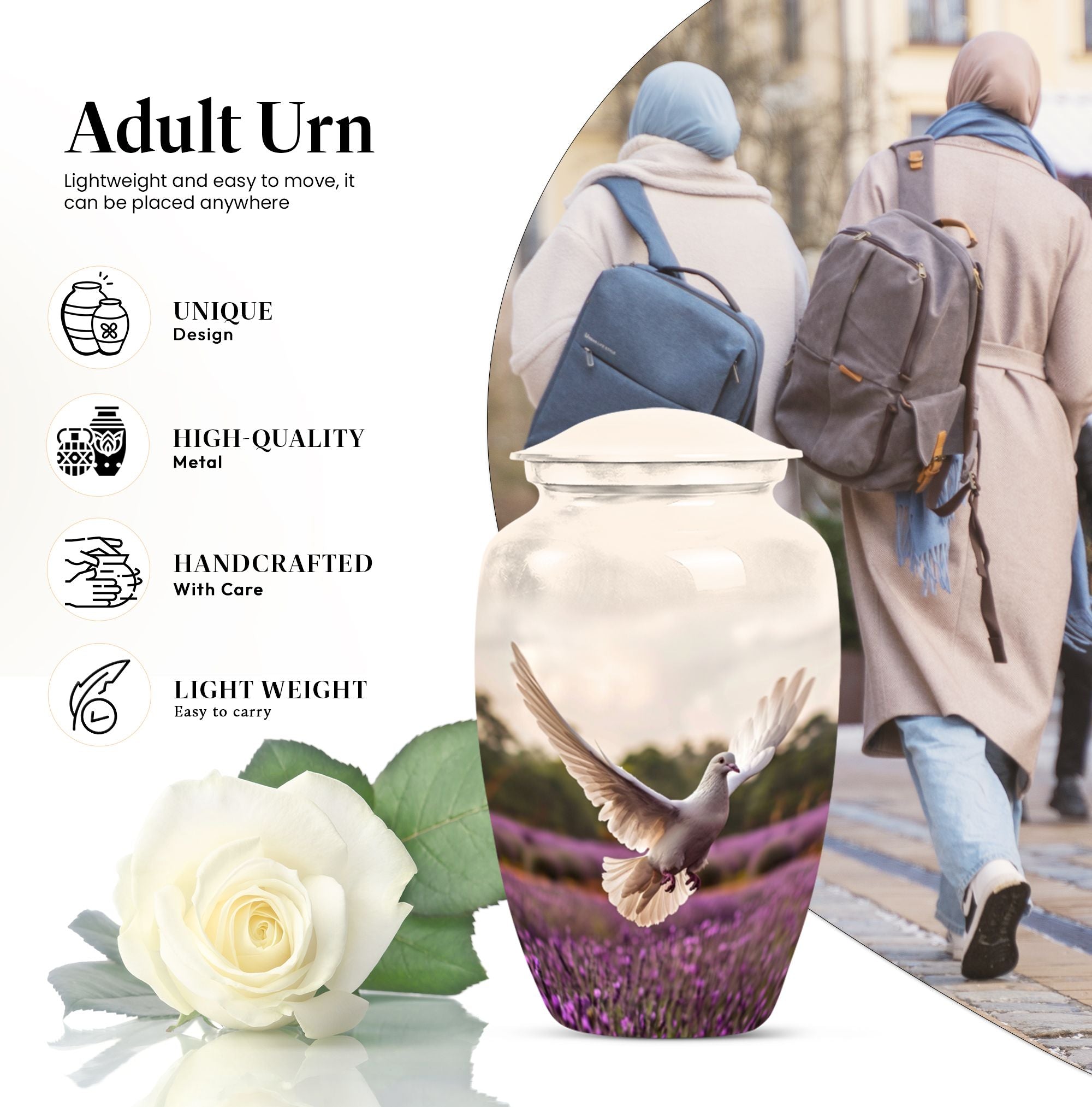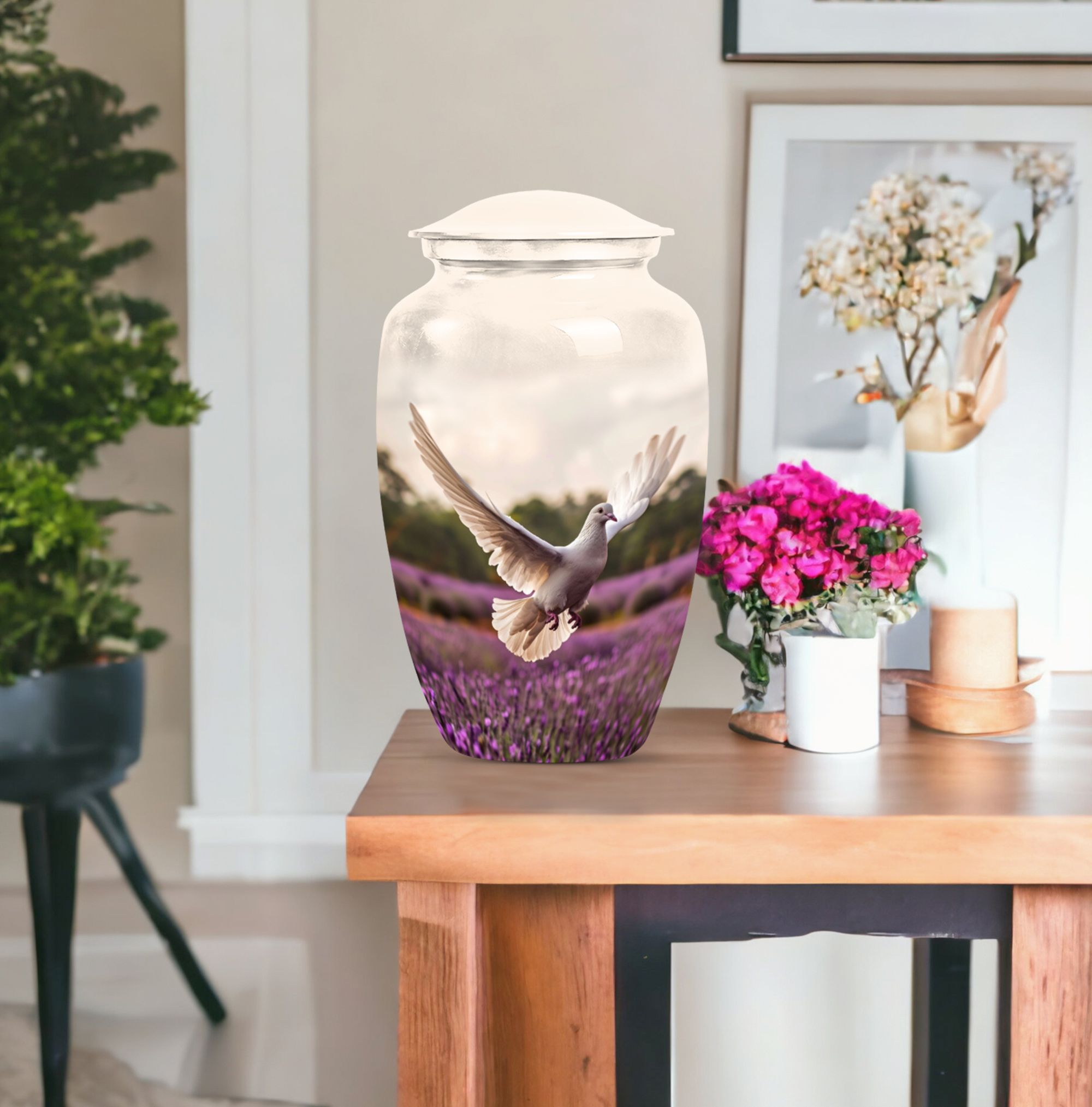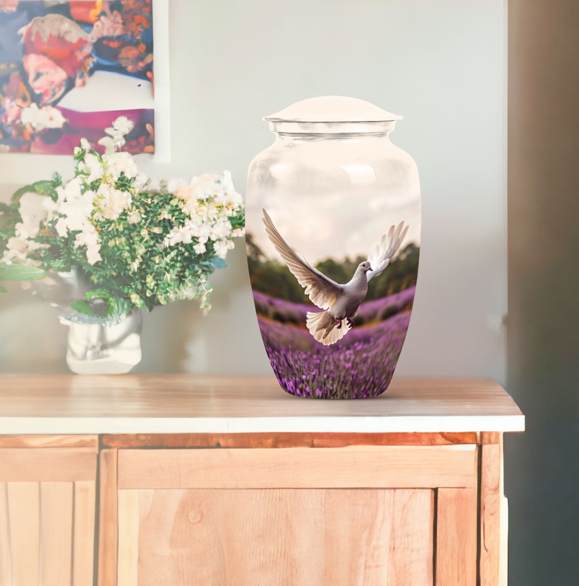 Honor your cherished loved one with this classic large urn meticulously crafted with an impactful butterfly theme that denotes not only the beauty of life but also the ineffable mysteries of death. Adorning a serene motif of a white dove resting on a purple construct, it stands tall at 10 inches, exuding an ethereal elegance. This cremation urn, suitable for an adult male dad or mom, is built from high-quality aluminium, guaranteeing longevity and durability. Accommodating 200 cubic inches of ashes, it weighs a substantial 3.3 pounds, poised in grace and solemnity. The urn comes with a special velvet pouch for containment of ashes, ensuring safe and respectful storage. Personalize the urn with engraved names to maintain a sense of connection and make it truly unique. Primary keywords associated with this product include 'white dove on purple urn, funeral urns, adult male urn, memorial urns for mom', and 'cremation urn for mom'. Among other things, it signifies a handmade tribute to the eternal bond of love and memories that transcends time, a profound choice for memorial ceremonies. Please note: The urn design reflects a classic style and does not offer variation in the design segment.