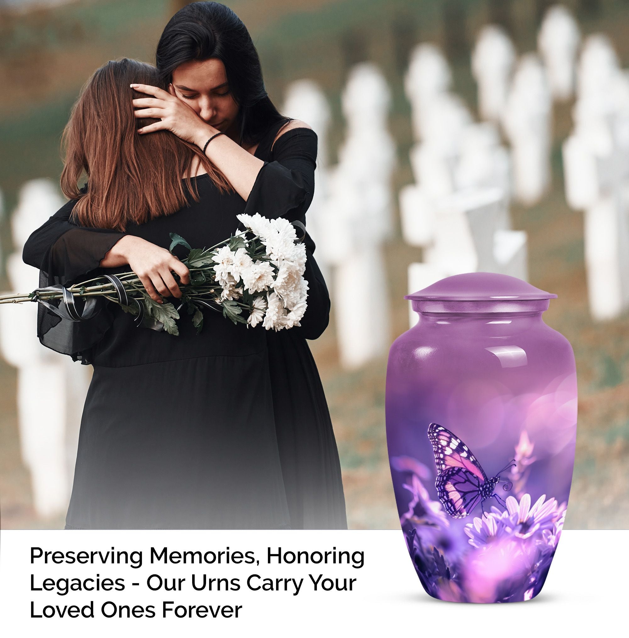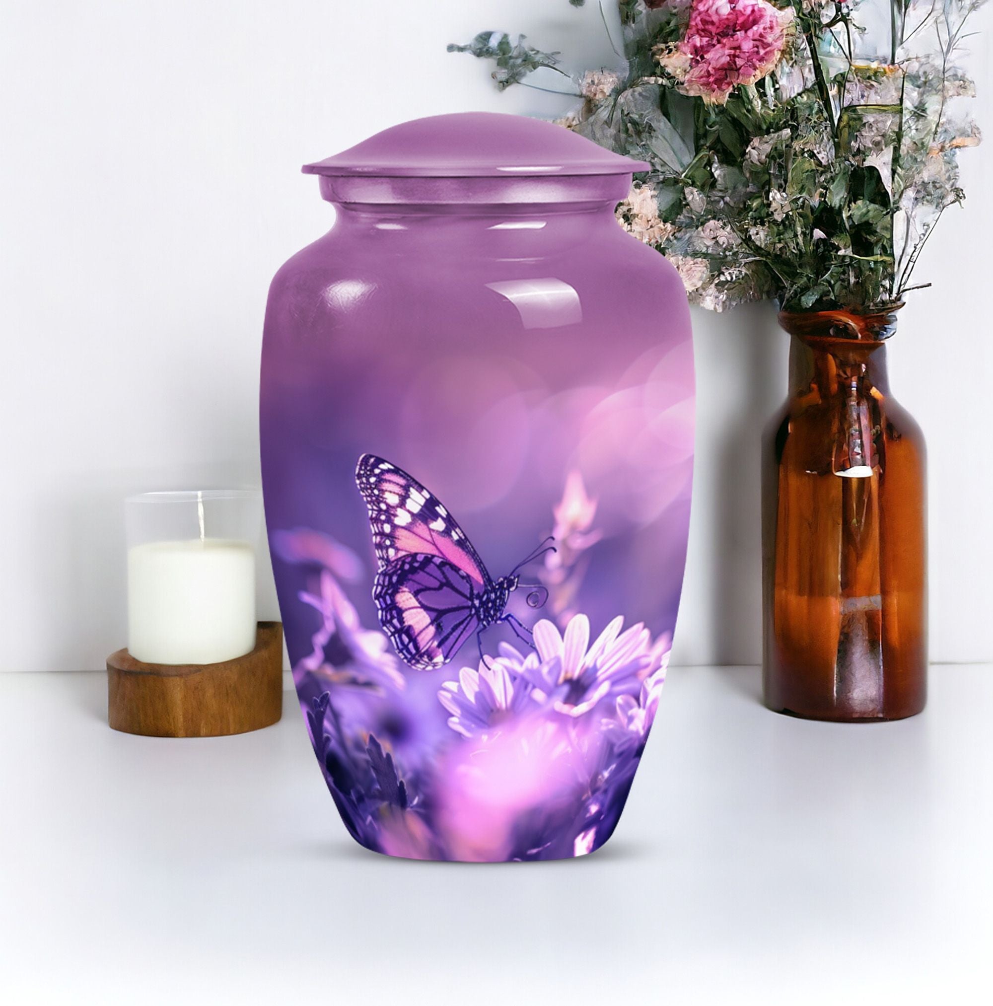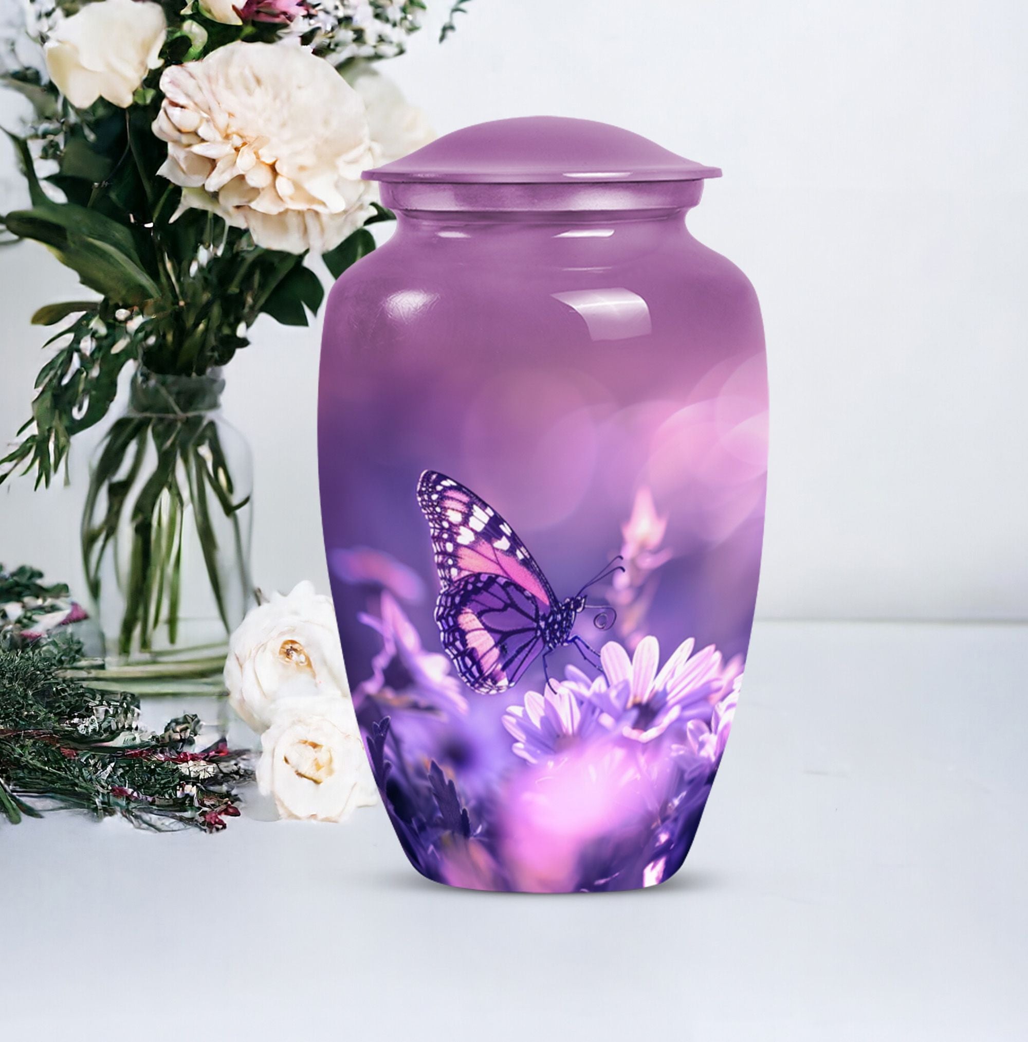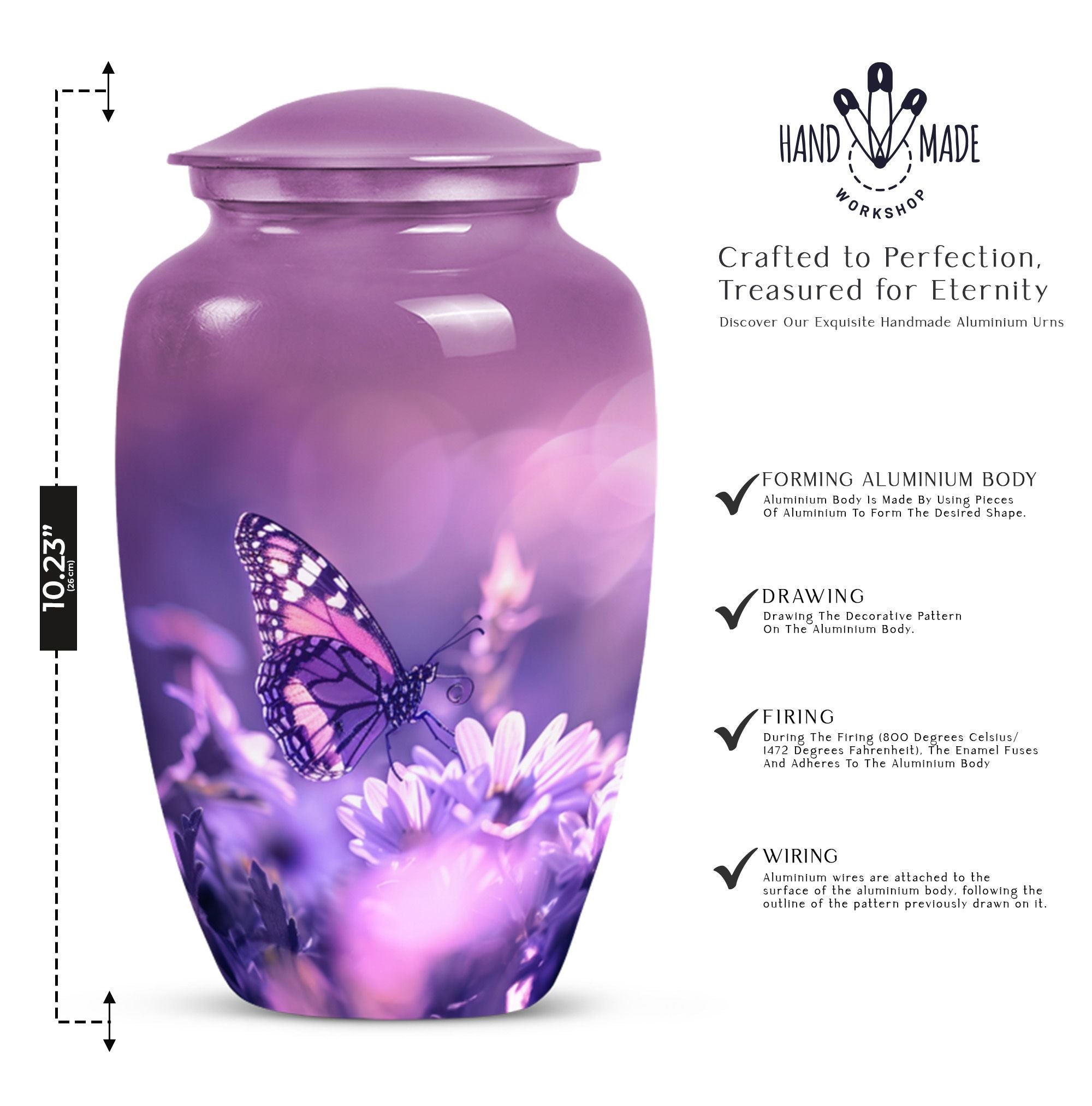 Reflect on the life of your beloved with this high-quality, meticulously crafted 10 Inch Butterfly Urn, the perfect solution to store the ashes of an adult. Tailored per your preference, this funeral urn offers personalization; carve the engrave names of your missed ones, adding a unique, personal touch. Our large urn weighing 3.3 pounds outstands with its abstract theme; its aluminum material design offers lasting durability against time. The urn boasts a capacity of 200 cubic inches, ensuring plenty of space for ashes. With each purchase comes a velvet pouch, providing an extra layer of safeguarding for containment of ashes. Whether you are searching for memorial urns or metallic urns for adult male dad or urn ash men, this product serves your needs with its unique yet classic design. Remember, every bit of this urn represents your love and memories, making it an ideal keepsake for reminiscence.