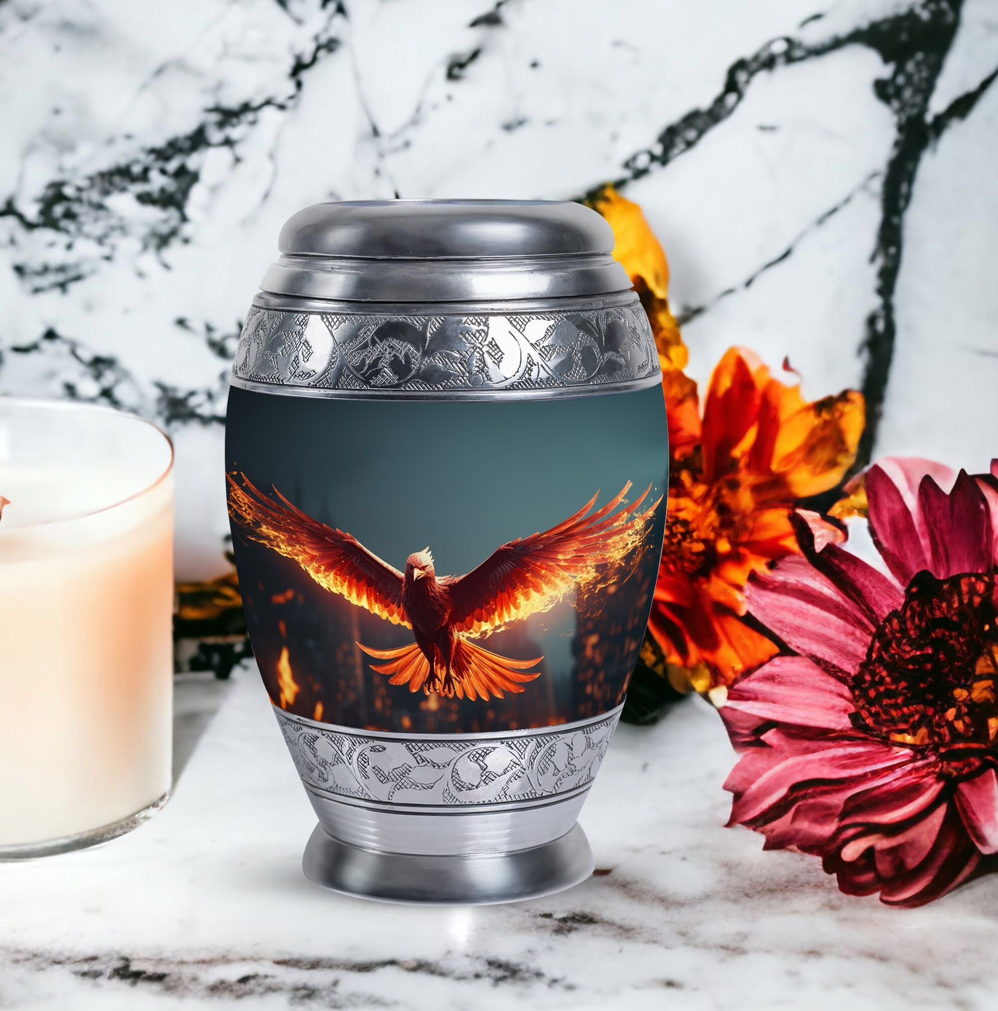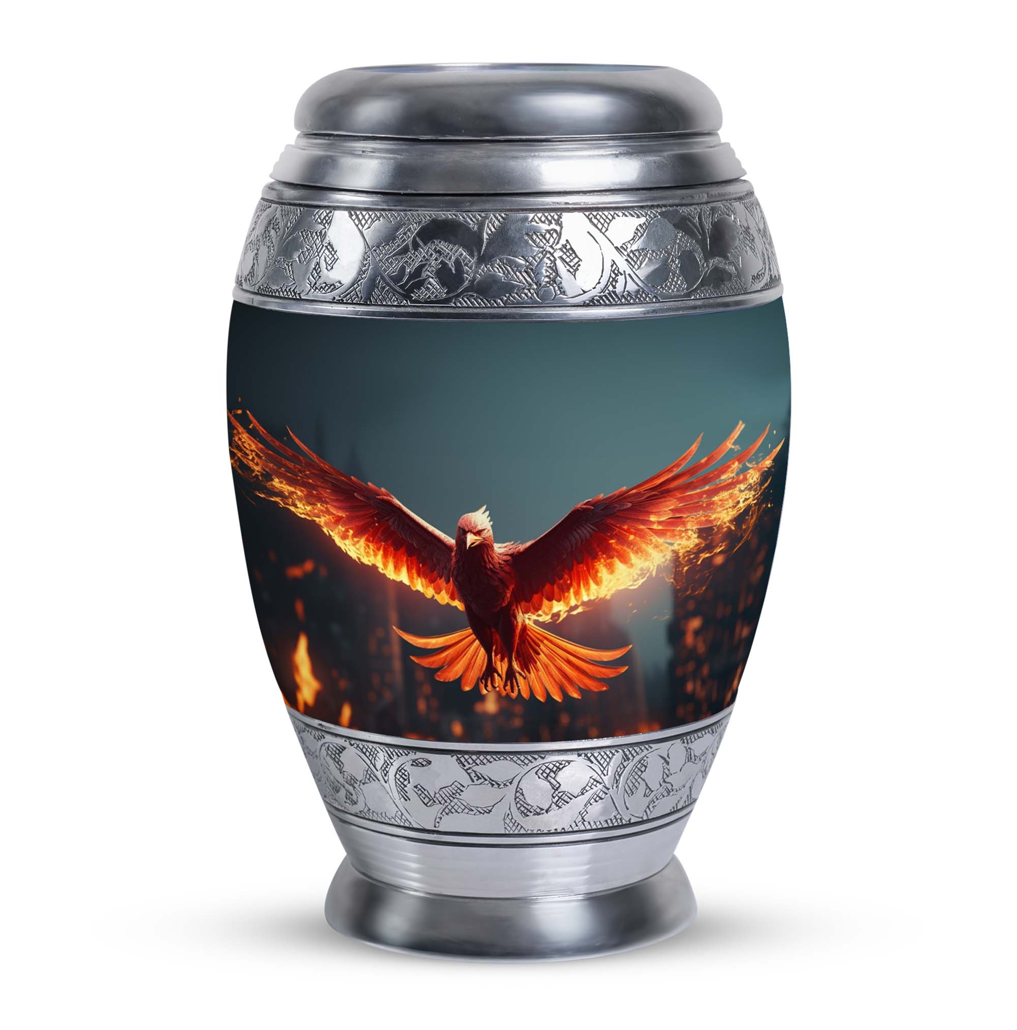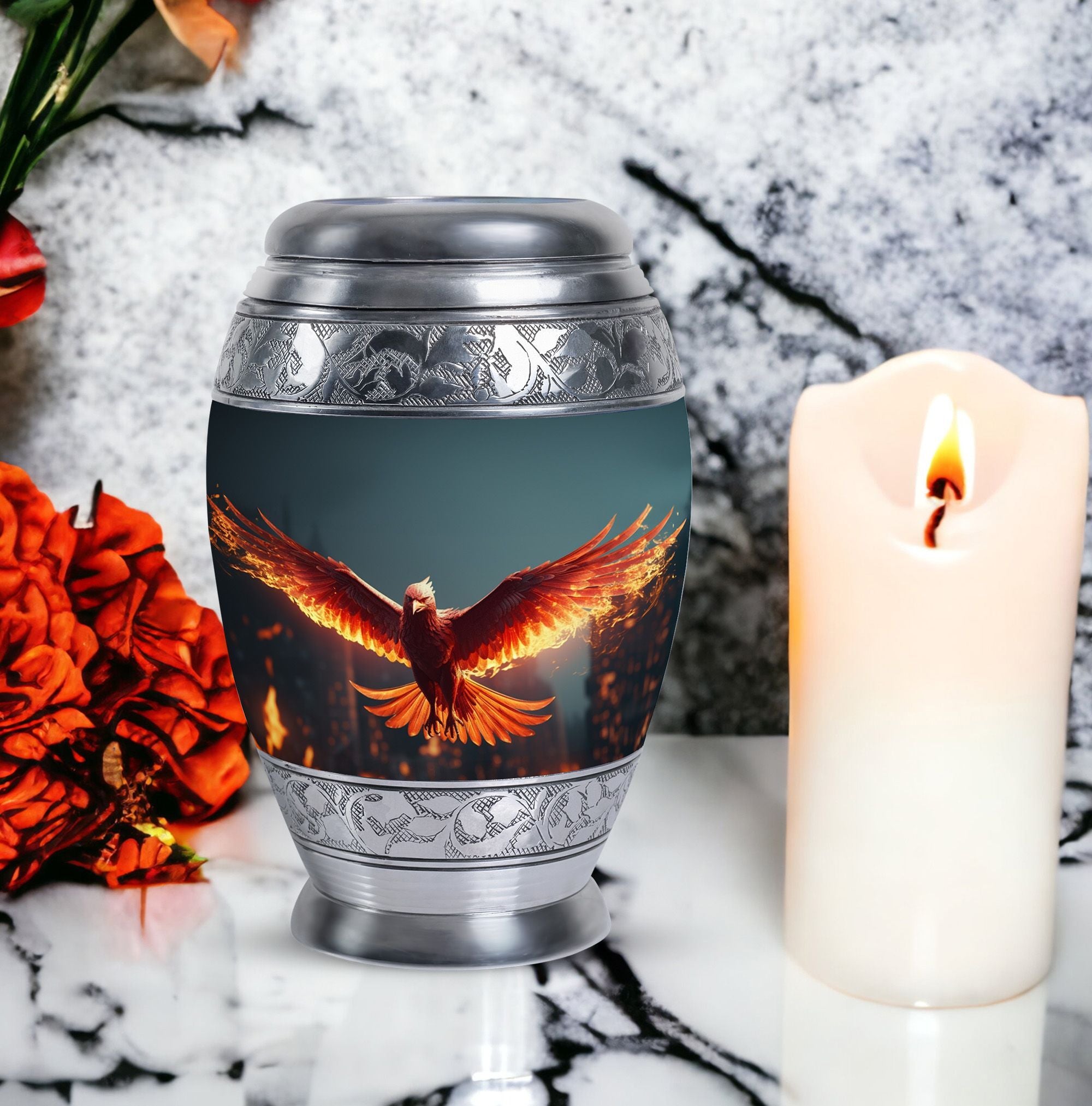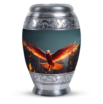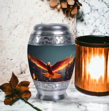 Large and captivating, our 'Angry Red Phoenix Urns for Ashes' exemplify tradition and significance in every detail. Crafted from durable aluminium, these 10-inch-high, keepsake urns offer a substantial capacity of 200 cubic inches, ideal for honoring your loved one's legacy. This classic urn, weighing a solid 3.3 pounds, not only offers a secure resting place for ashes, but communicates a powerful, everlasting tribute. Each Angy Red Phoenix Urn comes with a velvet pouch, enhancing the containment of ashes and providing additional respect to the departed. Perfectly sized at 3 inches, our urn can be personalized with engraved names, elevating its significance and sentimental value. Keywords like 'Burial Urns for Ashes', 'Modern Urn', and 'Personalised Urns' also centrally define our product, signaling its value to those seeking meaningful memorial urns. Regardless of your religious or ceremonial preferences, our urns reflect honor, reverence, and a splendid tribute to departed souls.