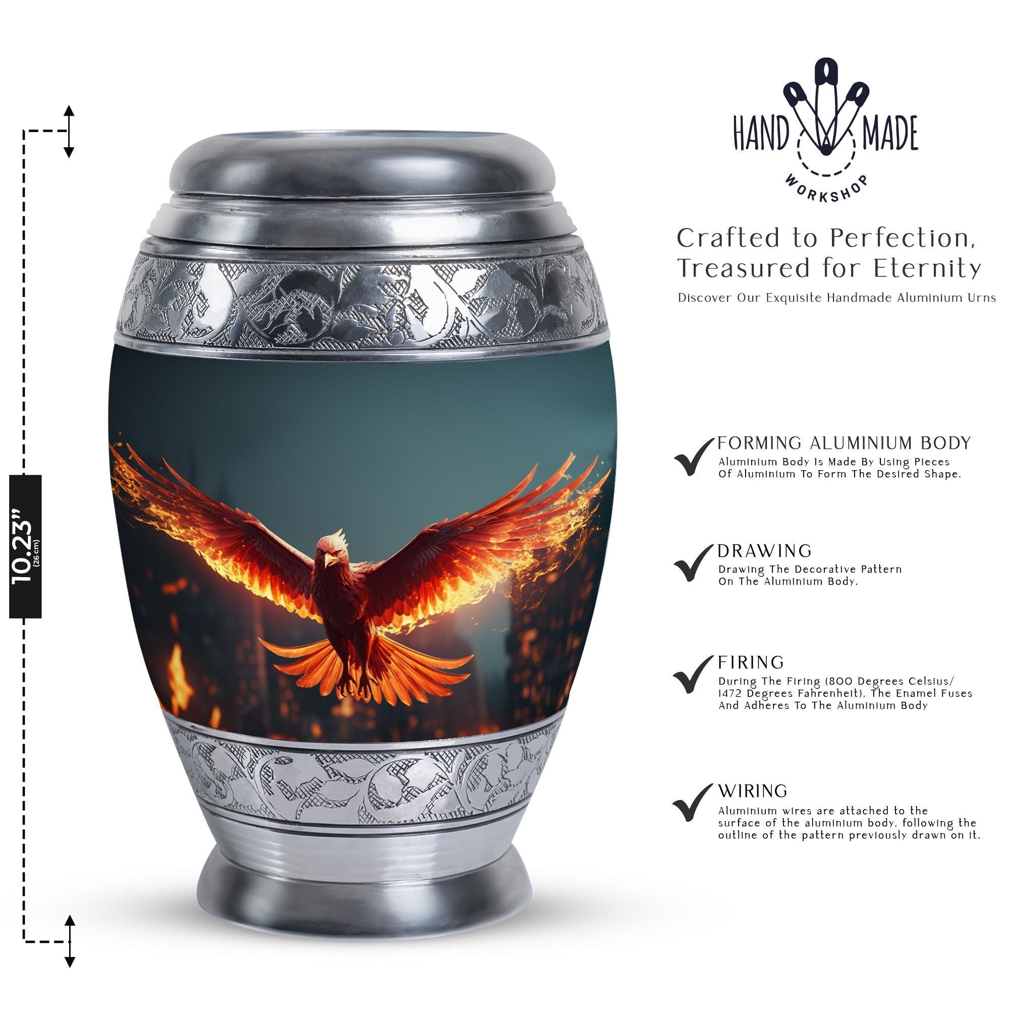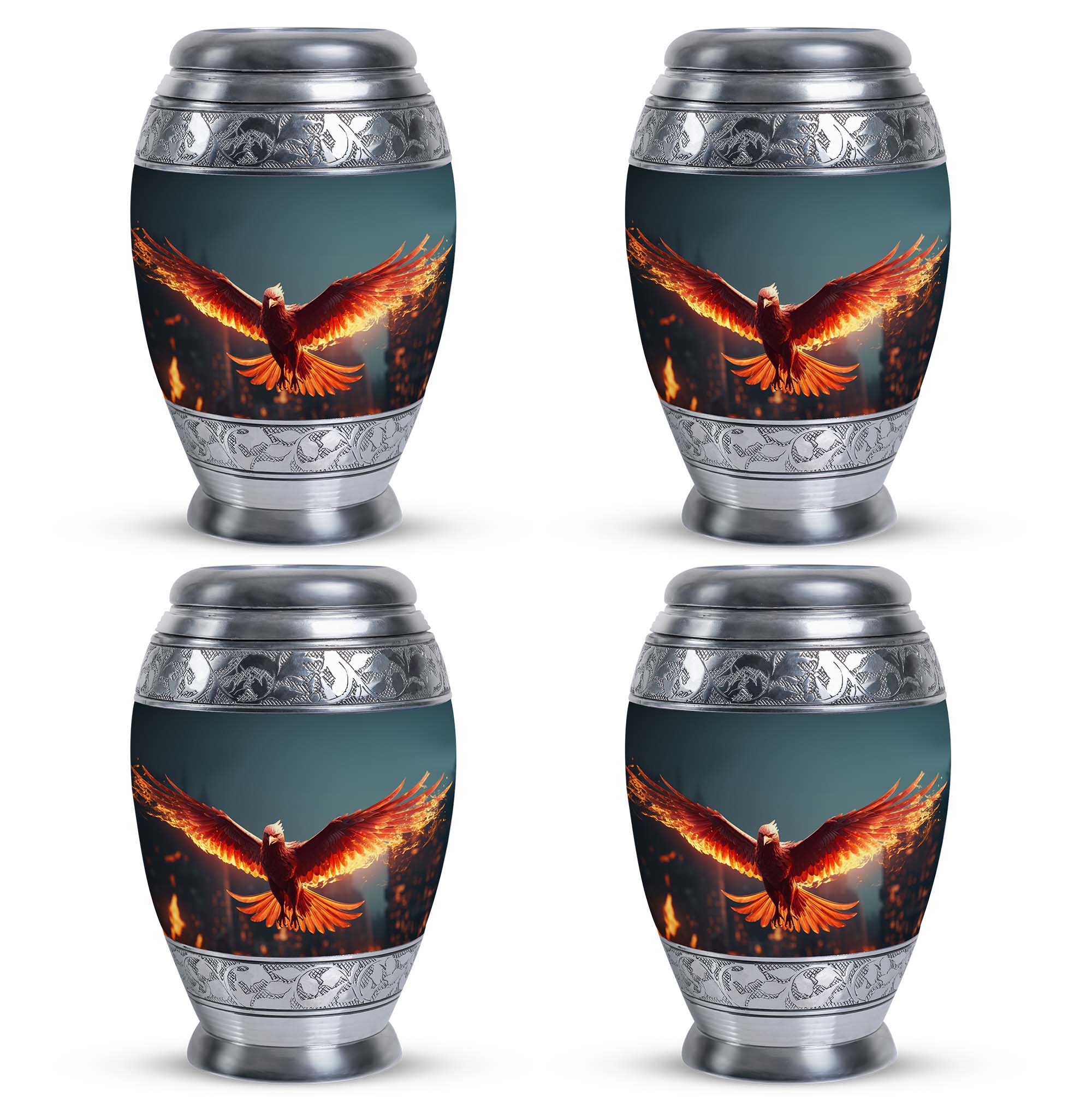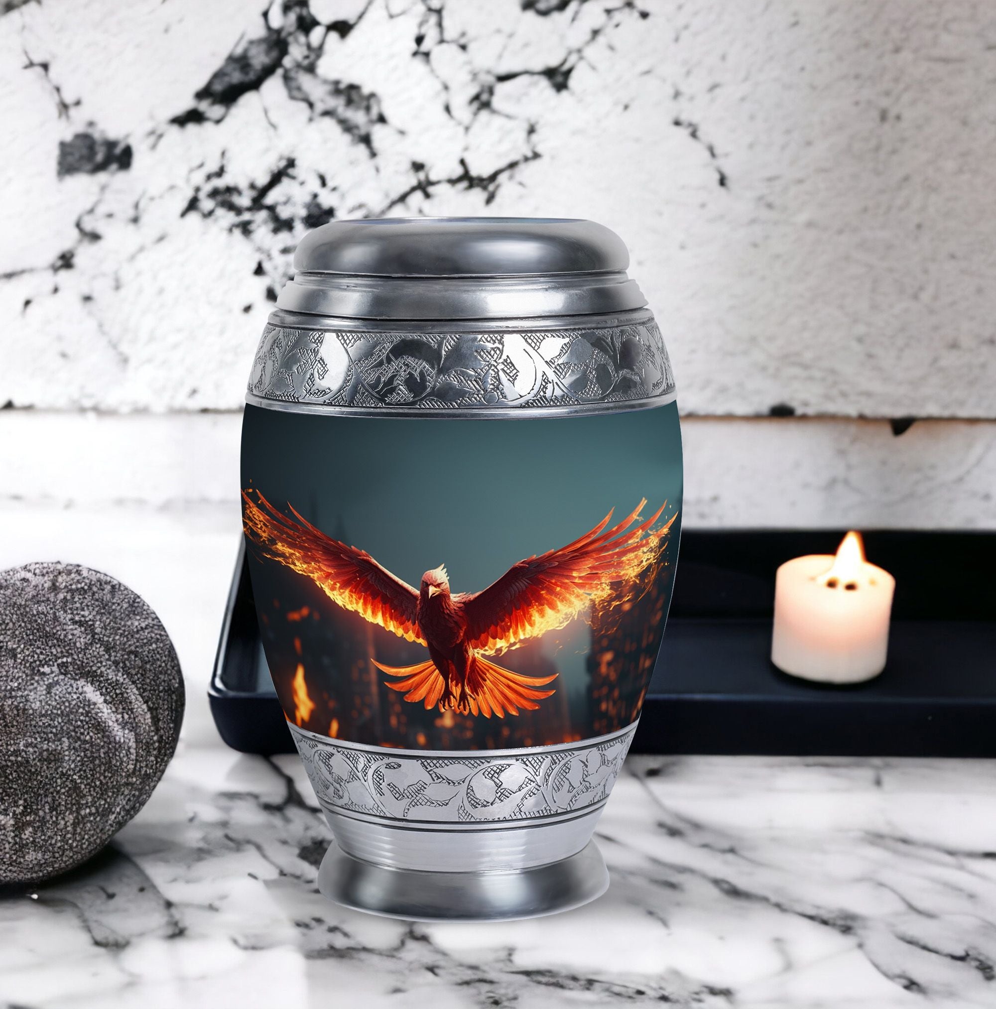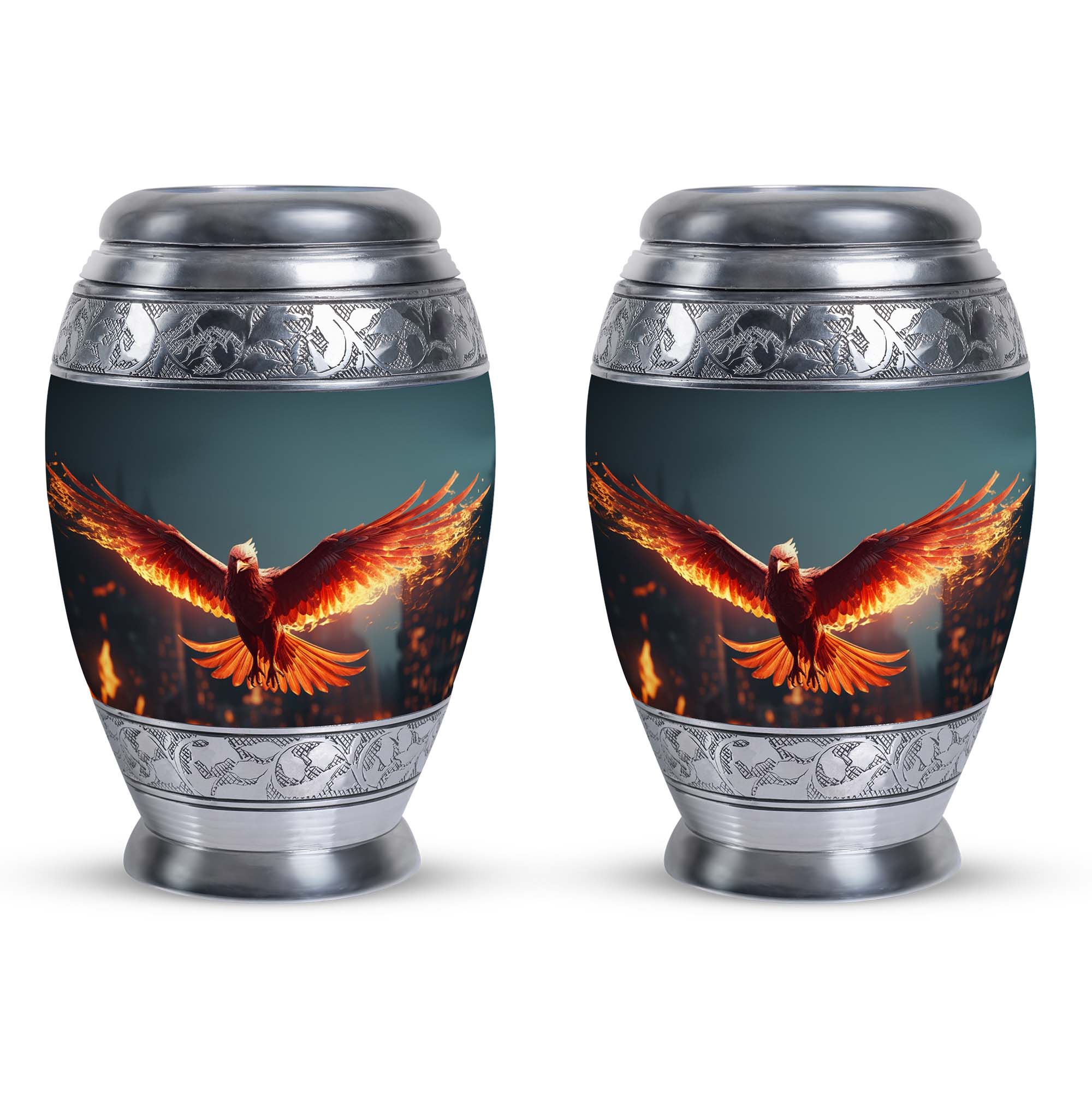 Large and captivating, our 'Angry Red Phoenix Urns for Ashes' exemplify tradition and significance in every detail. Crafted from durable aluminium, these 10-inch-high, keepsake urns offer a substantial capacity of 200 cubic inches, ideal for honoring your loved one's legacy. This classic urn, weighing a solid 3.3 pounds, not only offers a secure resting place for ashes, but communicates a powerful, everlasting tribute. Each Angy Red Phoenix Urn comes with a velvet pouch, enhancing the containment of ashes and providing additional respect to the departed. Perfectly sized at 3 inches, our urn can be personalized with engraved names, elevating its significance and sentimental value. Keywords like 'Burial Urns for Ashes', 'Modern Urn', and 'Personalised Urns' also centrally define our product, signaling its value to those seeking meaningful memorial urns. Regardless of your religious or ceremonial preferences, our urns reflect honor, reverence, and a splendid tribute to departed souls.