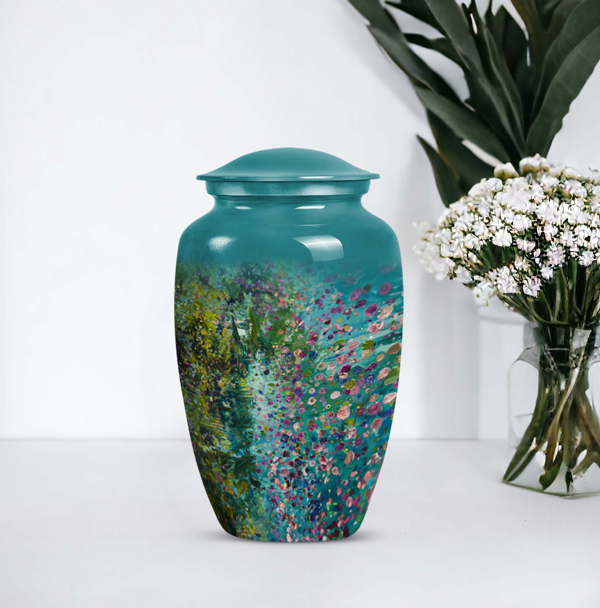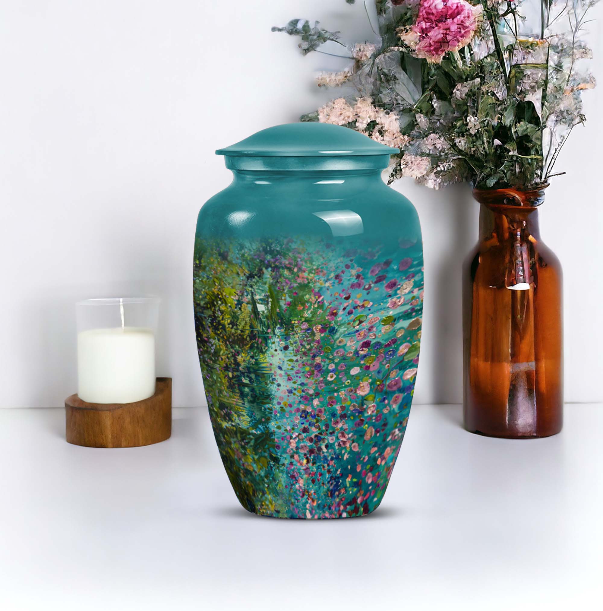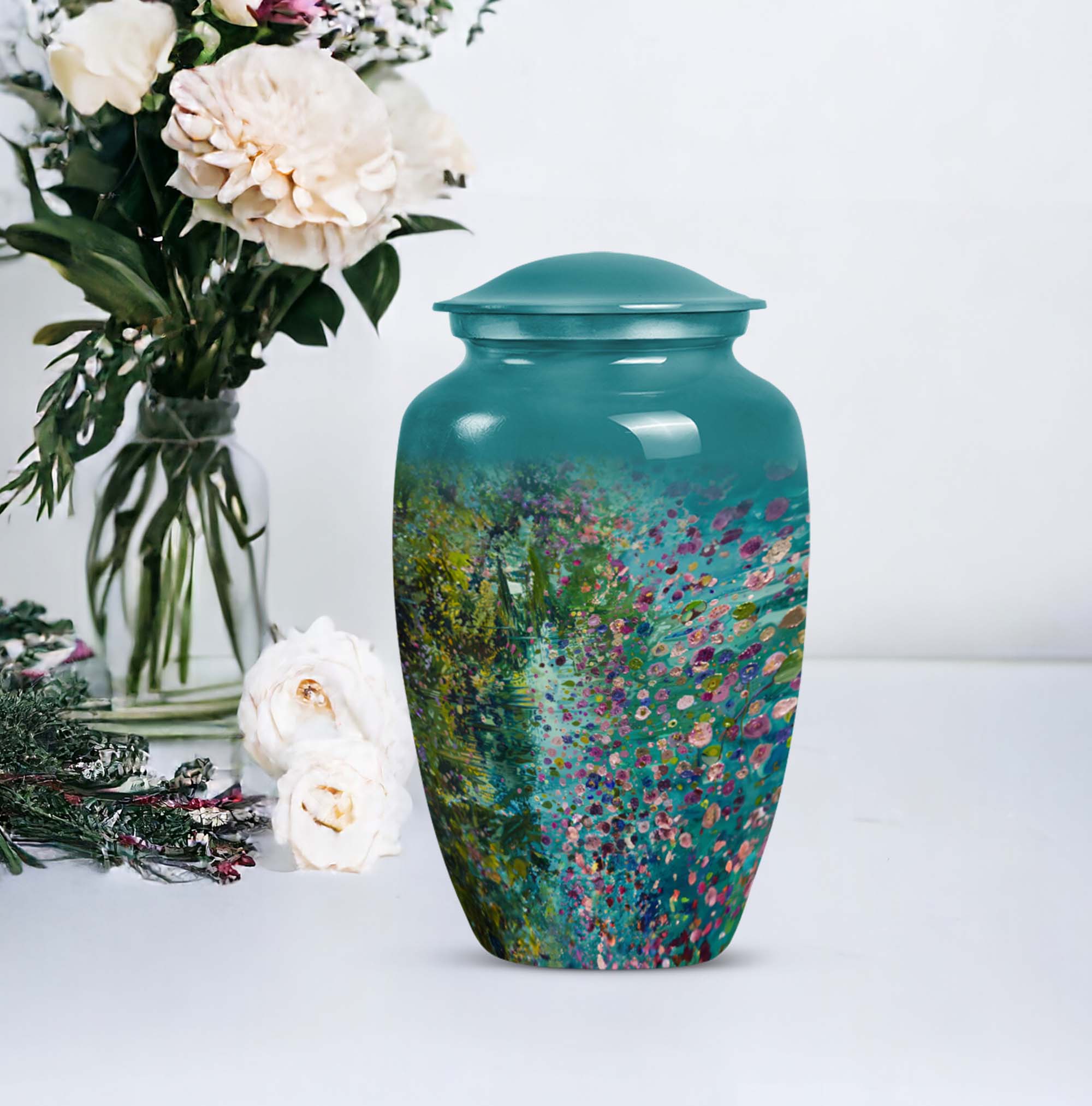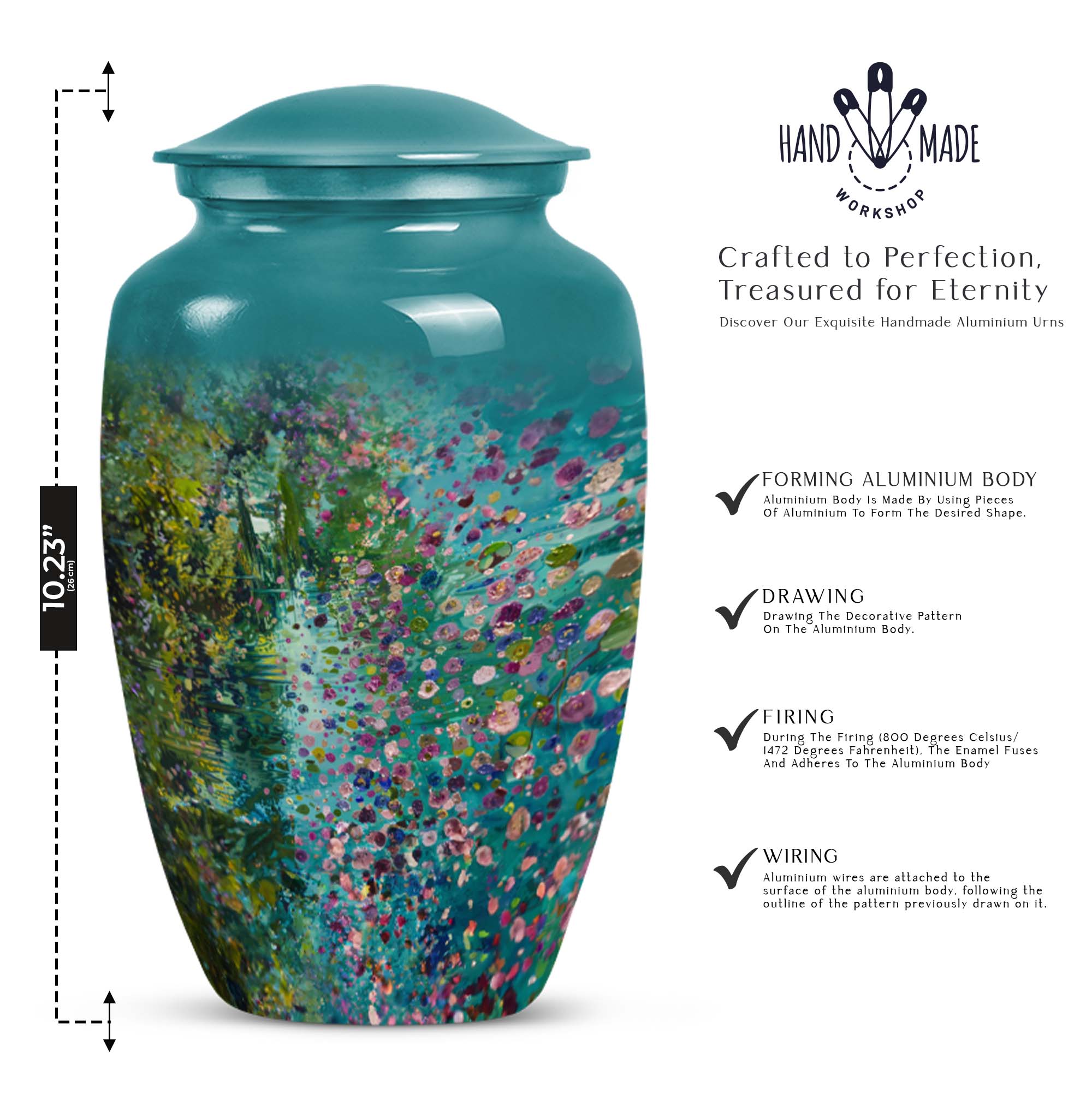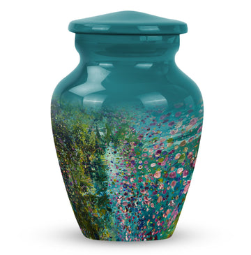 Flaunting an exemplary combination of spirituality, strength, and style, the FLOWERS Urn delicately crafts an aura of solemn beauty and remembrance, making it a top choice for funeral adult urns for human ashes. Handcrafted with premium-grade Aluminium, this Large Urn stands at a notable height of 10 inches and weighs 3.3 pounds, providing a sturdy and calming presence. Its capacity of 200 cubic inches ensures a fitting and respectful containment of your cherished one's ashes. This cremation urn brings a gentle charm with its floral theme, each bloom thoughtfully symbolising the cyclicality of life. Included is a plush velvet pouch for the compassionate containment of ashes, a discreet and touching tribute. For a more personal feel, seize the opportunity to engrave names on this classic urn design, further cementing your precious memories. Whether you're searching for 'memorial forever urns,' 'urn human women,' or 'urns for mom', FLOWERS Urn offers a unique amalgamation of elegance, durability, and sentiment.