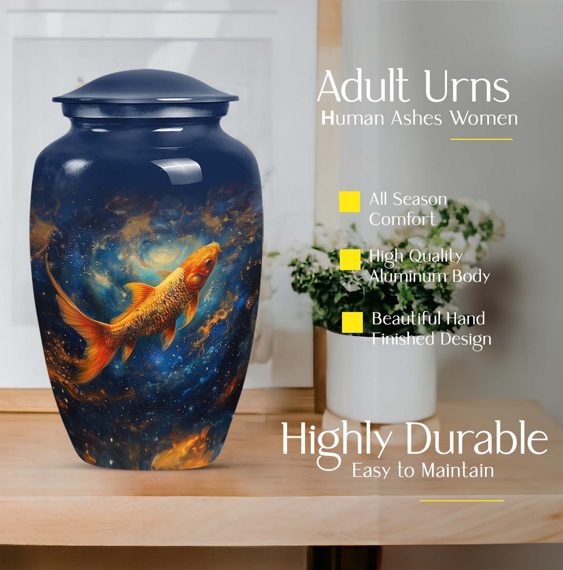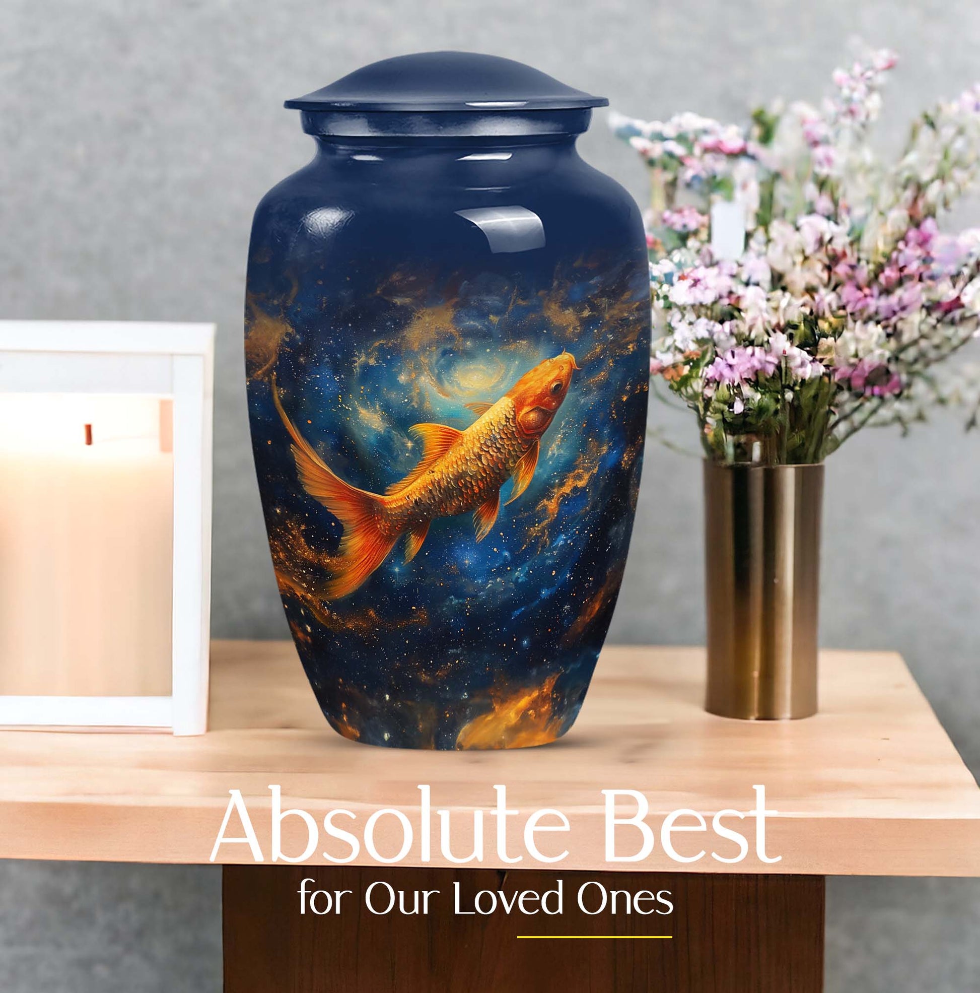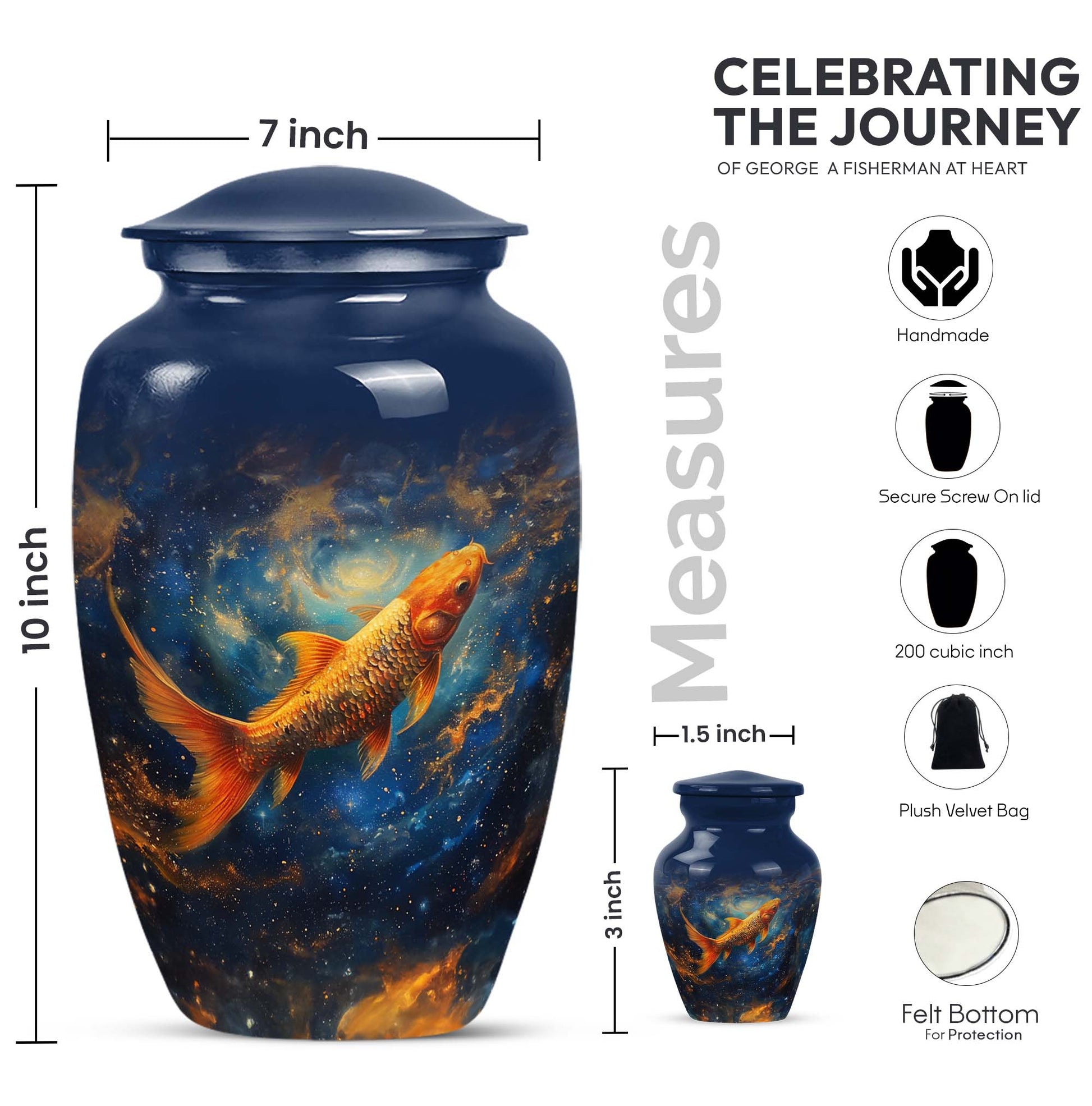 Our 10-inch large fish urn is more than just a memorial item, it's a respectful and honoring statement for your dearly departed. Crafted from refined and durable aluminium, this large urn has been designed with meticulous attention to detail. Its weight of 3.3 pounds testifies to its robust make, designed to stand the test of time. The abstract theme of the urn speaks volumes about the enigmatic journey of life making it well suited for adults and seniors seeking an artistic approach to memorialization. This memorial human urn has a significant capacity of 200 cubic inches, ensuring ample space for ashes. Unlike many other urns, this vital piece comes with a velvet pouch for the containment of ashes, adding an extra layer of care and respect with which we approach the sacred task of memorialization. The urn is also customizable, with the option to personalize it with engraved names, subtly adding a personal touch. This item belongs to the category of memorial funeral urns for ashes and it elevates the adult burial urn tradition by incorporating modern stylistic elements. This transcendent piece, also related to 'ashes of love', is appreciated by customers searching for unique, metal large urns. Note: the design element of the product has not been considered in this description.