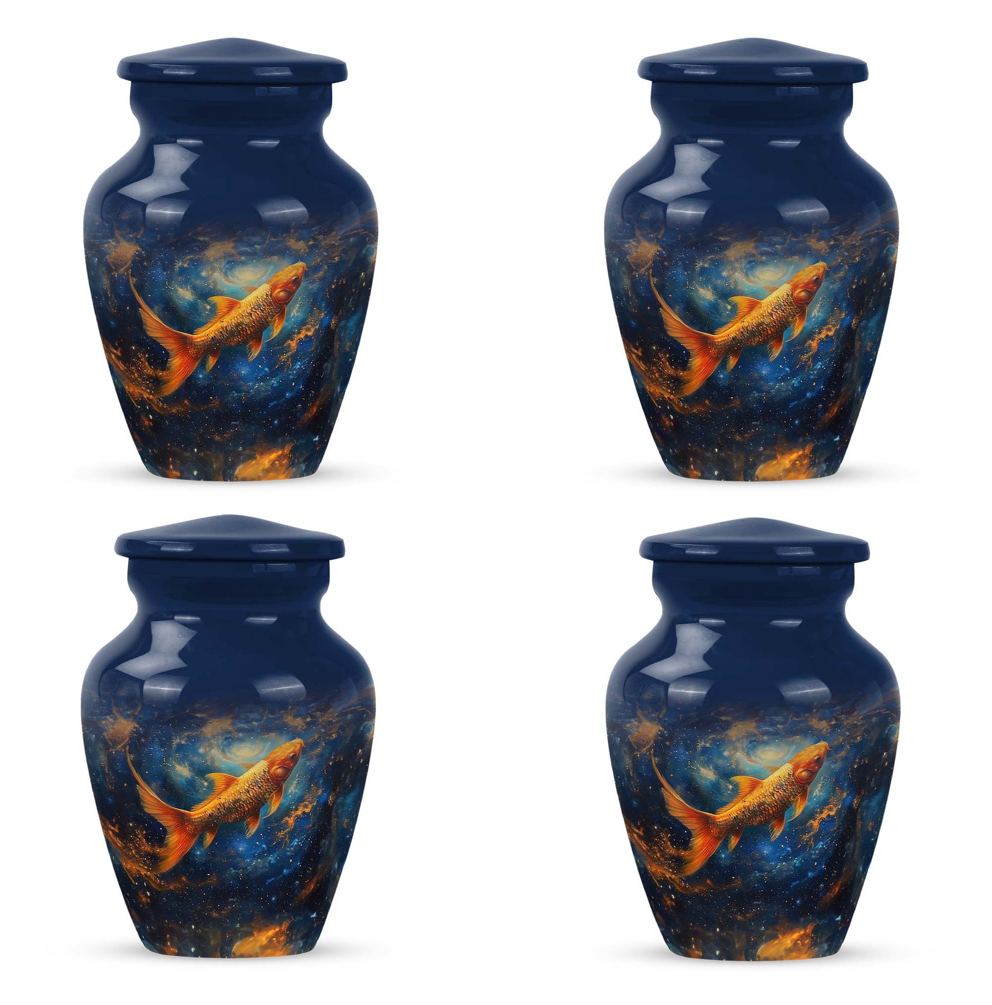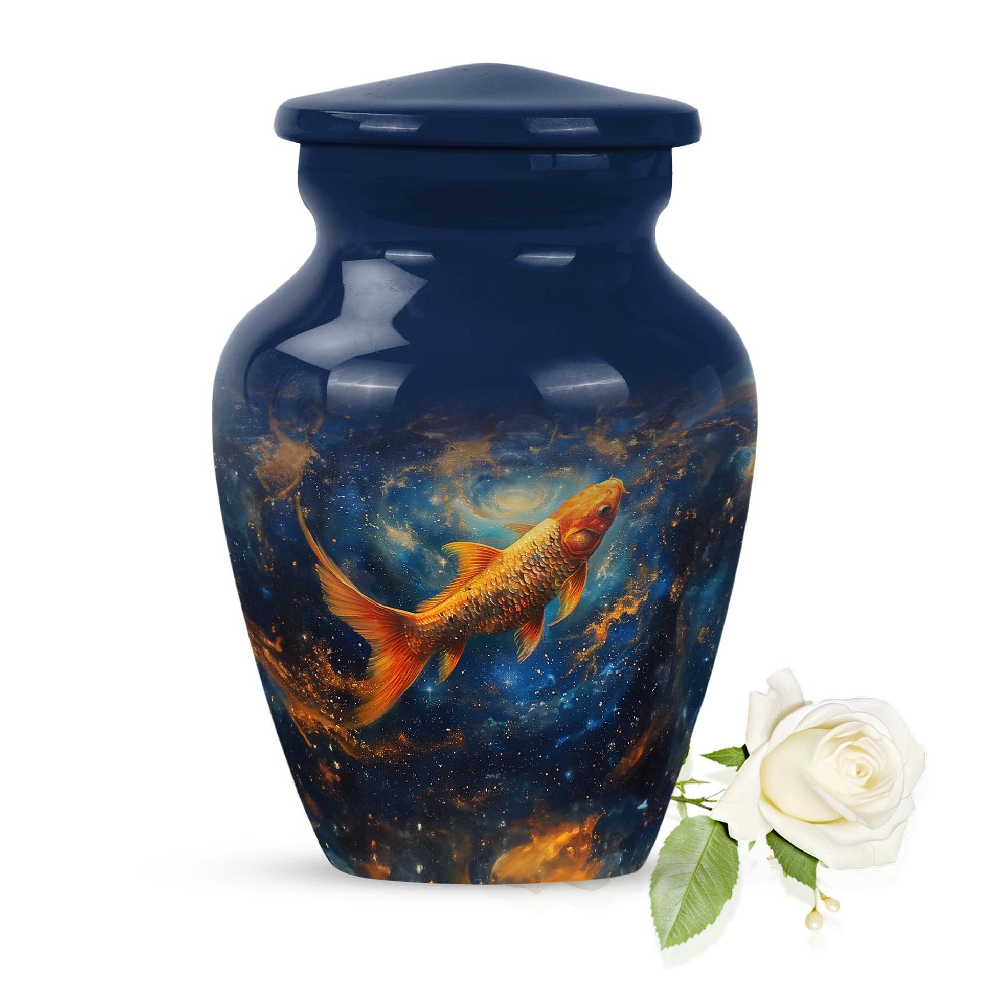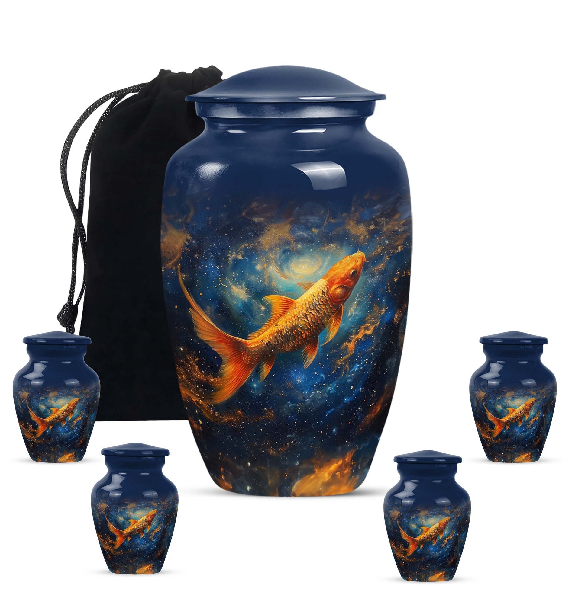 Our 10-inch large fish urn is more than just a memorial item, it's a respectful and honoring statement for your dearly departed. Crafted from refined and durable aluminium, this large urn has been designed with meticulous attention to detail. Its weight of 3.3 pounds testifies to its robust make, designed to stand the test of time. The abstract theme of the urn speaks volumes about the enigmatic journey of life making it well suited for adults and seniors seeking an artistic approach to memorialization. This memorial human urn has a significant capacity of 200 cubic inches, ensuring ample space for ashes. Unlike many other urns, this vital piece comes with a velvet pouch for the containment of ashes, adding an extra layer of care and respect with which we approach the sacred task of memorialization. The urn is also customizable, with the option to personalize it with engraved names, subtly adding a personal touch. This item belongs to the category of memorial funeral urns for ashes and it elevates the adult burial urn tradition by incorporating modern stylistic elements. This transcendent piece, also related to 'ashes of love', is appreciated by customers searching for unique, metal large urns. Note: the design element of the product has not been considered in this description.