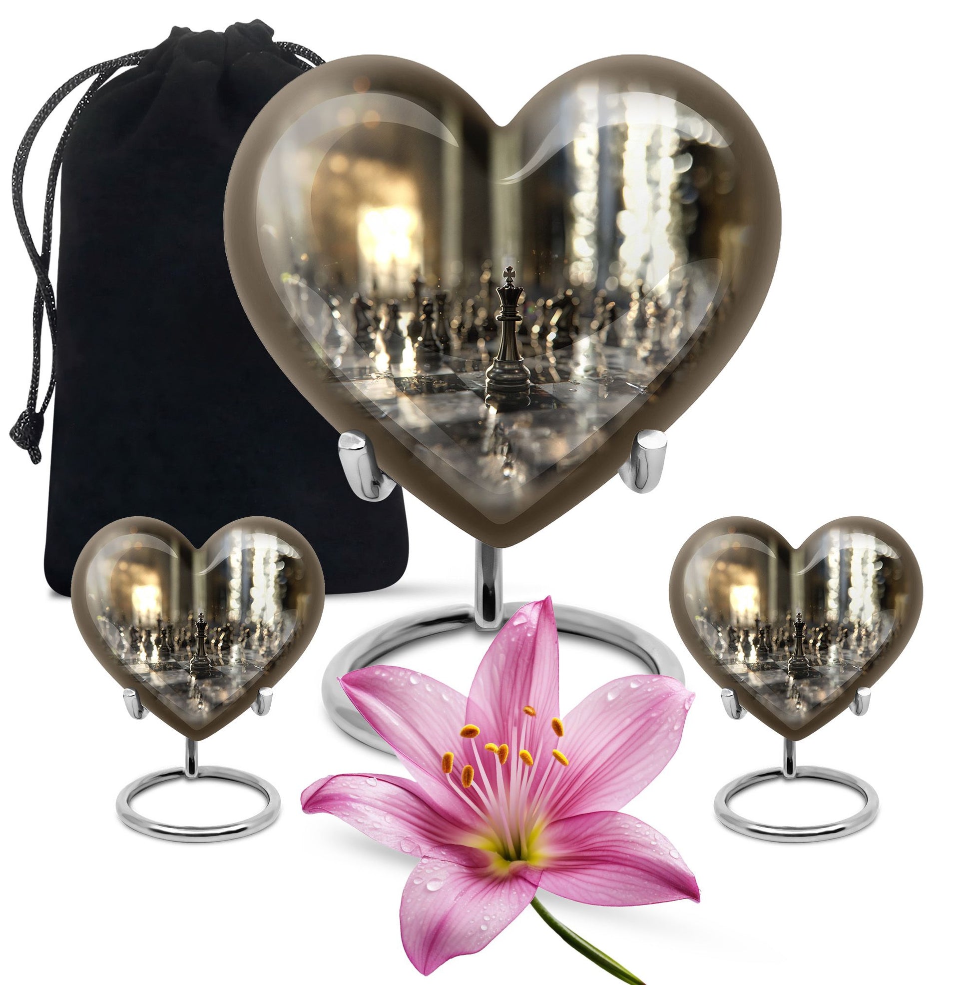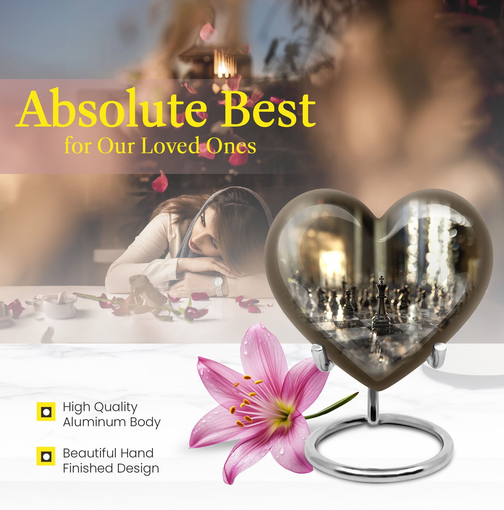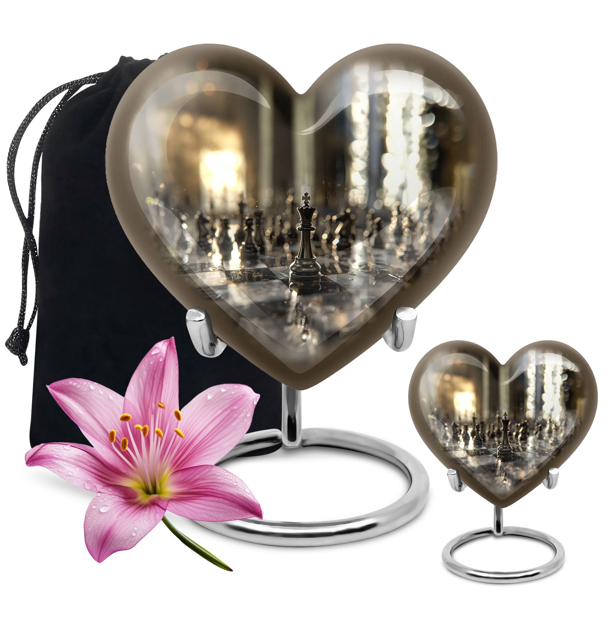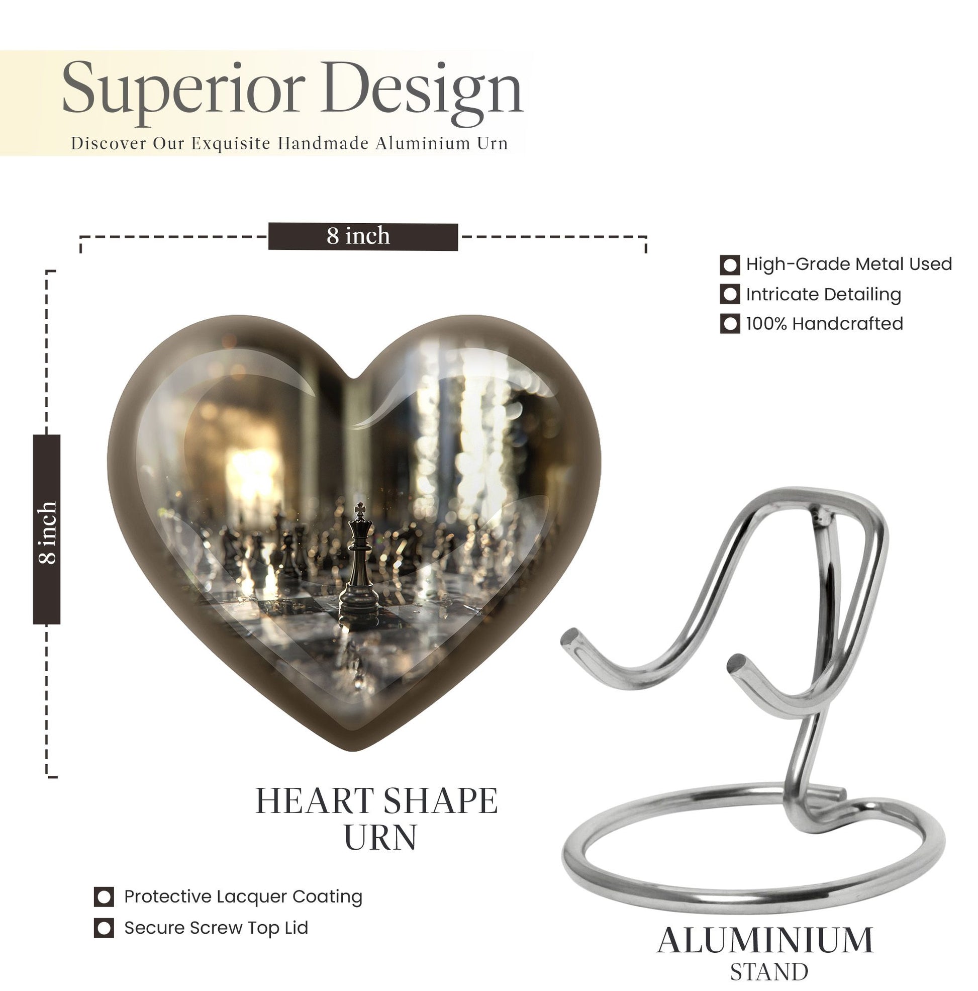 Cherish the memories of your loved one in this large, exquisitely crafted Chess Urn for ashes. Designed for those seeking unique memorial urns, this 10-inch abstract-themed Heart Urn is finely constructed from aluminium, ensuring long-lasting durability. Despite being lightweight at 3.3 pounds, it has an impressive capacity of 200 cubic inches, making it a fitting tribute to celebrate the fullness of life. The urn's robust size signifies substance and presence, while its fastidious crafting speaks to a timeless elegance. This piece comes with a velvet pouch for the containment and respect of sacred ashes. Further enhancing its emotional value, the urn allows for personalization - you can easily engrave names onto it, making it a truly unique piece that is as distinctive as the person the ashes represent. This product is well suited for ground burial purposes, or as a distinguished keepsake at home. Remarkable keywords such as urns for human ashes, women urns, and metal urns for human ashes adult female, can be associated with it, indicating its universal appeal for varied ceremonial occasions.