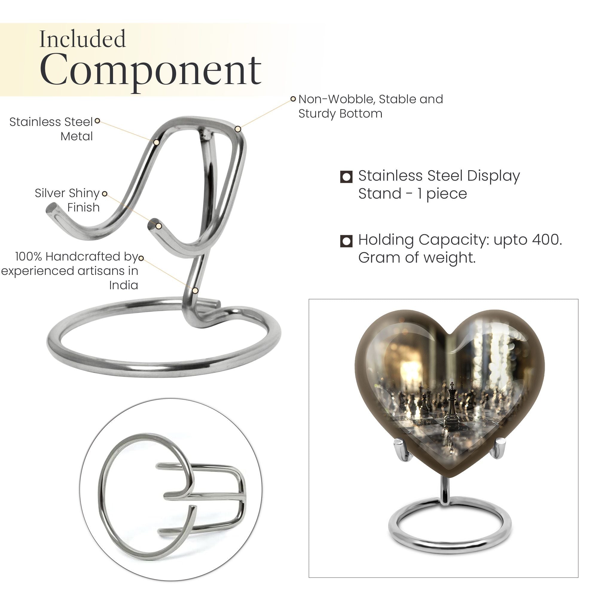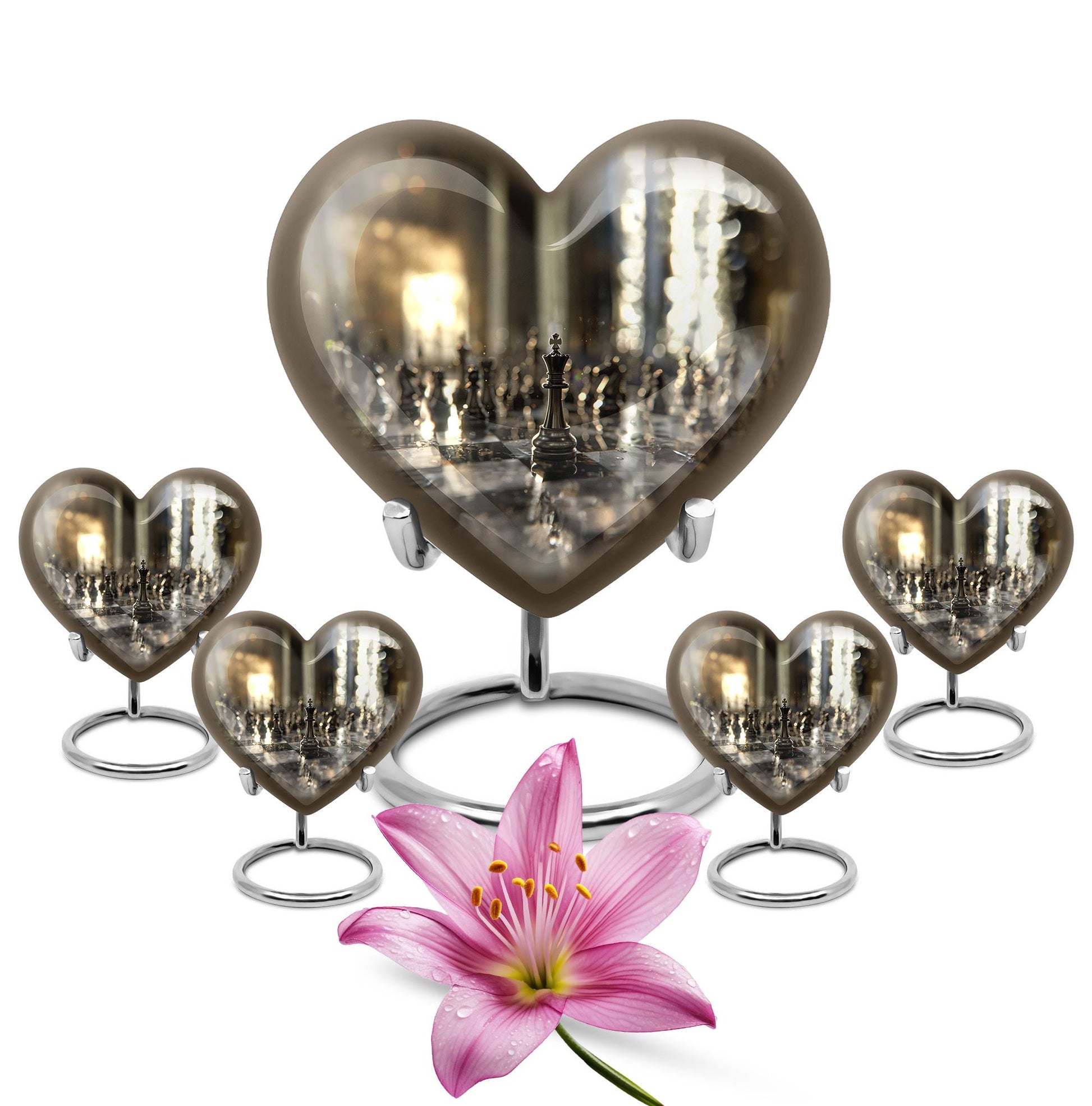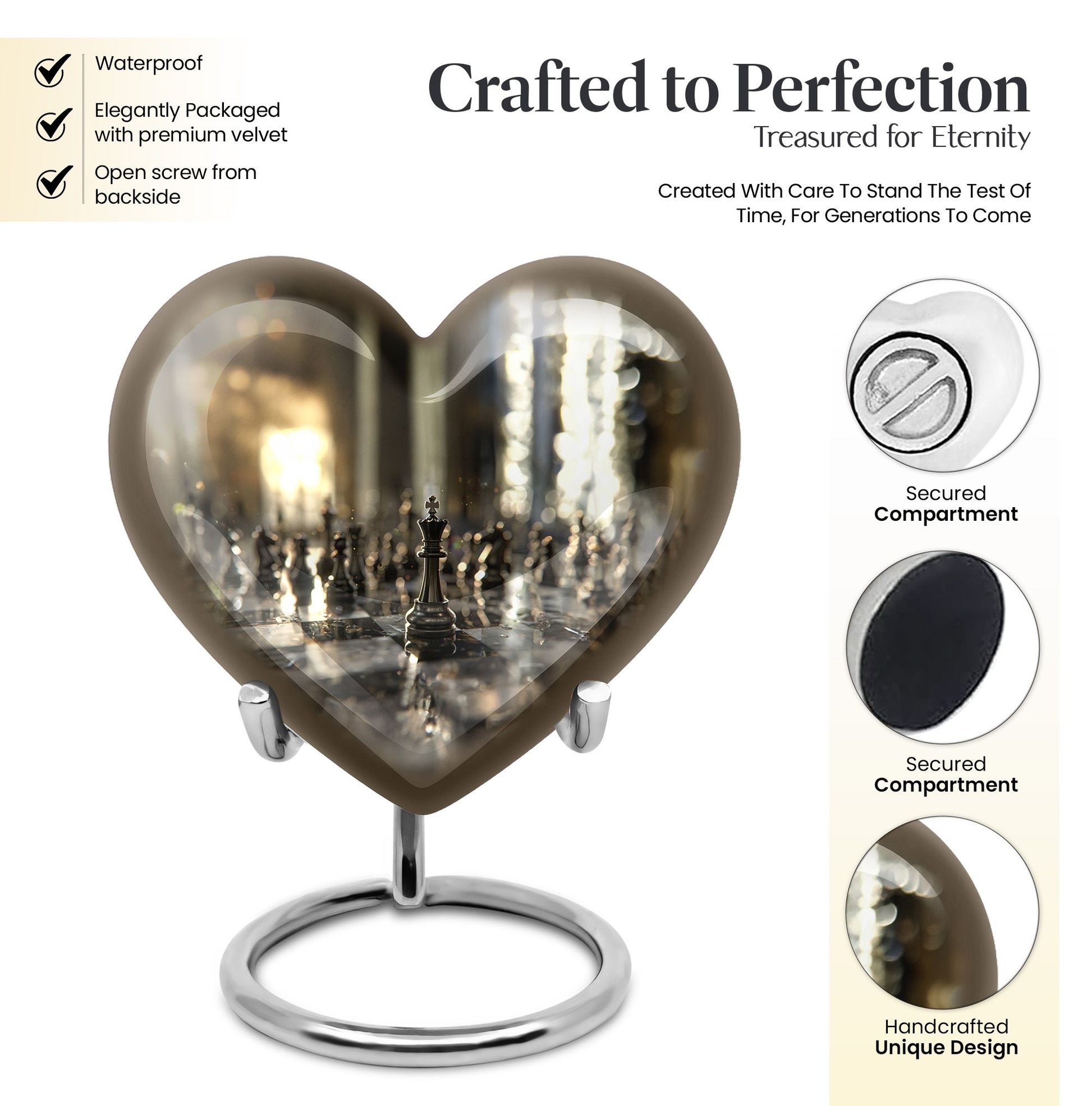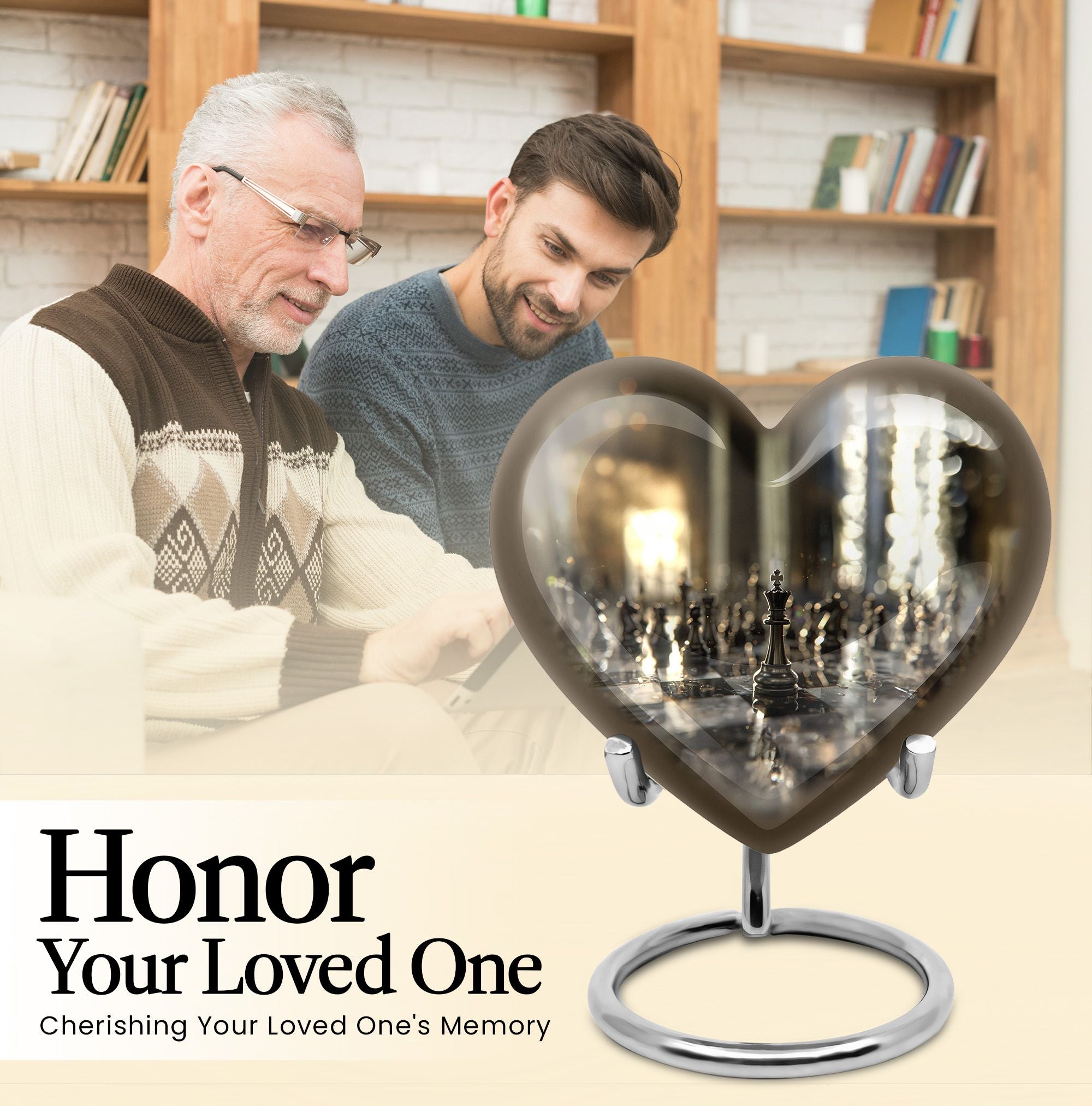 Cherish the memories of your loved one in this large, exquisitely crafted Chess Urn for ashes. Designed for those seeking unique memorial urns, this 10-inch abstract-themed Heart Urn is finely constructed from aluminium, ensuring long-lasting durability. Despite being lightweight at 3.3 pounds, it has an impressive capacity of 200 cubic inches, making it a fitting tribute to celebrate the fullness of life. The urn's robust size signifies substance and presence, while its fastidious crafting speaks to a timeless elegance. This piece comes with a velvet pouch for the containment and respect of sacred ashes. Further enhancing its emotional value, the urn allows for personalization - you can easily engrave names onto it, making it a truly unique piece that is as distinctive as the person the ashes represent. This product is well suited for ground burial purposes, or as a distinguished keepsake at home. Remarkable keywords such as urns for human ashes, women urns, and metal urns for human ashes adult female, can be associated with it, indicating its universal appeal for varied ceremonial occasions.