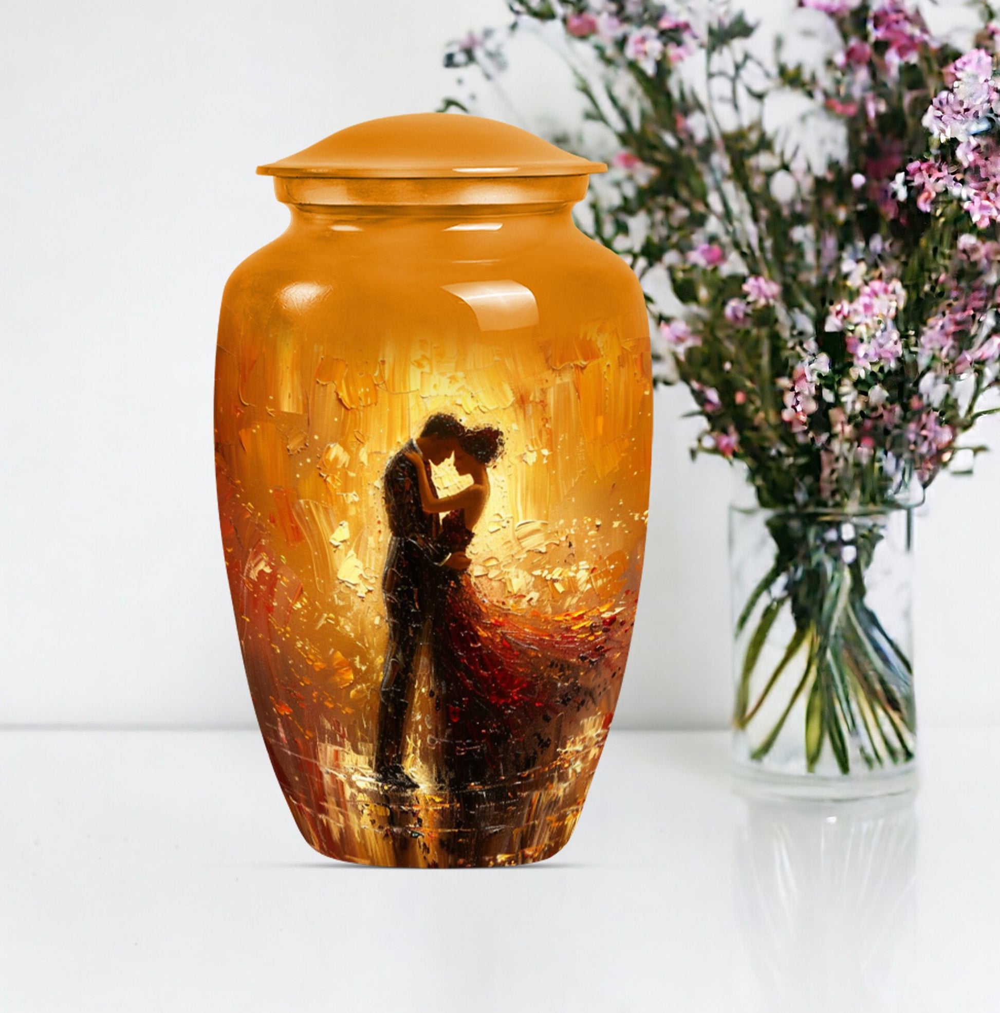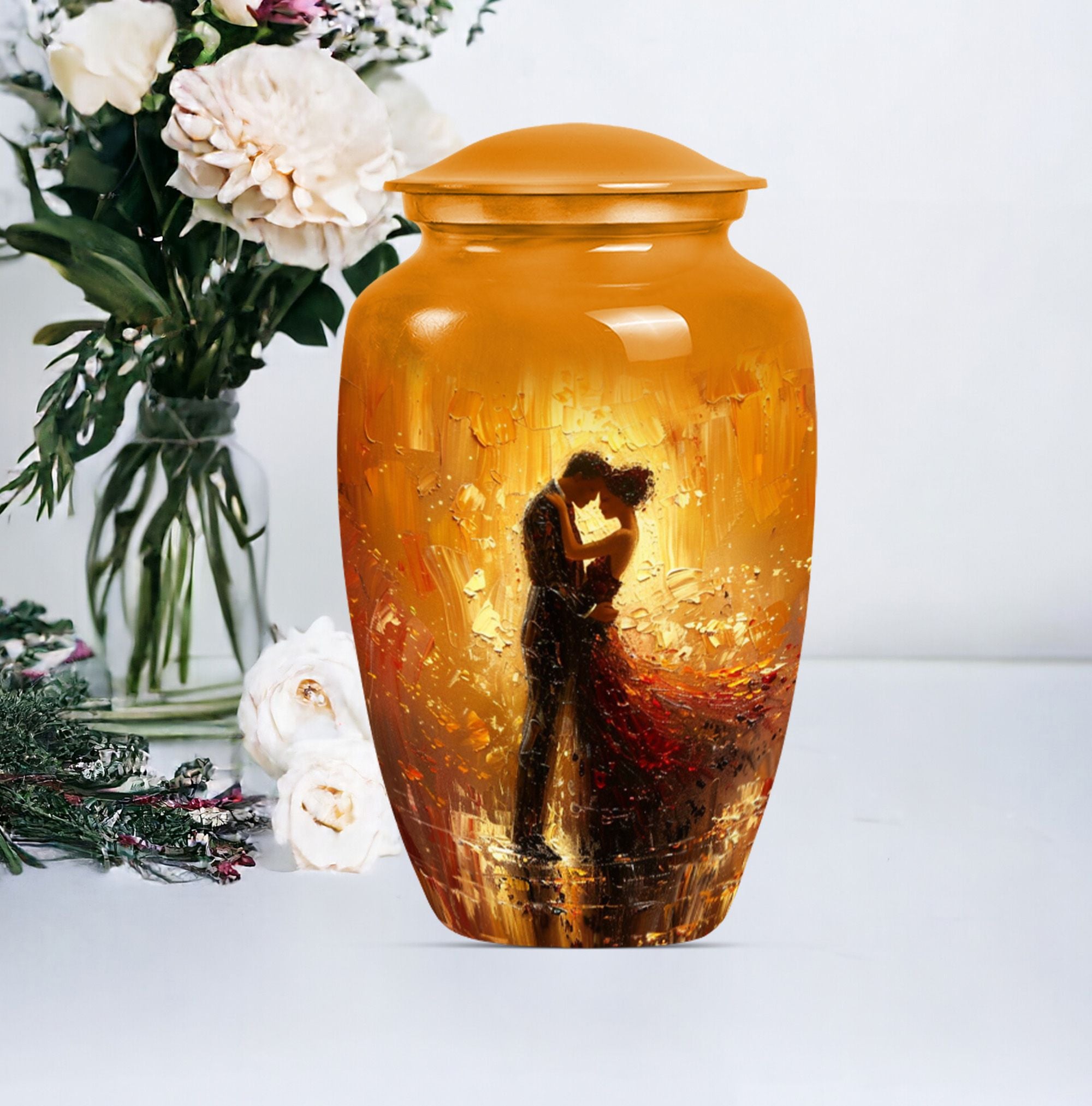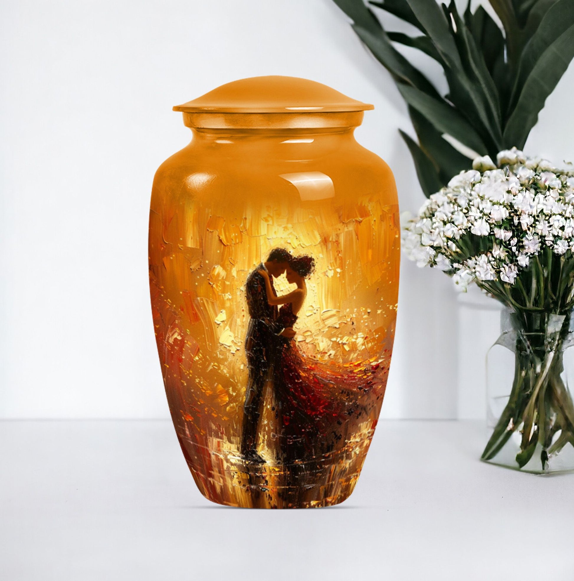 Experience a sense of peace with our elegant and classic large urn, an ideal choice for memorial ceremony supplies. This beautifully crafted funeral urn combines practicality with an artistic touch, made from durable aluminium, it's built to last. Coming in at a sizable 10 inches in height and weighing 3.3 pounds, it's designed to hold up to 200 cubic inches of cremains, making it suitable for storing adult ashes. Whether you're seeking dancing urns or cremation urns for women, this abstract-themed urn fulfills your needs. Adding a personal touch is made easy as we offer customization - you can personalize it with engraved names. Additionally, your purchase is complemented by a velvet pouch, providing a respectful containment for your loved one's ashes. Whether you're seeking ash urn, urn shaped, or large urns for ashes, this product stands as a testament to eternal love. Please note that this urn design is abstract, reflecting the uncertainty and mystery of life while providing you with a space of remembrance.