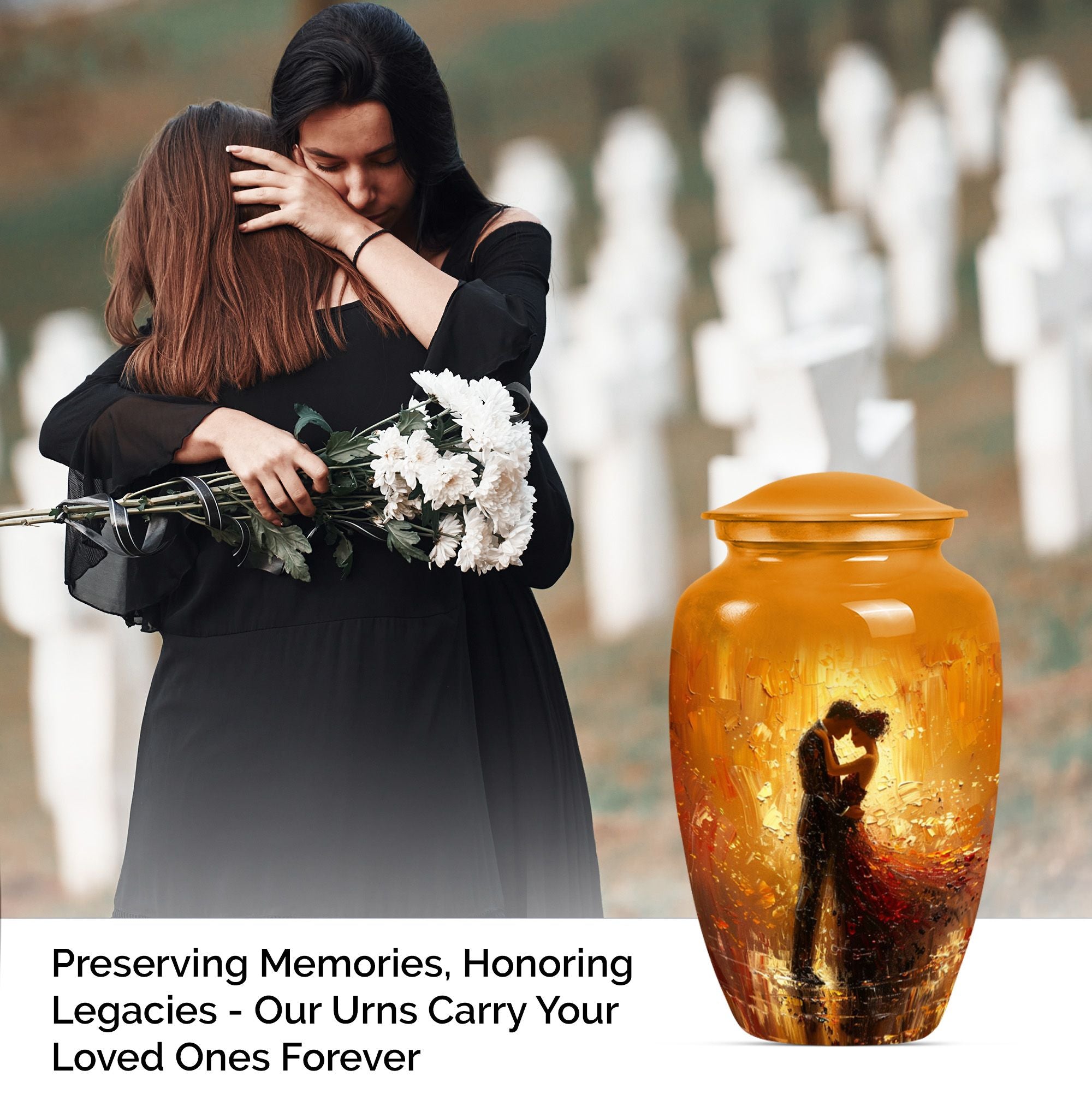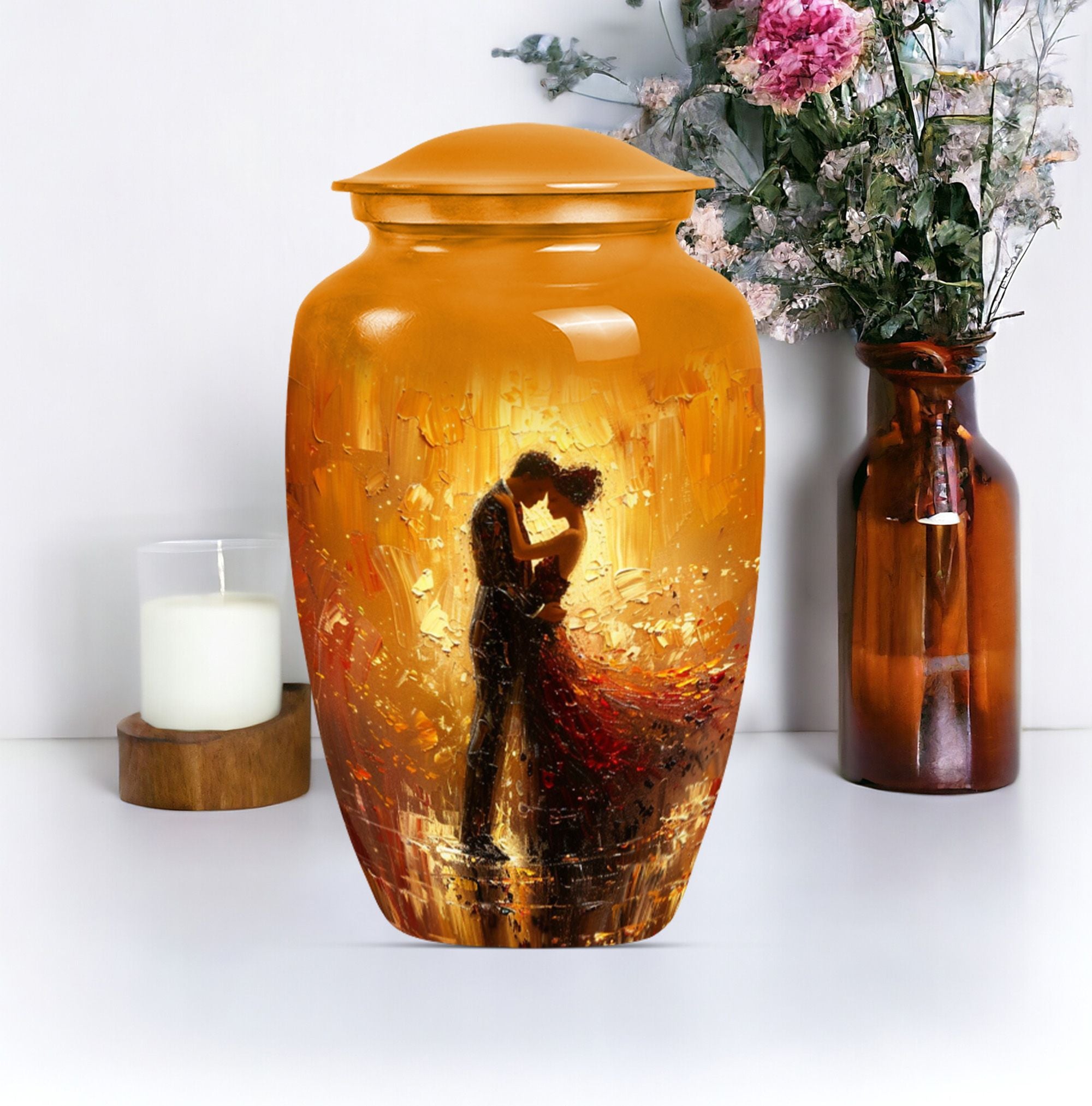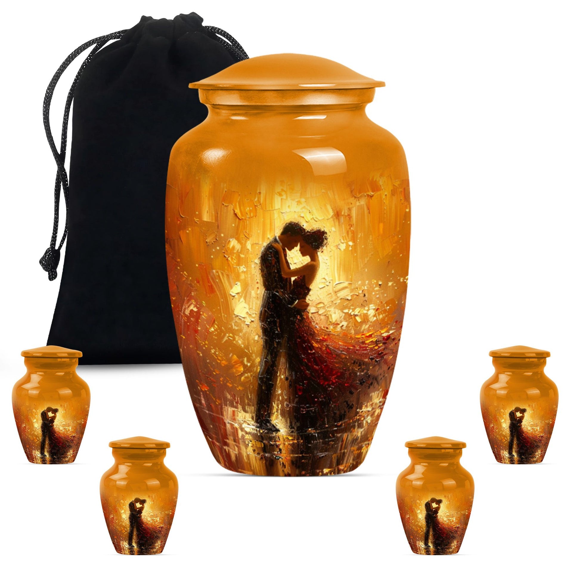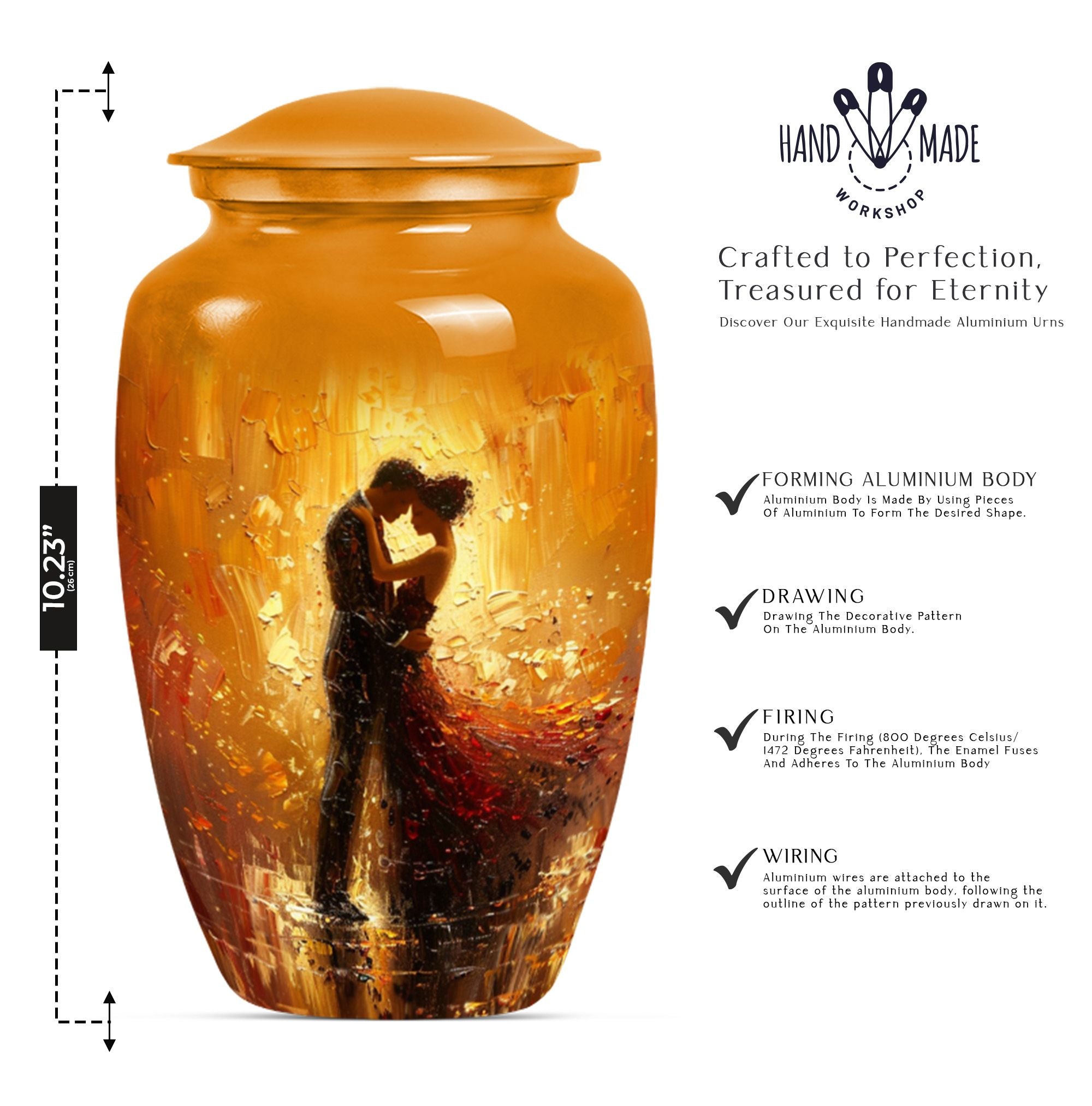 Experience a sense of peace with our elegant and classic large urn, an ideal choice for memorial ceremony supplies. This beautifully crafted funeral urn combines practicality with an artistic touch, made from durable aluminium, it's built to last. Coming in at a sizable 10 inches in height and weighing 3.3 pounds, it's designed to hold up to 200 cubic inches of cremains, making it suitable for storing adult ashes. Whether you're seeking dancing urns or cremation urns for women, this abstract-themed urn fulfills your needs. Adding a personal touch is made easy as we offer customization - you can personalize it with engraved names. Additionally, your purchase is complemented by a velvet pouch, providing a respectful containment for your loved one's ashes. Whether you're seeking ash urn, urn shaped, or large urns for ashes, this product stands as a testament to eternal love. Please note that this urn design is abstract, reflecting the uncertainty and mystery of life while providing you with a space of remembrance.