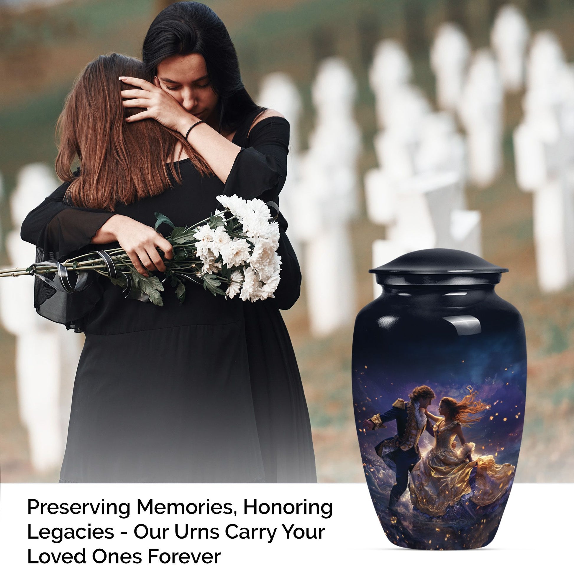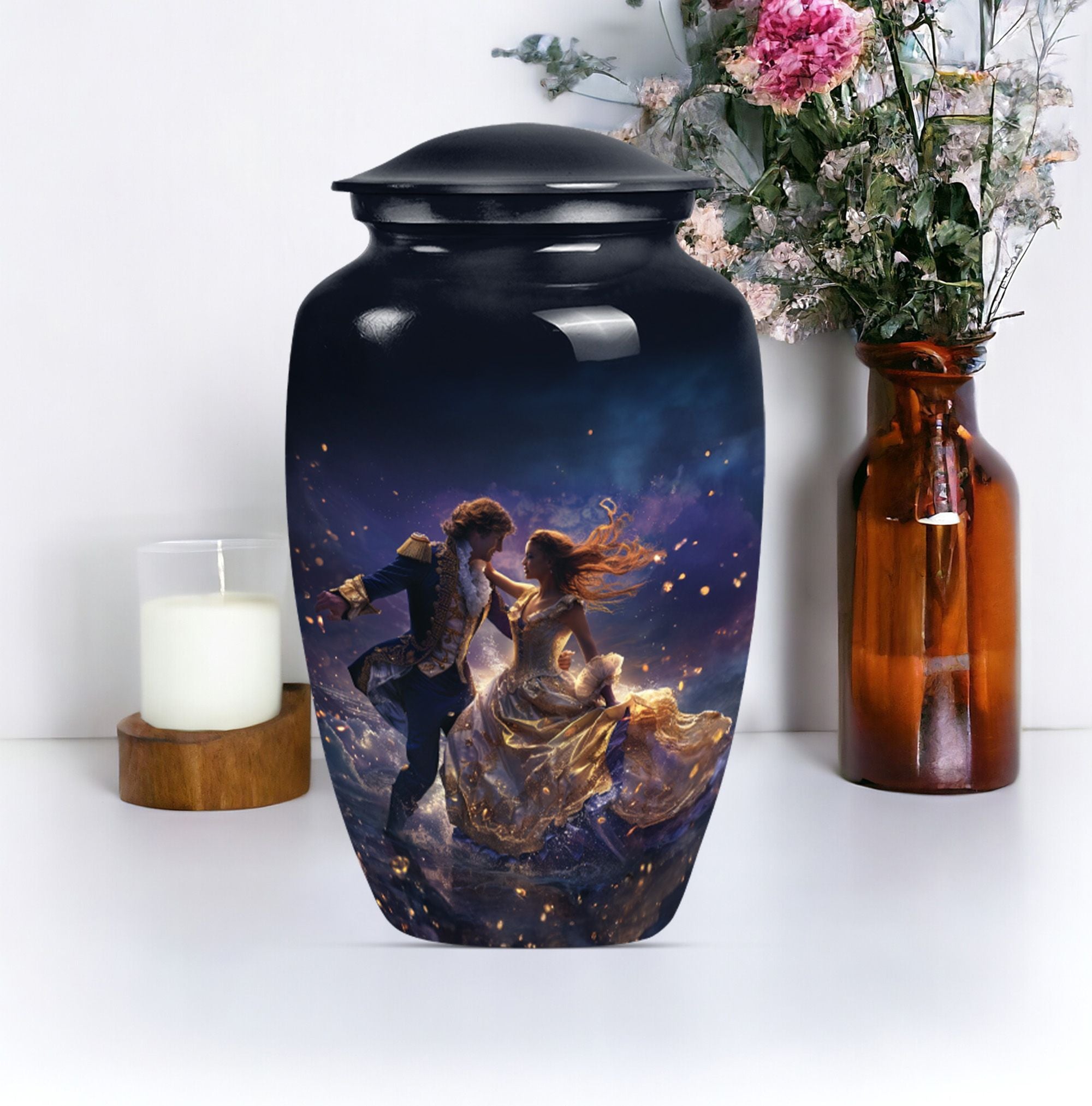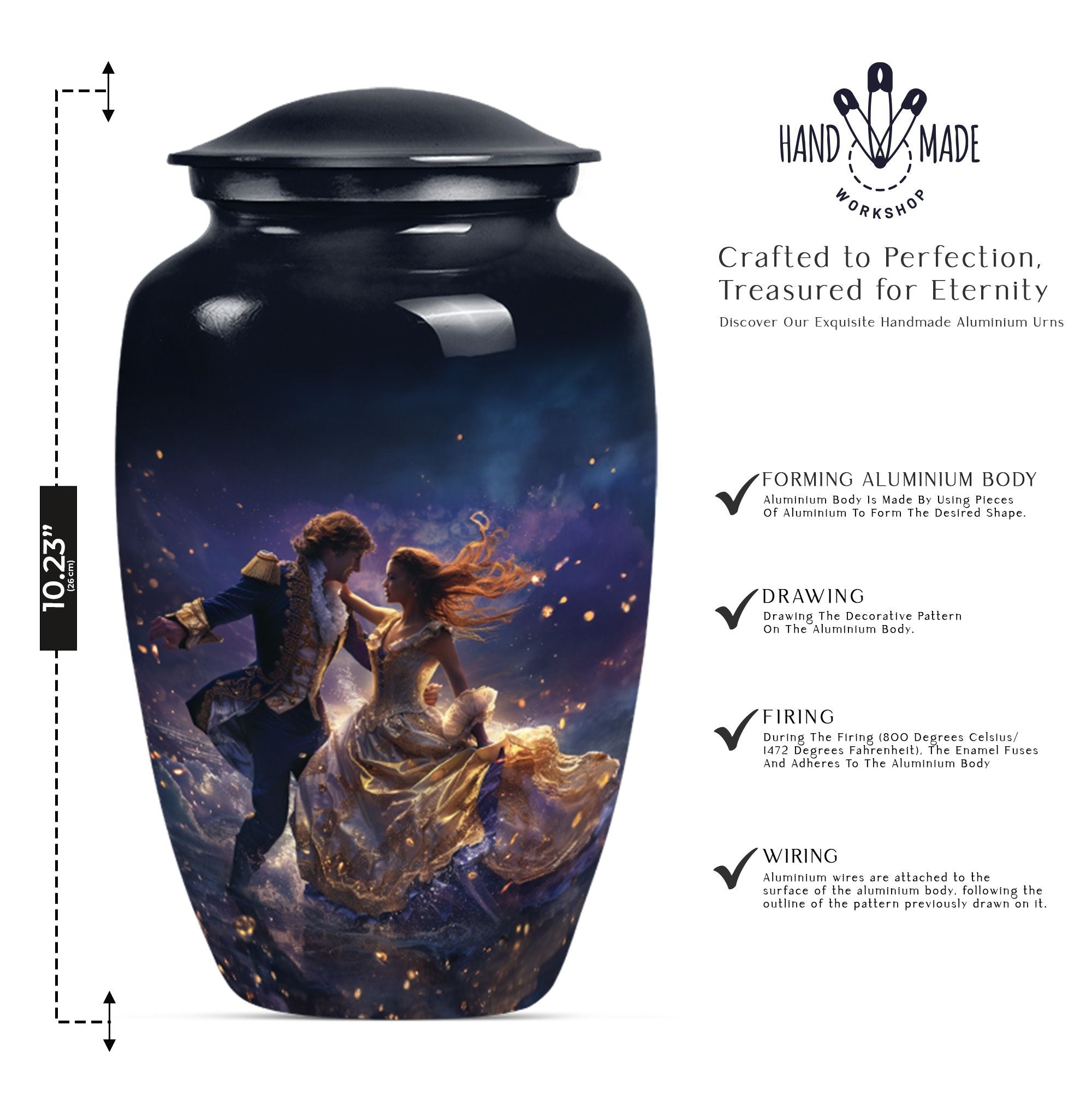 Our 'Dancing Urn' represents an exquisite homage to your cherished one. Standing 10 inches tall, this large-sized burial urn for cremation ashes is a classic piece of memorial art that draws attention to its abstract theme. Crafted from high-quality aluminium, this urn has a substantial feel with a weight of 3.3 pounds. Its substantial 200 cubic-inch capacity ensures it can securely hold the cremation ashes of an adult male or female. For added convenience, a velvet pouch is included in the package to store the ashes. Distinguish this urn further by customizing it with the engraved names of your loved ones. This compact cremation urn fits seamlessly in urban homes while adding an elegant touch to your setting - a testament of profound respect to the departed. Note: this urn balances tradition and understated elegance, ideal for seniors or adults acknowledging a loved one's memory. Keywords: memorial urns, cremation urn for adult male ashes, man metal cremation urn.