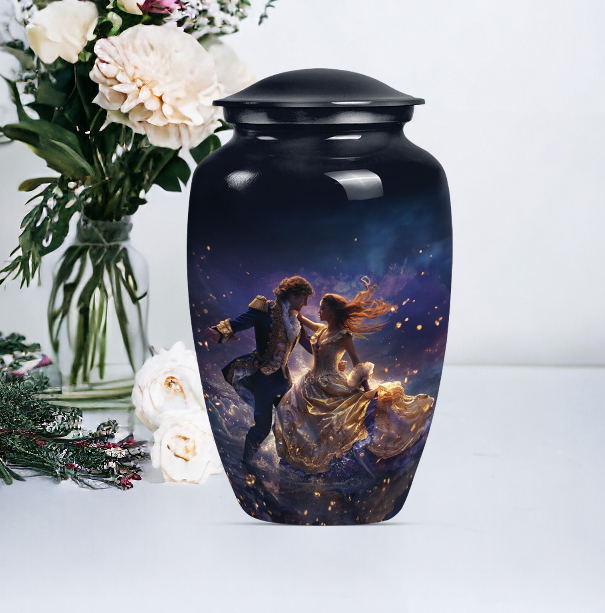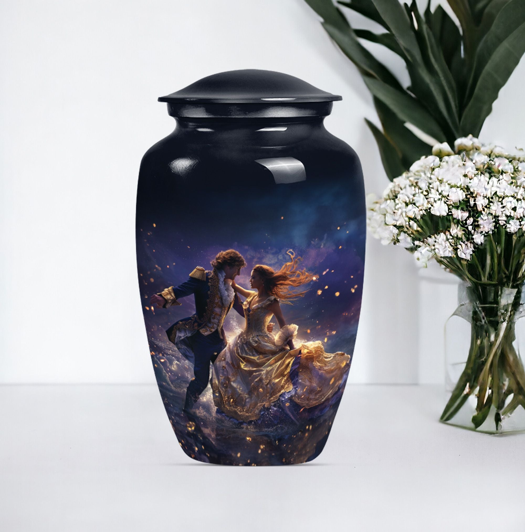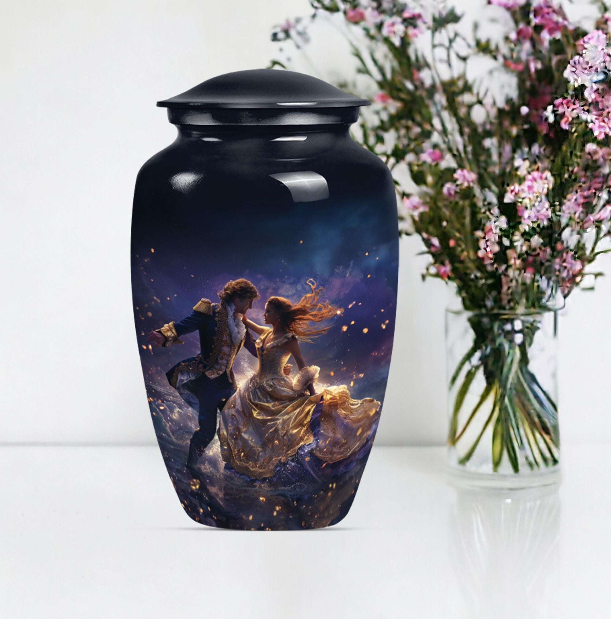 Our 'Dancing Urn' represents an exquisite homage to your cherished one. Standing 10 inches tall, this large-sized burial urn for cremation ashes is a classic piece of memorial art that draws attention to its abstract theme. Crafted from high-quality aluminium, this urn has a substantial feel with a weight of 3.3 pounds. Its substantial 200 cubic-inch capacity ensures it can securely hold the cremation ashes of an adult male or female. For added convenience, a velvet pouch is included in the package to store the ashes. Distinguish this urn further by customizing it with the engraved names of your loved ones. This compact cremation urn fits seamlessly in urban homes while adding an elegant touch to your setting - a testament of profound respect to the departed. Note: this urn balances tradition and understated elegance, ideal for seniors or adults acknowledging a loved one's memory. Keywords: memorial urns, cremation urn for adult male ashes, man metal cremation urn.
