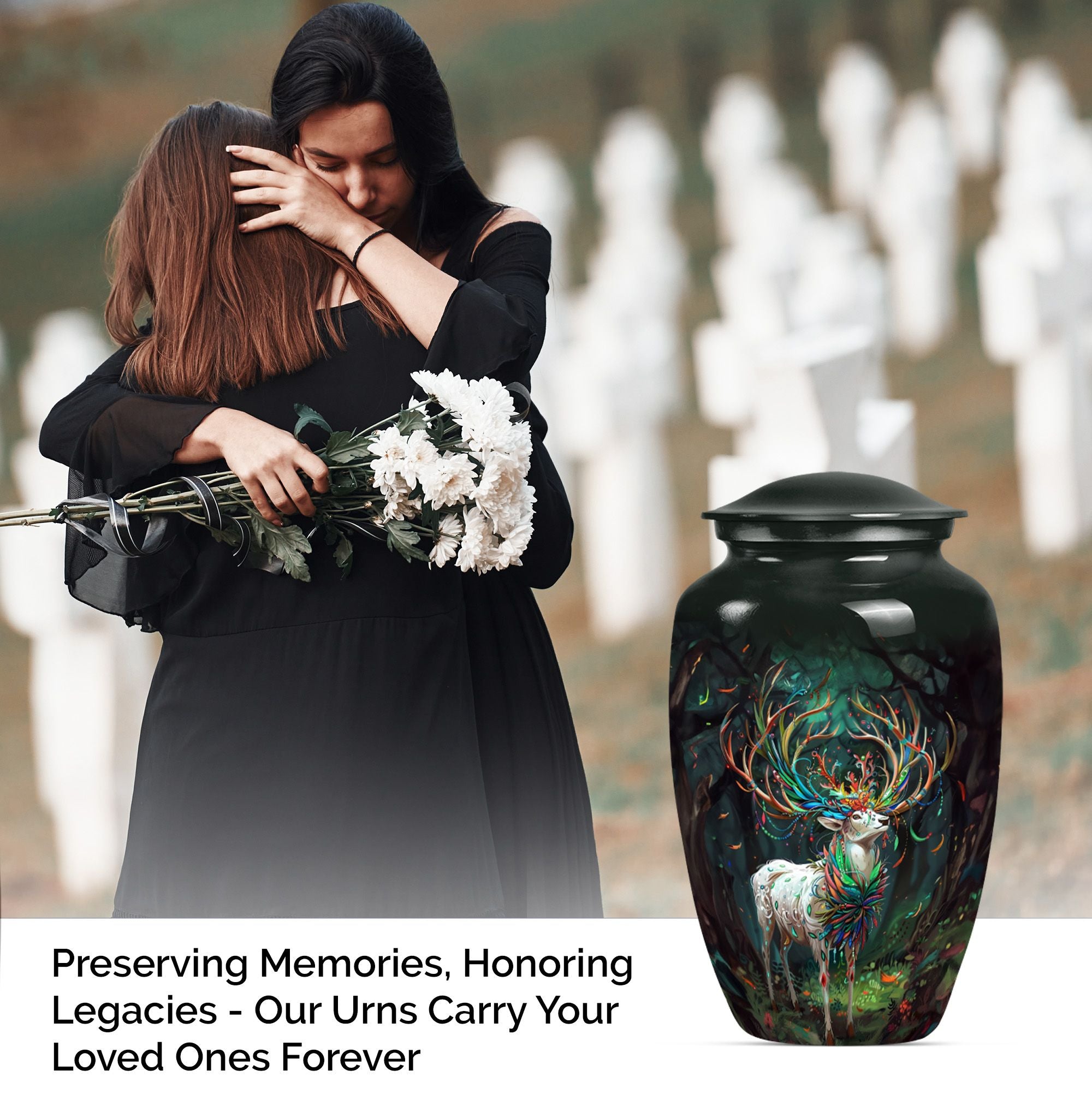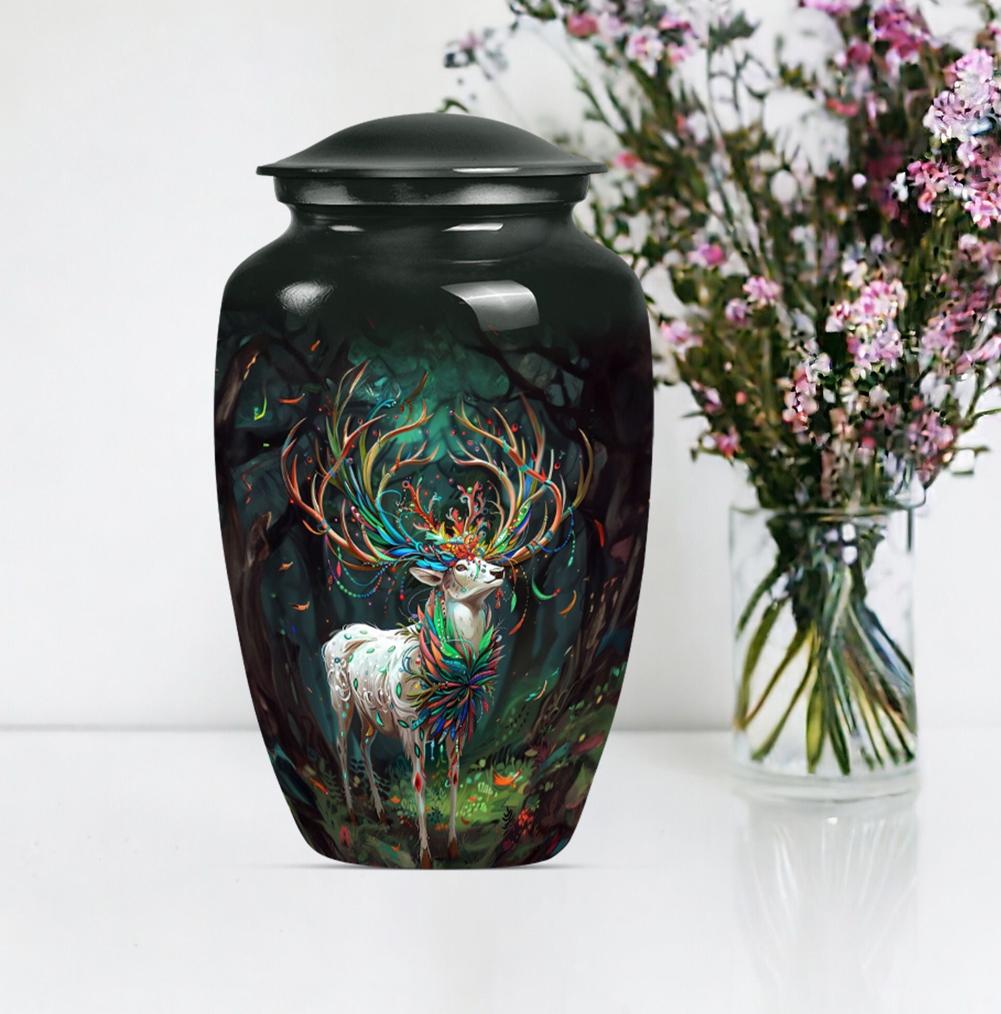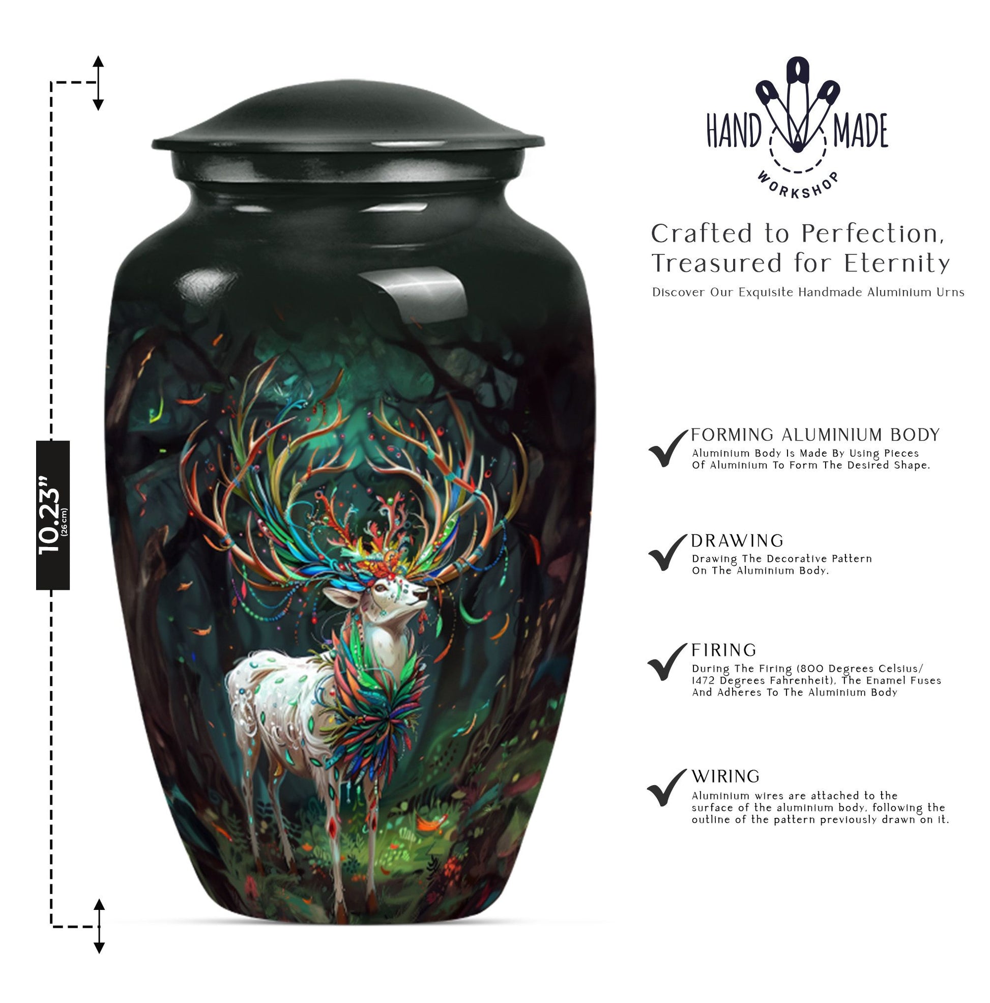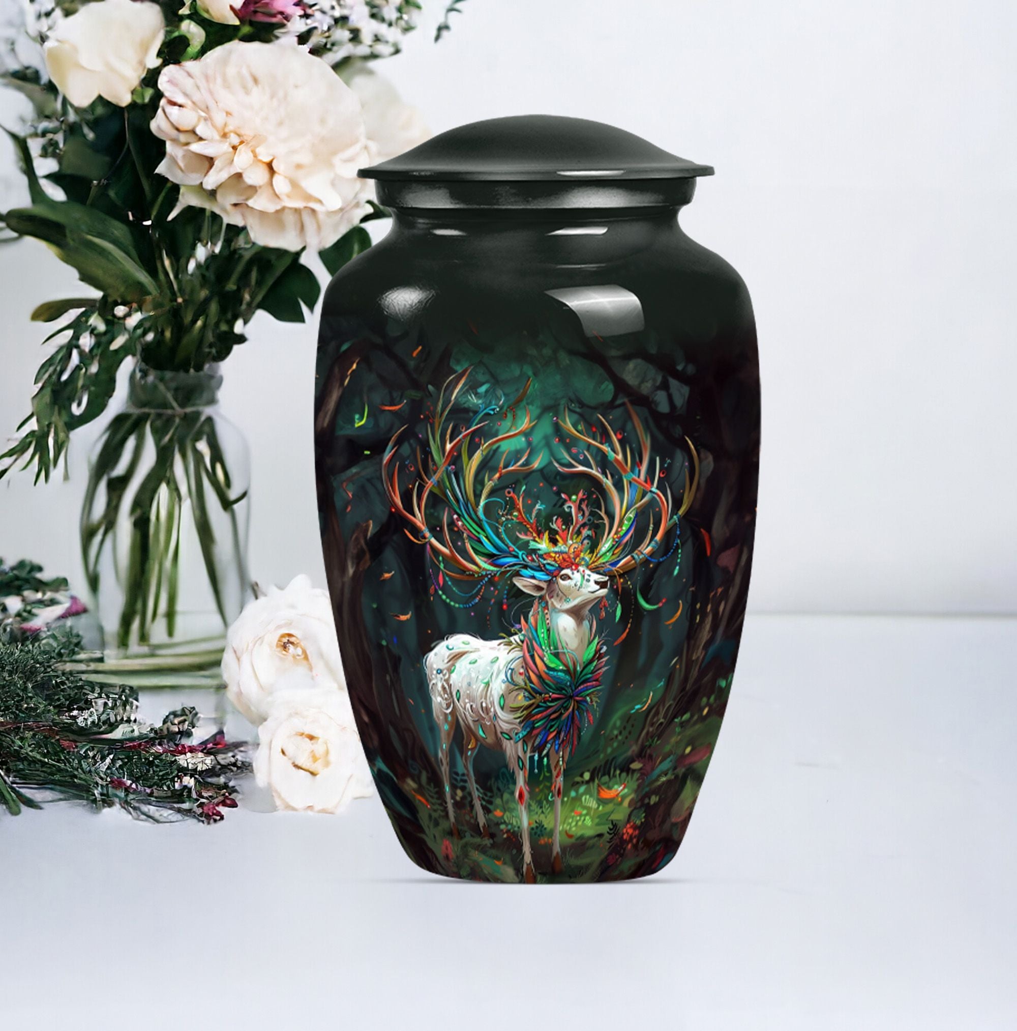 Introducing the Deer Cremation Urn, an exquisite option for preserving the ashes of your loved one. This 10-inch large Urn, made with superior aluminium, reflects a traditional touch with its classic urn design. The theme is 'Wolf Howling', adding an element of natural serenity to the urn. The urn is not only distinctly designed but also functional with a capacity of 200 cubic inches. With a weight of 3.3 pounds, it is easy to handle, facilitating a smoother memorial ceremony. A notable feature of this cremation urn is its customization option. This allows the buyers to personalize it with engraved names, making it a unique, heartfelt tribute. The urn also comes with a velvet pouch for a dignified containment of ashes. Step away from the ordinary with this deer urn as you honor the memory of your beloved. Perfect for those searching for 'burial funeral urns for adult ashes women' or 'cremation memorial urns for human ashes'. A significant token of remembrance, give them the peace they deserve with our cremation box.