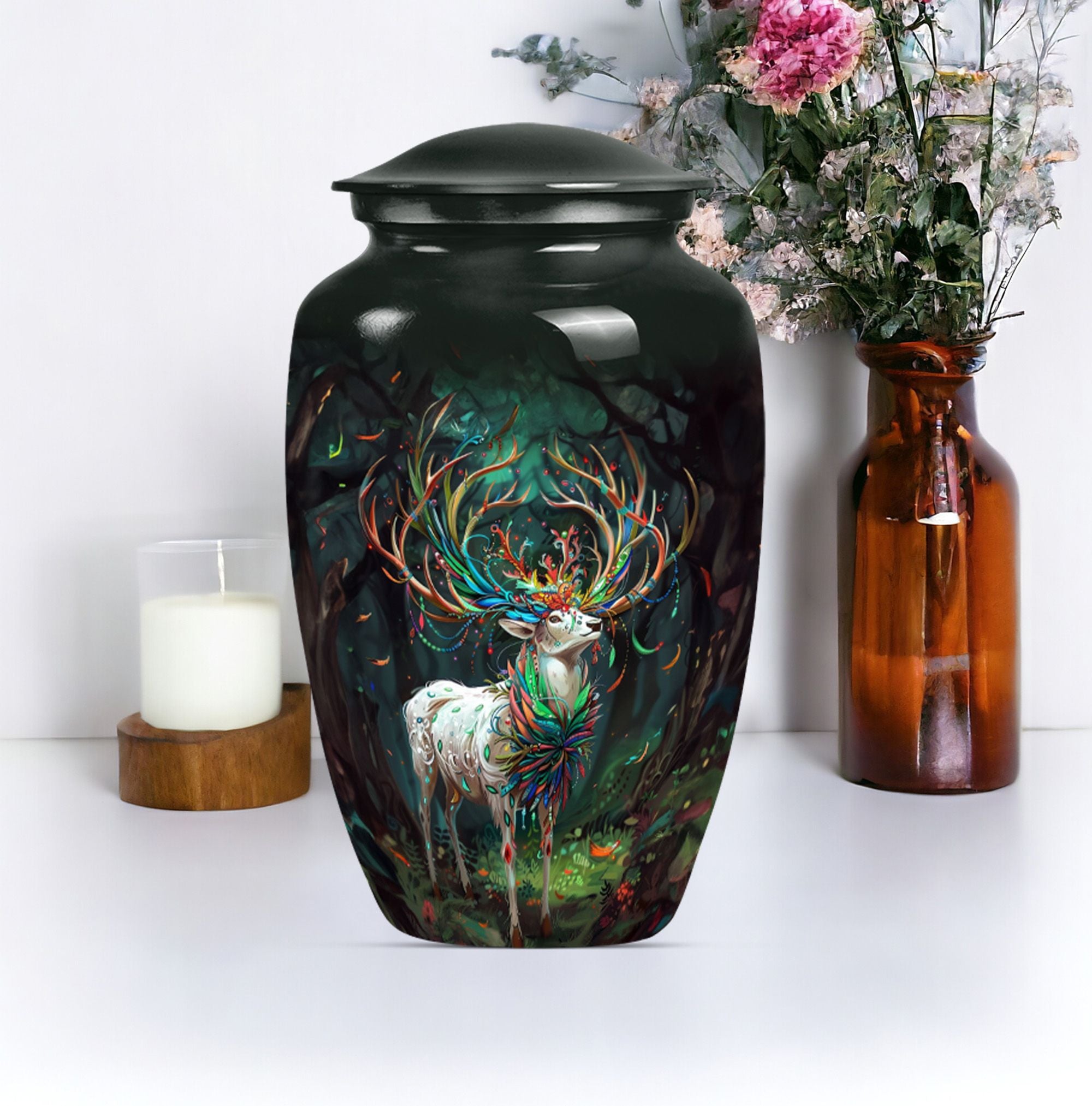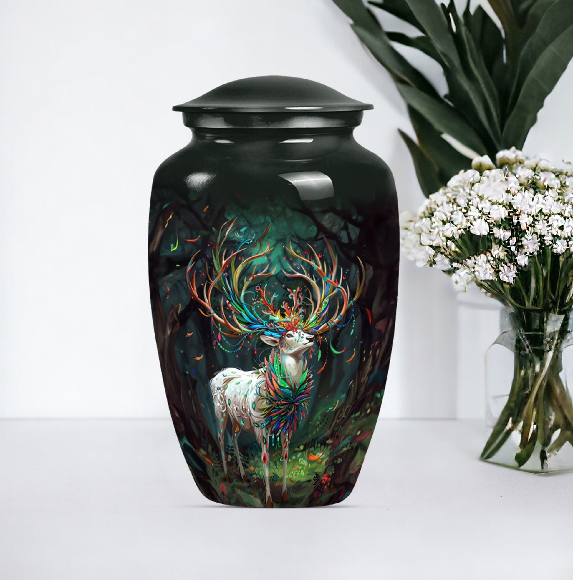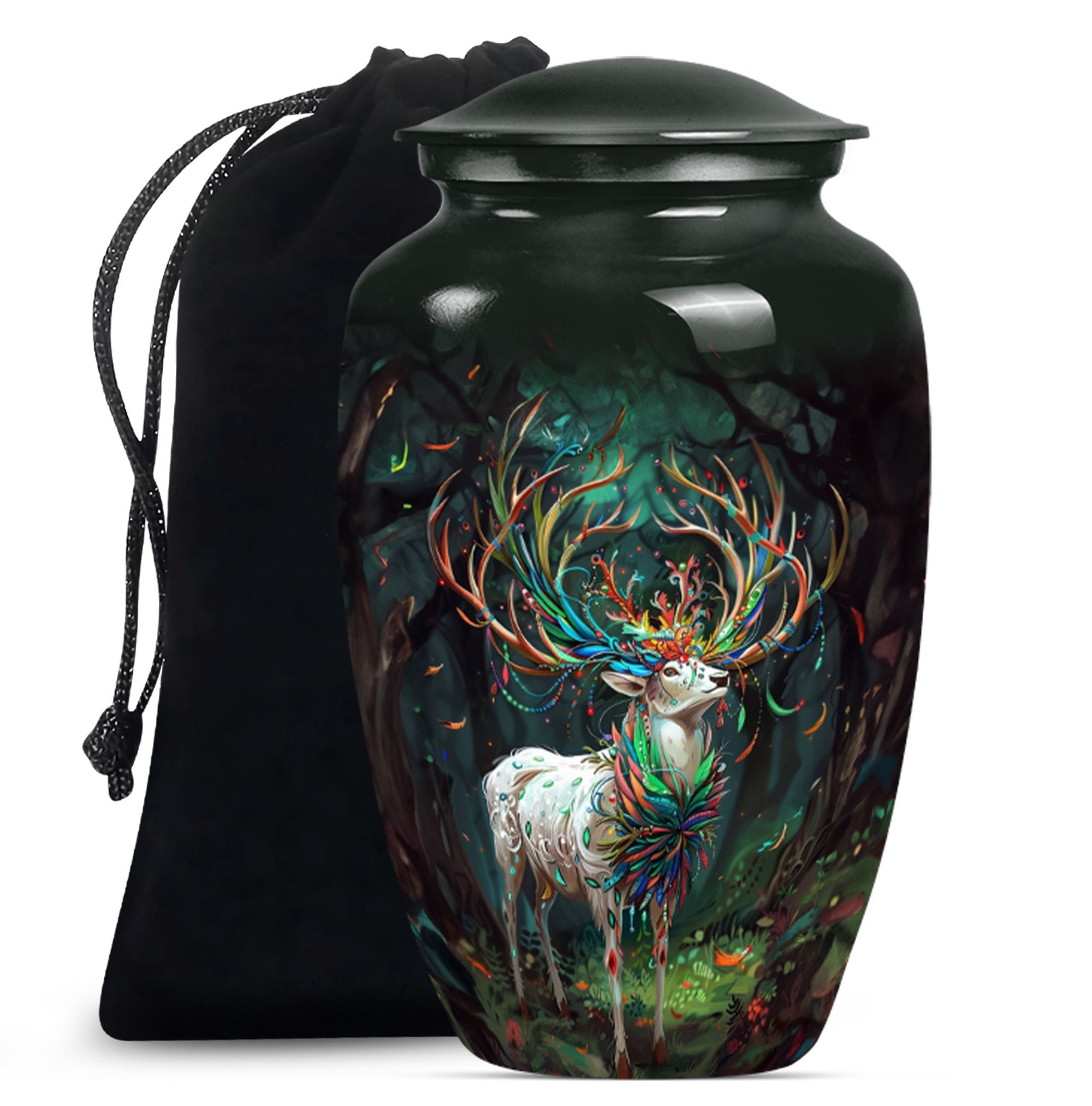 Introducing the Deer Cremation Urn, an exquisite option for preserving the ashes of your loved one. This 10-inch large Urn, made with superior aluminium, reflects a traditional touch with its classic urn design. The theme is 'Wolf Howling', adding an element of natural serenity to the urn. The urn is not only distinctly designed but also functional with a capacity of 200 cubic inches. With a weight of 3.3 pounds, it is easy to handle, facilitating a smoother memorial ceremony. A notable feature of this cremation urn is its customization option. This allows the buyers to personalize it with engraved names, making it a unique, heartfelt tribute. The urn also comes with a velvet pouch for a dignified containment of ashes. Step away from the ordinary with this deer urn as you honor the memory of your beloved. Perfect for those searching for 'burial funeral urns for adult ashes women' or 'cremation memorial urns for human ashes'. A significant token of remembrance, give them the peace they deserve with our cremation box.