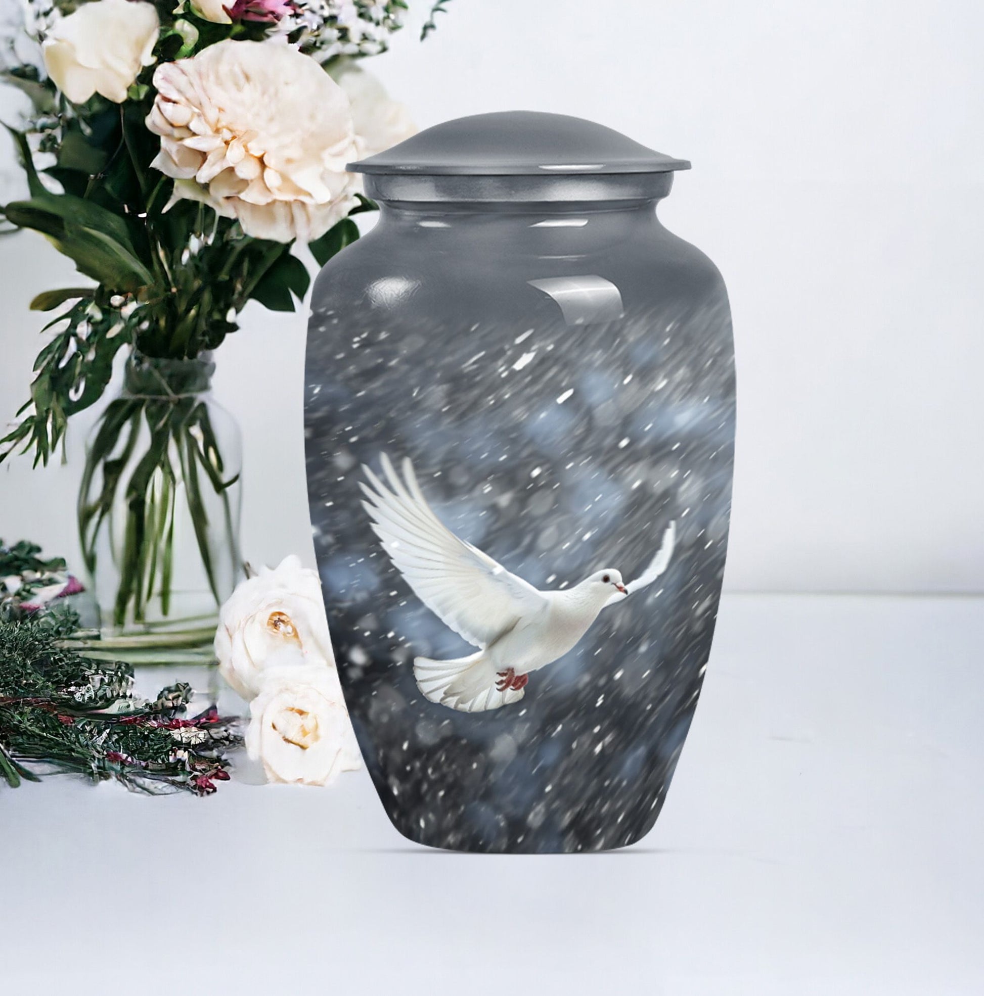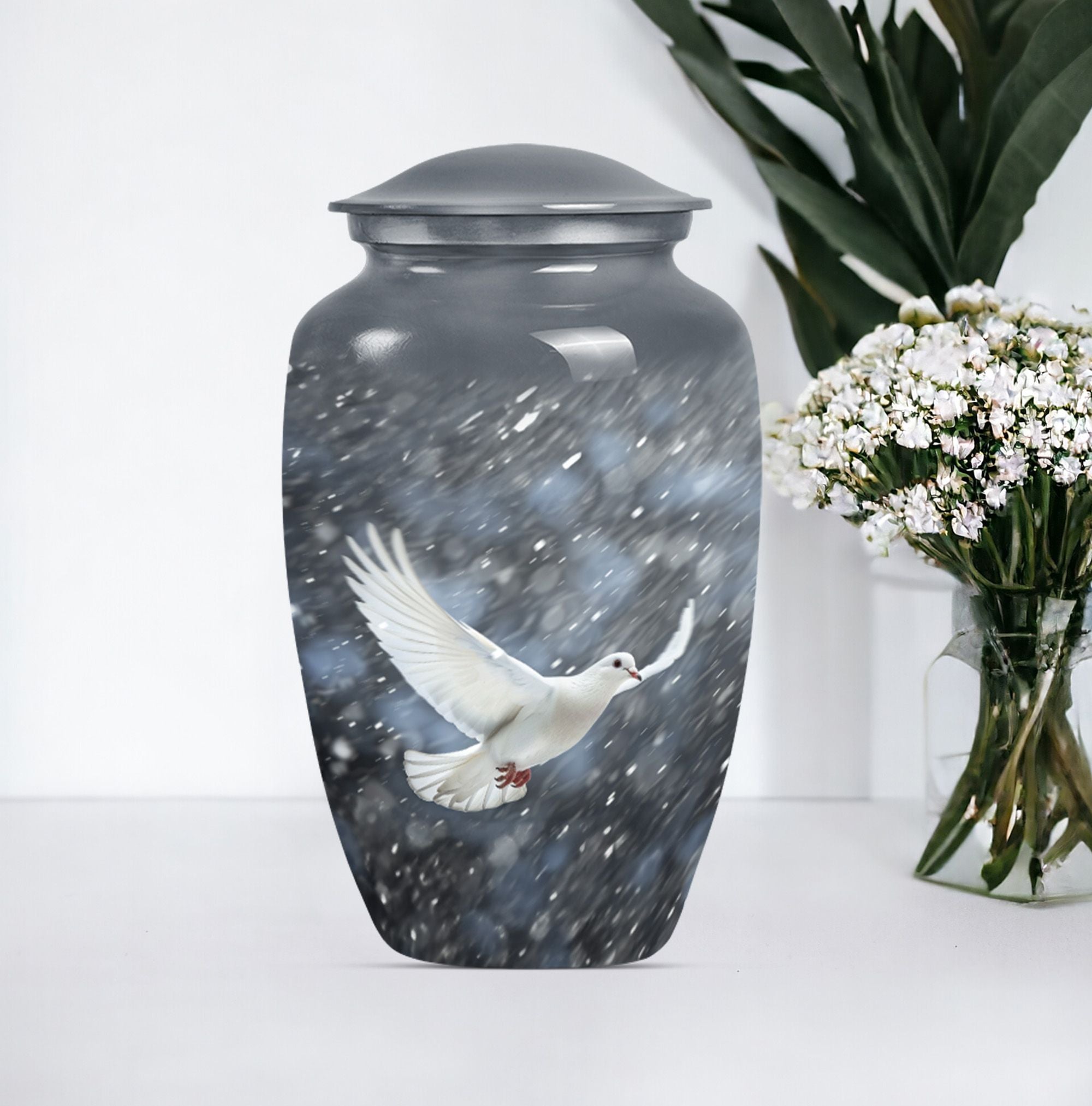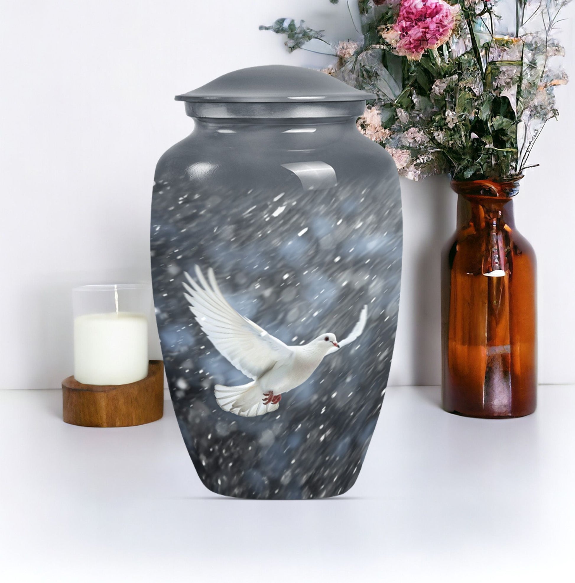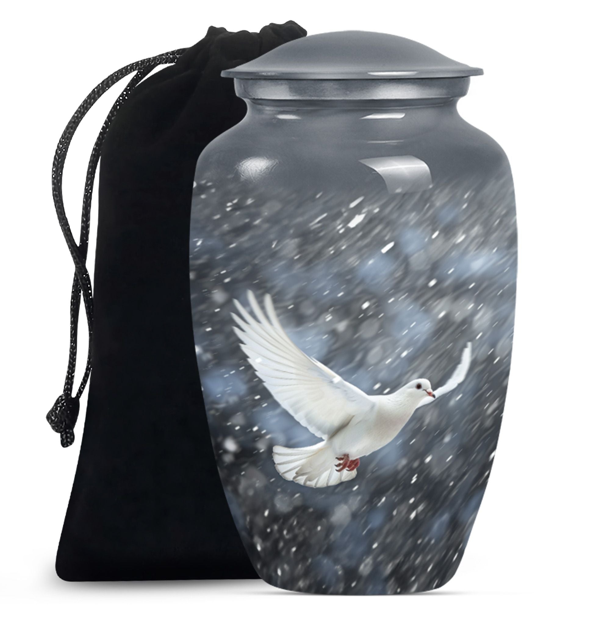 Commemorate your loved one with the Classic Dove Urn, our quality aluminium memorial adult urn. This cremation urn is larger than most, standing 10 inches tall and boasting a capacity of 200 cubic inches. Each urn weighs in at a substantial 3.3 pounds, conveying durability and significance. The urn comes with a velvet pouch, providing a dignified containment for the ashes of your loved one. Personalization is available, allowing you to engrave names on the exterior for a special touch of remembrance. Abstract in theme, this urn breaks away from conventional motifs, offering an unusual design element. This item is best suited for those seeking funeral burial urns or cremation containers for human ashes, as testament to the timeless bond you share with your loved ones. The Classic Dove Urn is more than an ashes urn; it's a token of enduring love and respect.