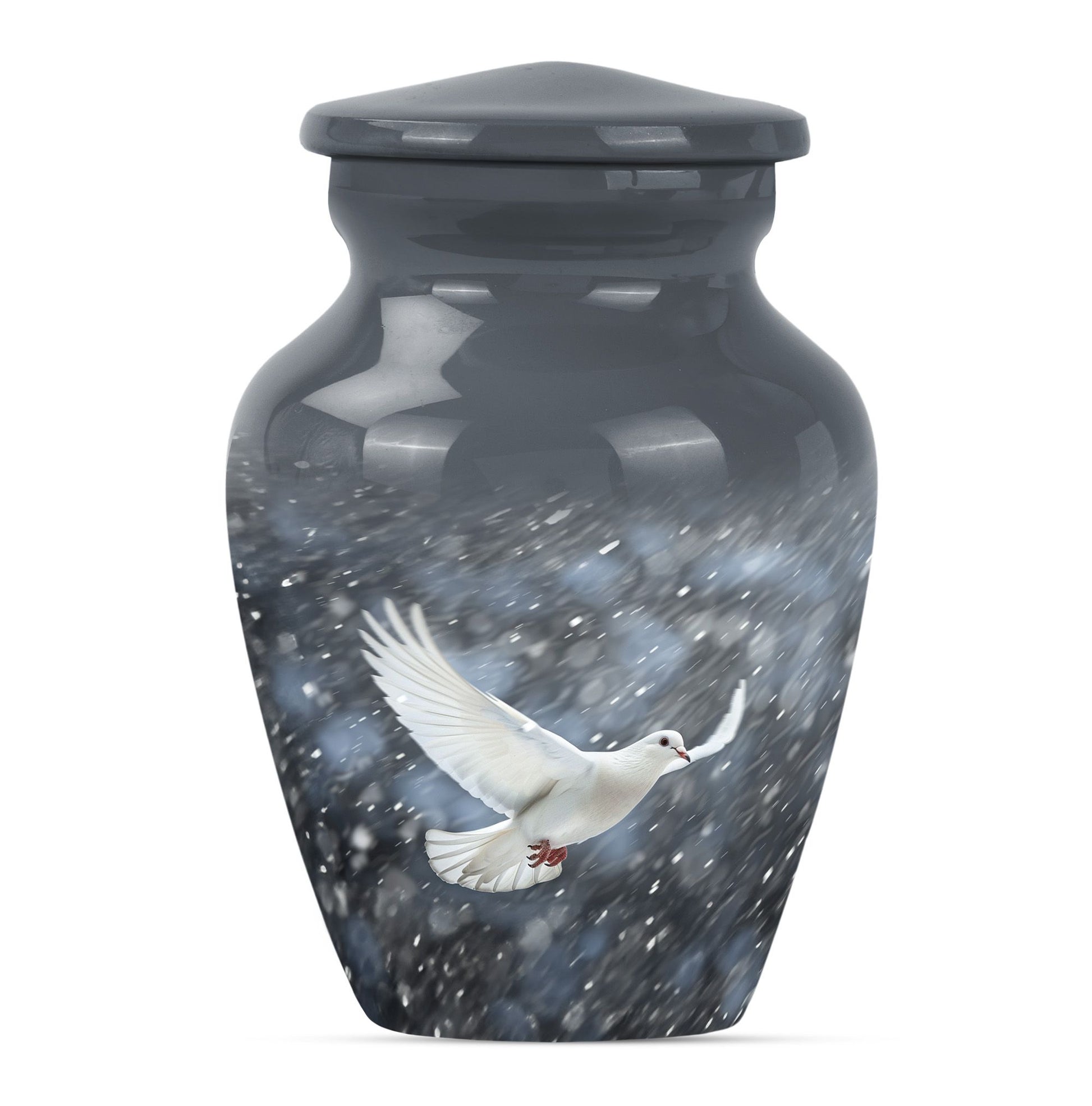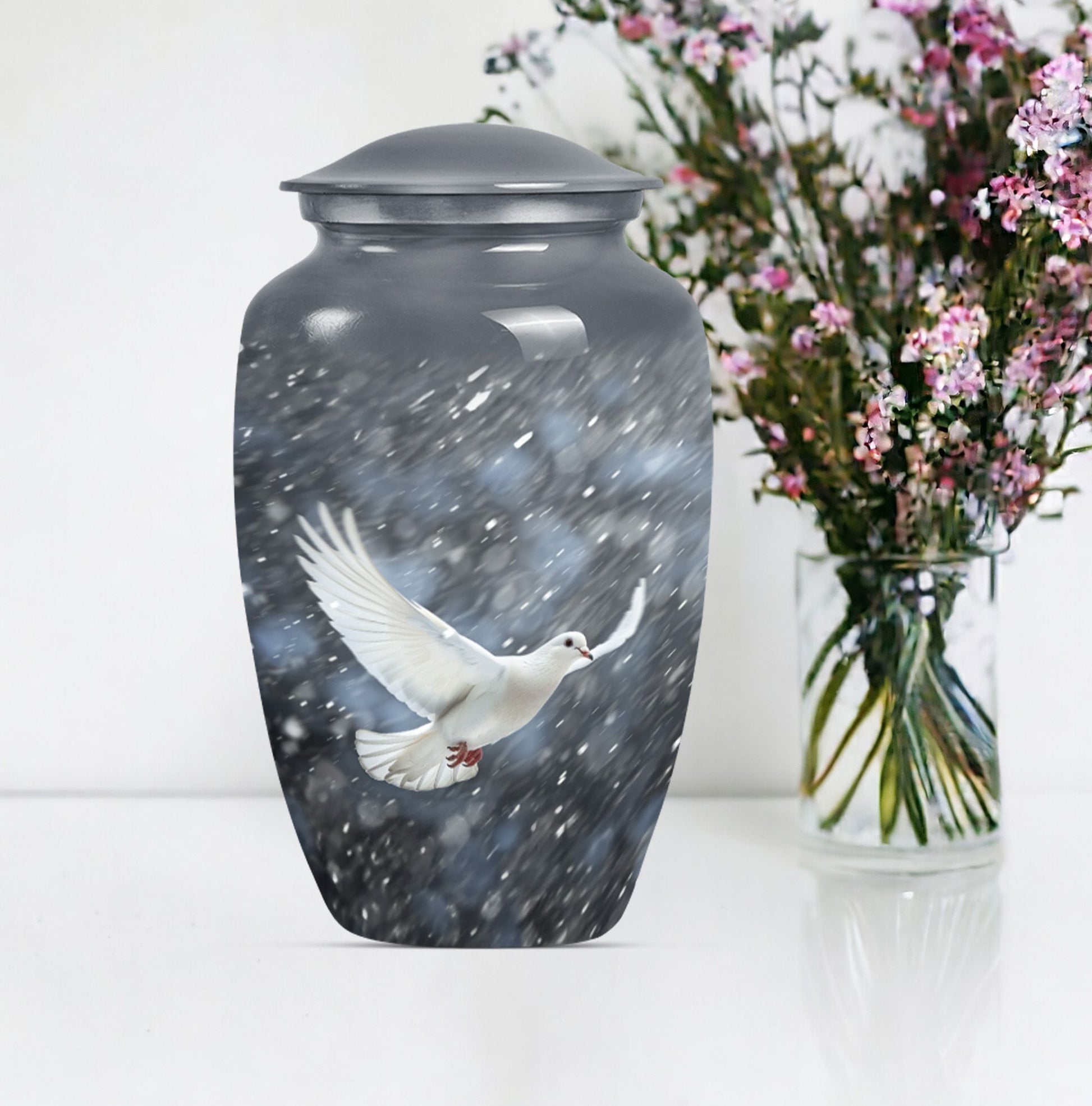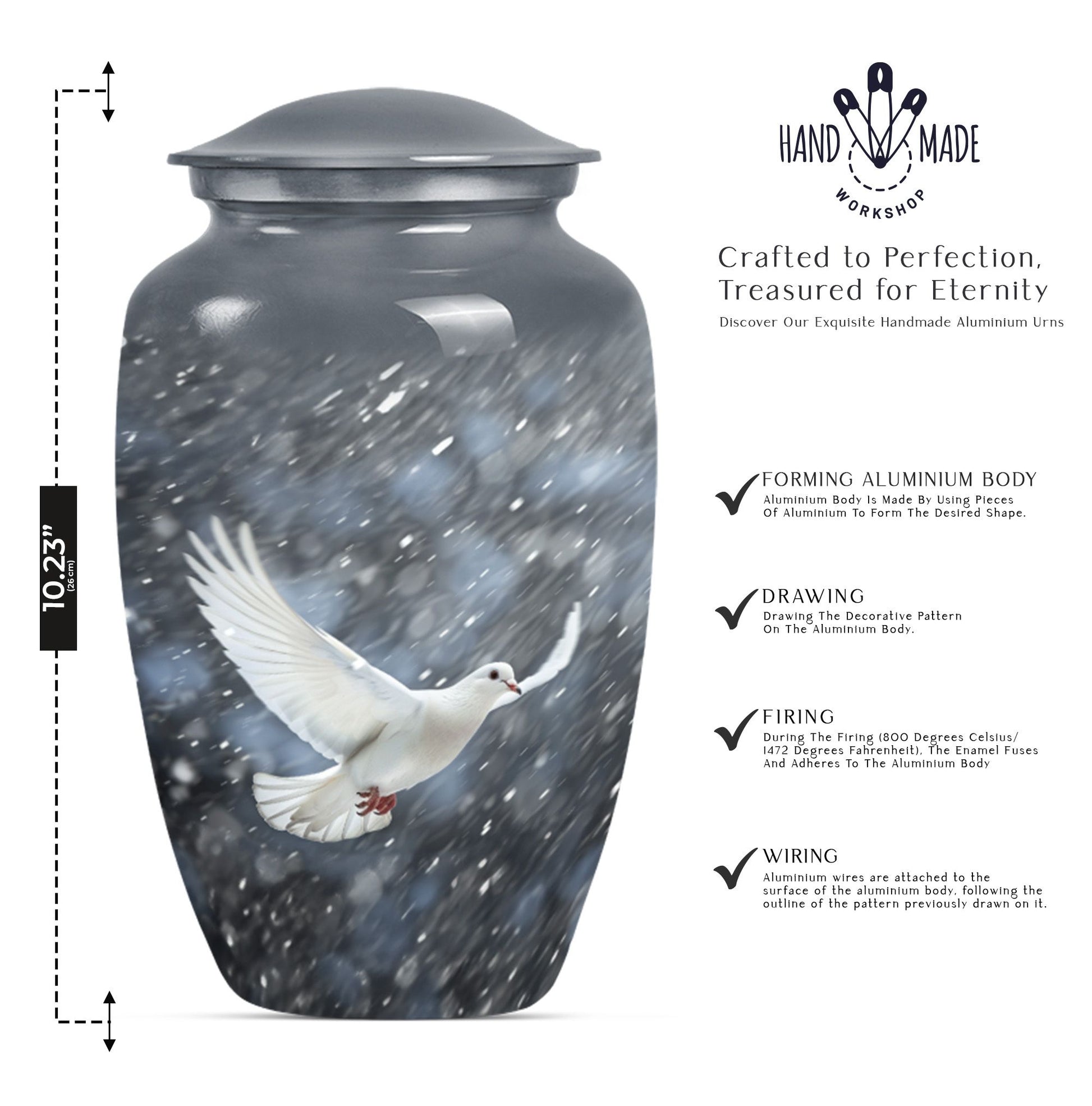 Commemorate your loved one with the Classic Dove Urn, our quality aluminium memorial adult urn. This cremation urn is larger than most, standing 10 inches tall and boasting a capacity of 200 cubic inches. Each urn weighs in at a substantial 3.3 pounds, conveying durability and significance. The urn comes with a velvet pouch, providing a dignified containment for the ashes of your loved one. Personalization is available, allowing you to engrave names on the exterior for a special touch of remembrance. Abstract in theme, this urn breaks away from conventional motifs, offering an unusual design element. This item is best suited for those seeking funeral burial urns or cremation containers for human ashes, as testament to the timeless bond you share with your loved ones. The Classic Dove Urn is more than an ashes urn; it's a token of enduring love and respect.