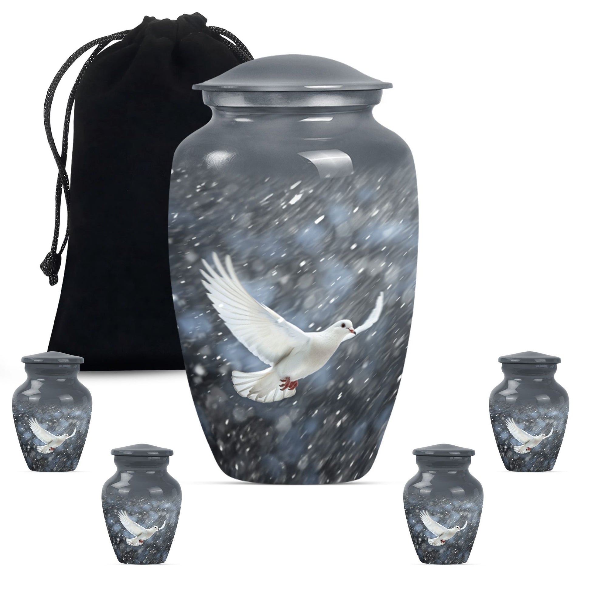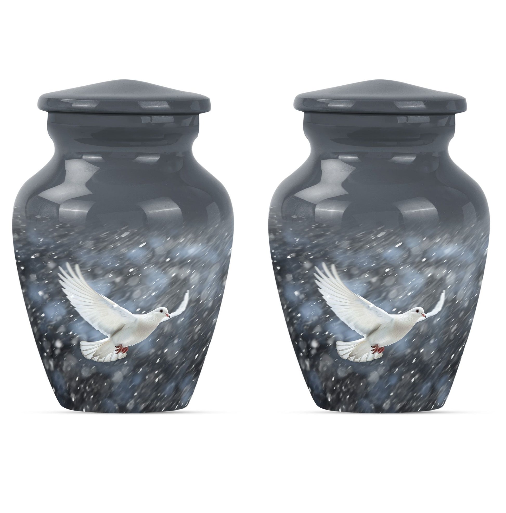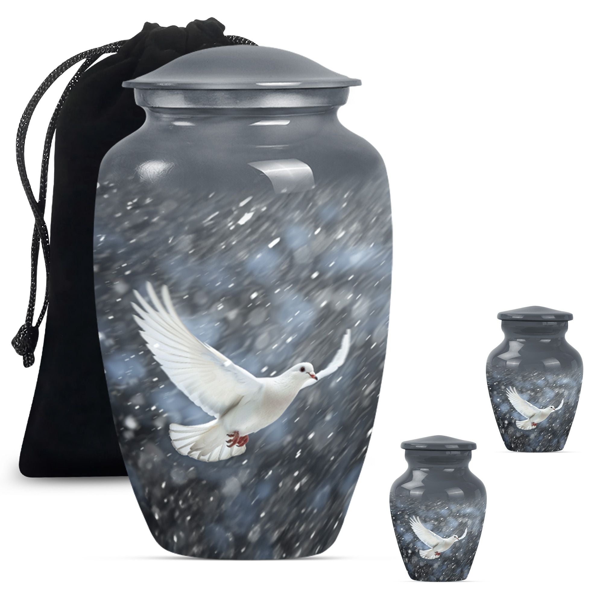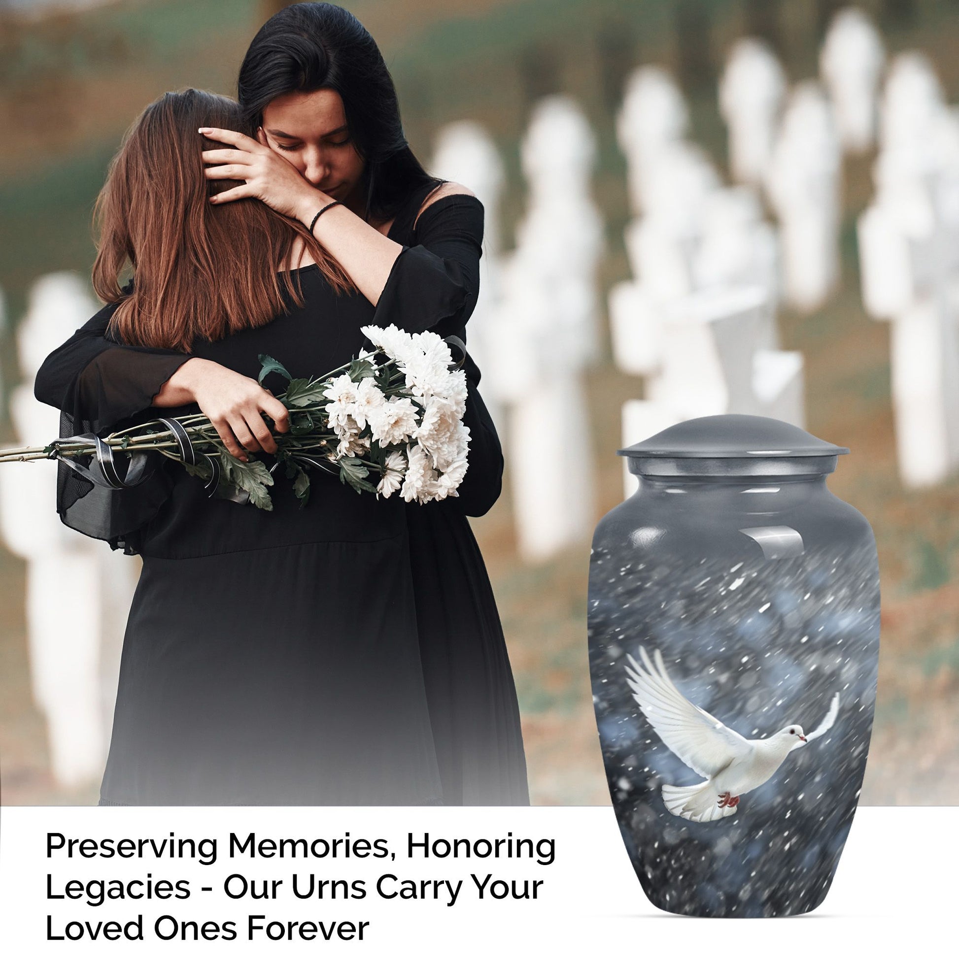 Commemorate your loved one with the Classic Dove Urn, our quality aluminium memorial adult urn. This cremation urn is larger than most, standing 10 inches tall and boasting a capacity of 200 cubic inches. Each urn weighs in at a substantial 3.3 pounds, conveying durability and significance. The urn comes with a velvet pouch, providing a dignified containment for the ashes of your loved one. Personalization is available, allowing you to engrave names on the exterior for a special touch of remembrance. Abstract in theme, this urn breaks away from conventional motifs, offering an unusual design element. This item is best suited for those seeking funeral burial urns or cremation containers for human ashes, as testament to the timeless bond you share with your loved ones. The Classic Dove Urn is more than an ashes urn; it's a token of enduring love and respect.