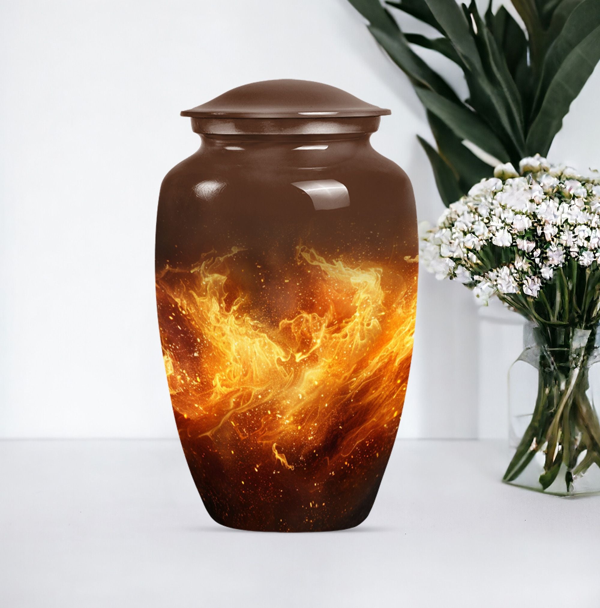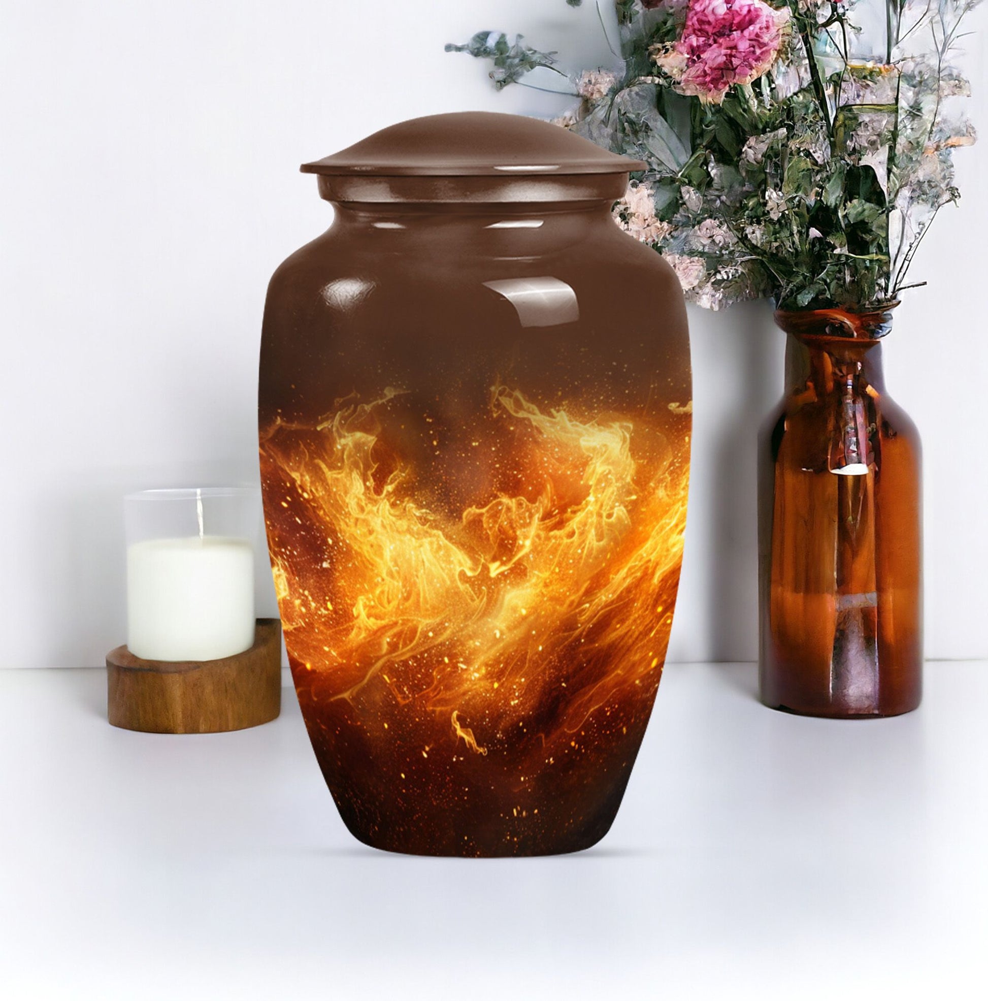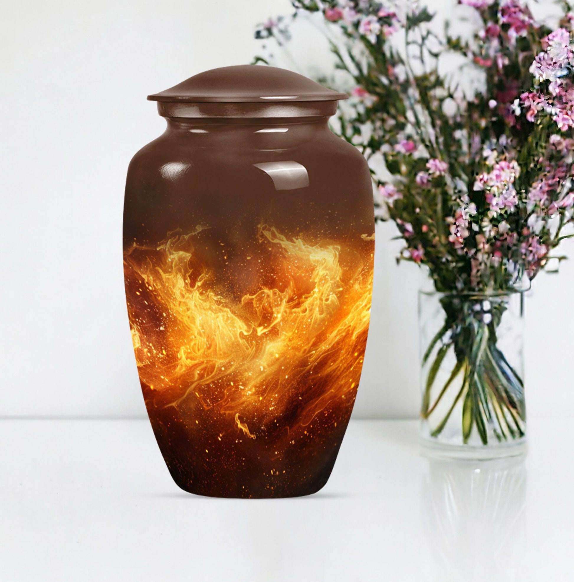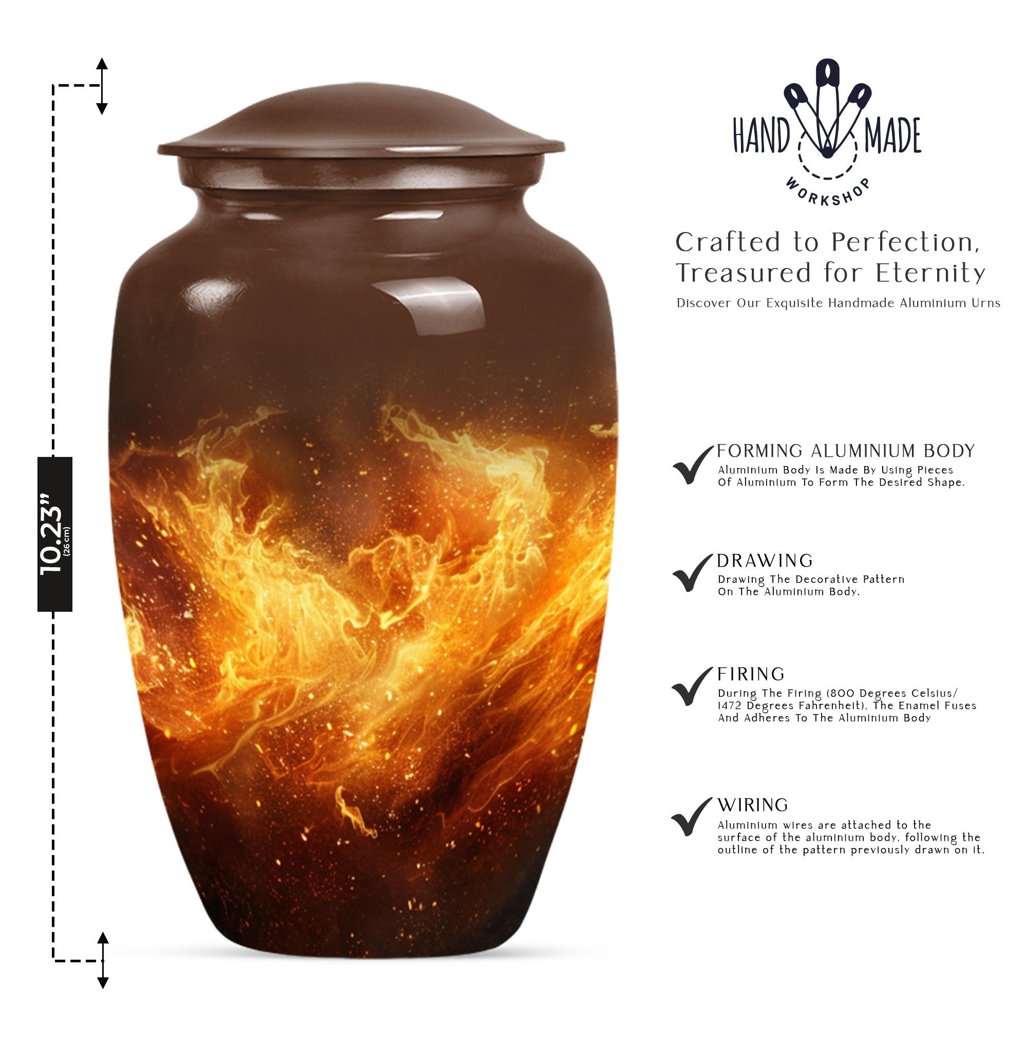 Enshrine the memory of your beloved with our premium fire urn, a 10-inch tall crowd-satisfier amongst the large urns category. Swathed in iridescent metal, this lightweight aluminium cremation urn weighs just 3.3 pounds but capably contains up to 200 cubic inches of ashes. Its abstract theme adds an appealing mystique to its classic urn silhouette. The cremation urn comes housed in a luxurious velvet pouch for secure containment of the ashes. Plus, personalization provision renders this burial urn even more special as you can engrave names to stay eternally. Regardless of whether you seek urn for funeral or burial urns for men, this large urn stands out with a sturdy build that compounds its elegant aesthetics. Note: this exclusive product is optimized for English language audience (locale: en).