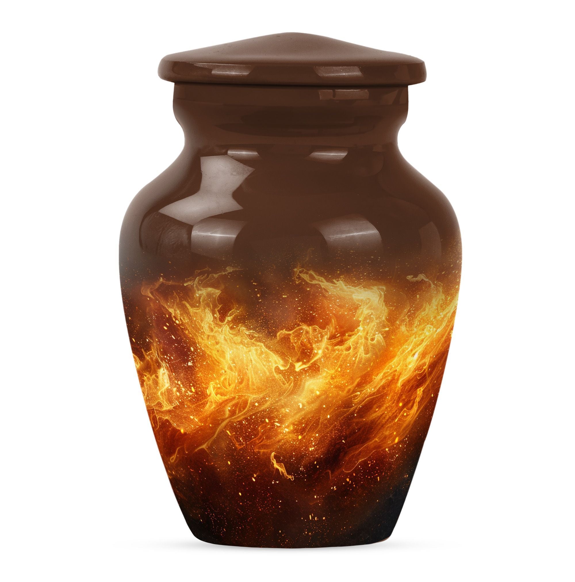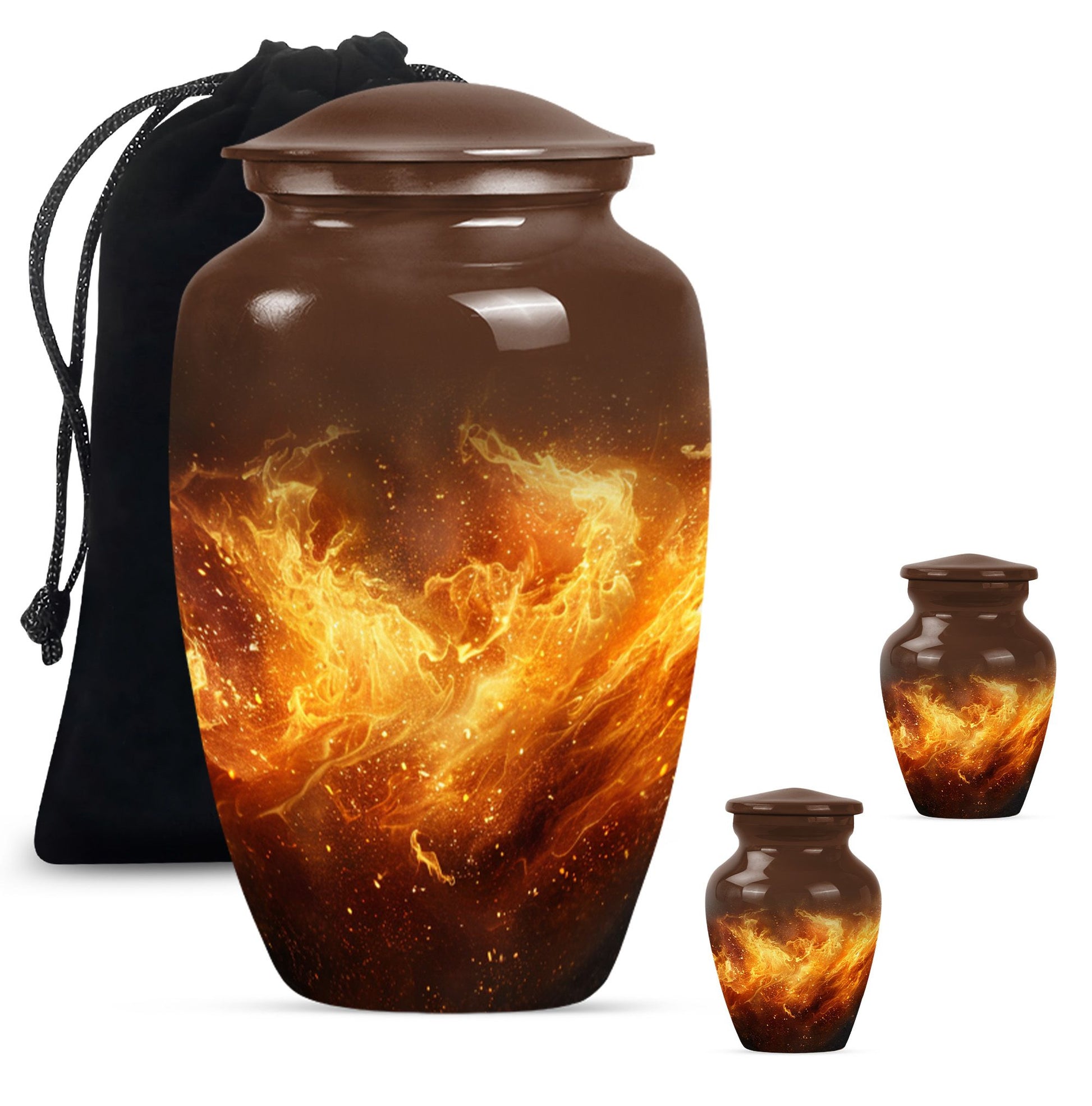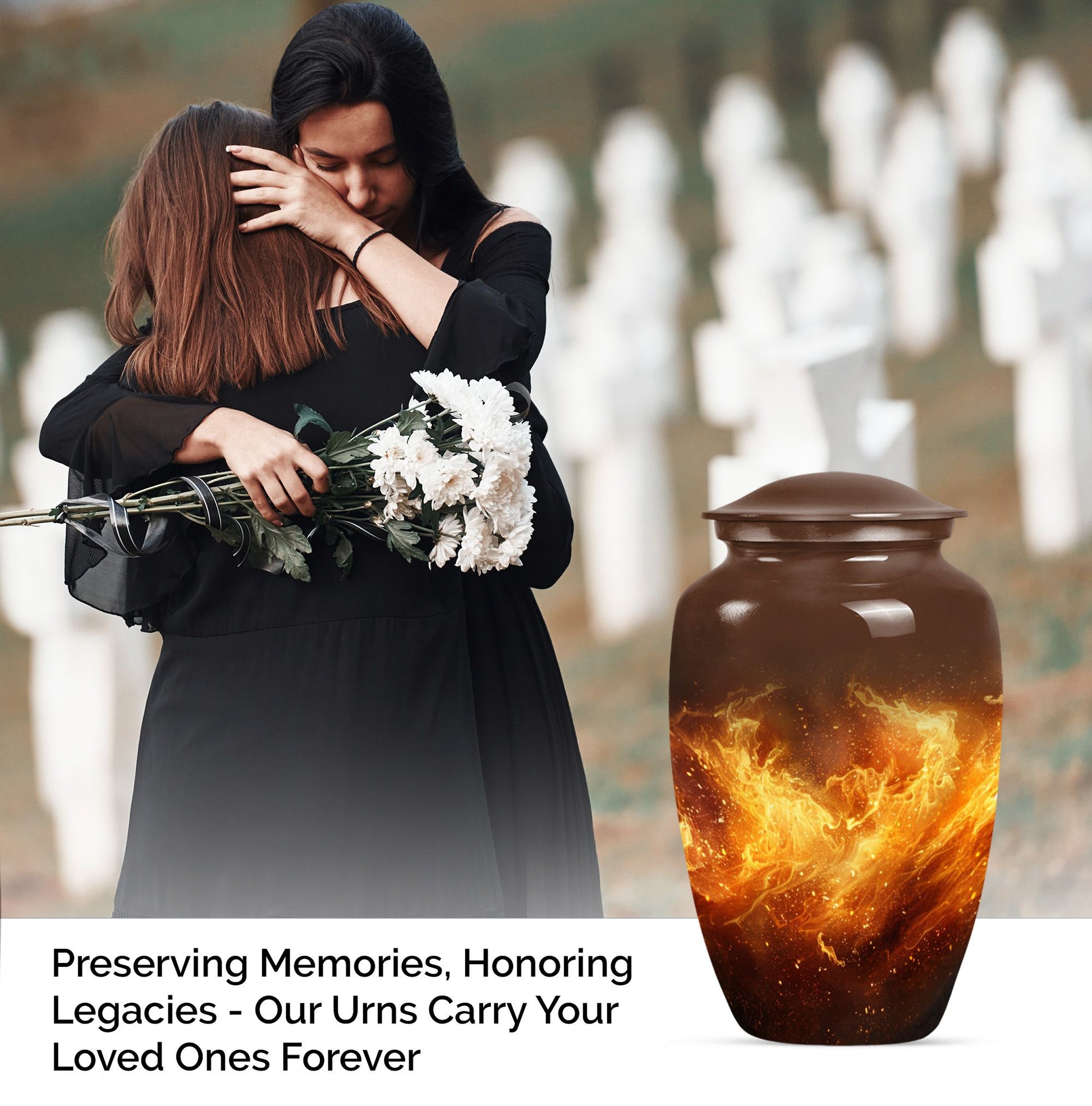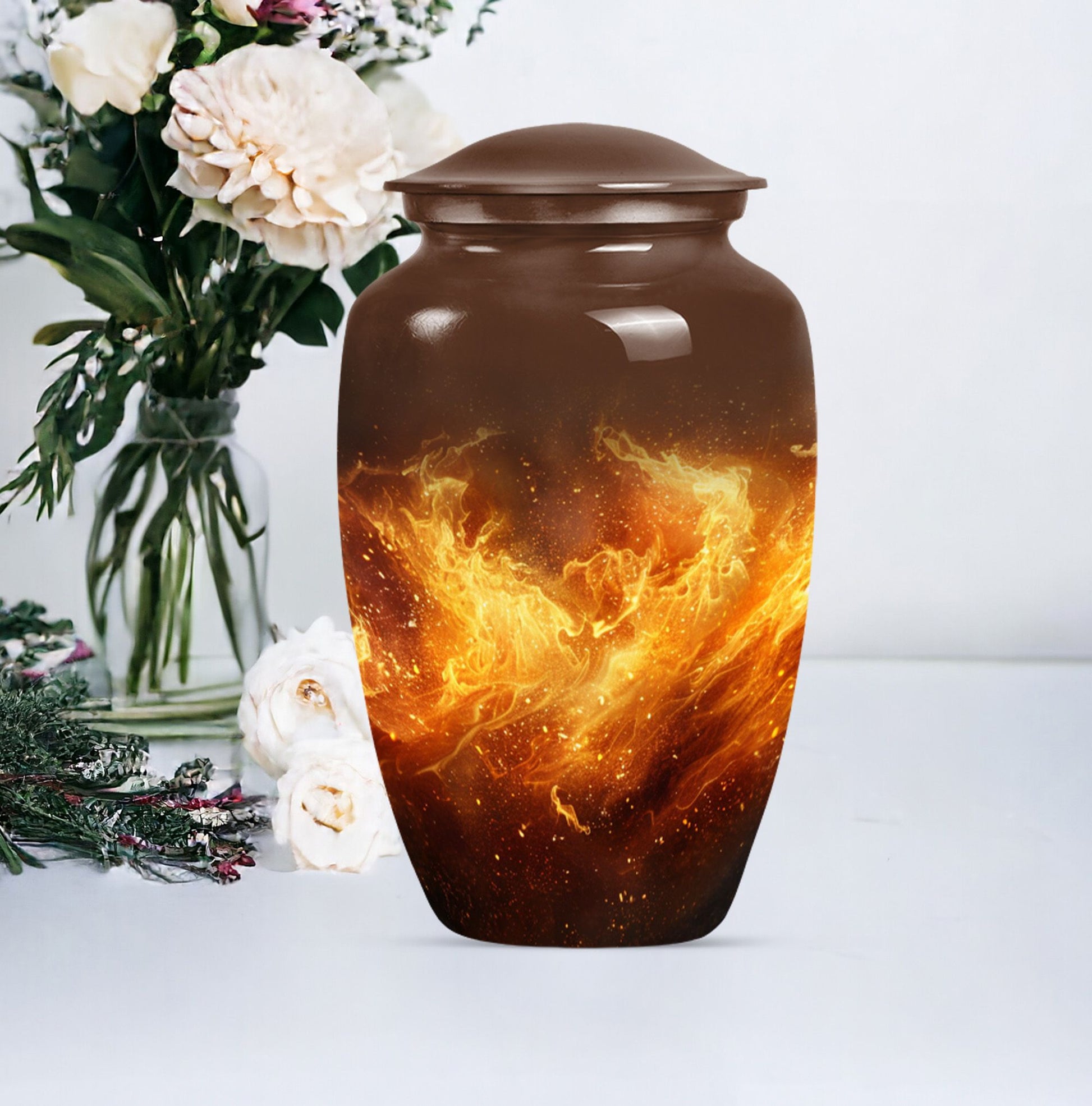 Enshrine the memory of your beloved with our premium fire urn, a 10-inch tall crowd-satisfier amongst the large urns category. Swathed in iridescent metal, this lightweight aluminium cremation urn weighs just 3.3 pounds but capably contains up to 200 cubic inches of ashes. Its abstract theme adds an appealing mystique to its classic urn silhouette. The cremation urn comes housed in a luxurious velvet pouch for secure containment of the ashes. Plus, personalization provision renders this burial urn even more special as you can engrave names to stay eternally. Regardless of whether you seek urn for funeral or burial urns for men, this large urn stands out with a sturdy build that compounds its elegant aesthetics. Note: this exclusive product is optimized for English language audience (locale: en).