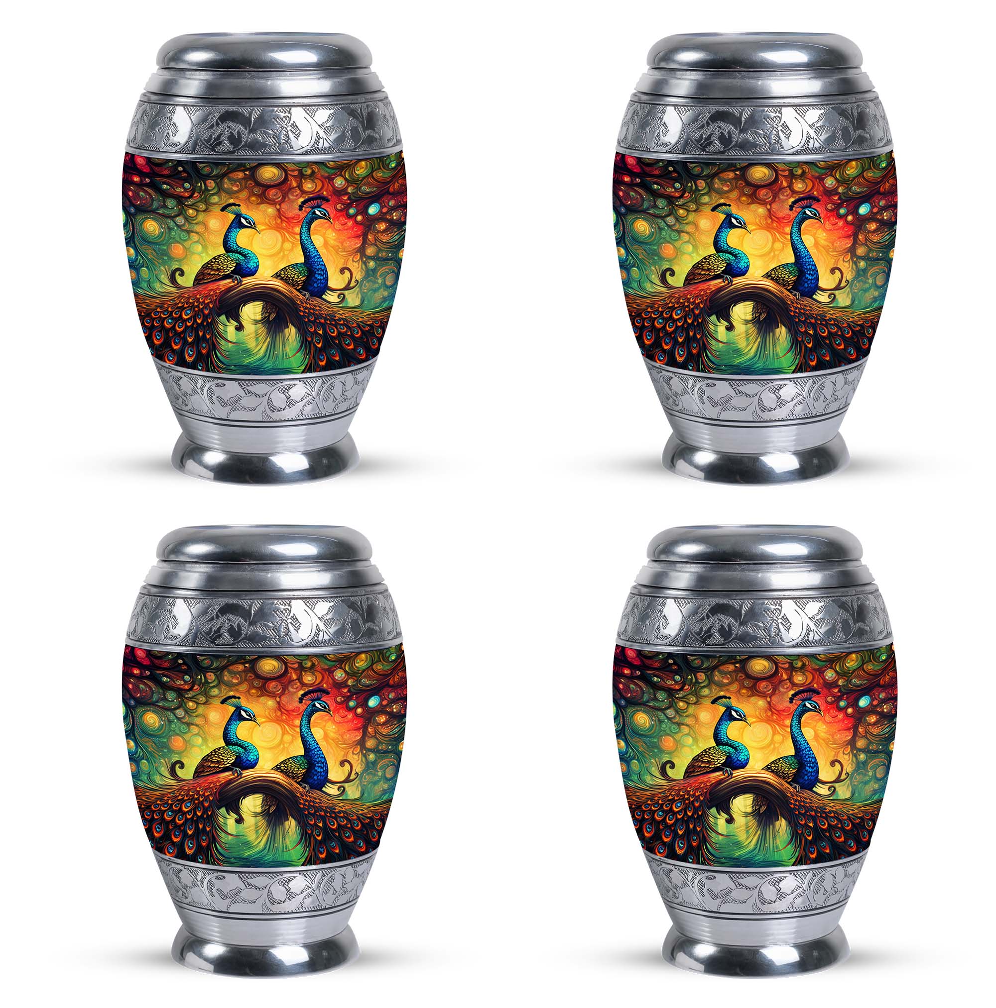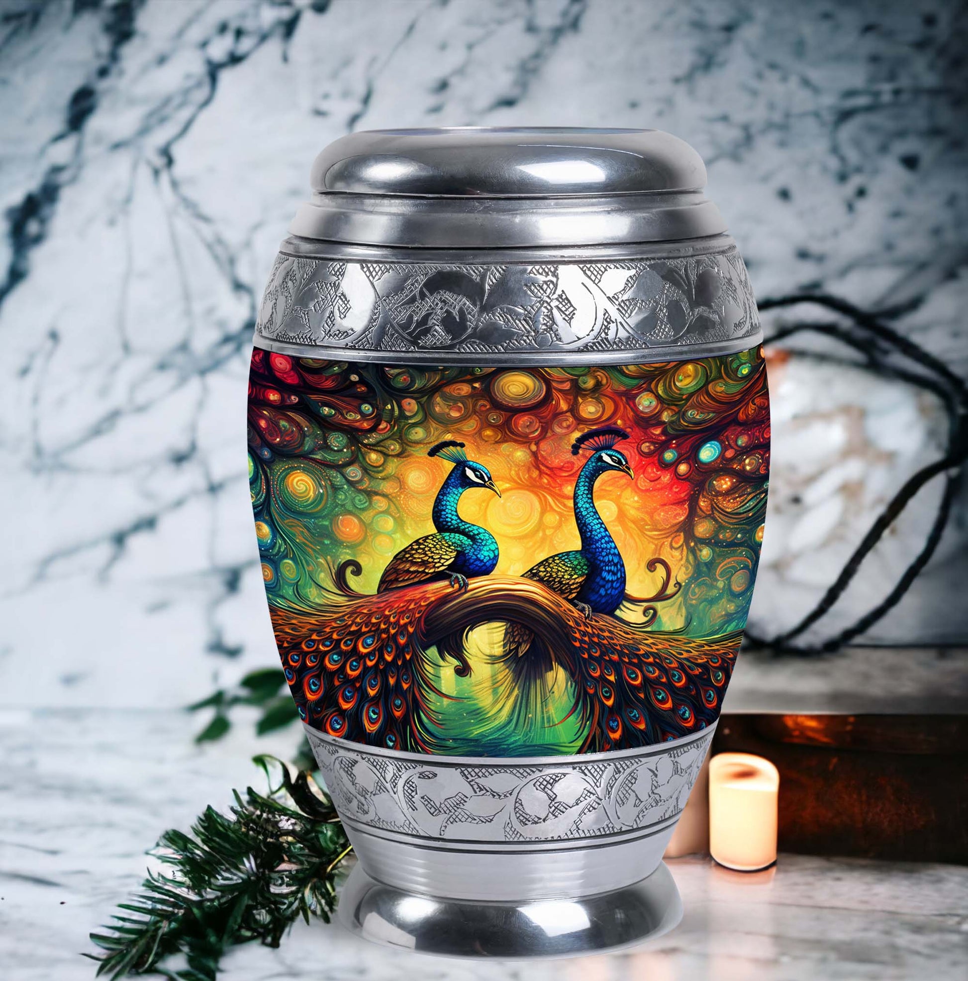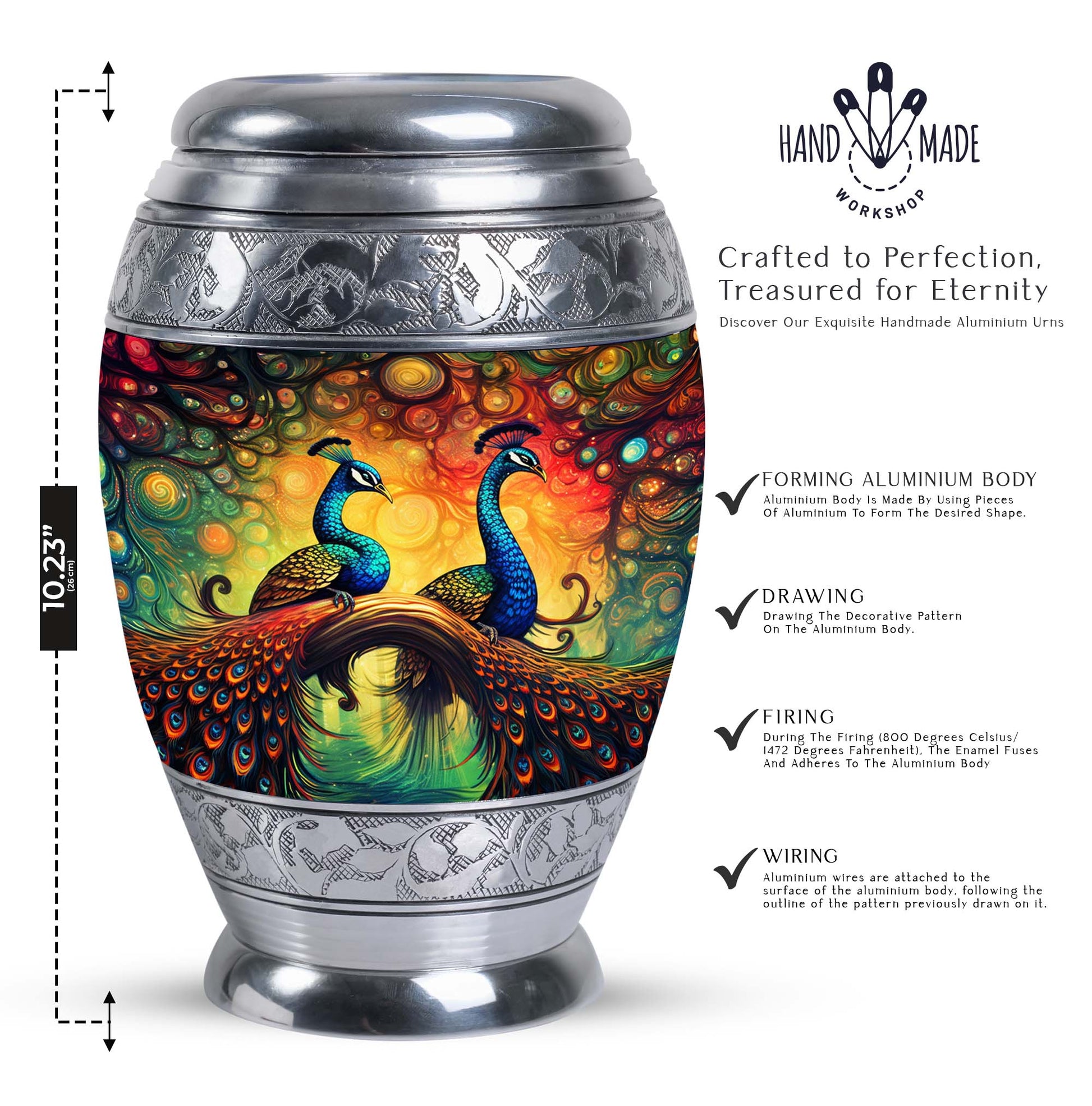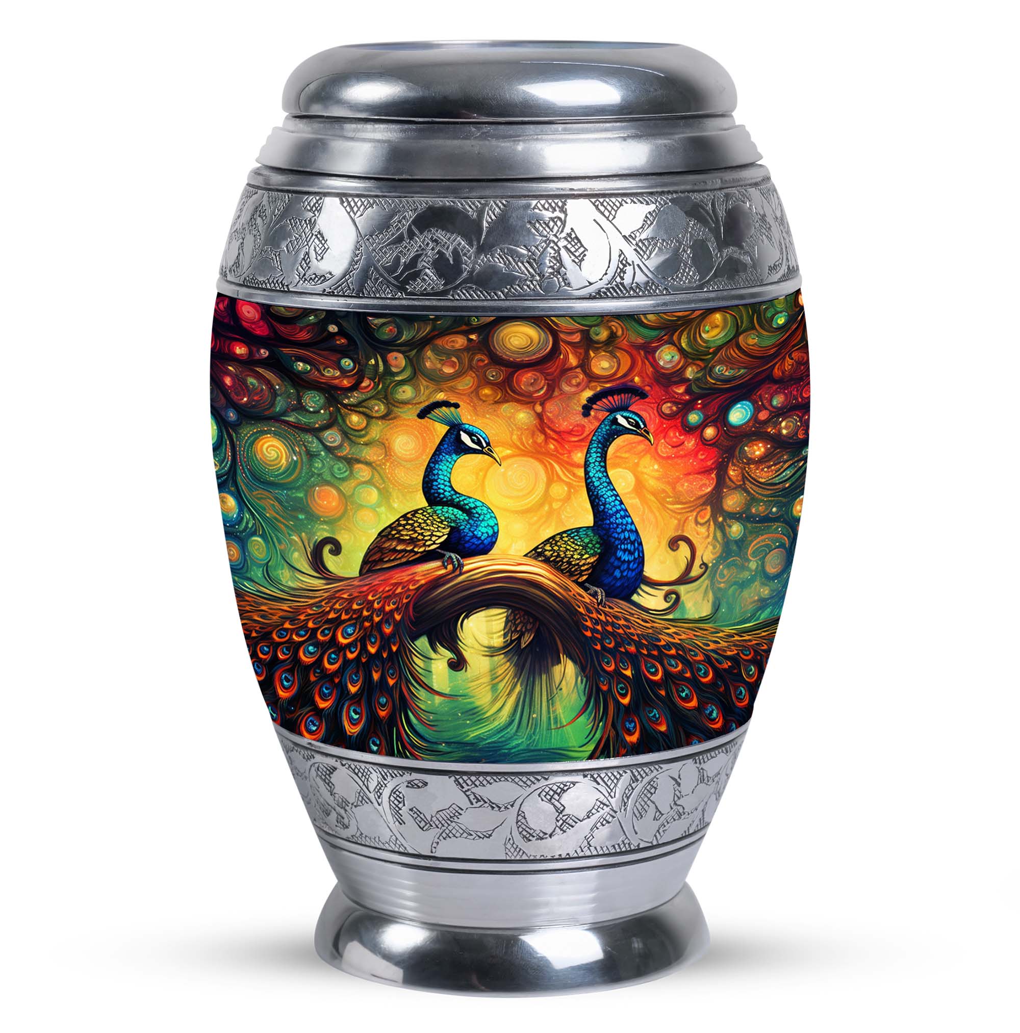 Render your heartfelt condolences with this elegant Classic Urn, a fitting memorial cremation urn designed diligently with the fine craftsmanship. Sized at 3 inches, it exudes grace while providing ample 200 cubic inches capacity for ashes. This robust urn, despite weighing just 3.3 pounds, stands tall at 10 inches, from its base to its peak. Meticulously shaped out of durable aluminium, it serves as a long-lasting tribute to your beloved. Along with this tasteful urn, we provide a soft velvet pouch for proper containment of the ashes, adding a layer of respect and dignity. To make this Peacock Urn for Ashes more personalized and special, it accommodates the possibility of engraving names. It is more than an urn - it's an honor-laden focal point that echoes the words, 'sorry for your loss.' Explore our range of metal urns, including unique urns for dad, cool urns for ashes, large urns, and cremation containers for ashes that help to meticulously memorialize your departed ones.