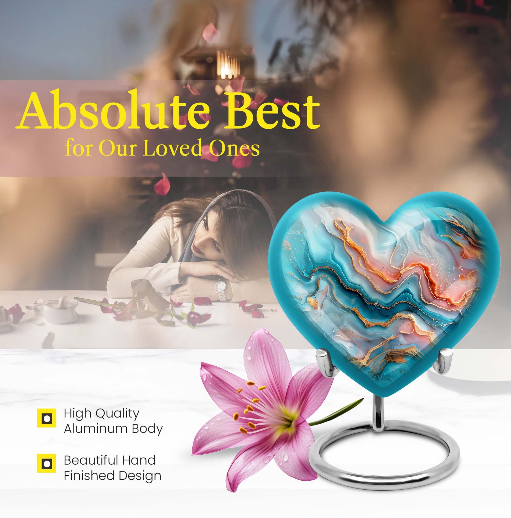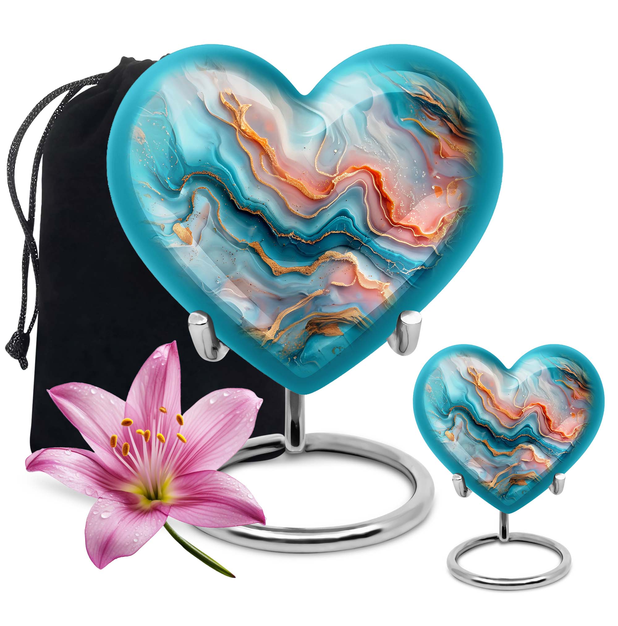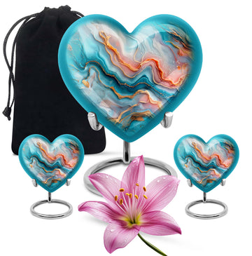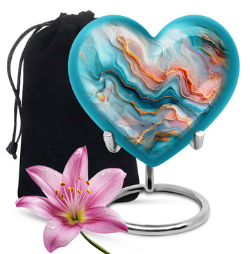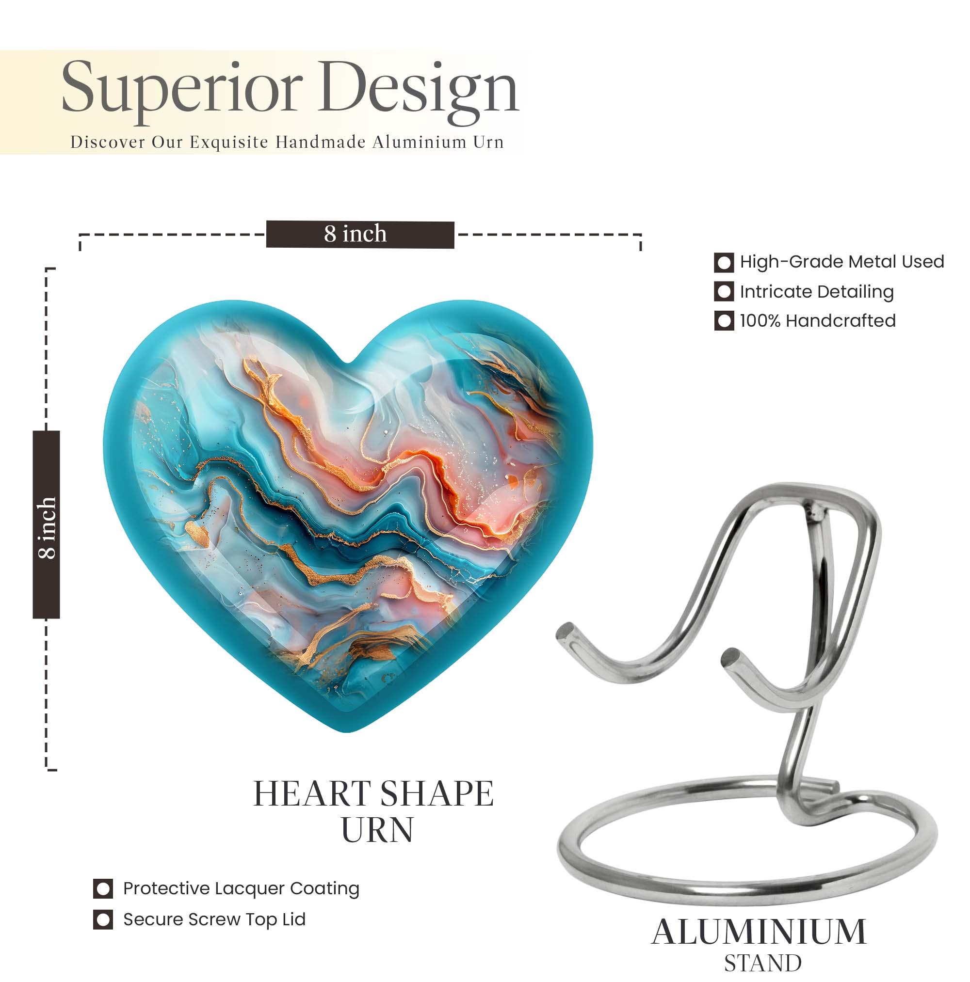 Discover the exquisite Vibrant Swirl Urn, a stunning tribute to honor your loved ones. This large urn is sized at 10 inches and crafted carefully with exceptional aluminium material, guaranteeing longevity. Inspired by abstract themes, its unique Heart Urn design adds a touch of artistic elegance, seamlessly matching any decor. Weighing at 3.3 pounds with dimensions standing 10 inches high, this cremation urn easily accommodates 200 cubic inches of ashes, suitable for both adult men and women. Make it even more special by opting for our engraving service to personalize with cherished names. Not just a funeral urn, it is a comforting symbol of endearment that goes beyond standard burial funeral urns. The product also comes with a soft velvet pouch, ensuring dignified containment of the cherished ashes. This vibrant swirl urn is not just a metal urn; it's a piece of art that beautifully celebrates life and memories. Note that for an easy burial in ground, you can trust this sturdy and substantial urn.
