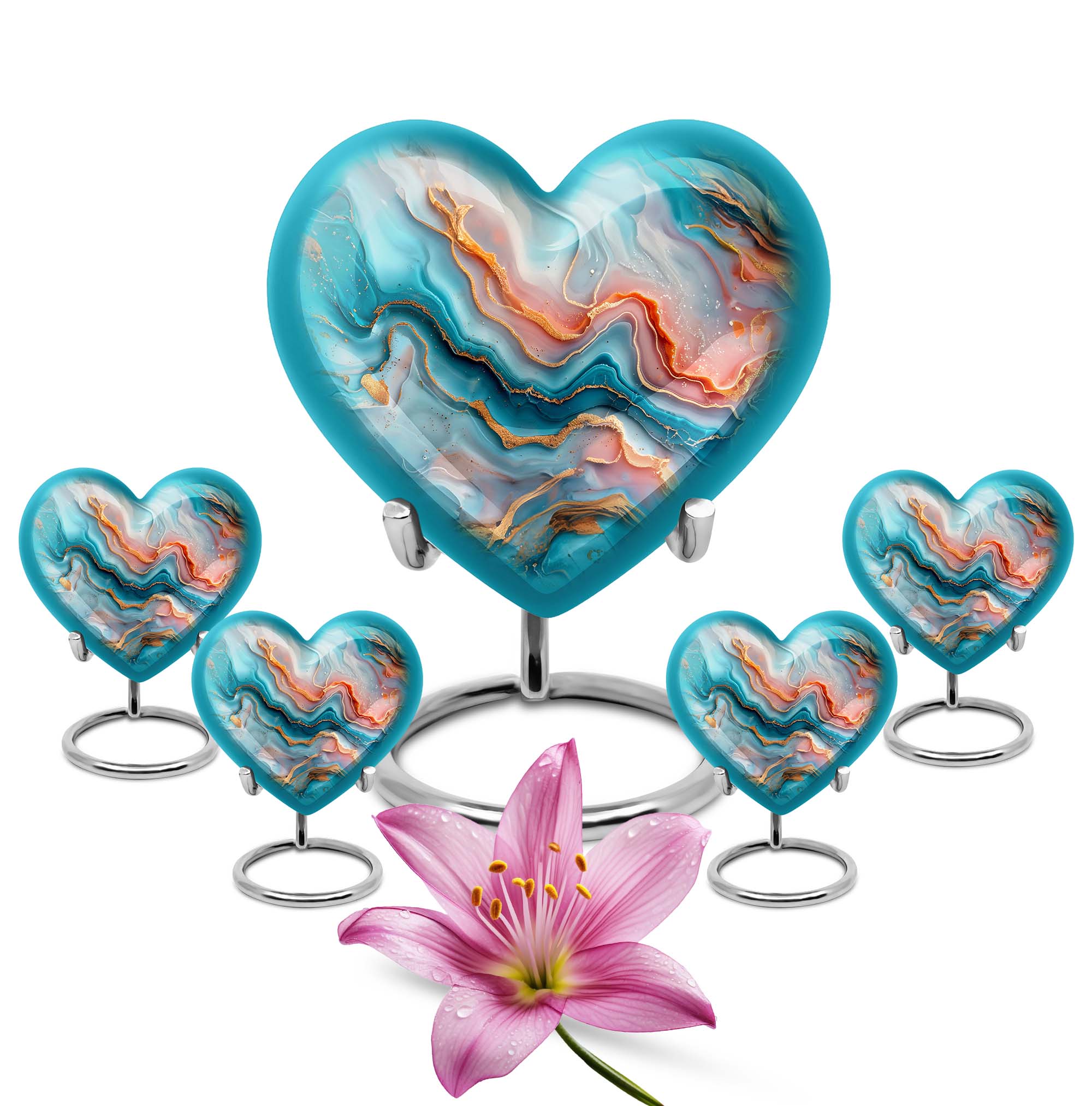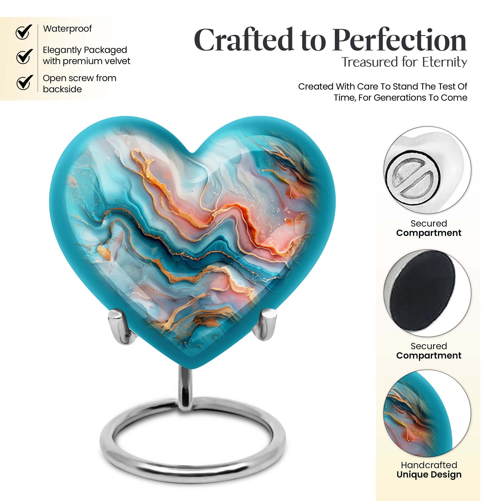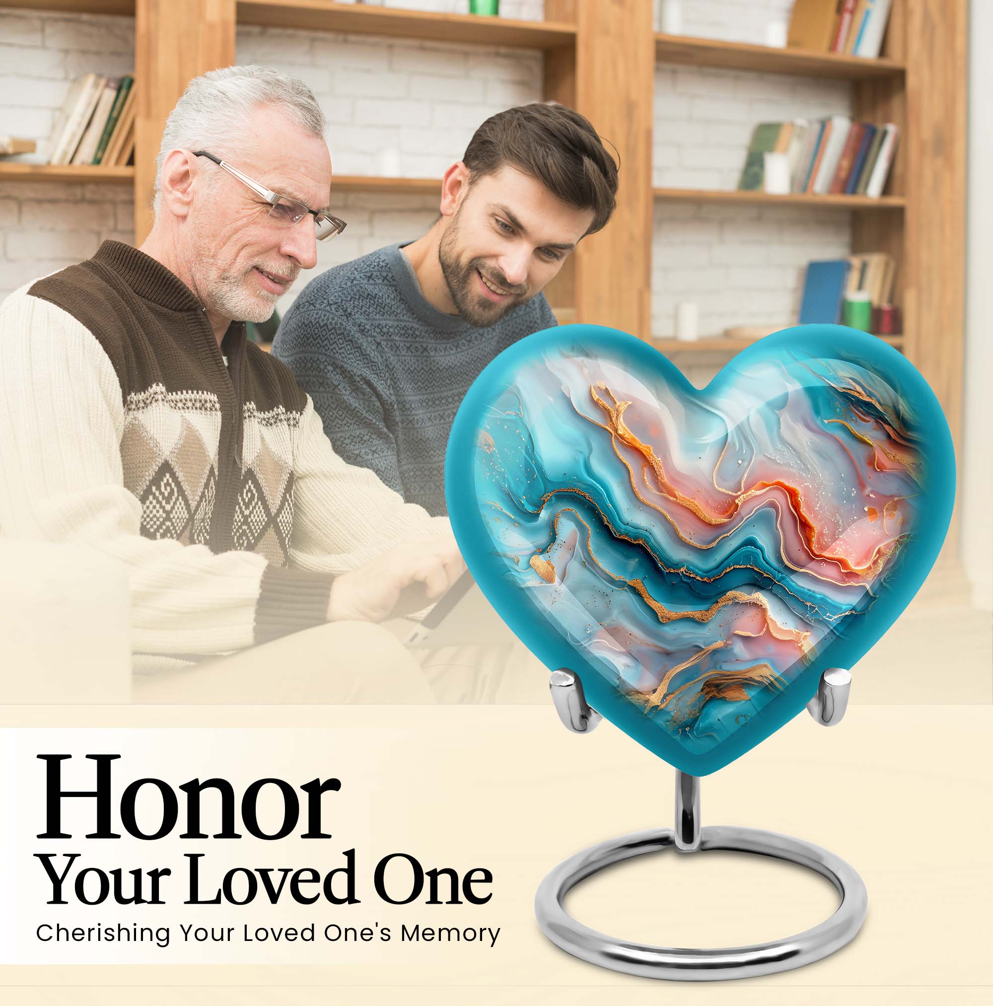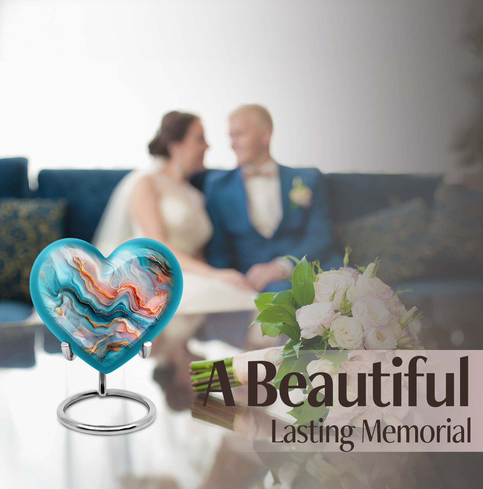 Discover the exquisite Vibrant Swirl Urn, a stunning tribute to honor your loved ones. This large urn is sized at 10 inches and crafted carefully with exceptional aluminium material, guaranteeing longevity. Inspired by abstract themes, its unique Heart Urn design adds a touch of artistic elegance, seamlessly matching any decor. Weighing at 3.3 pounds with dimensions standing 10 inches high, this cremation urn easily accommodates 200 cubic inches of ashes, suitable for both adult men and women. Make it even more special by opting for our engraving service to personalize with cherished names. Not just a funeral urn, it is a comforting symbol of endearment that goes beyond standard burial funeral urns. The product also comes with a soft velvet pouch, ensuring dignified containment of the cherished ashes. This vibrant swirl urn is not just a metal urn; it's a piece of art that beautifully celebrates life and memories. Note that for an easy burial in ground, you can trust this sturdy and substantial urn.