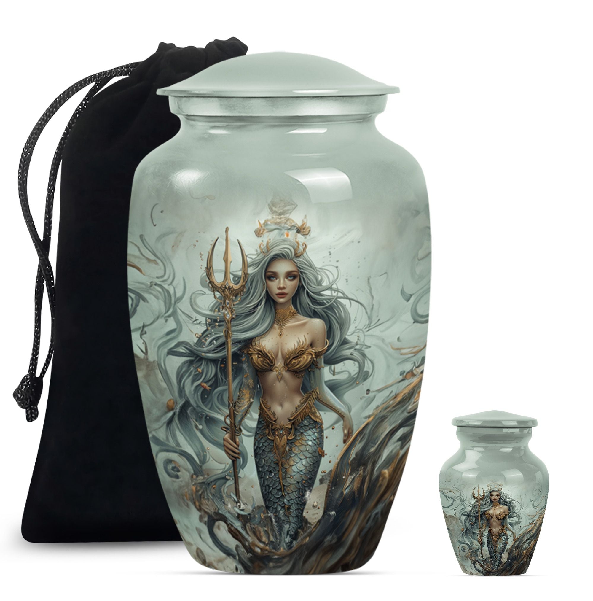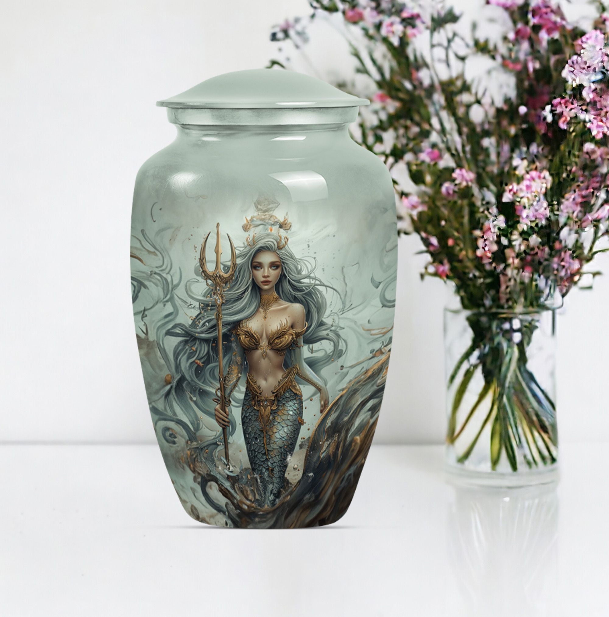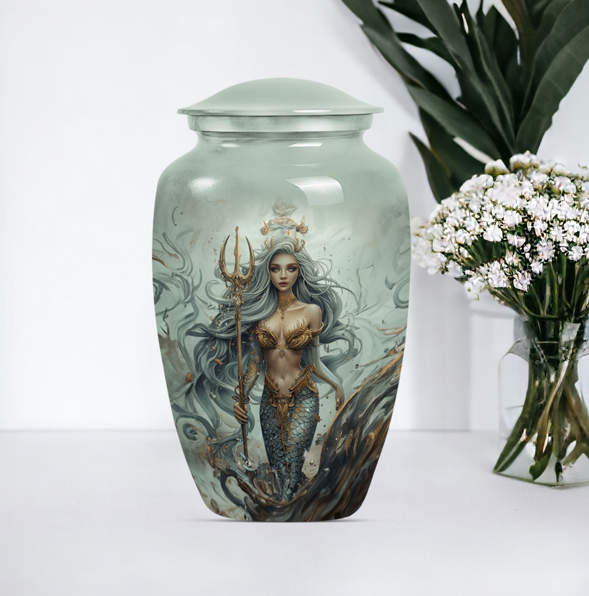 Preserve the memory of your loved ones in a tasteful and meaningful manner with our unique Mermaid Urn. As part of our large urns collection, this cremation urn boasts a 10-inch size and a weight of 3.3 pounds, promoting easy placement in your space. The urn's exterior, crafted from top-quality aluminium, ensures durability over time, keeping its aesthetics intact. The urn's butterfly theme adds a sense of tranquility and joy, connecting with the afterlife's spiritual dimension. The urn comes with a velvet pouch providing a safe and respectful containment for the ashes. This remarkable urn has a capacity of 200 cubic inches, ideal for adult ashes. Customization is offered – the urn can be personalized with engraved names, allowing a unique tribute to those who have passed away. The Mermaid Urn is perfect for those in search of funeral urns for adult male dad, urn ash men, or metal urn memorial supplies.