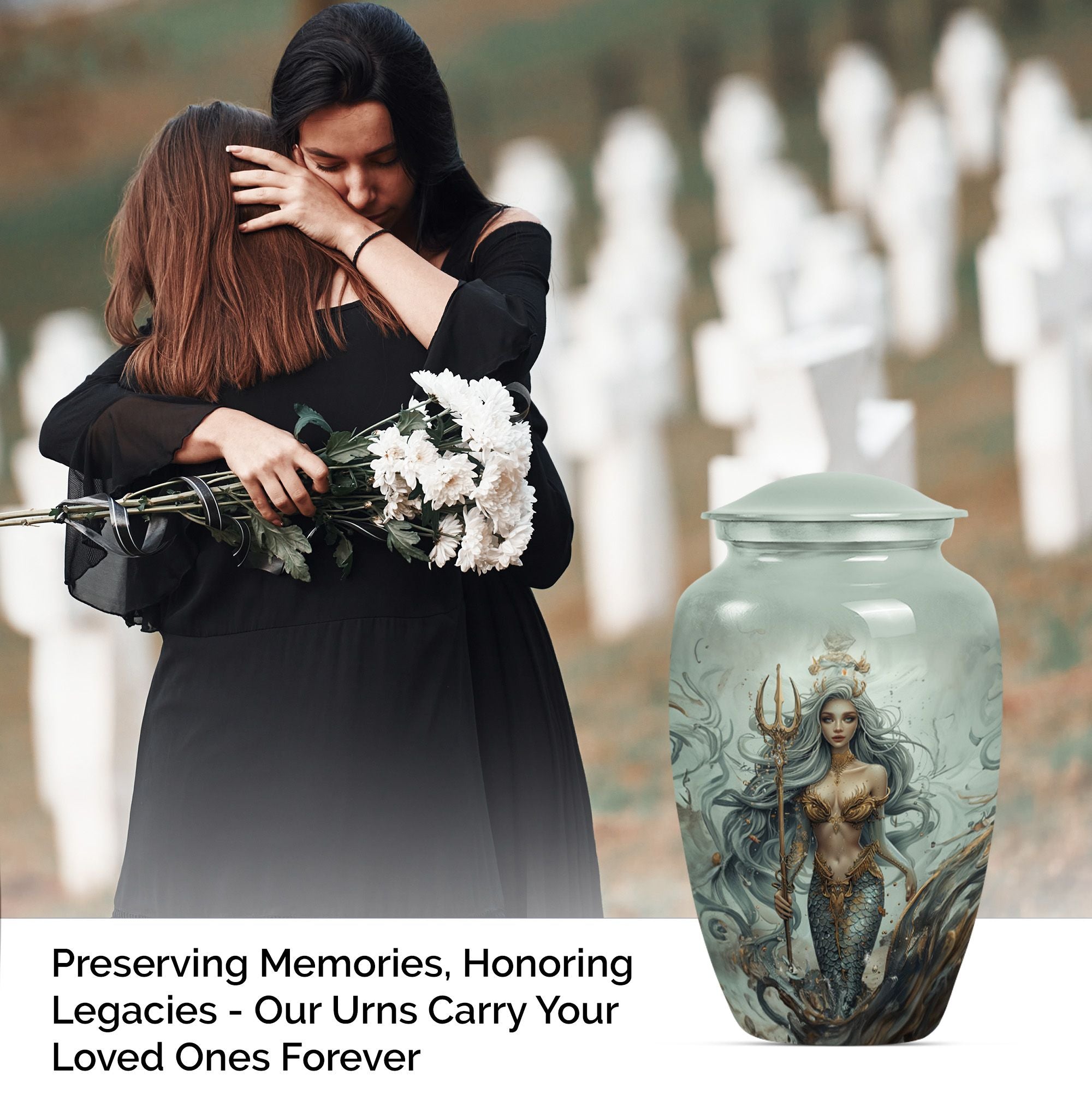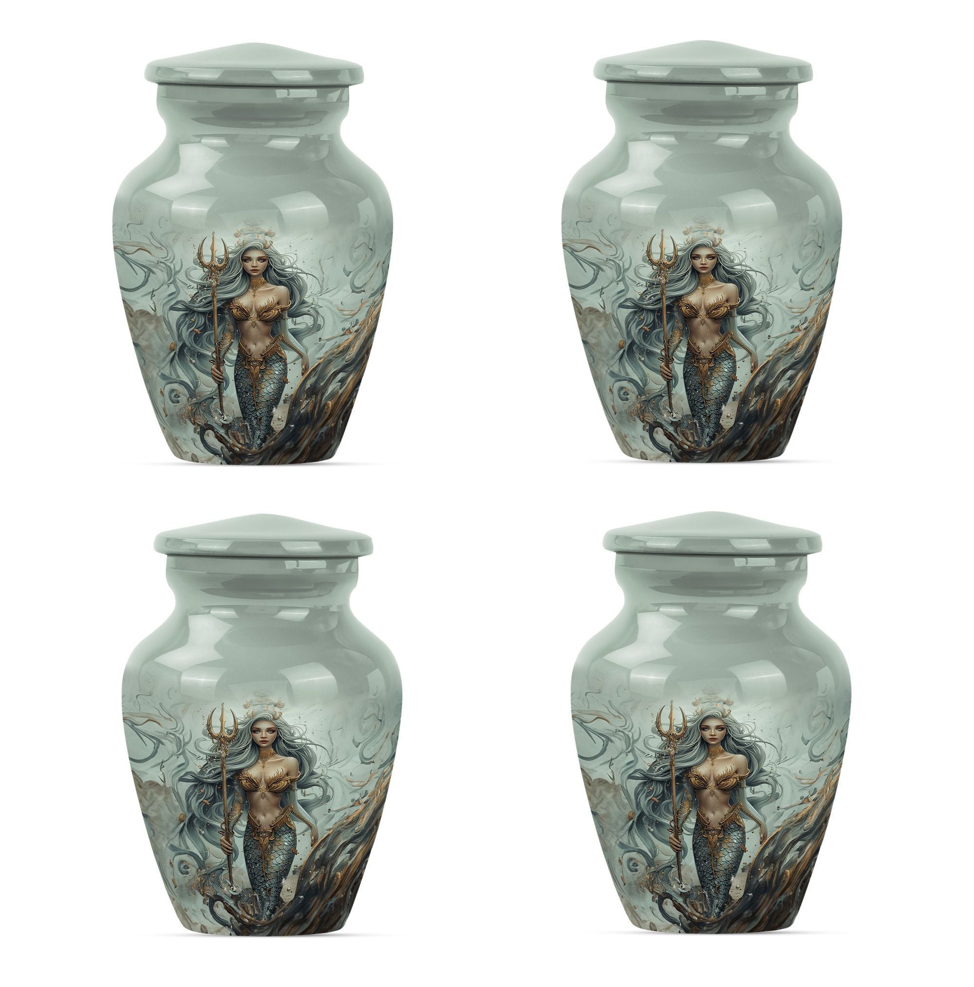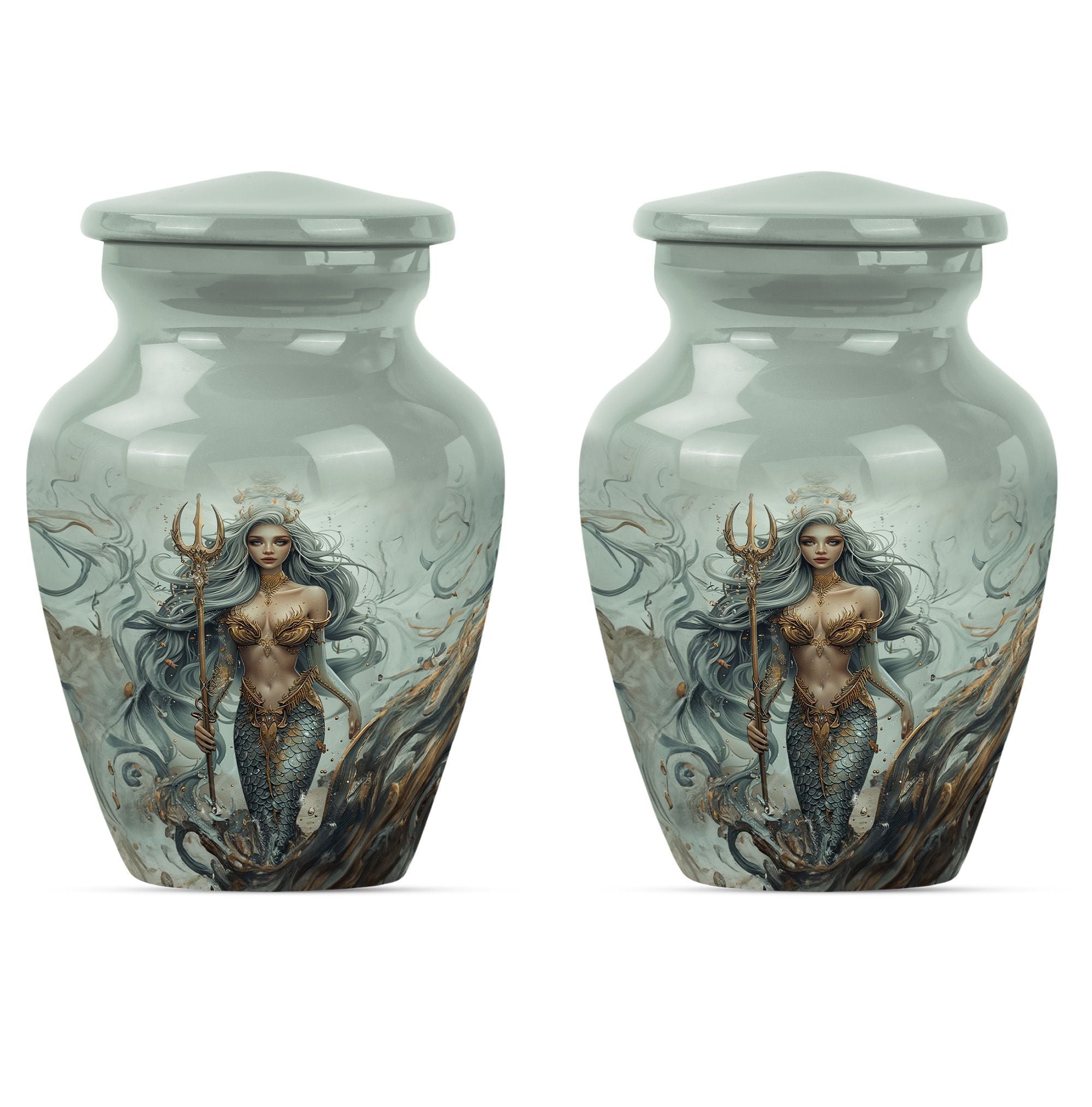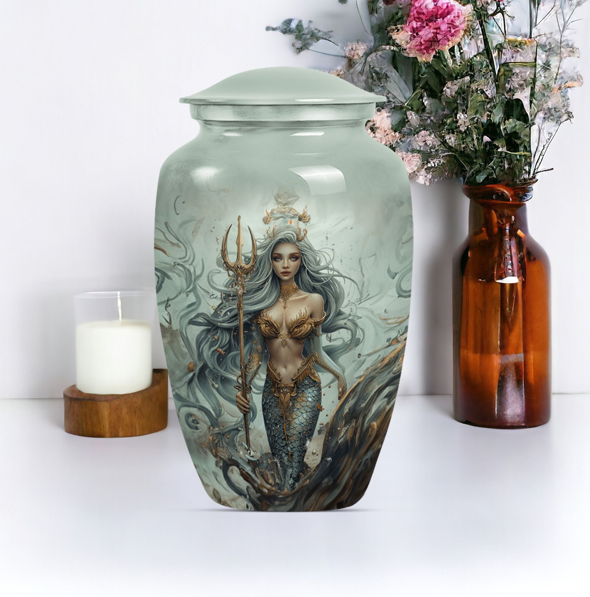 Preserve the memory of your loved ones in a tasteful and meaningful manner with our unique Mermaid Urn. As part of our large urns collection, this cremation urn boasts a 10-inch size and a weight of 3.3 pounds, promoting easy placement in your space. The urn's exterior, crafted from top-quality aluminium, ensures durability over time, keeping its aesthetics intact. The urn's butterfly theme adds a sense of tranquility and joy, connecting with the afterlife's spiritual dimension. The urn comes with a velvet pouch providing a safe and respectful containment for the ashes. This remarkable urn has a capacity of 200 cubic inches, ideal for adult ashes. Customization is offered – the urn can be personalized with engraved names, allowing a unique tribute to those who have passed away. The Mermaid Urn is perfect for those in search of funeral urns for adult male dad, urn ash men, or metal urn memorial supplies.