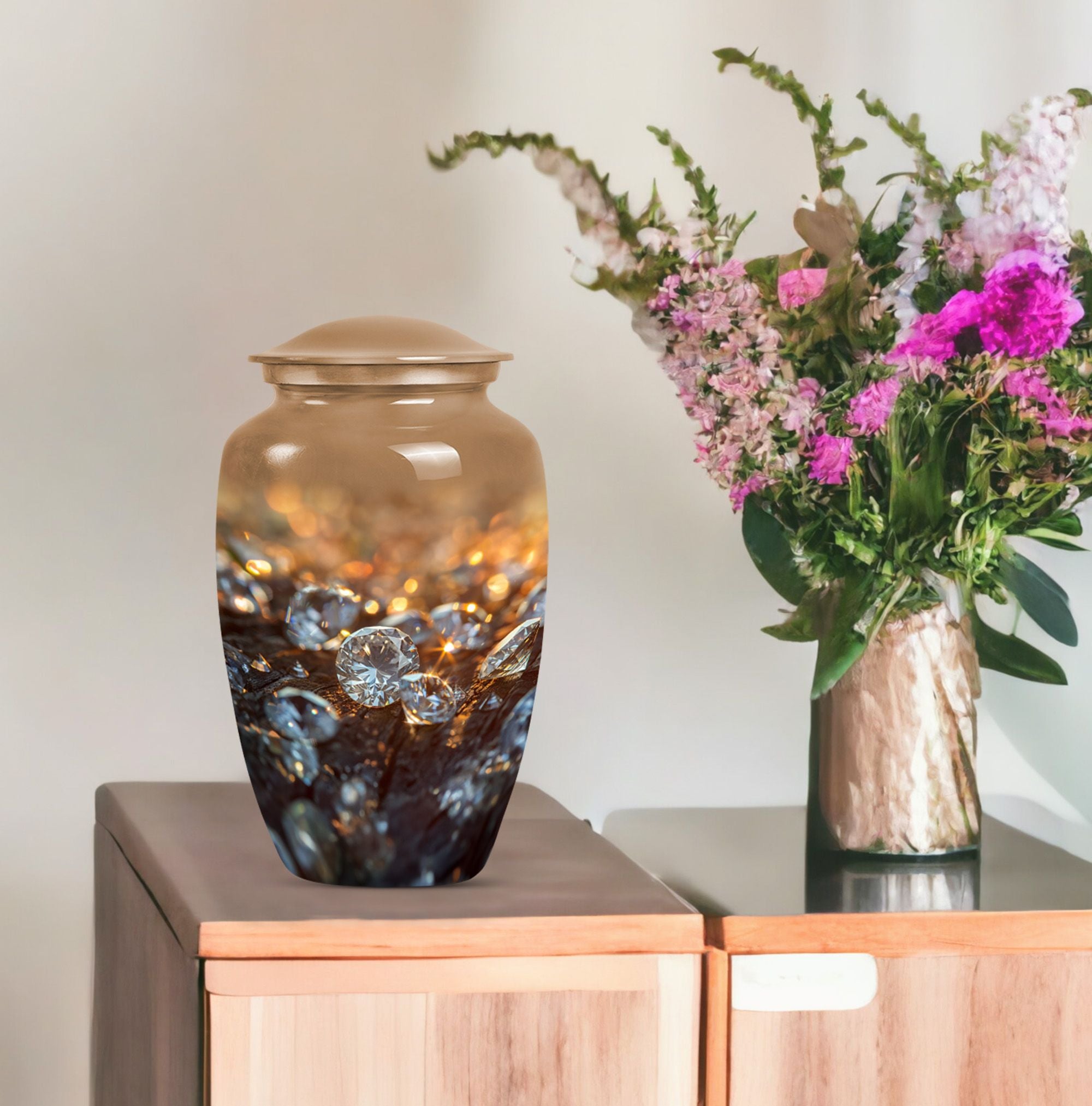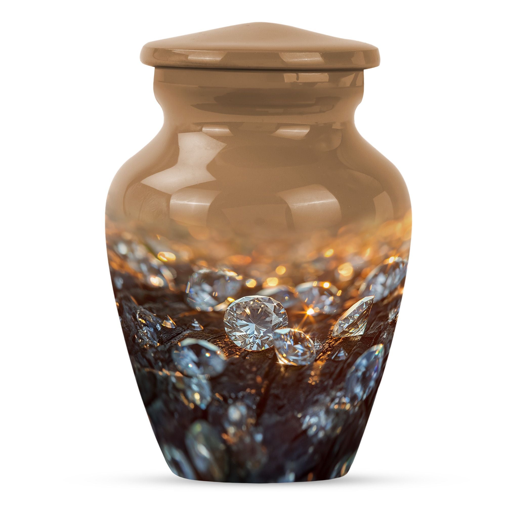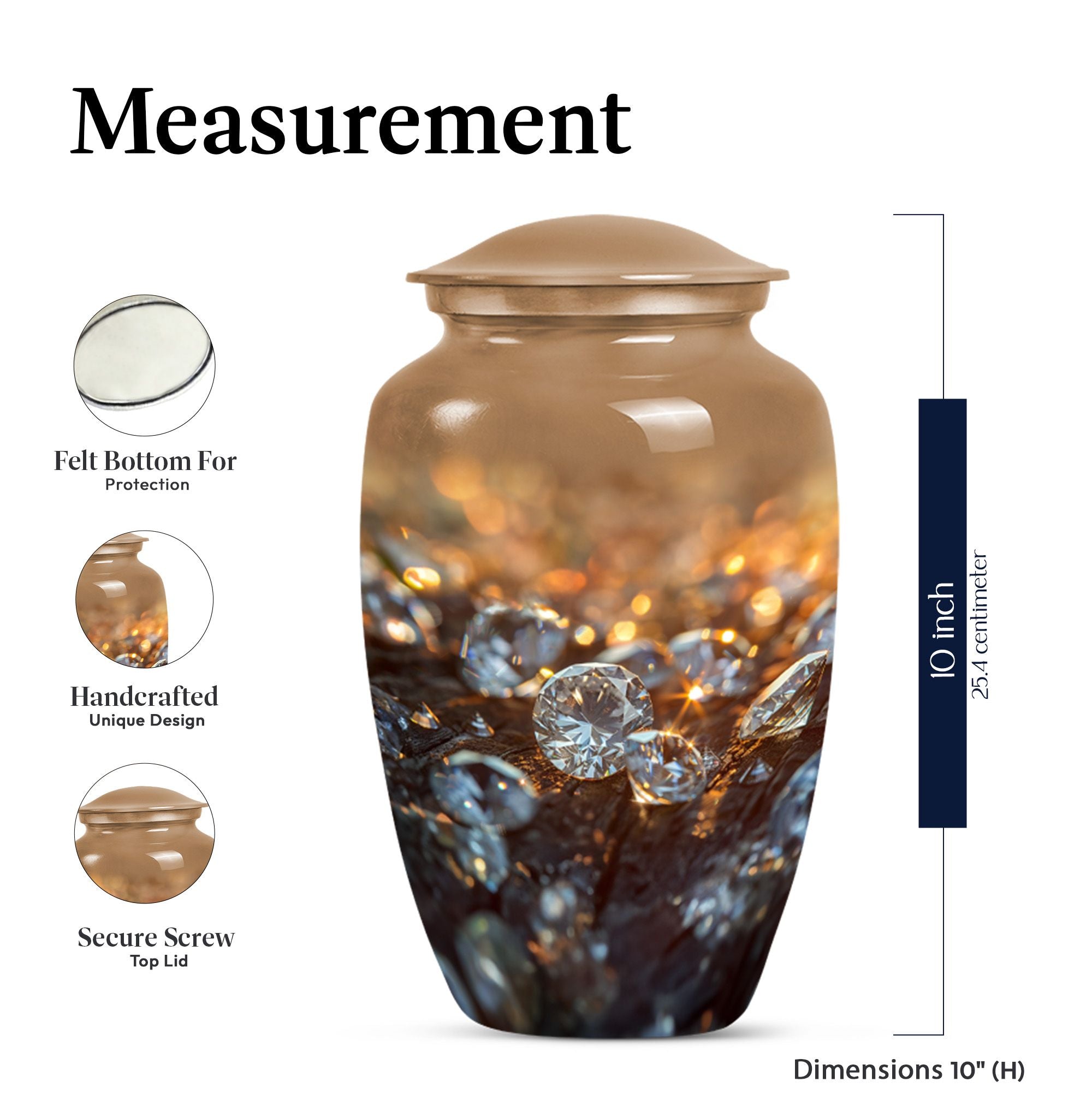Elevate your remembrance with this distinguished 10-inch Diamond Urn. Made from sturdy Aluminium, this Classic Urn boasts a weight of 3.3 pounds and a spacious capacity of 200 cubic inches. Its abstract theme powerfully conveys a sense of timeless respect and honor. The urn effortlessly falls into the large urns category, ideal for honoring adults and seniors with a respectable memorial tribute. Each urn is accompanied by a plush velvet pouch, ensuring secure containment of the precious contents. For a special touch, we offer personalization options with engraved names, allowing you to convey a unique memorial. This cremation urn, often identified as a funeral urn or memorial burial urn, signals a sign of rare reverence underscored by its superior quality and exquisite appearance. Whether it's for funeral burial or a transformation into a home memorial center, this urn supports heartfelt honors in a user-oriented approach.