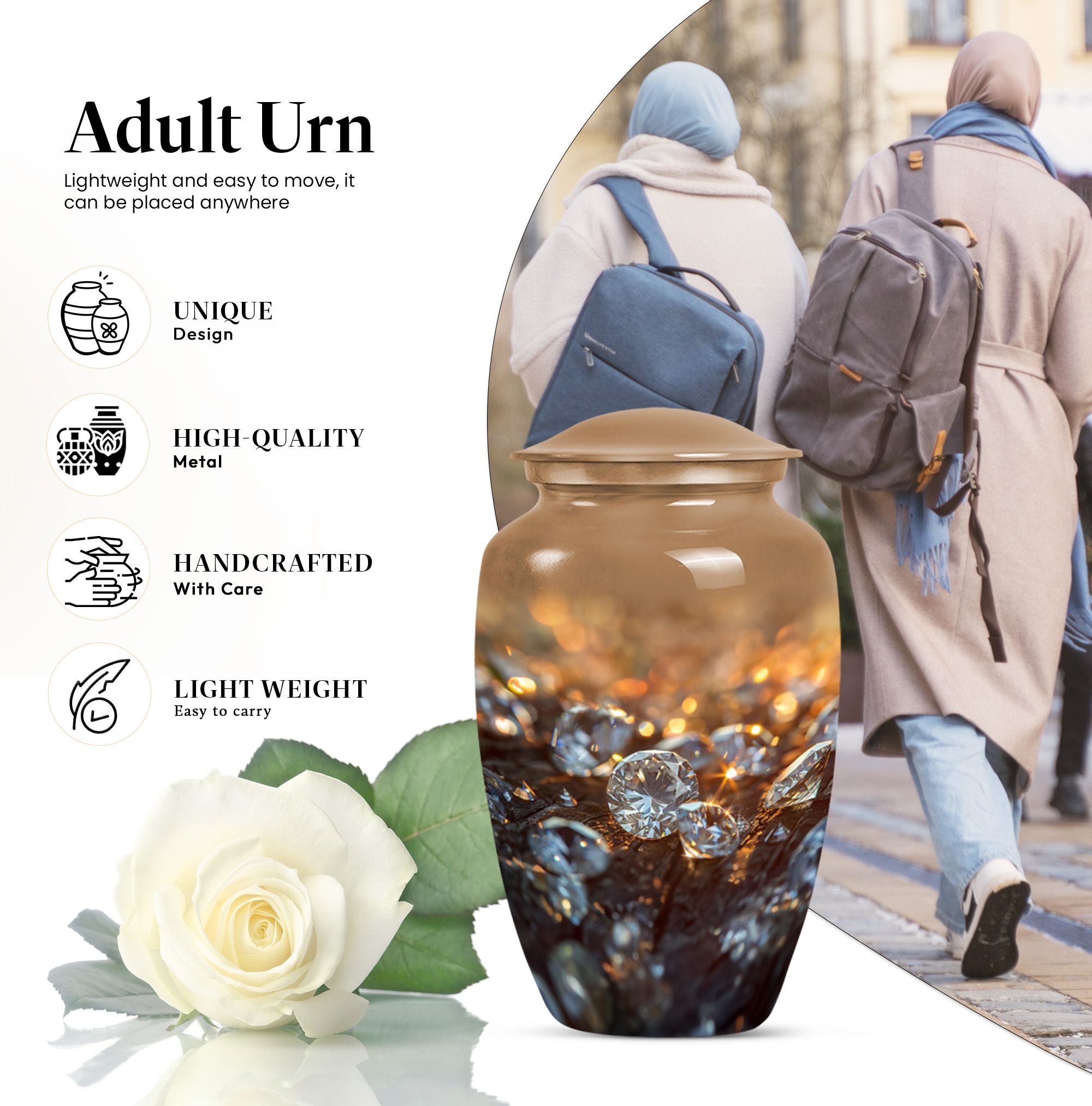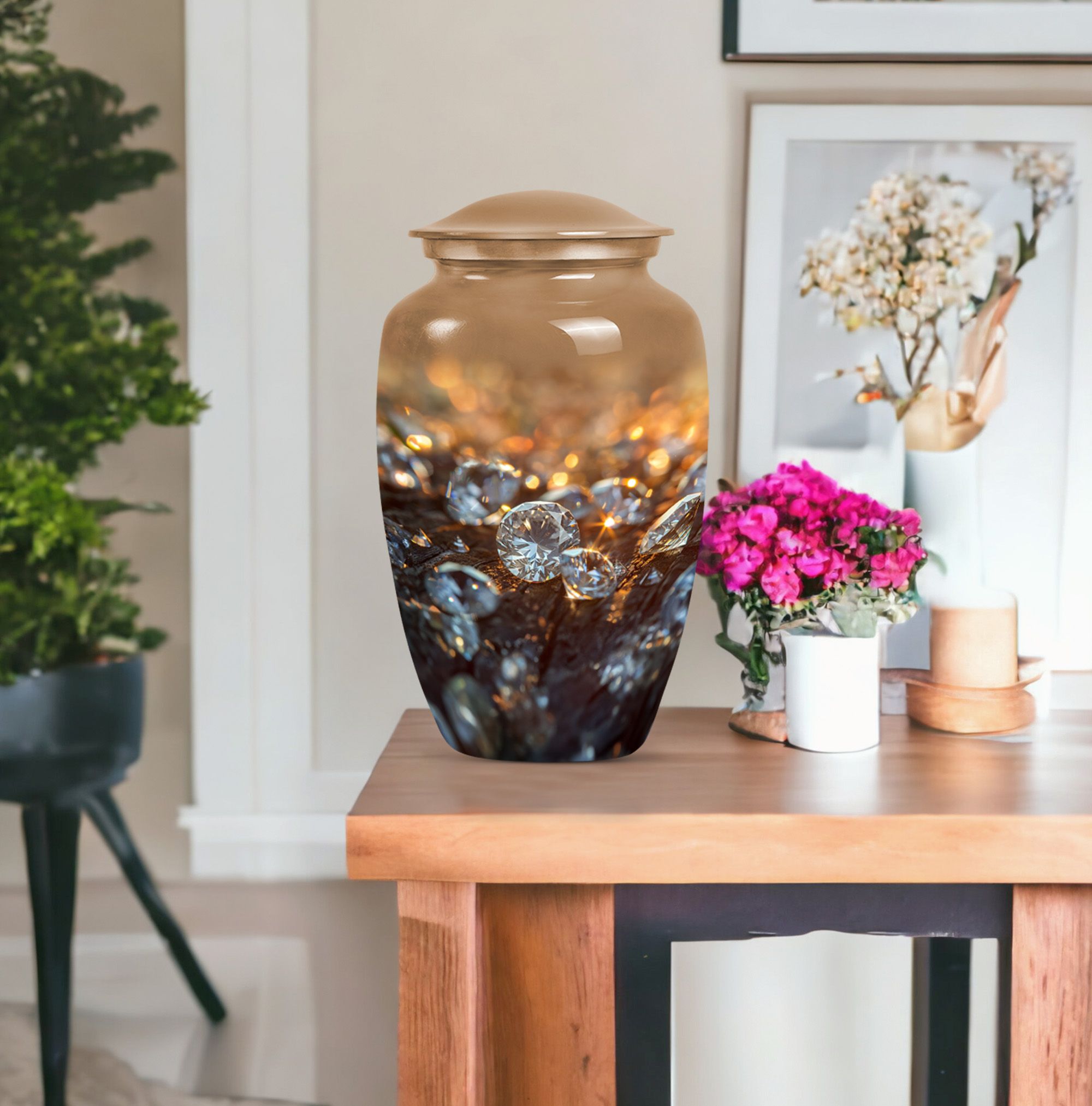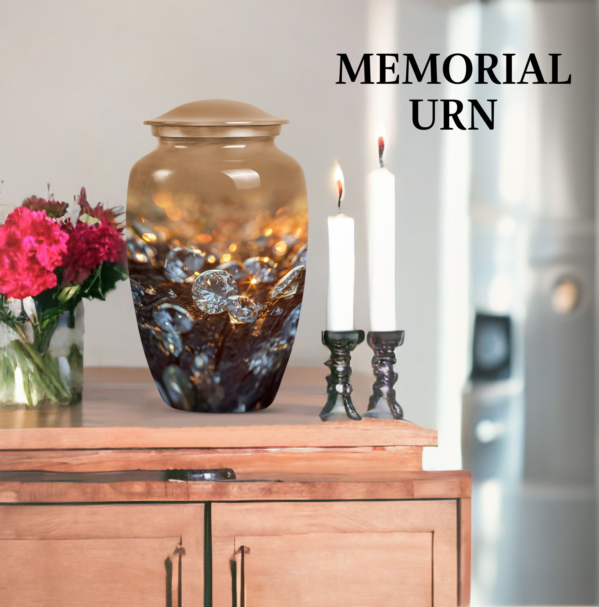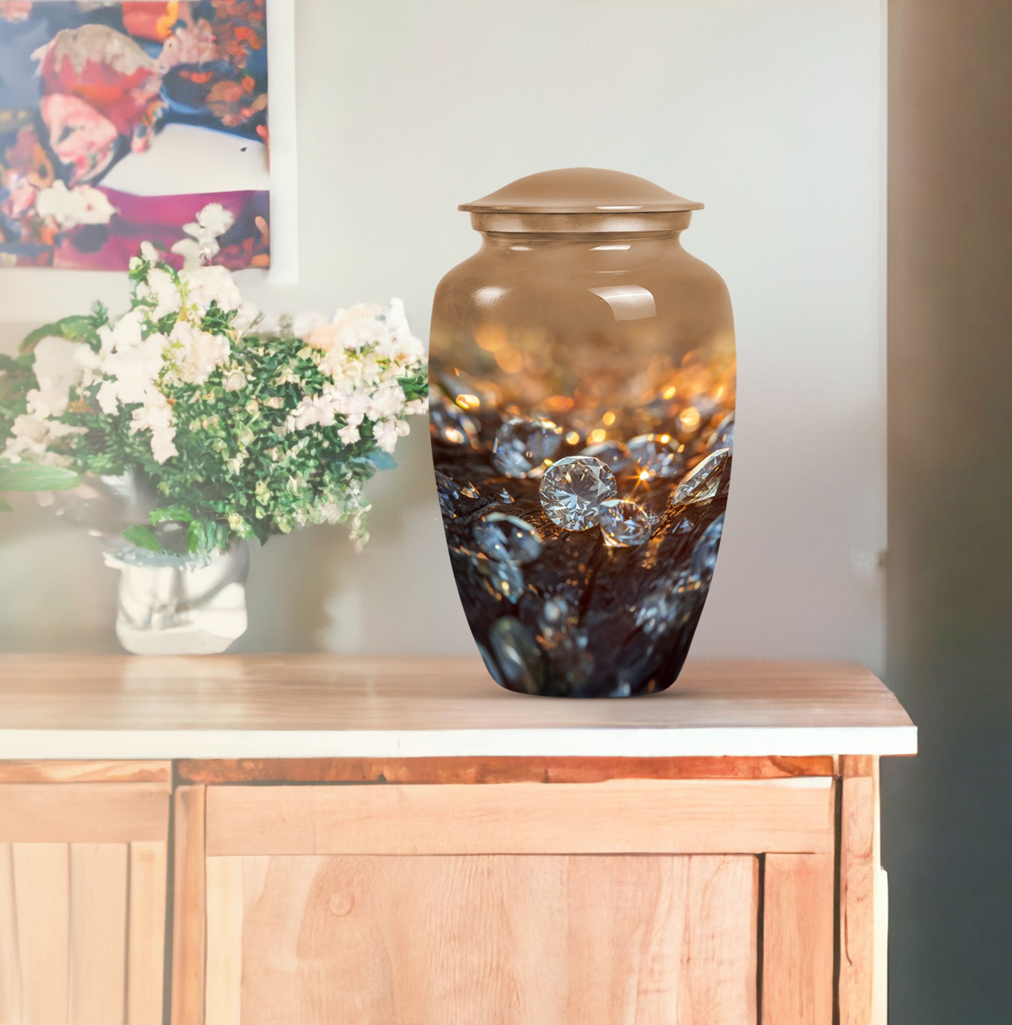 Elevate your remembrance with this distinguished 10-inch Diamond Urn. Made from sturdy Aluminium, this Classic Urn boasts a weight of 3.3 pounds and a spacious capacity of 200 cubic inches. Its abstract theme powerfully conveys a sense of timeless respect and honor. The urn effortlessly falls into the large urns category, ideal for honoring adults and seniors with a respectable memorial tribute. Each urn is accompanied by a plush velvet pouch, ensuring secure containment of the precious contents. For a special touch, we offer personalization options with engraved names, allowing you to convey a unique memorial. This cremation urn, often identified as a funeral urn or memorial burial urn, signals a sign of rare reverence underscored by its superior quality and exquisite appearance. Whether it's for funeral burial or a transformation into a home memorial center, this urn supports heartfelt honors in a user-oriented approach.