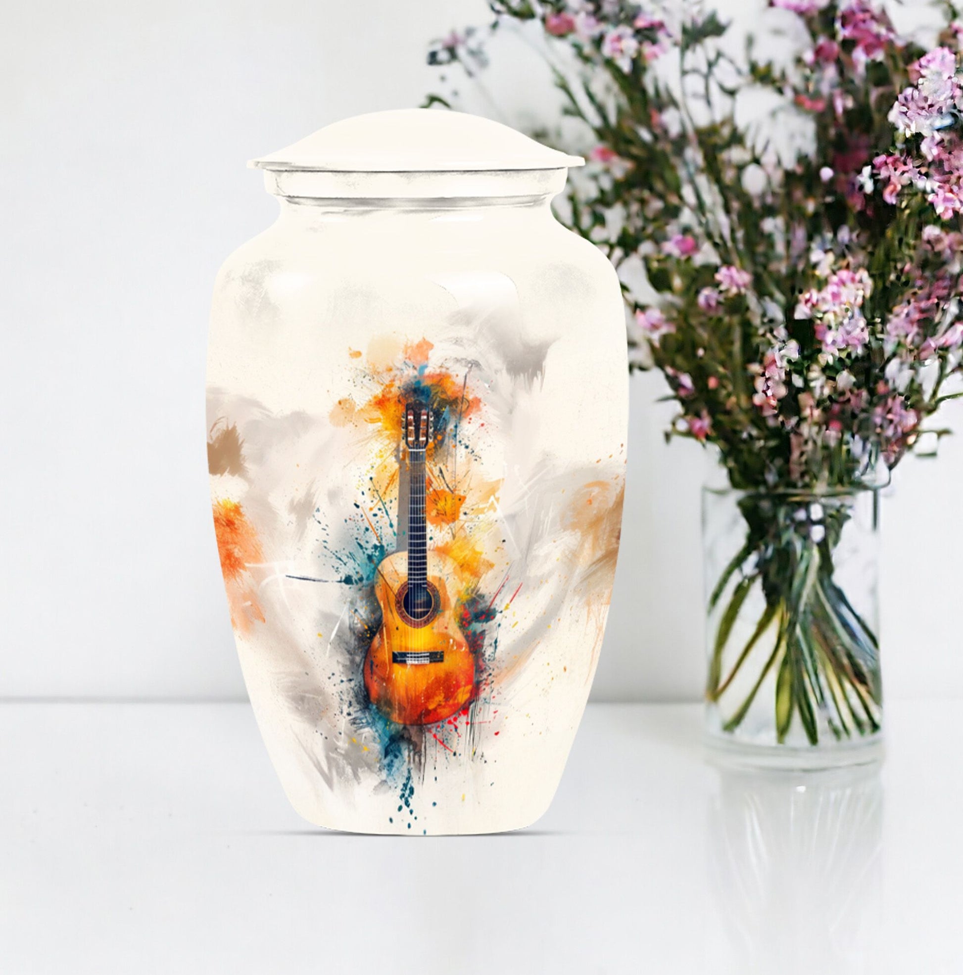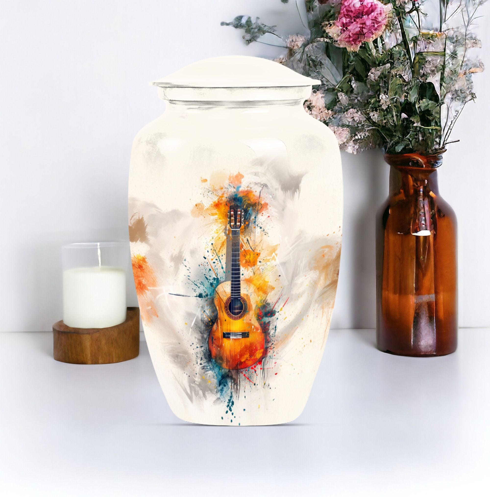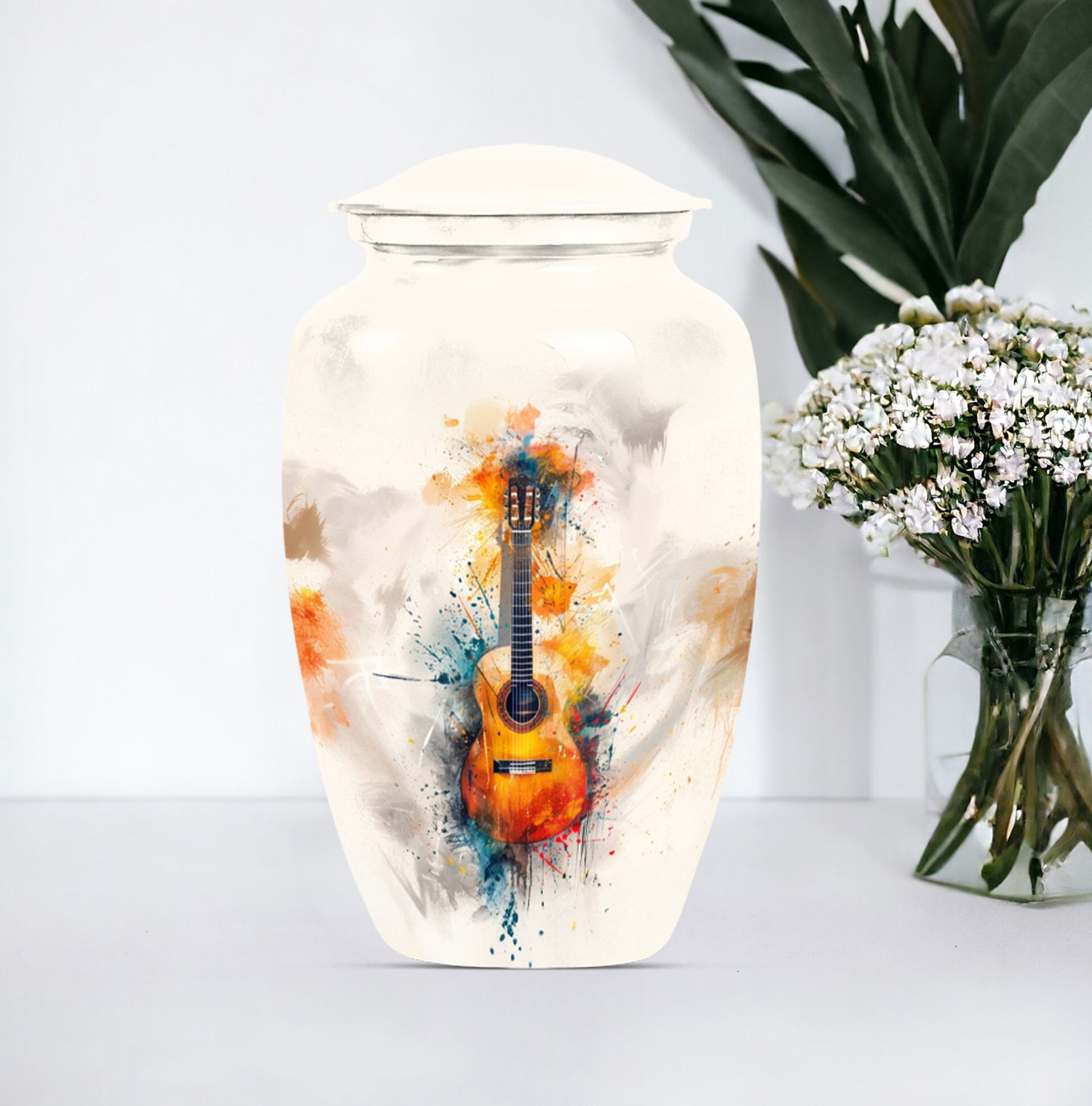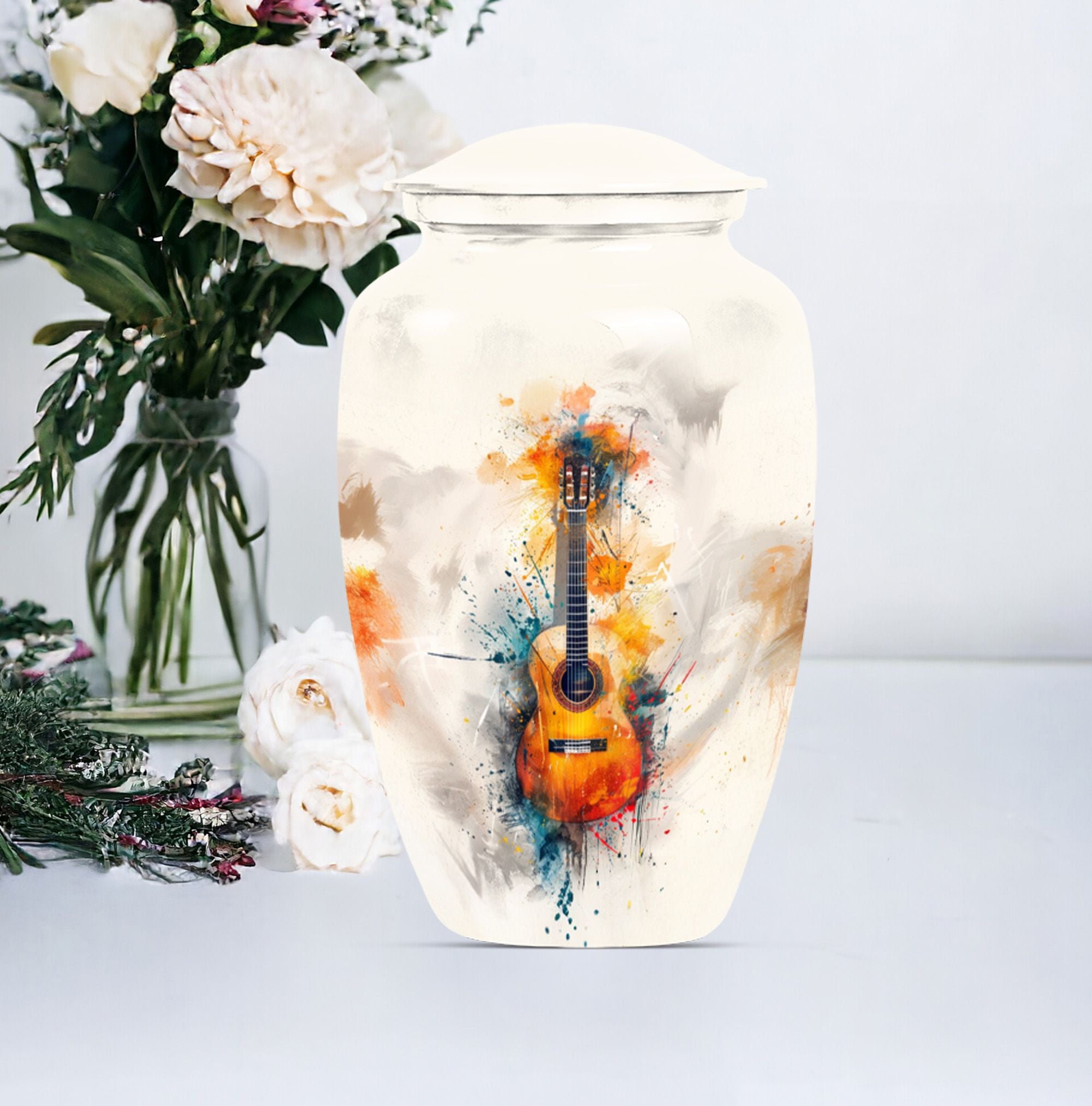 The Abstract-themed Guitar Urn brings a unique sense of solace and remembrance, nestling a touch of tranquility in its sound aesthetics. As a crucial implement in the category of Memorial Ceremony Supplies, this 10 Inch-sized large urn weighs 3.3 pounds with the capacity to accommodate 200 cubic inches of human ashes. The urn is made from the enduring Aluminium material expertly shaped into a Classic Urn structure. The package includes a velvet pouch, ensuring respectful containment of the ashes. Personalization options are available, allowing you to imprint engraved names, embellishing the urn with the indelible mark of memory. Keywords you might find useful for finding this product are 'Guitar Urn', 'funeral adult urns for human ashes', 'memorial urns', 'Memorial forever urns', 'urns for mom', 'funeral urns for ashes' and 'urn human women'. Ideal for adults and seniors looking for a dignified yet artistic way to treasure their dear departed.