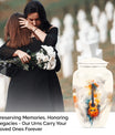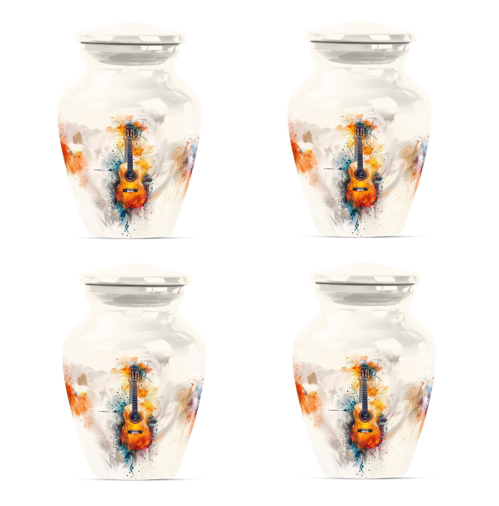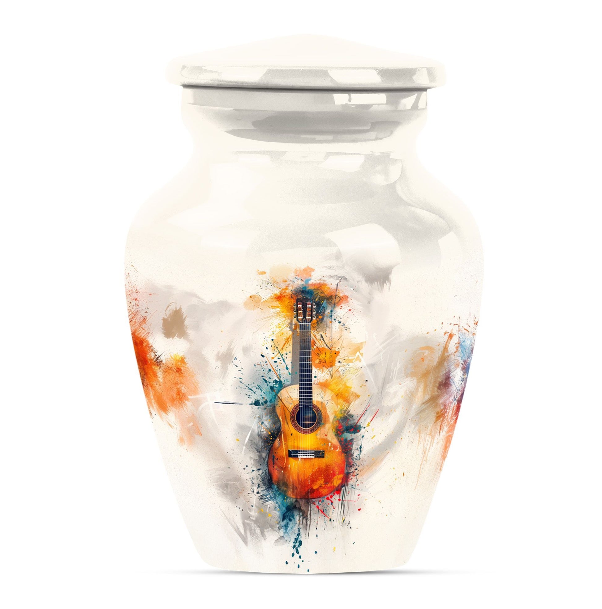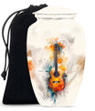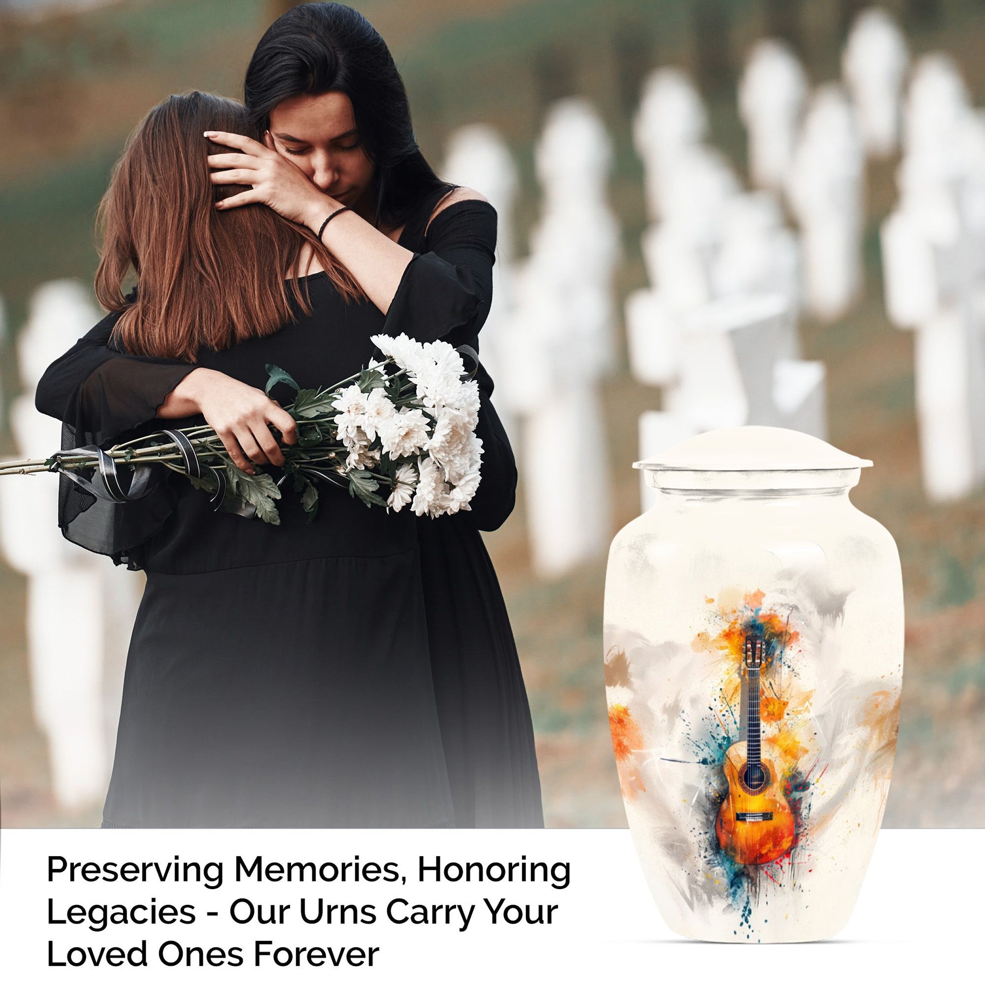 The Abstract-themed Guitar Urn brings a unique sense of solace and remembrance, nestling a touch of tranquility in its sound aesthetics. As a crucial implement in the category of Memorial Ceremony Supplies, this 10 Inch-sized large urn weighs 3.3 pounds with the capacity to accommodate 200 cubic inches of human ashes. The urn is made from the enduring Aluminium material expertly shaped into a Classic Urn structure. The package includes a velvet pouch, ensuring respectful containment of the ashes. Personalization options are available, allowing you to imprint engraved names, embellishing the urn with the indelible mark of memory. Keywords you might find useful for finding this product are 'Guitar Urn', 'funeral adult urns for human ashes', 'memorial urns', 'Memorial forever urns', 'urns for mom', 'funeral urns for ashes' and 'urn human women'. Ideal for adults and seniors looking for a dignified yet artistic way to treasure their dear departed.