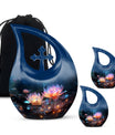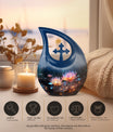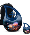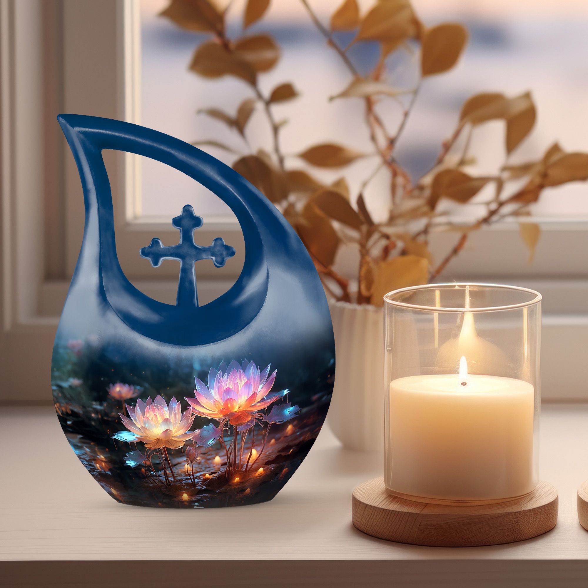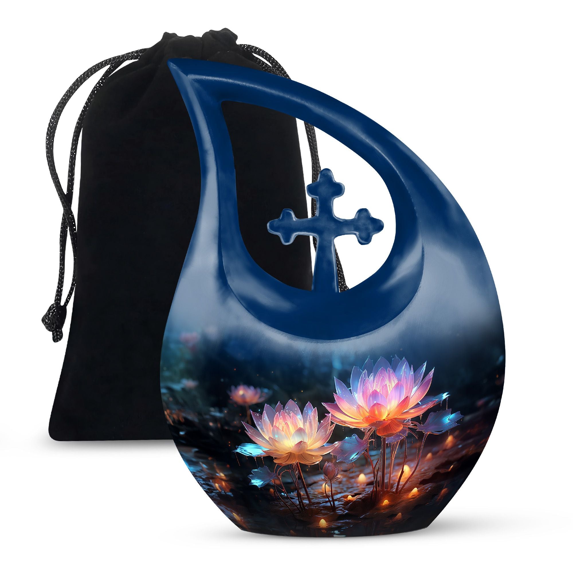 Celebrate a life of love, light, and faith with our Blue Teardrop Cremation Urn for Human Ashes, adorned with a Glowing Lotus Flower and Cross design. This graceful urn embodies peace and rebirth — the lotus symbolizing purity and the cross reflecting eternal faith. Perfect as a large urn for ashes adult male or a radiant memorial for women, it offers a deeply meaningful way to honor a cherished soul.
