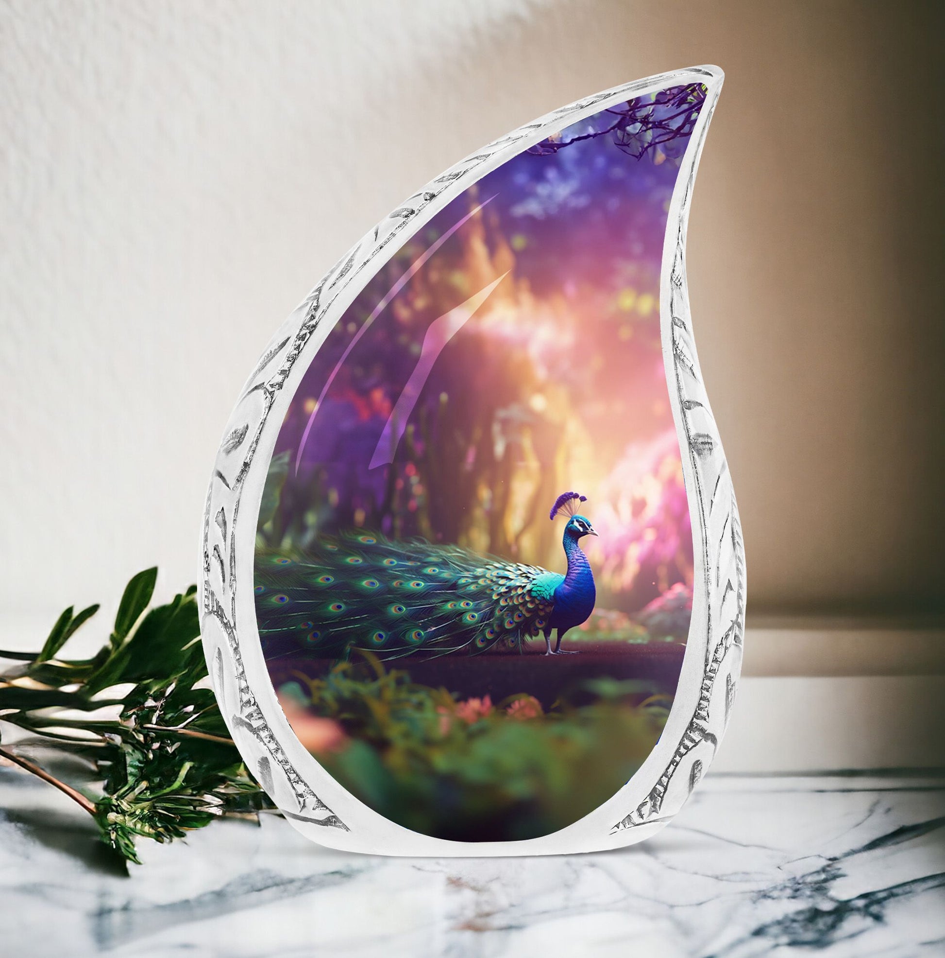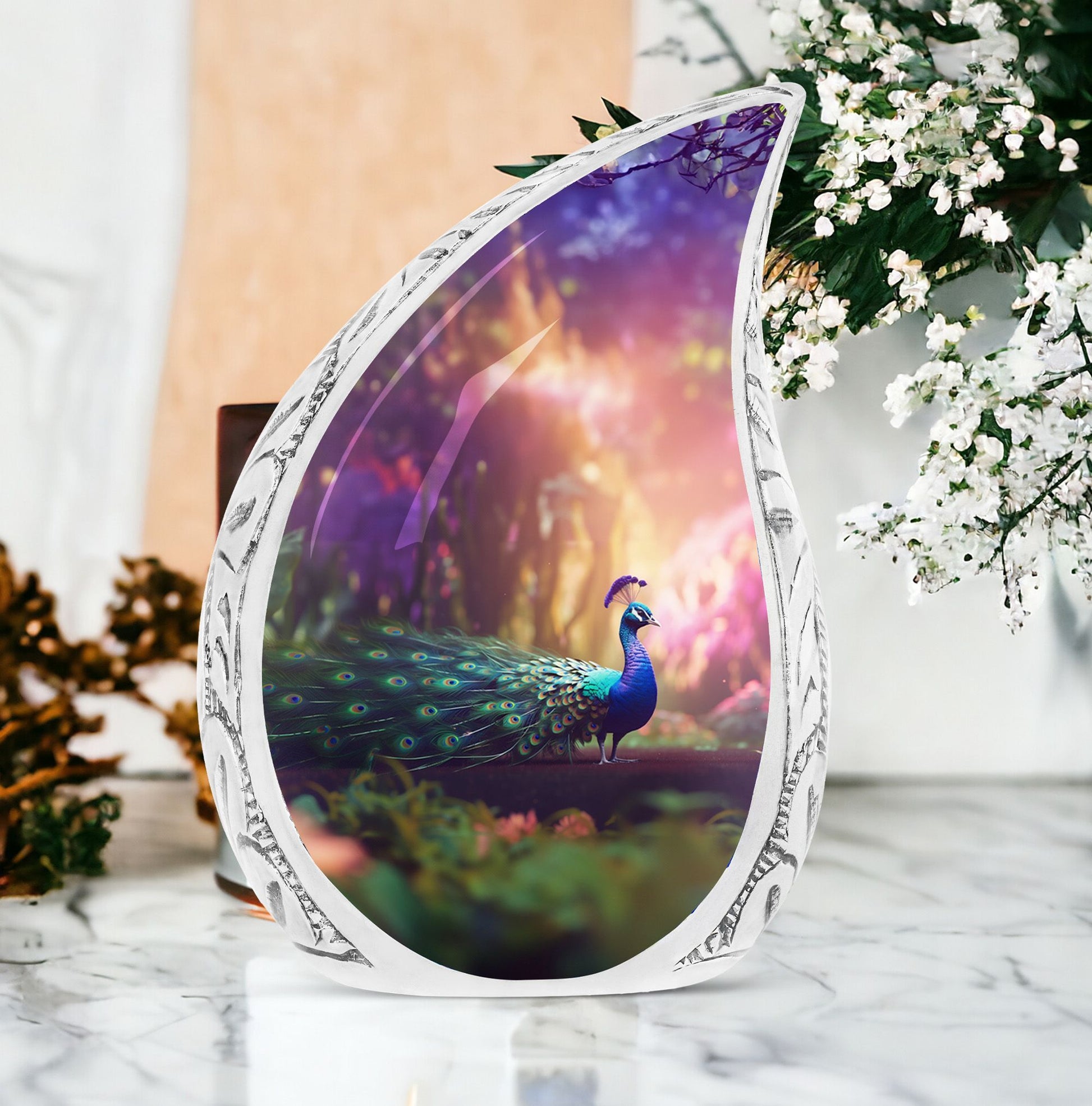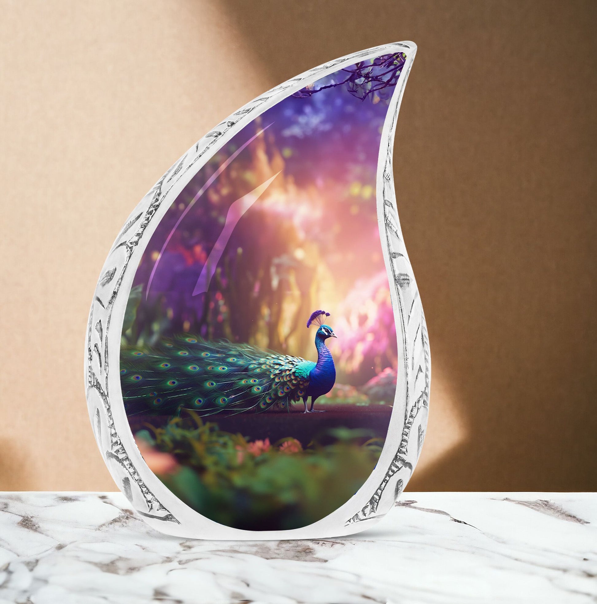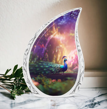 Discover our tastefully designed Peacock Urns for Ashes, an elegant solution for home memorial ceremonies. Specially crafted for adults and seniors, these Large Urns are meticulously molded from premium aluminium, adding a timeless appeal to the 3 Inch decor piece. Weighing a sturdy 3.3 pounds and standing at 10 inches tall, this Adult Urn features a tremendous capacity of 200 cubic inches, offering a sacred compartment for your cherished one's remains. The urn comes included with a velvet pouch that efficiently secures the precious Ashes with dignity and respect. Its Classic Urn style offers a distinguished way to pay tribute to your loved ones. What’s more unique is your opportunity to customize this beautiful piece with engraved names, making this urn the perfect, personalized memorial item.