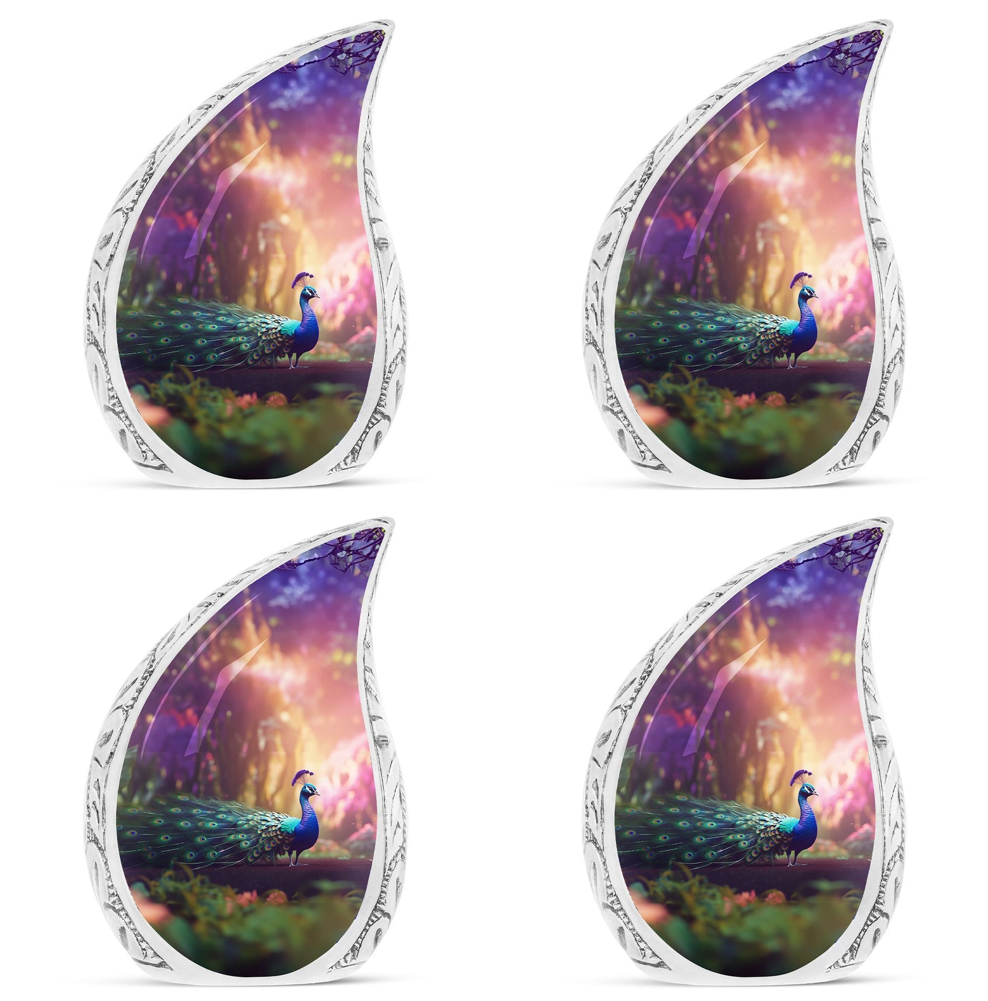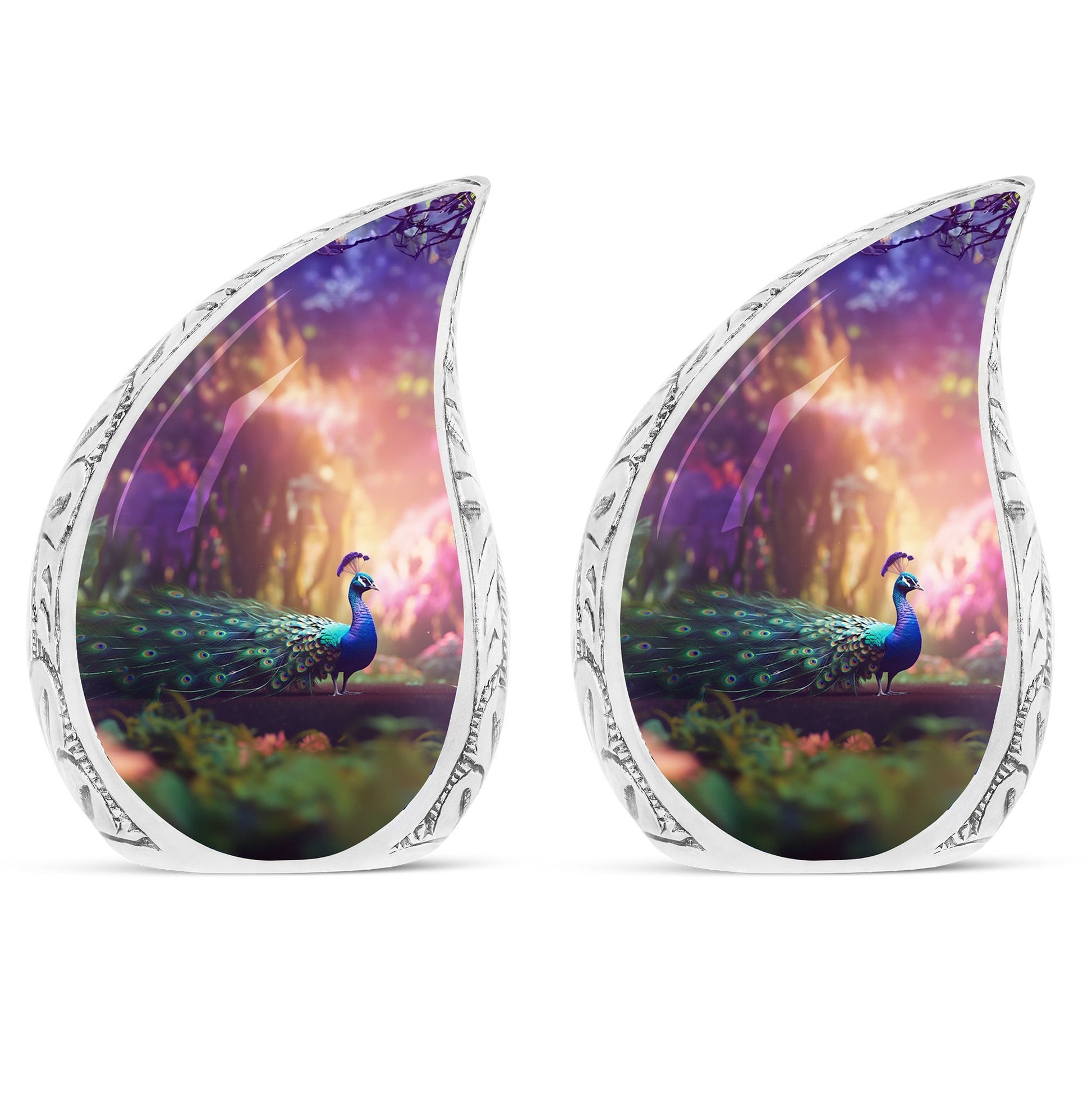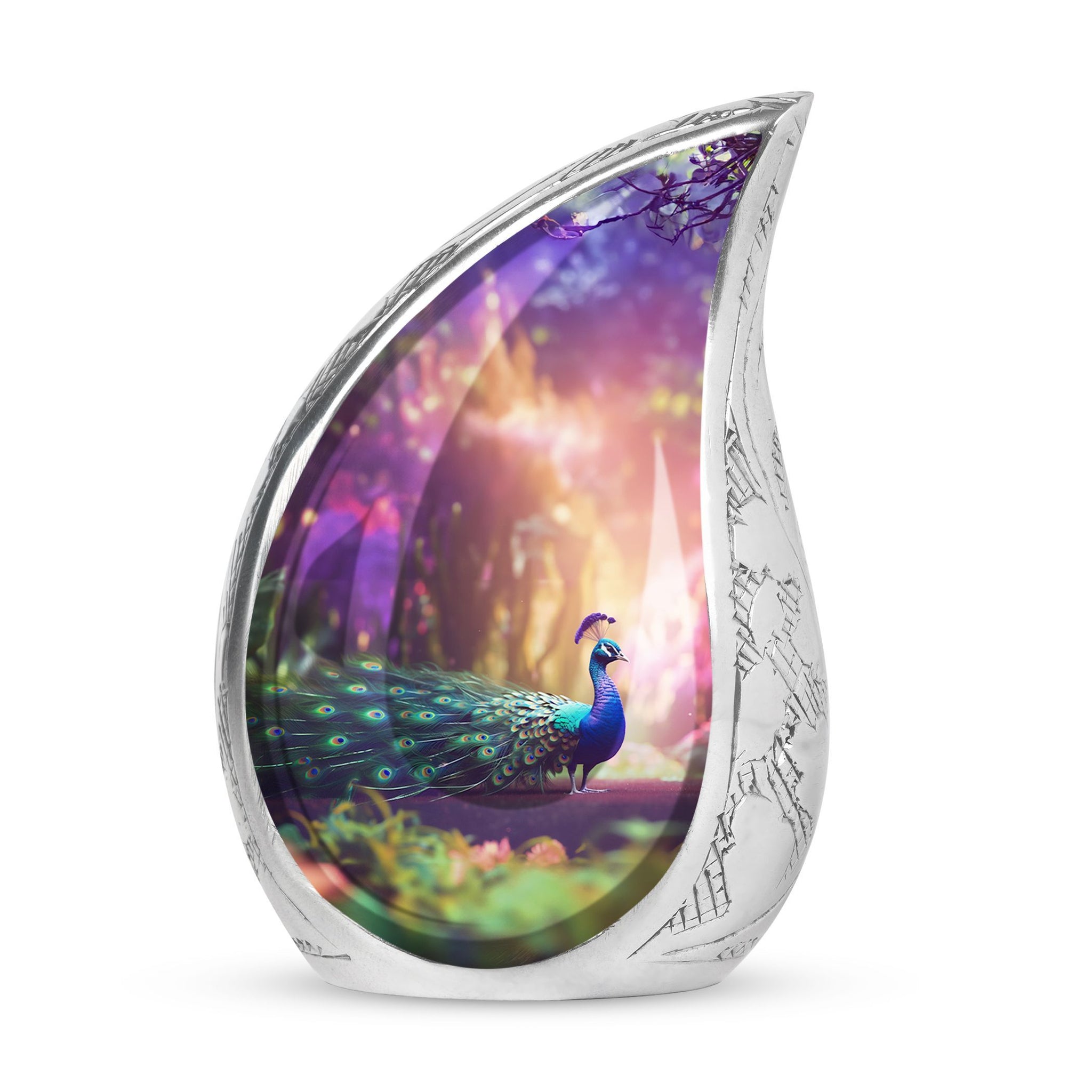 Discover our tastefully designed Peacock Urns for Ashes, an elegant solution for home memorial ceremonies. Specially crafted for adults and seniors, these Large Urns are meticulously molded from premium aluminium, adding a timeless appeal to the 3 Inch decor piece. Weighing a sturdy 3.3 pounds and standing at 10 inches tall, this Adult Urn features a tremendous capacity of 200 cubic inches, offering a sacred compartment for your cherished one's remains. The urn comes included with a velvet pouch that efficiently secures the precious Ashes with dignity and respect. Its Classic Urn style offers a distinguished way to pay tribute to your loved ones. What’s more unique is your opportunity to customize this beautiful piece with engraved names, making this urn the perfect, personalized memorial item.