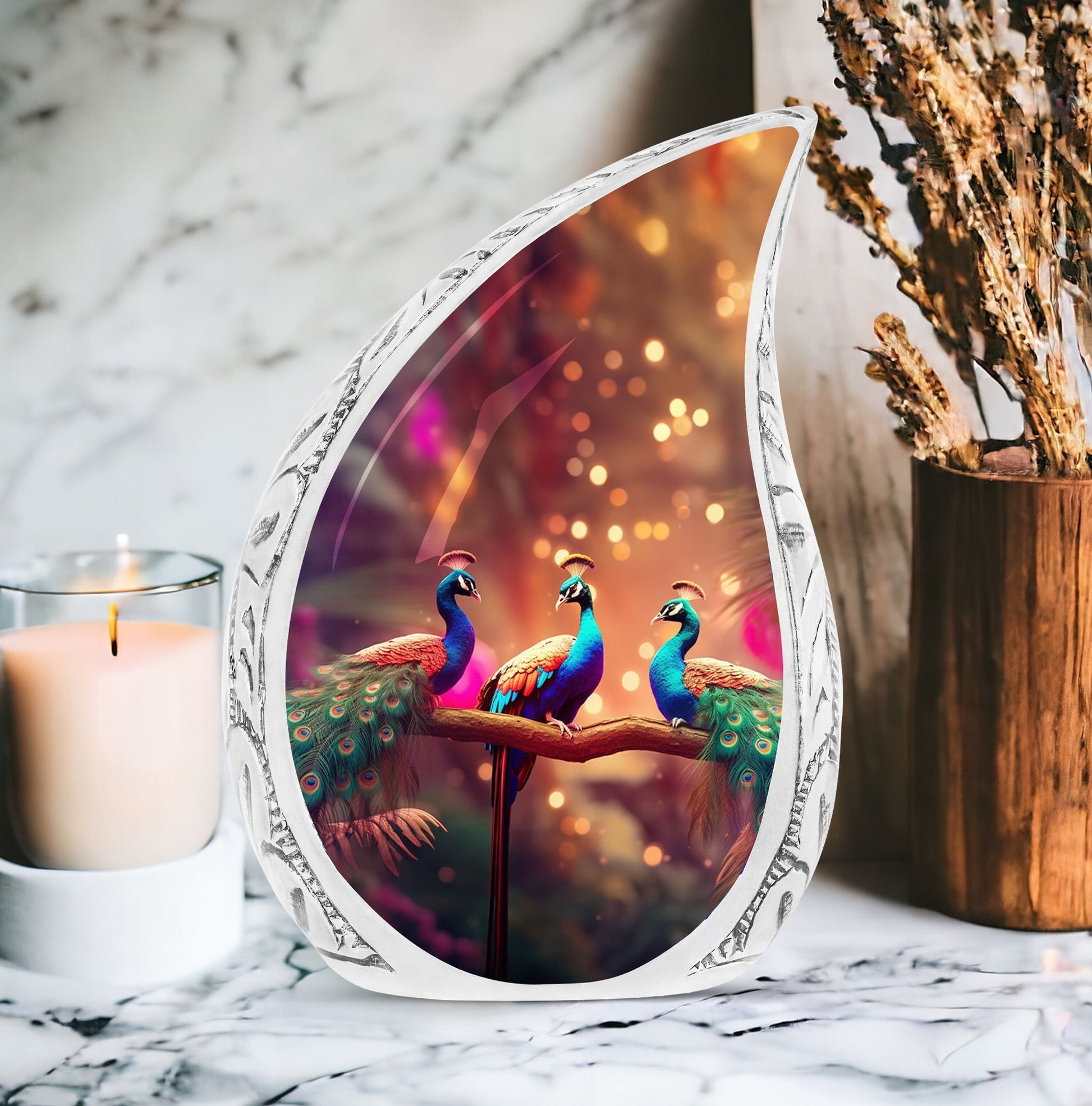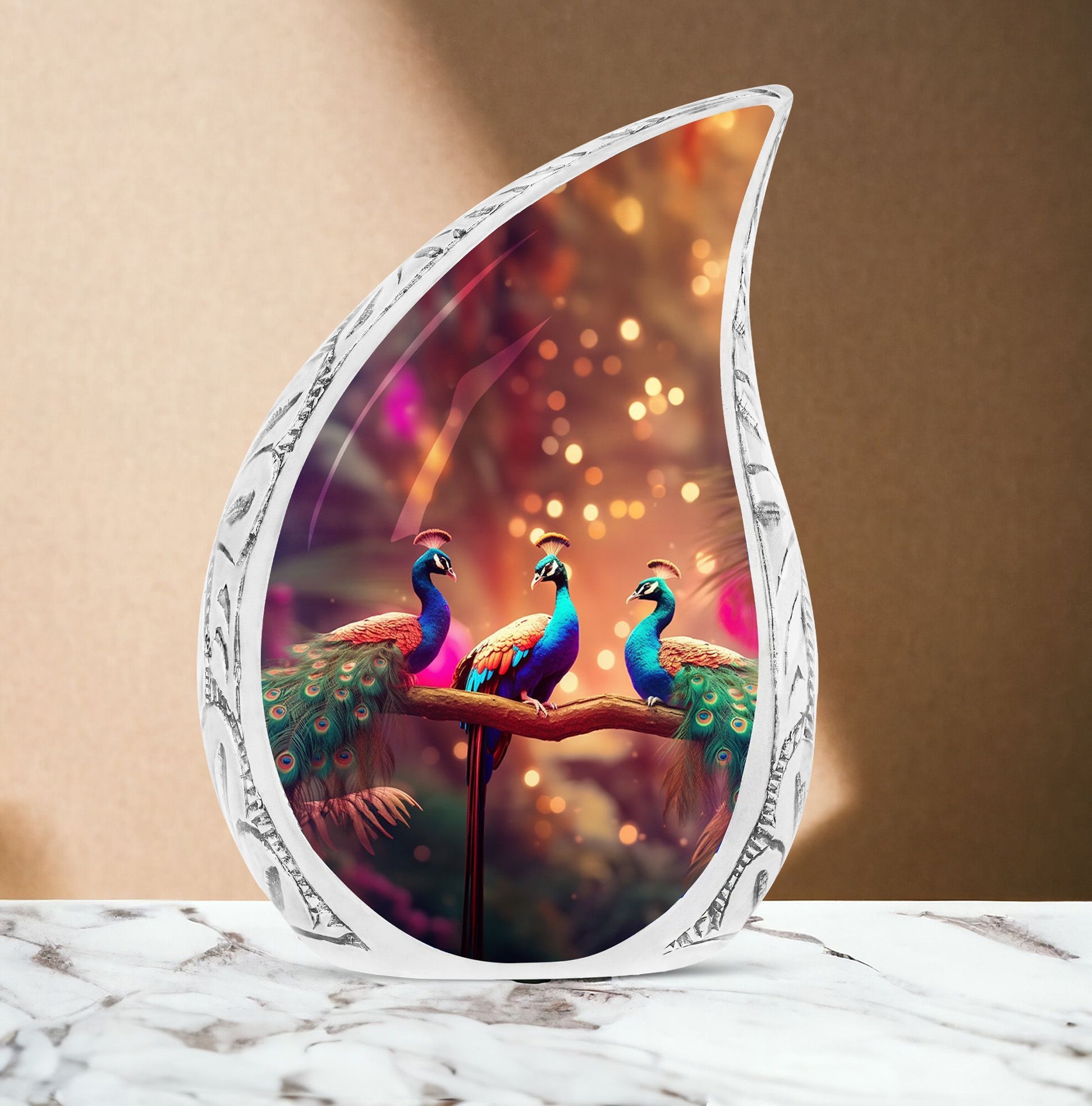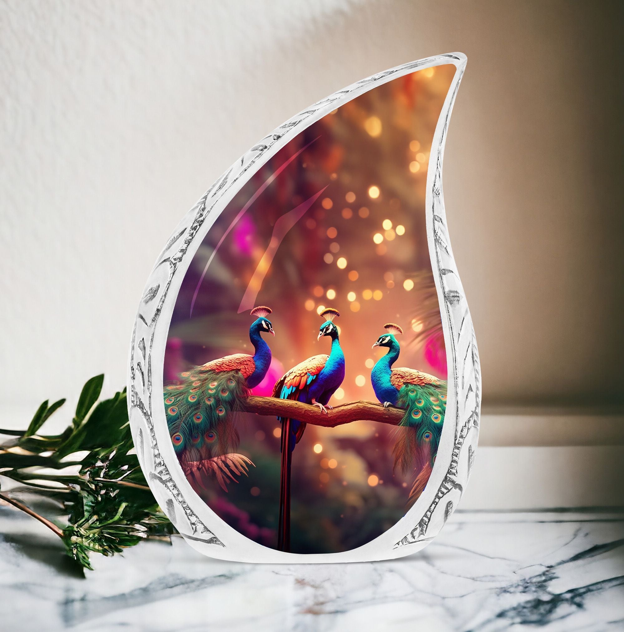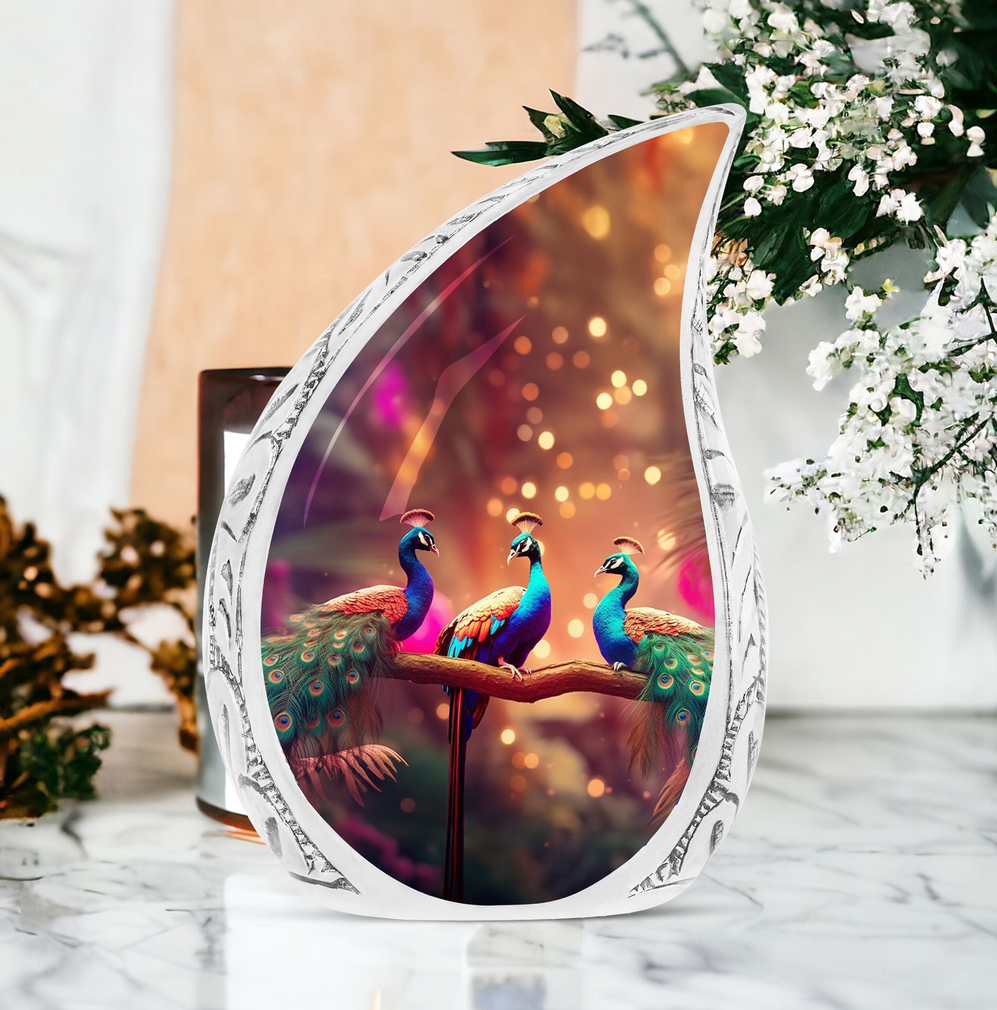 Preserve precious memories with the elegant Peacock Cremation Urn. A remarkable memento in the memorial ceremony supplies category, this 3-inch urn is the perfect size to honour the memory of a loved one. Crafted from durable aluminium, it's both beautiful and built to last, ensuring a timeless tribute that holds up to 200 cubic inches of cremation ashes. Weighing a solid 3.3 pounds and standing 10 inches in height, it provides a substantial, tangible reminder of years shared and love experienced. Each Peacock Cremation Urn comes with a velvet pouch for containment of ashes, providing secure storage and a tasteful display option, ideal for large urn users. To truly make the urn your own, there is an option to customize it with engraved names, adding a personal touch that will keep your connection with the departed alive. Whether you're seeking urns for cremated remains, urns for Mom's ashes or burial urns for human ashes, our Peacock Cremation Urn is a classic choice that will stand the test of time.