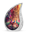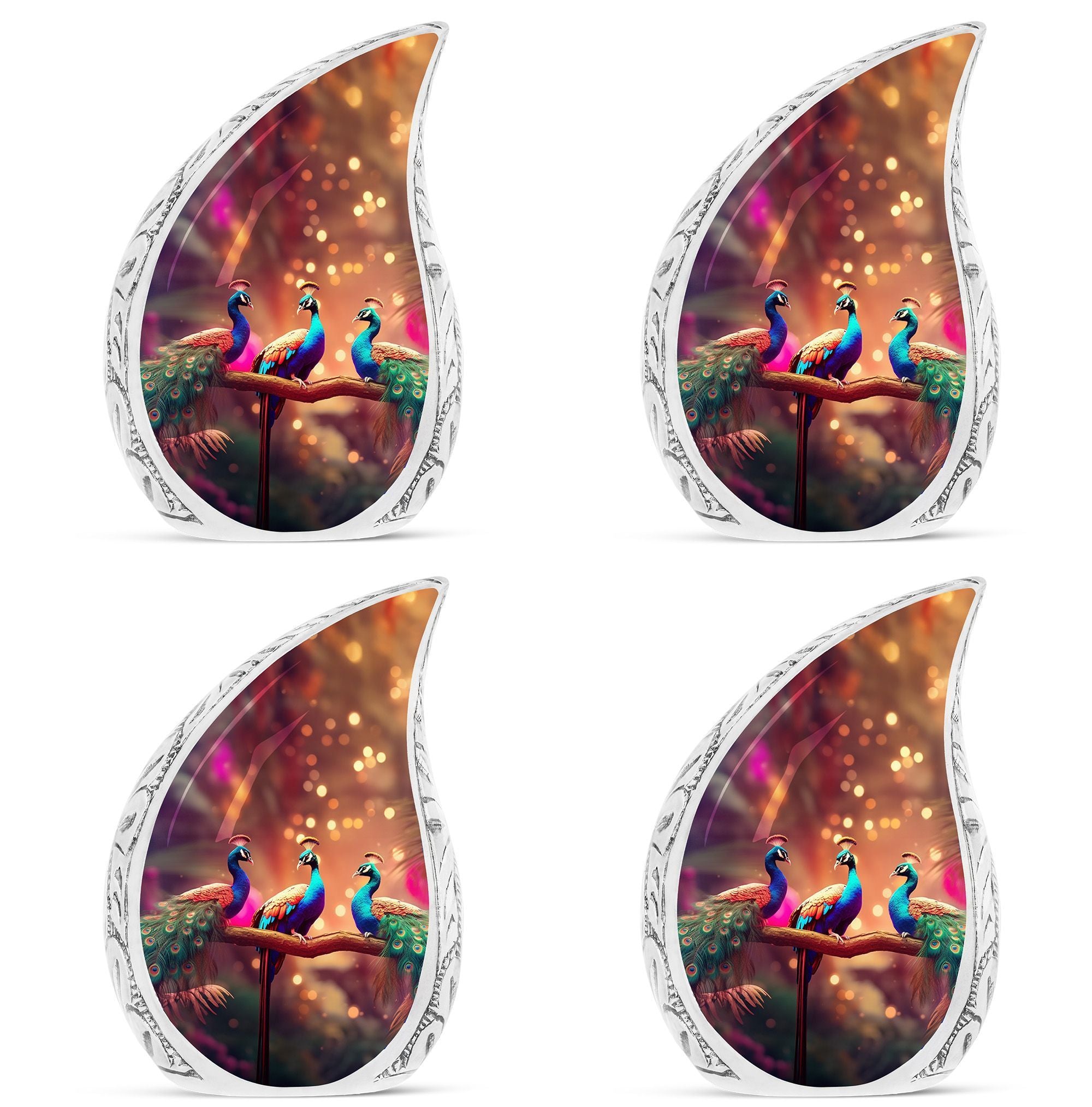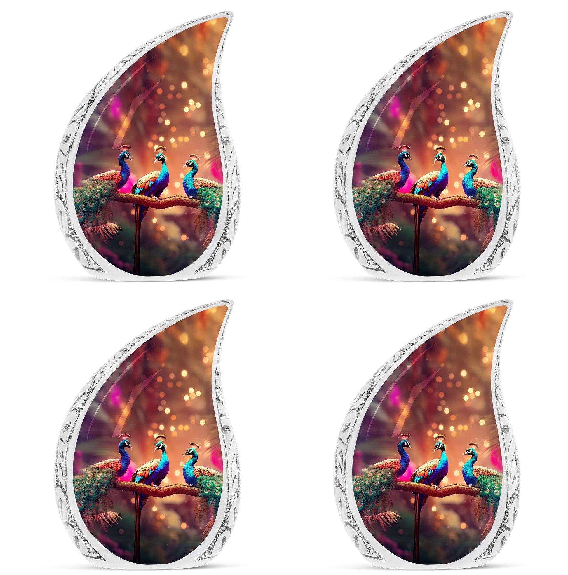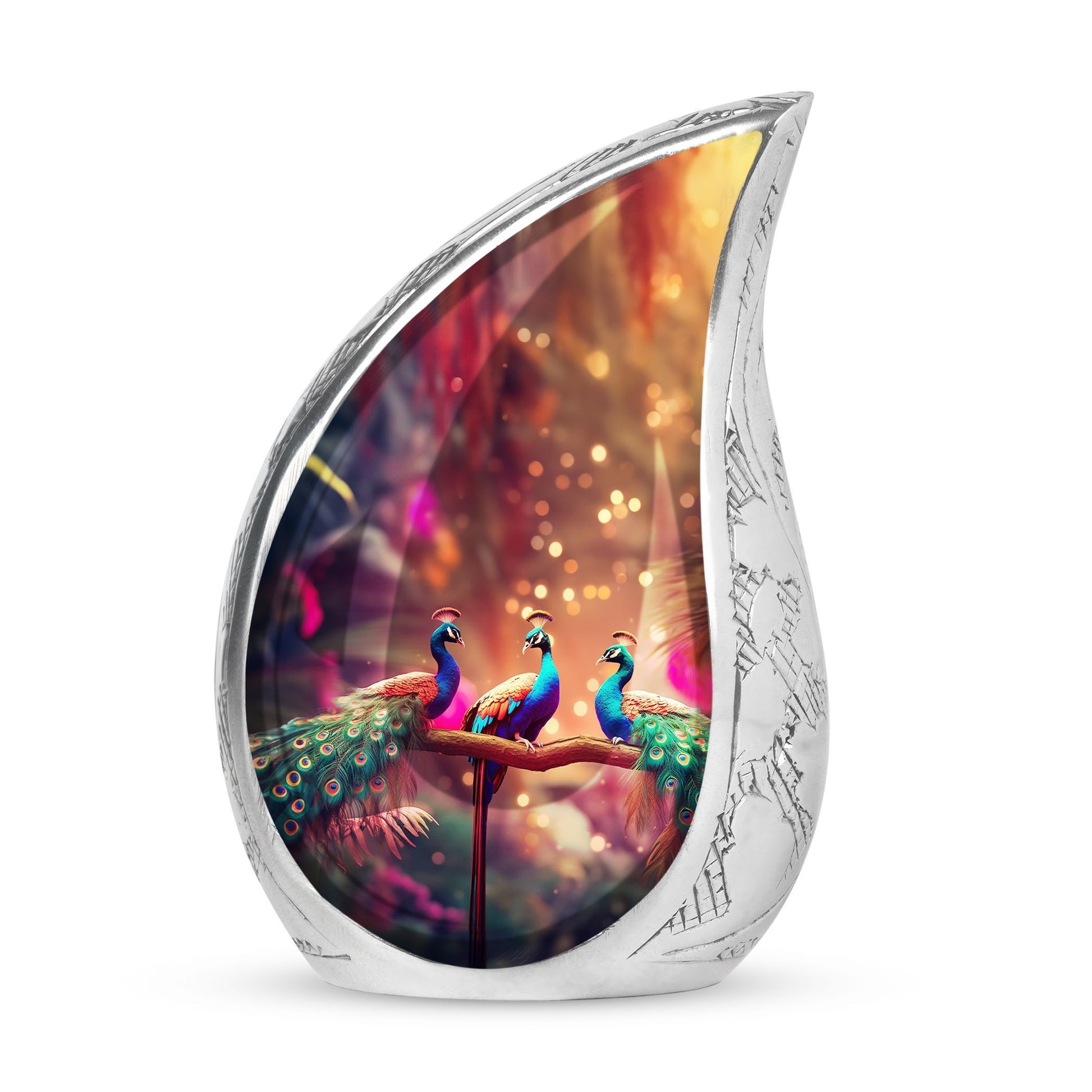 Preserve precious memories with the elegant Peacock Cremation Urn. A remarkable memento in the memorial ceremony supplies category, this 3-inch urn is the perfect size to honour the memory of a loved one. Crafted from durable aluminium, it's both beautiful and built to last, ensuring a timeless tribute that holds up to 200 cubic inches of cremation ashes. Weighing a solid 3.3 pounds and standing 10 inches in height, it provides a substantial, tangible reminder of years shared and love experienced. Each Peacock Cremation Urn comes with a velvet pouch for containment of ashes, providing secure storage and a tasteful display option, ideal for large urn users. To truly make the urn your own, there is an option to customize it with engraved names, adding a personal touch that will keep your connection with the departed alive. Whether you're seeking urns for cremated remains, urns for Mom's ashes or burial urns for human ashes, our Peacock Cremation Urn is a classic choice that will stand the test of time.