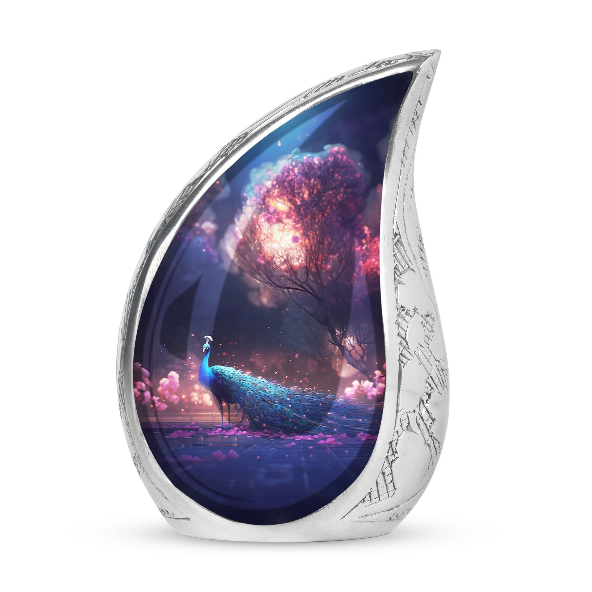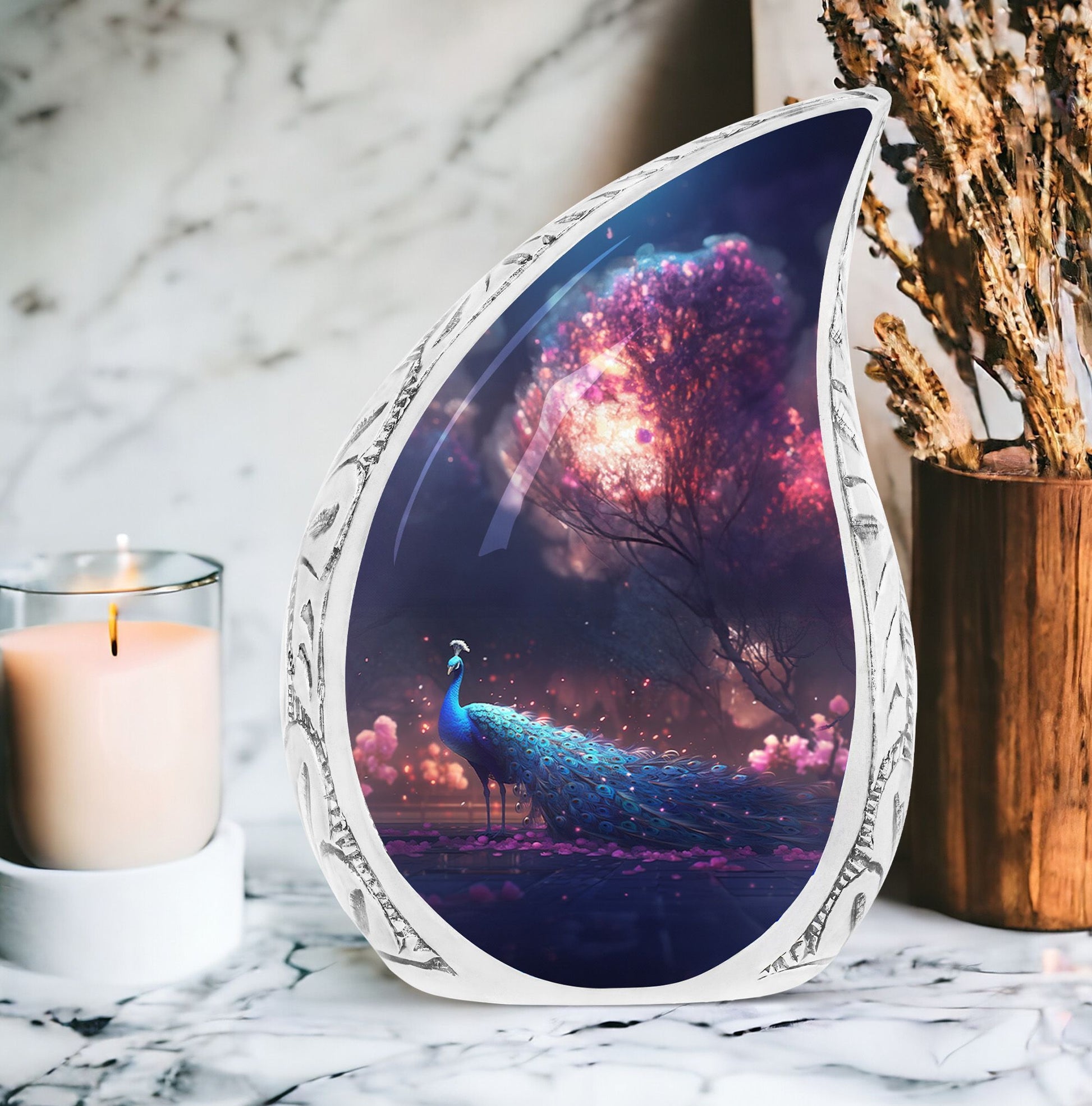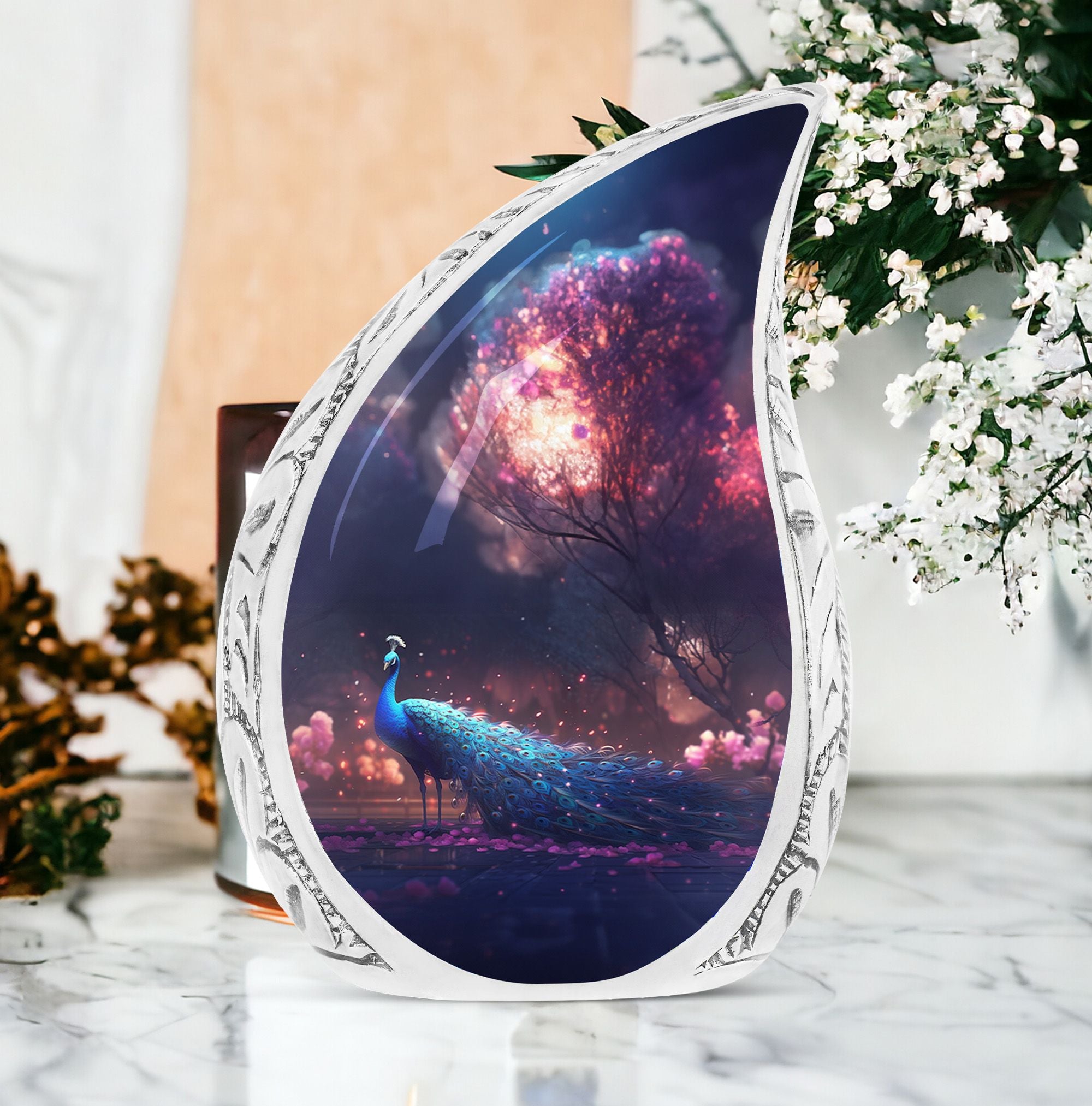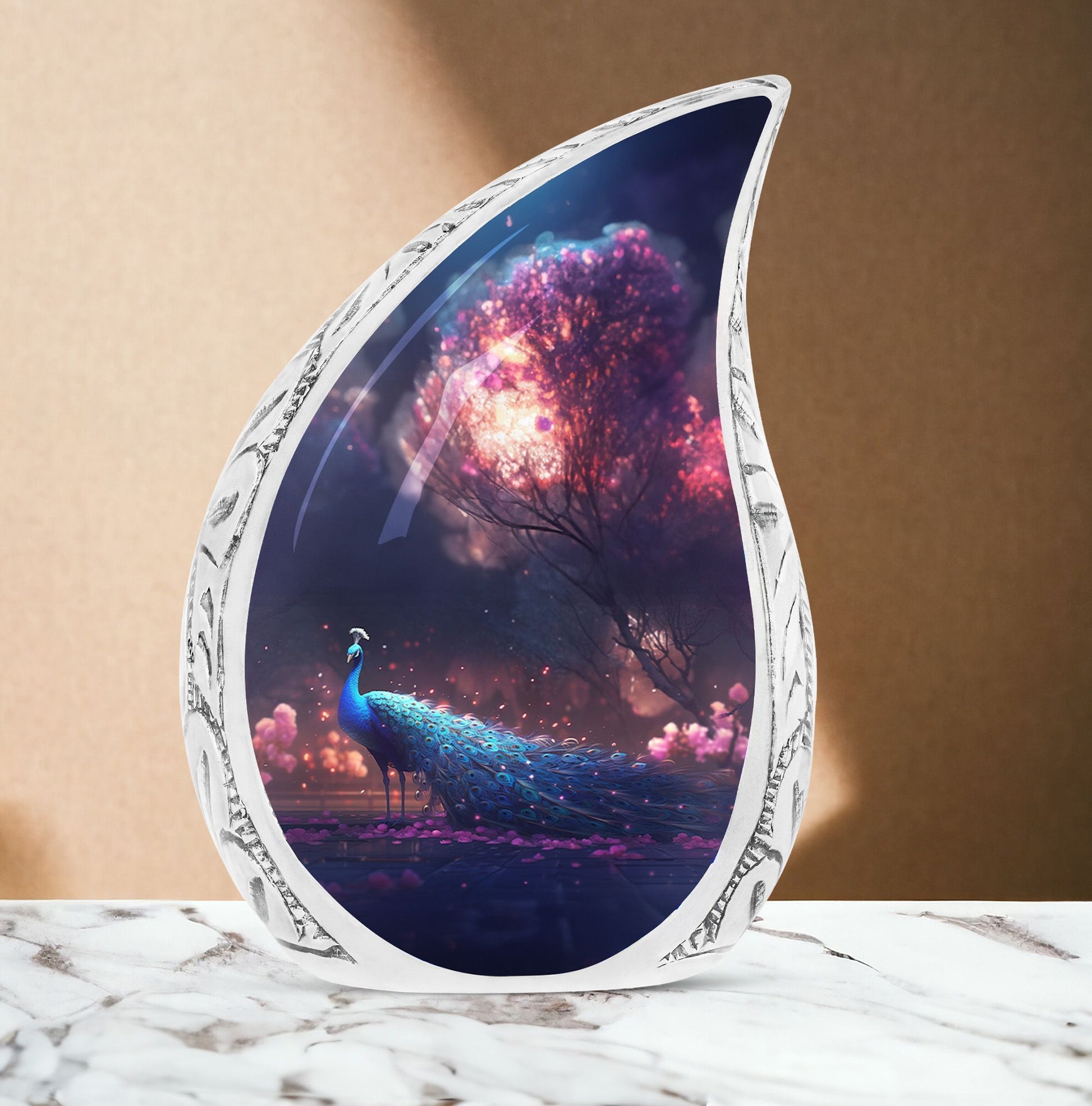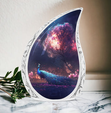 There's a touch of serenity and elegance interwoven in the Peacock Cremation Urn. For those in the market for large urns that feel as substantial as they look, our 3 Inch Classic Urn is an impeccable choice. The comfortingly sturdy weight of 3.3 pounds indicates the quality of its aluminium construction. Standing tall at an impressive 10 inches in height, it exhibits a capacity of 200 cubic inches, capable of delicately preserving the sentiment and reverence of your cherished loved one. A special feature of our urns is the ability to customize with engraved names, adding a personal note to this already unique tribute piece. Each purchase comes with a velvet pouch for containment of ashes, further highlighting our dedication to honor and longevity. These funeral ashes containers effortlessly blend the traditional appeal with modern aesthetics making them highly desirable urns for Mom and other loved ones. Ideal for those seeking quality metal urns for human ashes, these uniquely personalized and customized cremation urns provide a comforting presence during times of sorrow.