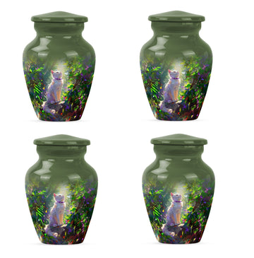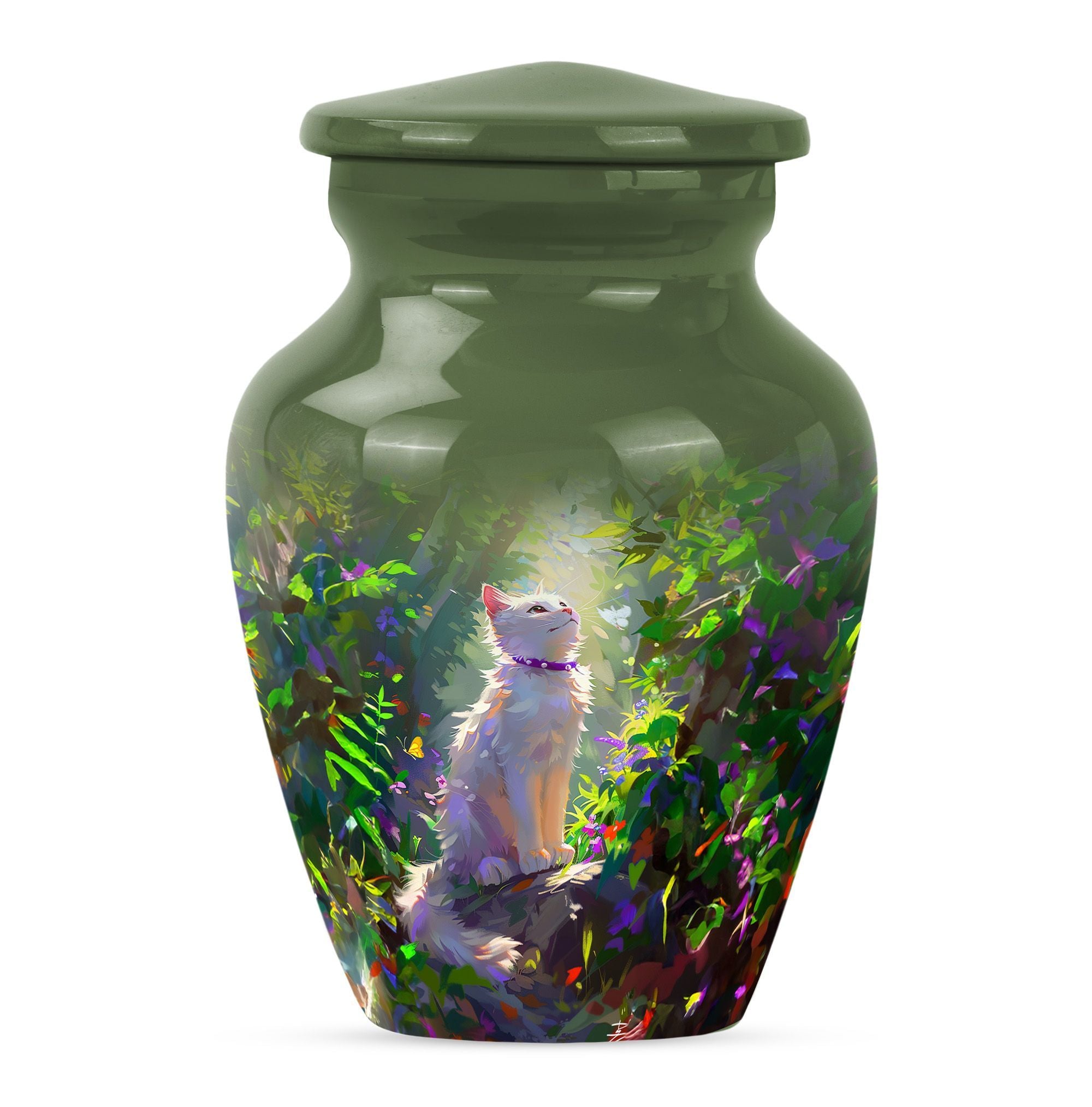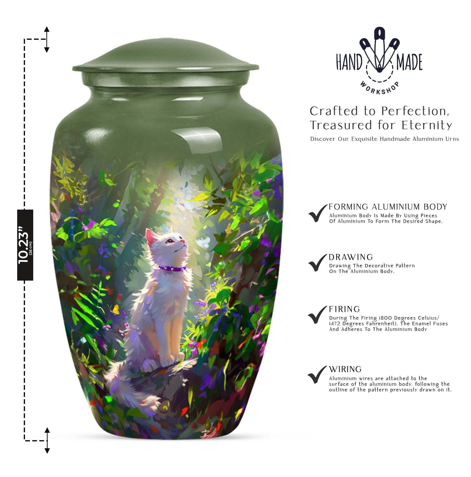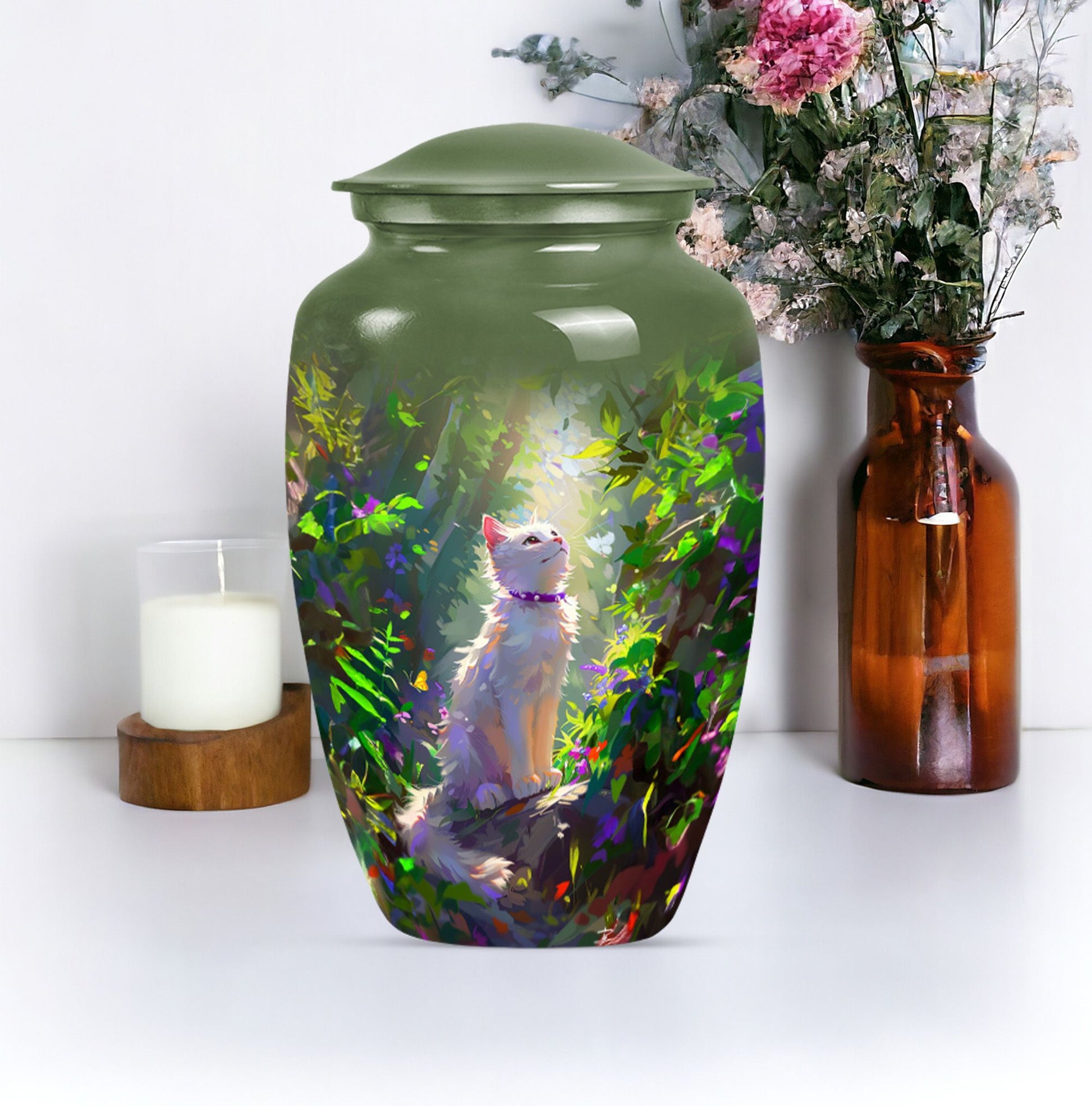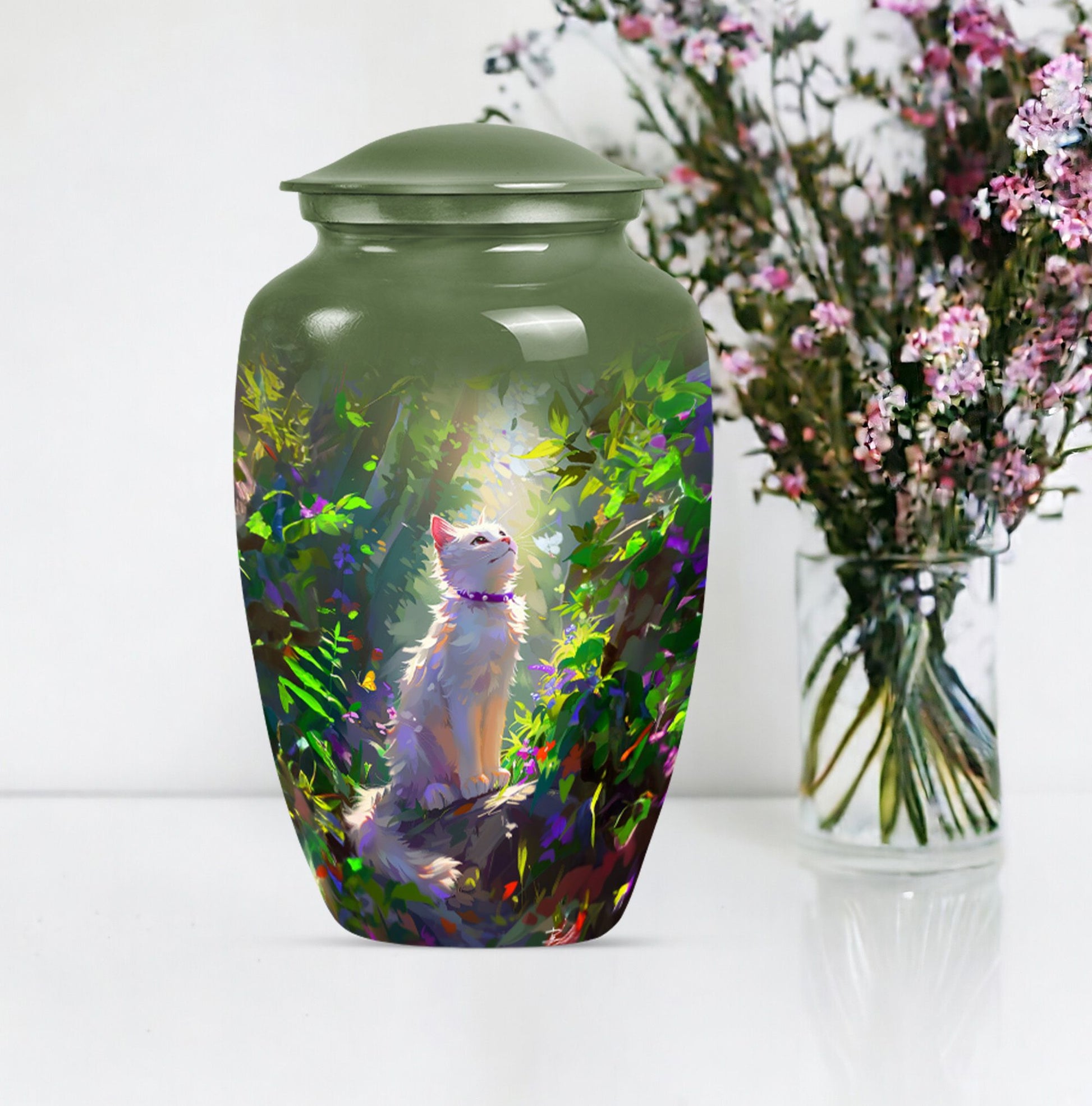 Honor the memory of your departed loved ones with our elegant White Cat Urn. As a cherished piece from our selection of adult urns for human ashes, this memorial urn's abstract theme soothes the soul and imparts a sense of peace. Crafted from robust aluminium, it showcases both durability and tasteful aesthetic. Its substantial size of 10 inches in height and weight of 3.3 pounds adds to its solemnity, capable of holding up to 200 cubic inches of ashes. The urn comes complete with a velvet pouch, offering a dignified containment for ashes. Our large urn's timeless and classic urn disposition is dedicated to preserving the essence of your loved ones. Personalize this piece with engraved names, adding a unique touch to commemorate the departed. This noble artifact serves as more than just an ash urn or a cremation urn for ashes - it's a tribute to a life well-lived and values treasured.