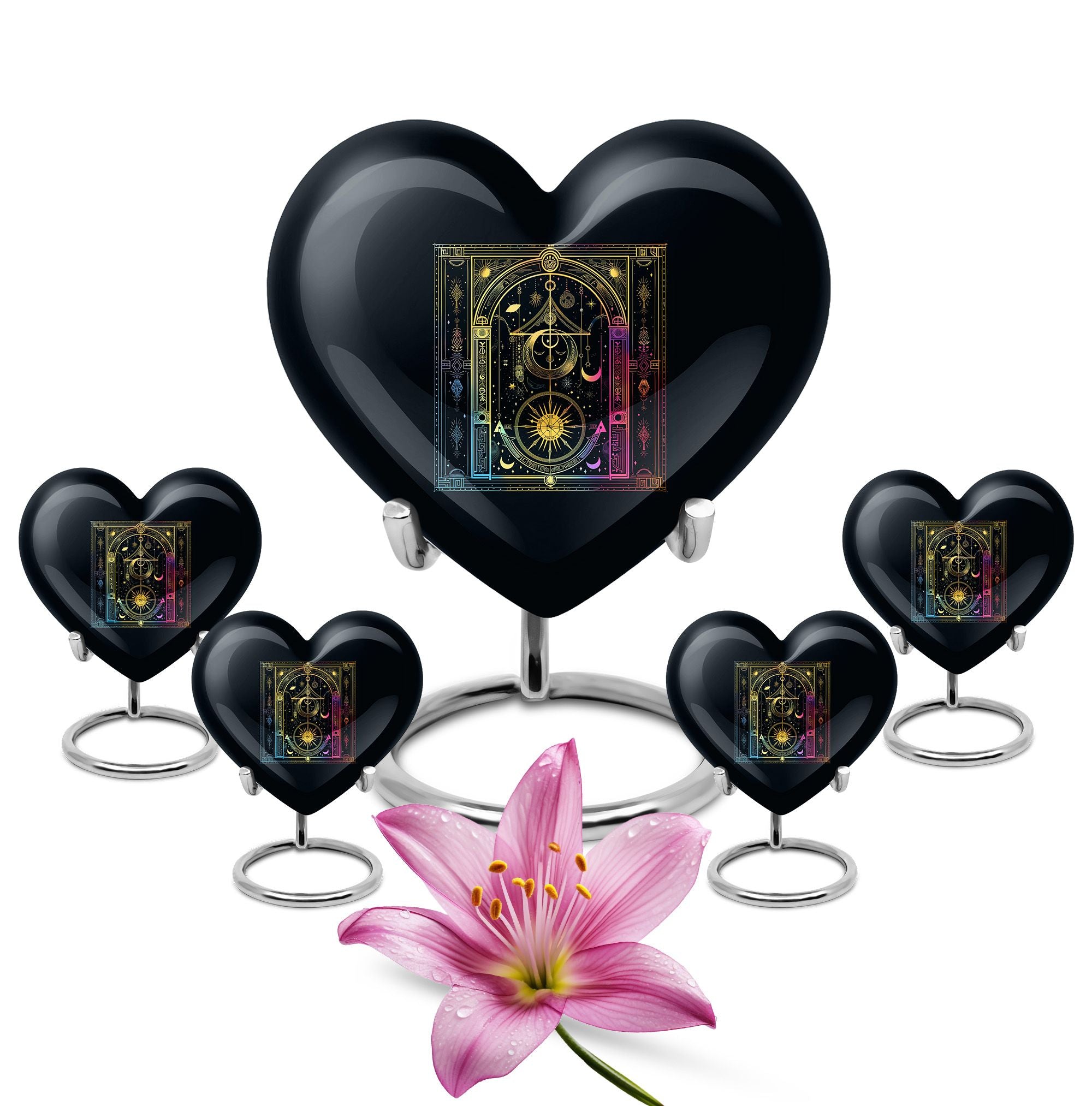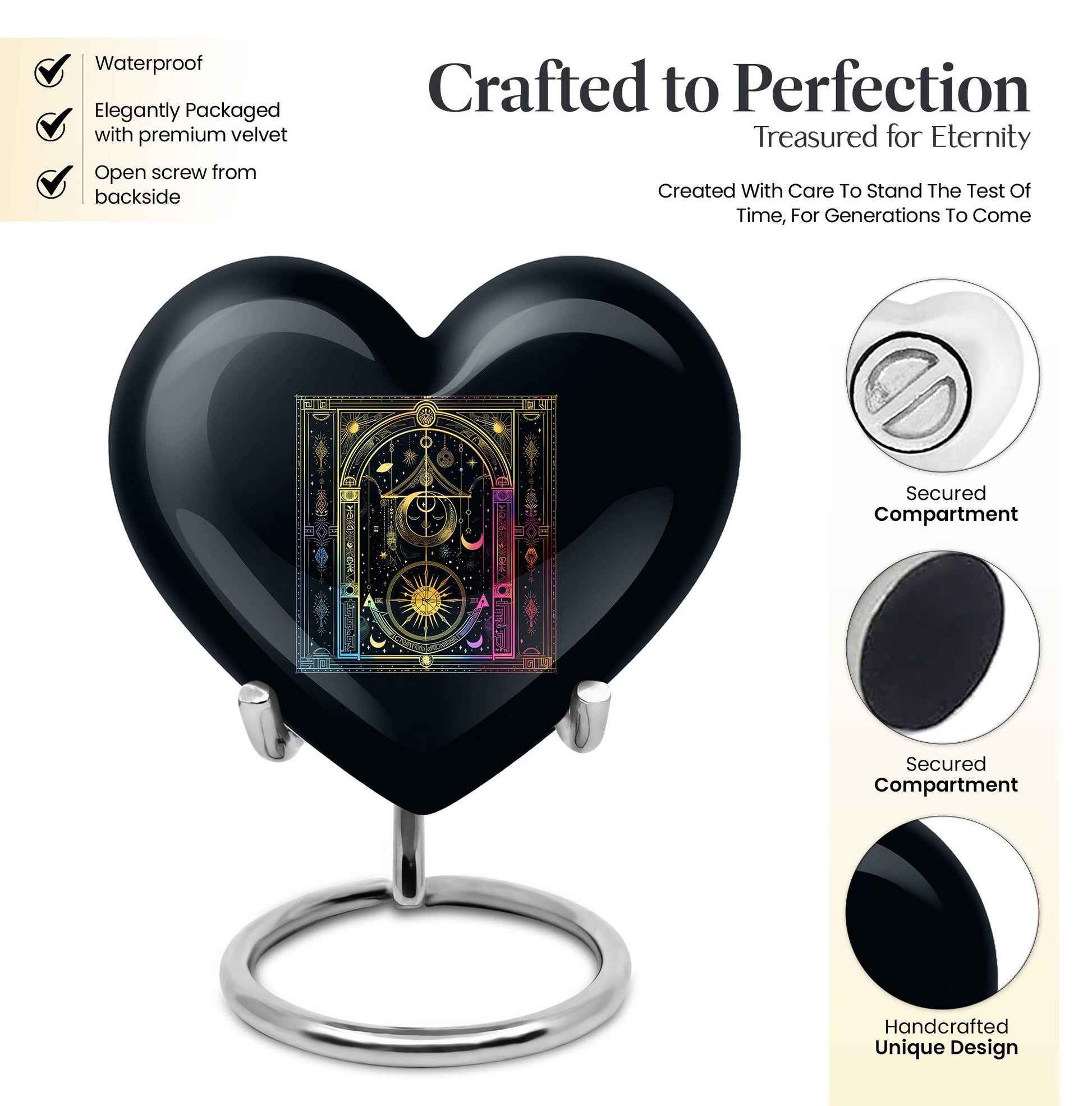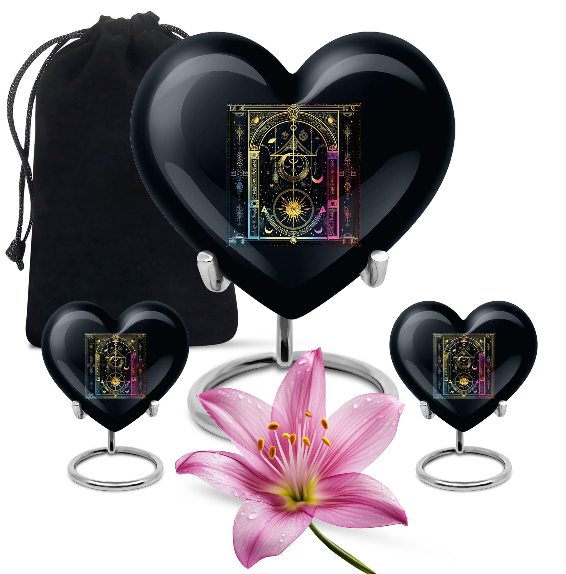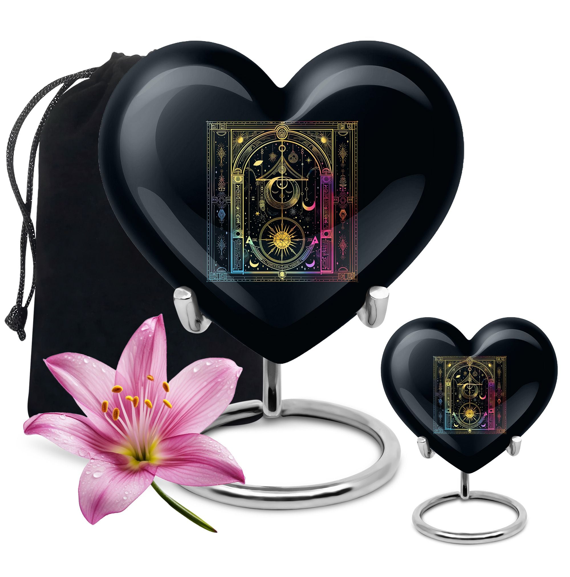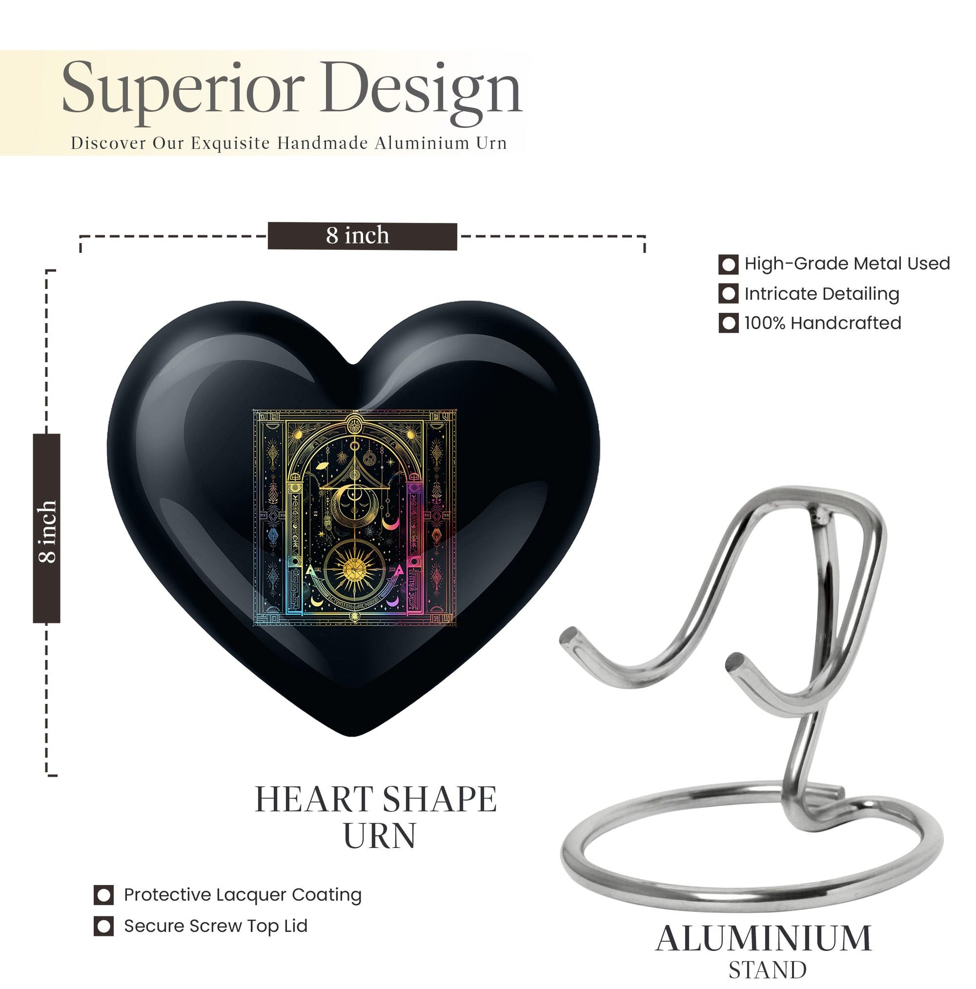 Our Zodiac Urn is a touching tribute, uniquely suited to honour the memory of your loved one. Crafted from high-quality Aluminium, this Large Urn weighs a substantial 3.3 pounds and stands 10 inches in height giving it the ability to house 200 cubic inches of ashes. Its sophisticated abstract theme and Heart Urn design evoke a sense of serenity and reverence. The customization option allows you to personalize the urn with engraved names, adding an intimate touch to the memorial. The urn comes with a velvet pouch for a dignified containment of ashes. This funeral decorative urn is suitable for both men and women, a classy yet poignant reminder of your dear one. Whether you're searching for 'memorial urns for human ashes adult female' or 'urns for cremation ashes mother' or 'urn human adult male', this 10inch Zodiac Urn will stand as an elegant symbol of cherished memories. Ideal for those mapping their faith and spirituality onto the celestial sphere.