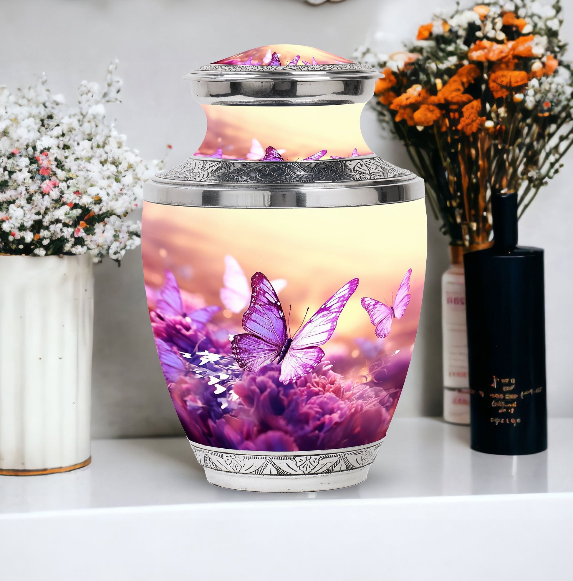 Discover a unique way to commemorate your loved ones with Butterfly in Meadow Urns for Human Ashes. These unique urns offer a size of 3 inches, and a sturdy weight of 3.3 pounds. They stand proud at 10 inches in height and made of long-lasting aluminium. The lunar design combined with the classic urn design allows for a vibrant and soothing symbol for the memory of the departed. Our Large Urns come with a gentle velvet pouch for the secure containment of ashes. Their more significant capacity allows for the containment of up to 200 cubic inches of ash, ensuring your loved one's memory stays intact. Make it personal with our customization features - have the urn engraved with your loved one's name, creating a truly unique memorial. These custom urns not only serve as secure ashes holders for cremation but also double as decorative urns, particularly perfect for Moms Ashes. So, Discover our Butterfly in Meadow urns, redefining the experience of memorial urns.