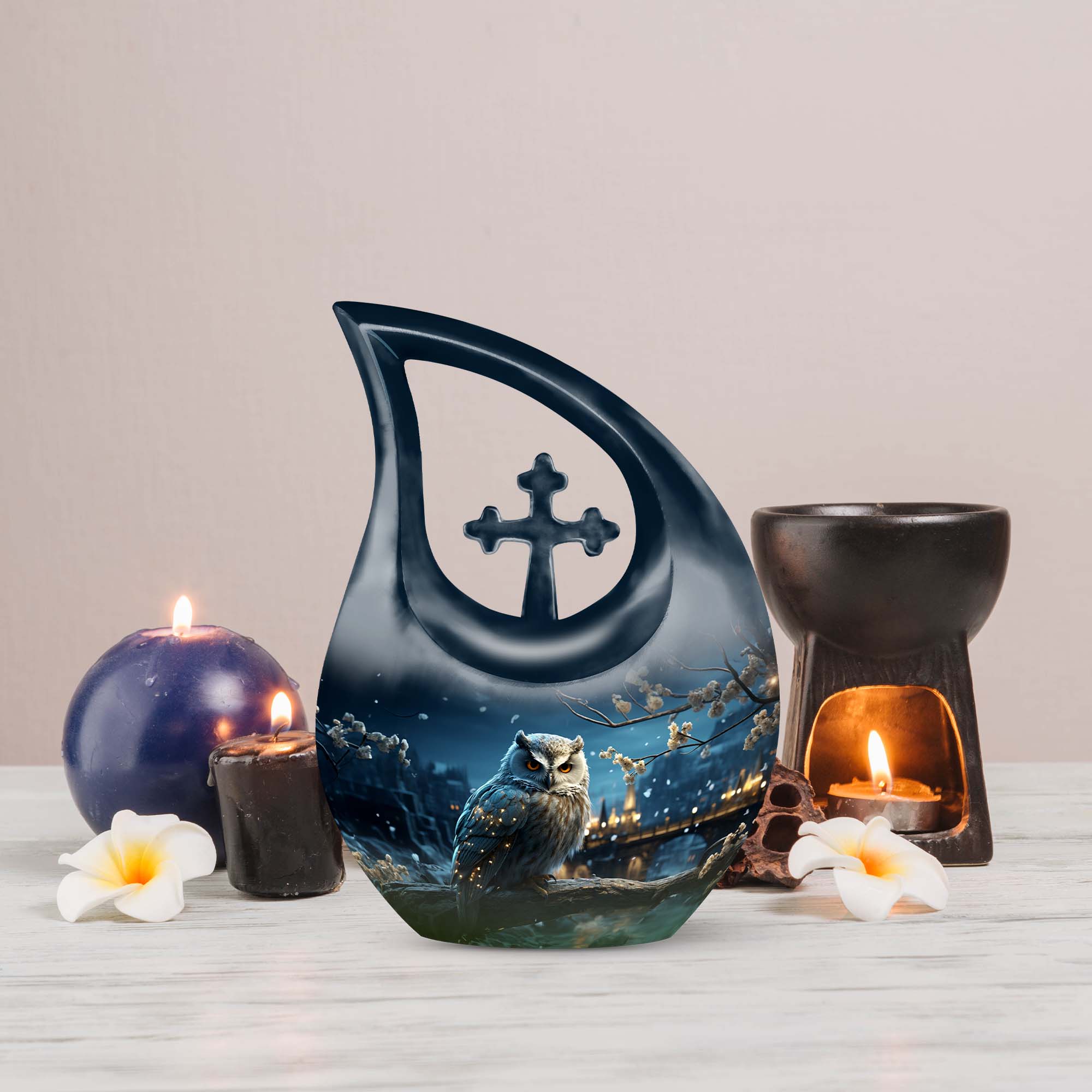 Crafted from high-quality aluminum, this snowfall large sized urn combines elegance and strength. Its smooth white surface glows under light, while the detailed owl engraving represents guidance and everlasting connection. Perfect for display at home or use as a burial urn, this piece stands among the most beautiful urns women and men urns for human ashes, offering timeless remembrance.
